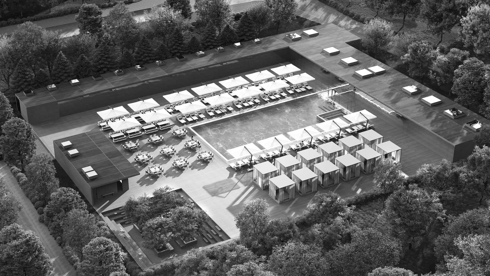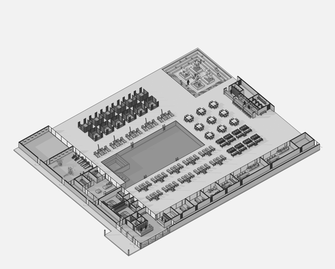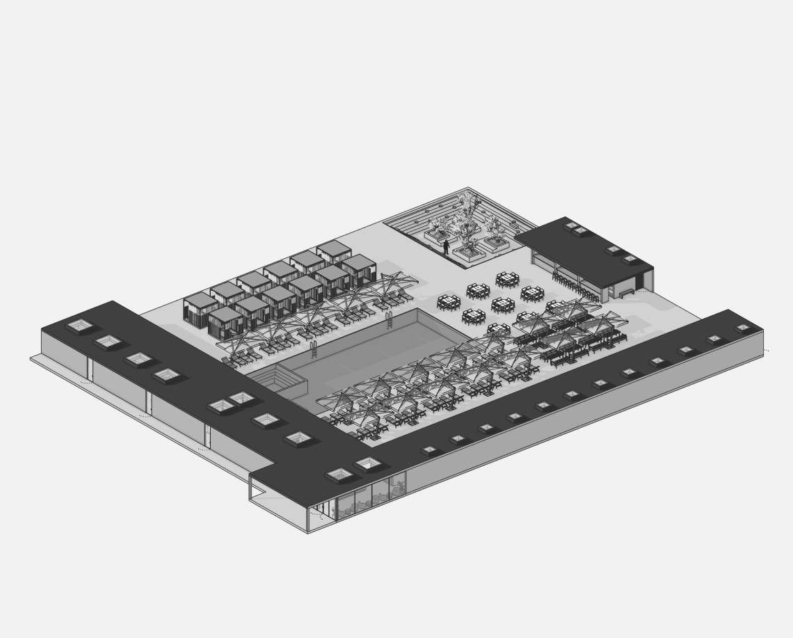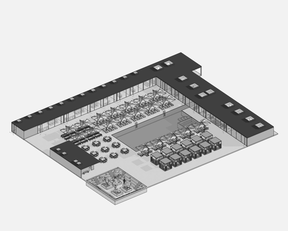 Проект объединяет общественную зону отдыха с открытым бассейном и корпус апартаментов отеля. Комплекс формирует замкнутый внутренний двор с аква-зоной, баром, рестораном и зонами отдыха под навесами.