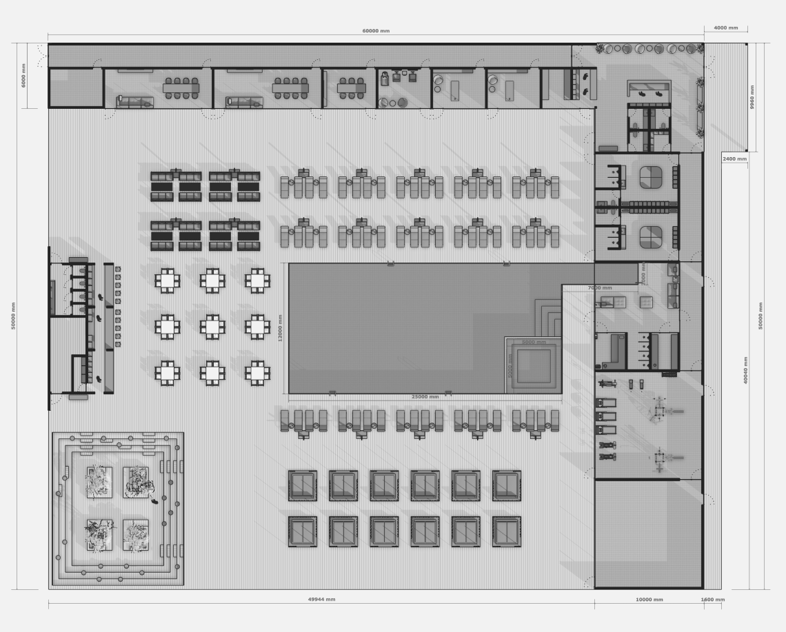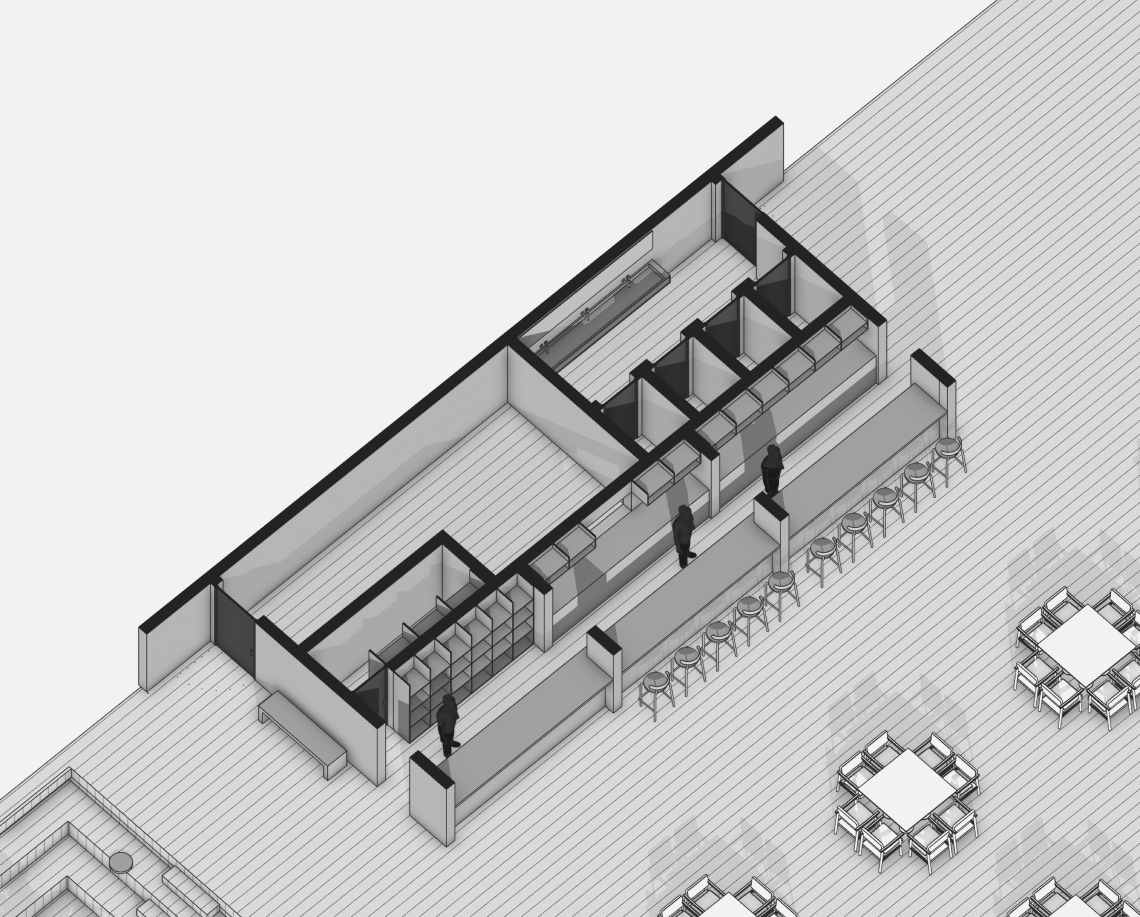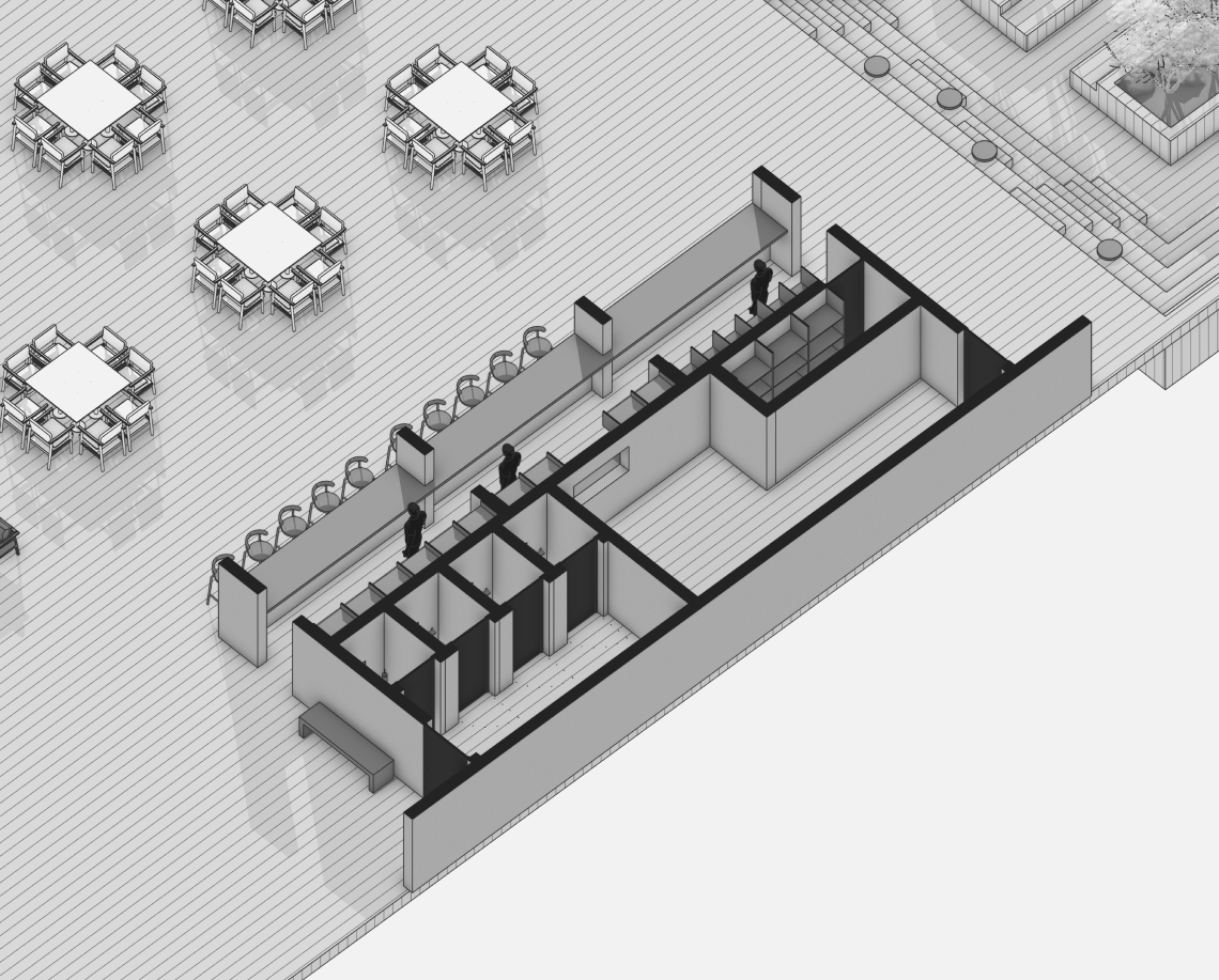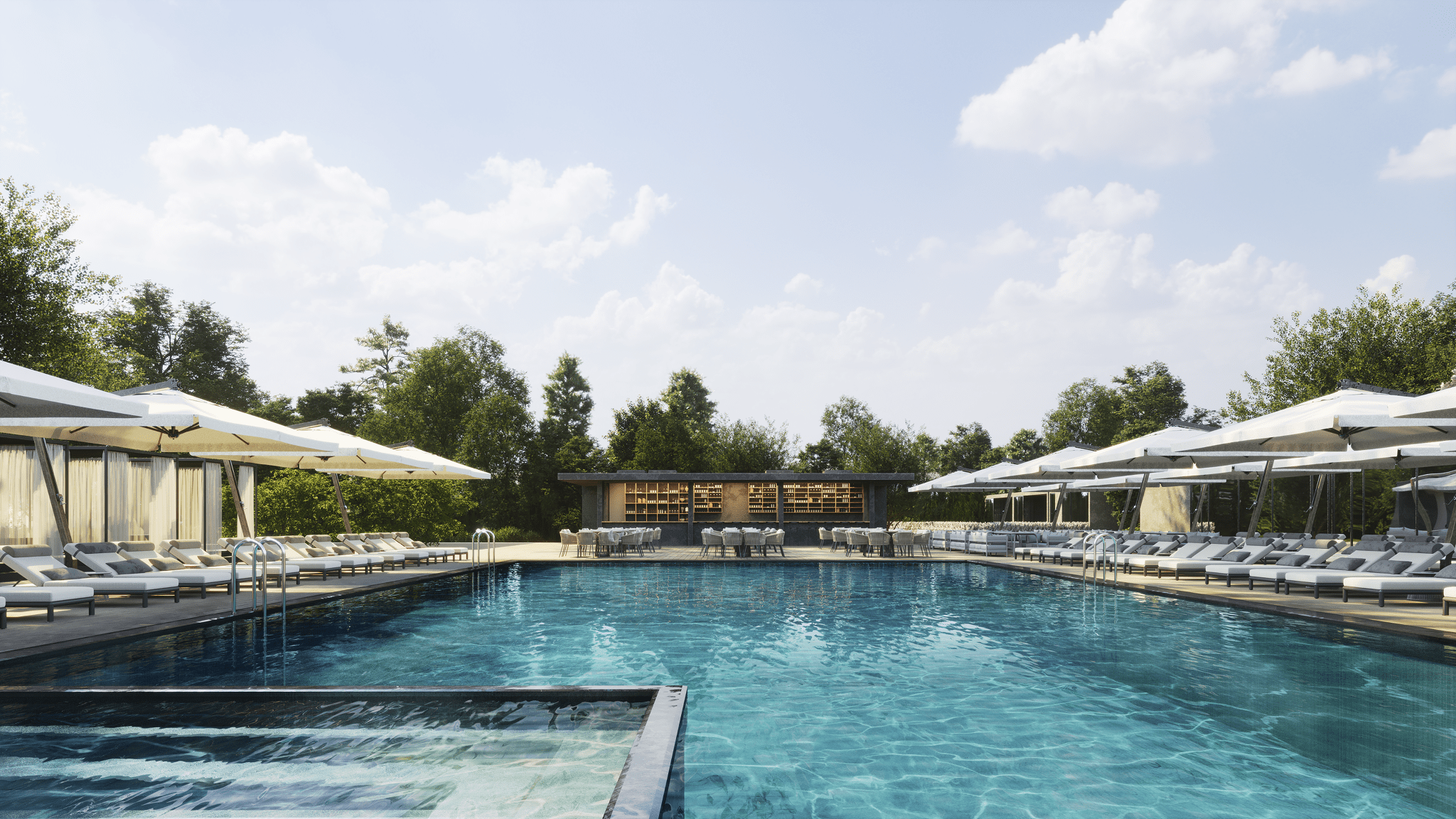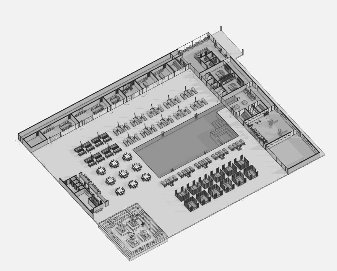 Проект объединяет общественную зону отдыха с открытым бассейном и корпус апартаментов отеля. Комплекс формирует замкнутый внутренний двор с аква-зоной, баром, рестораном и зонами отдыха под навесами.