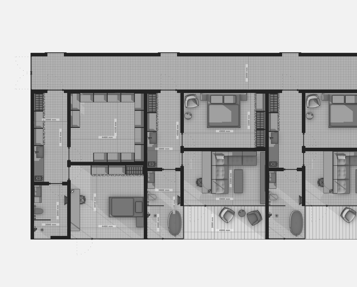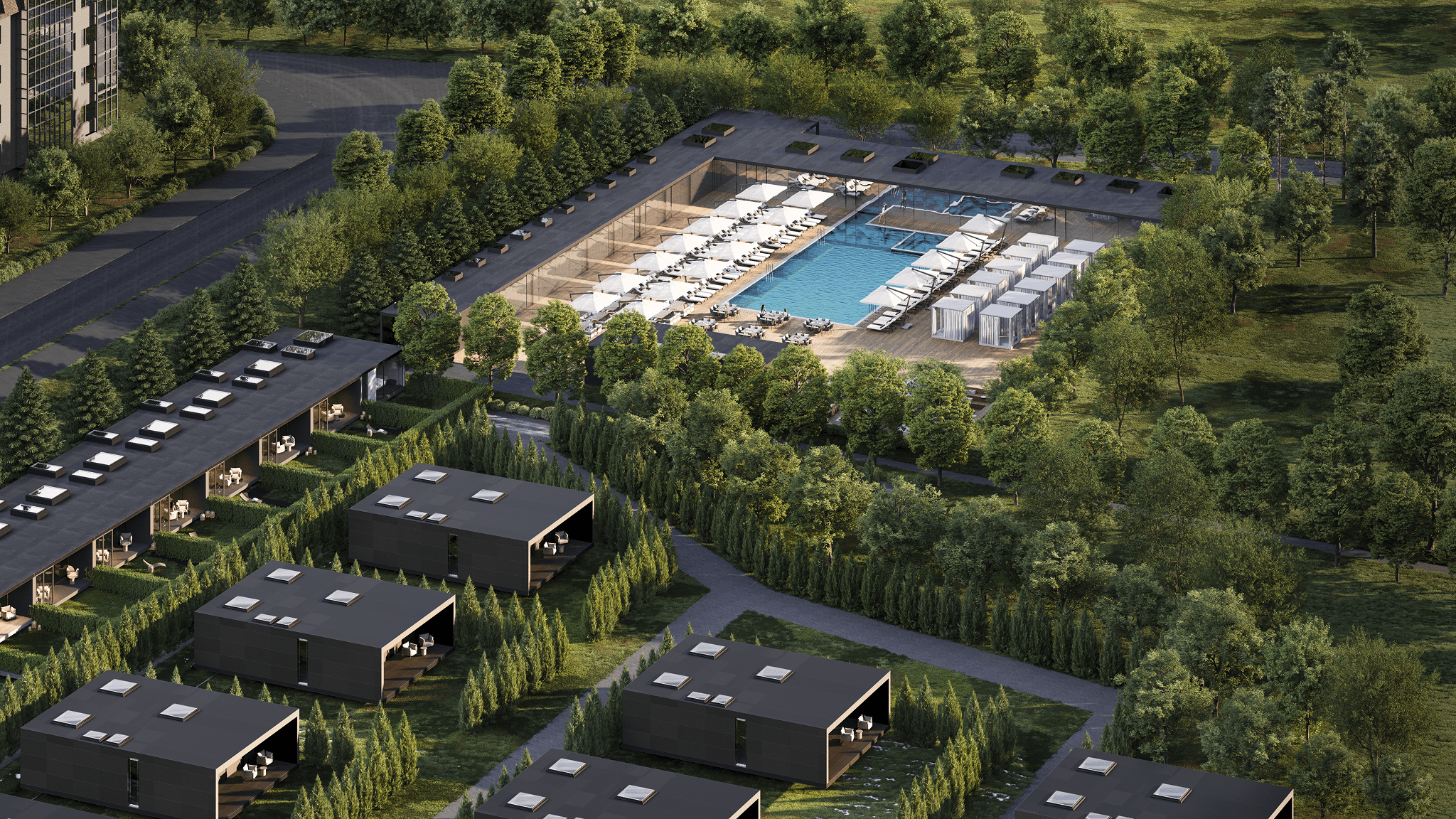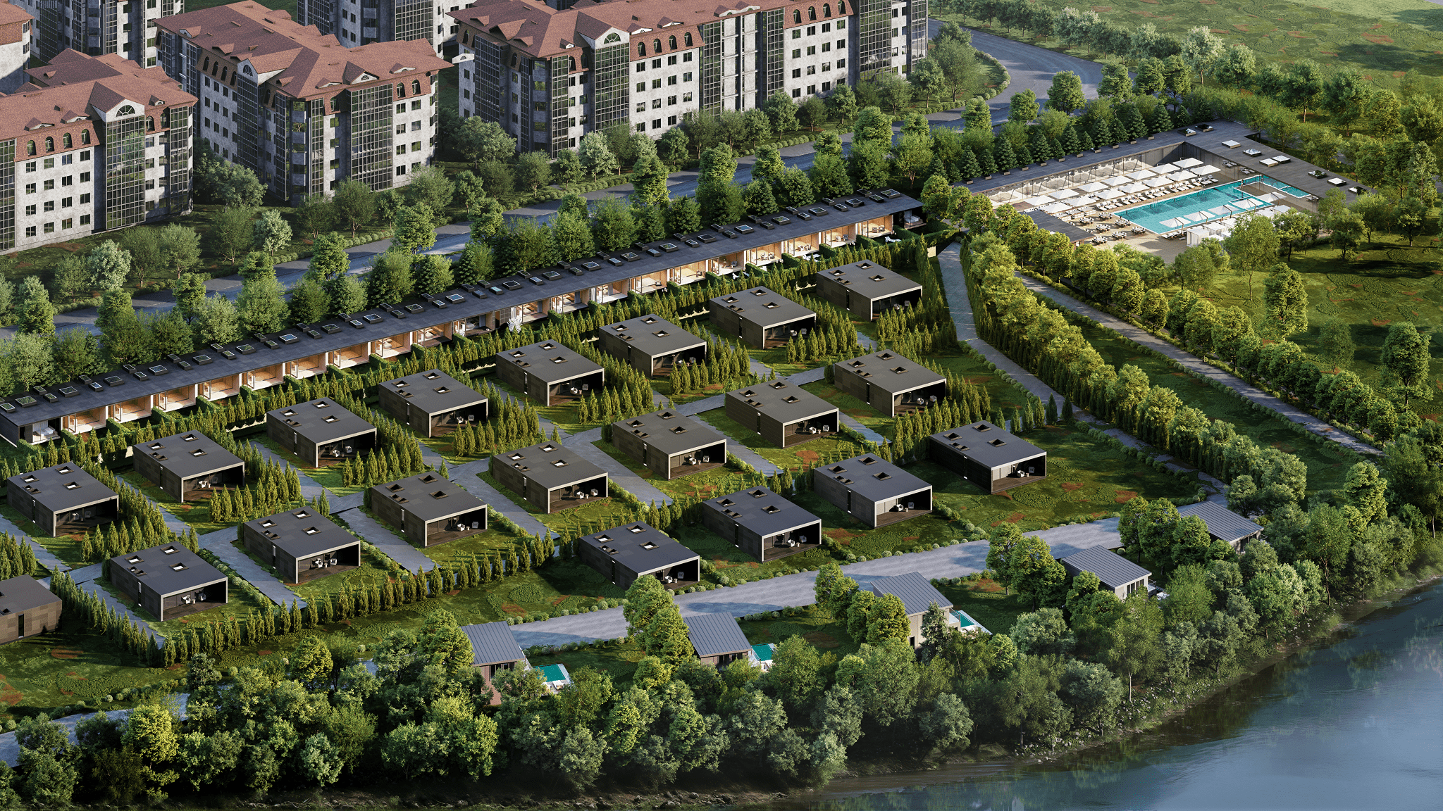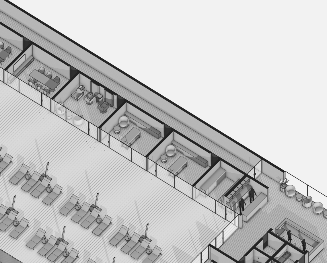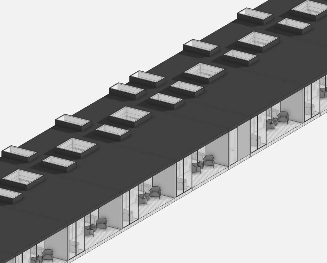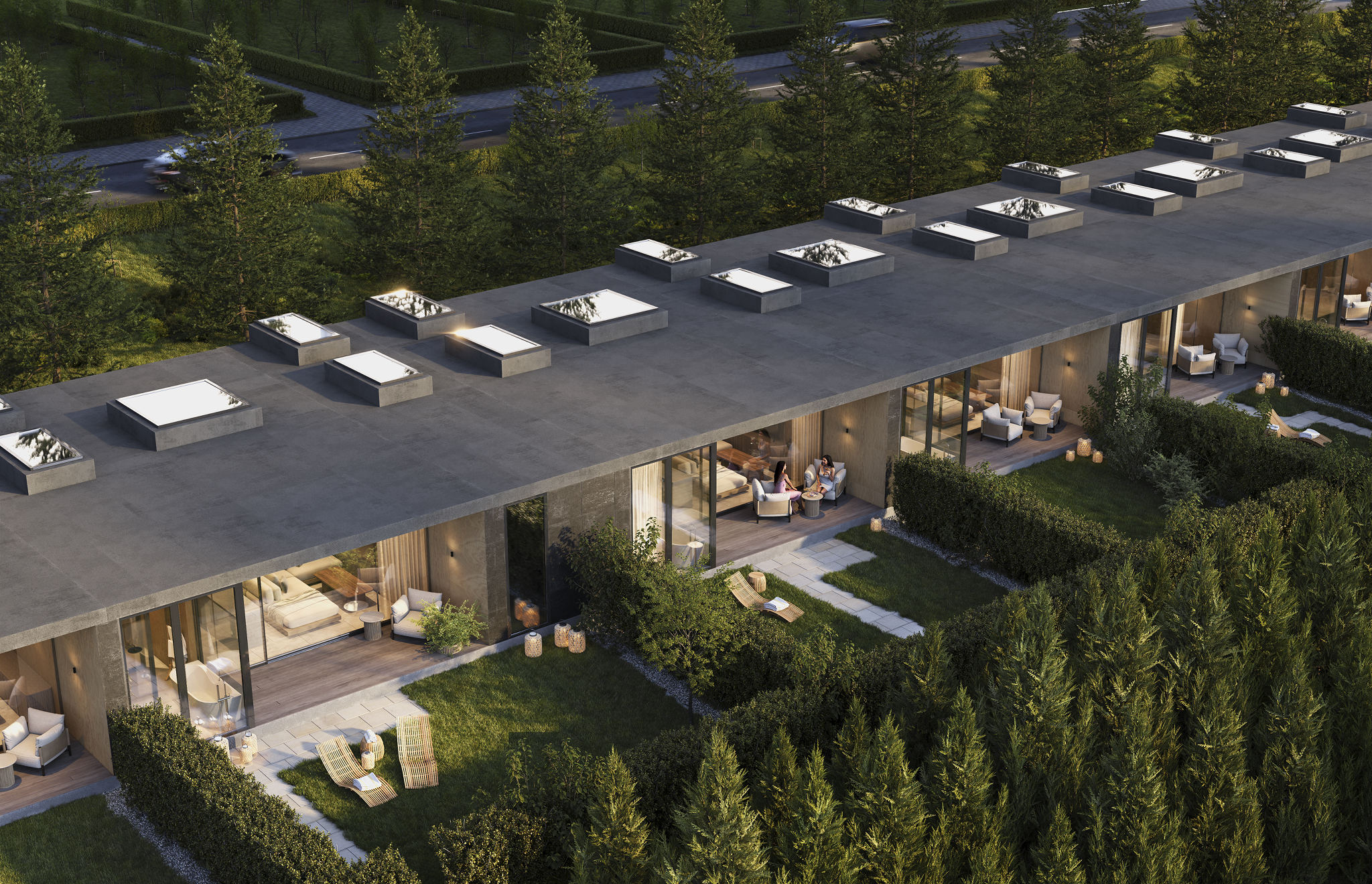 Вдоль северной границы участка расположен бутик-отель длиной 170 метров, состоящий из рядных апартаментов с индивидуальными террасами и панорамным остеклением.