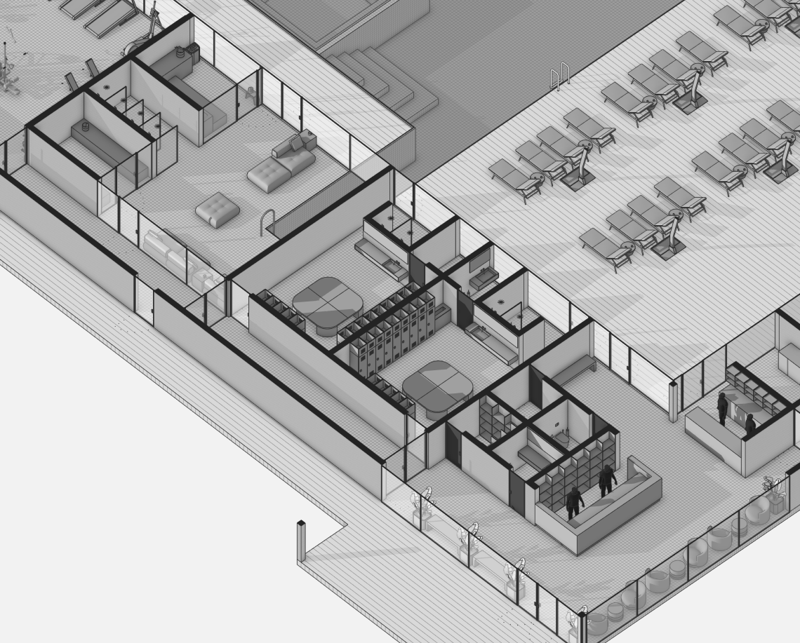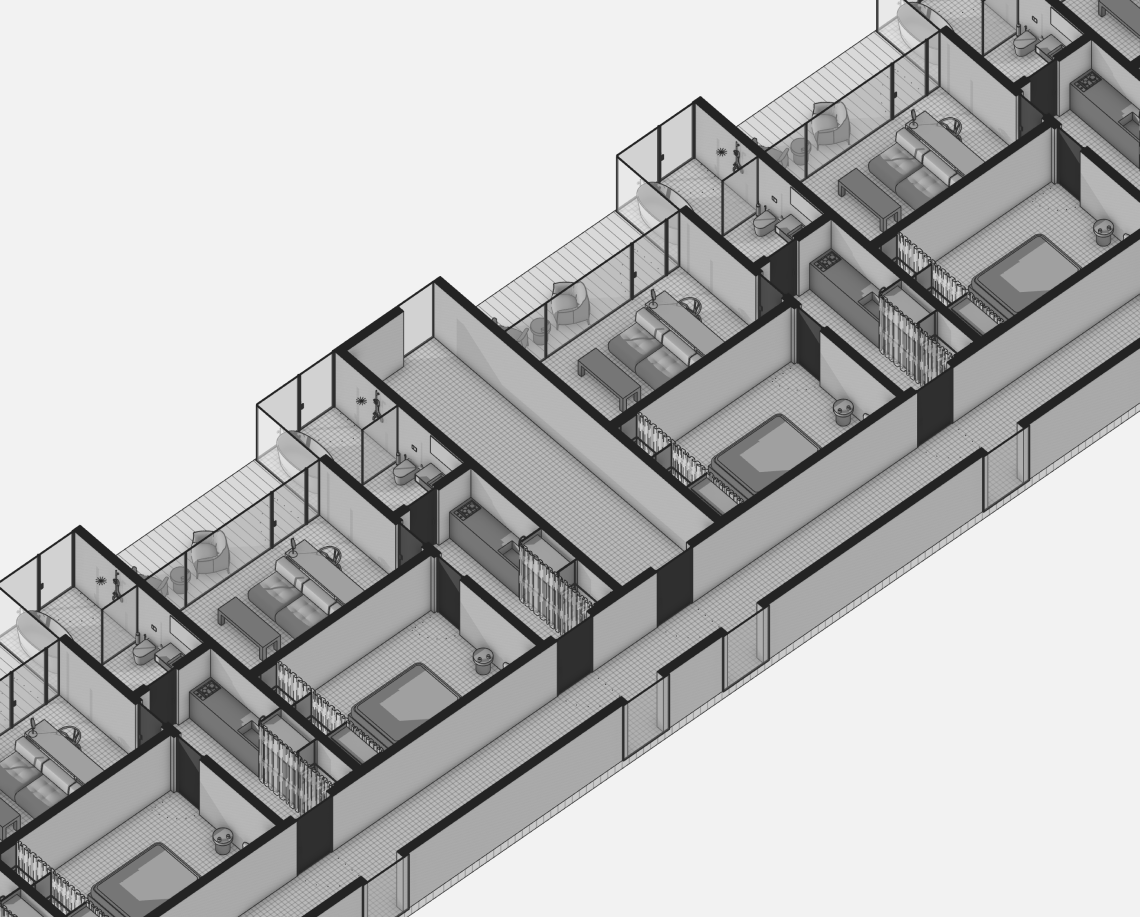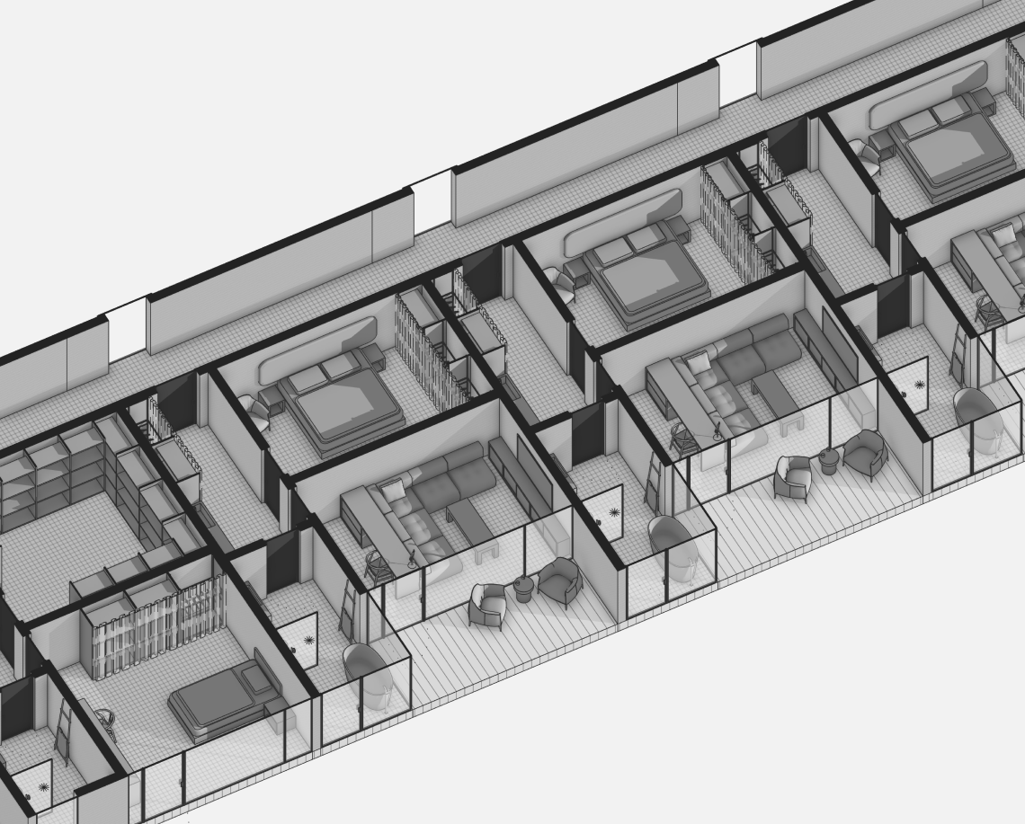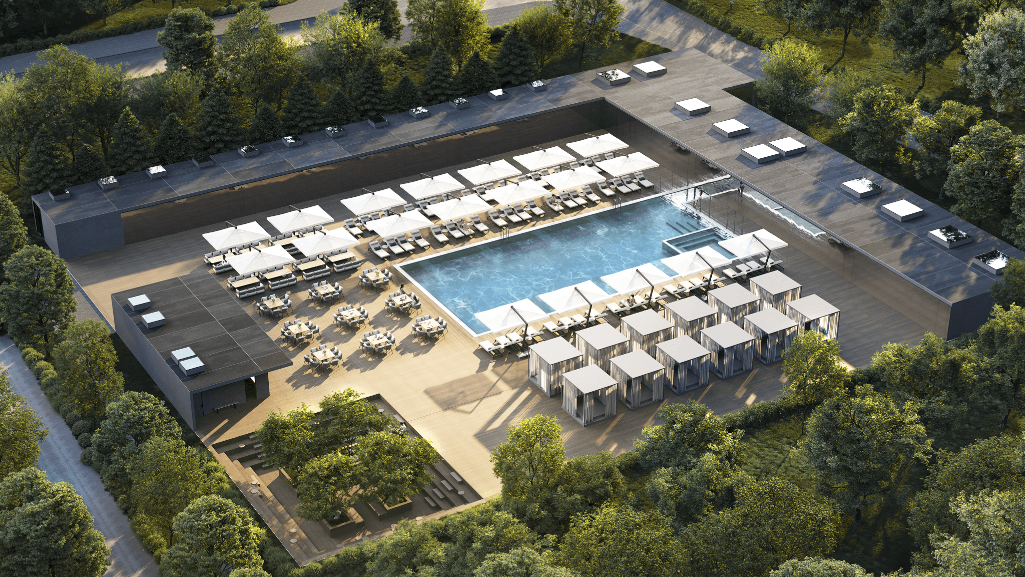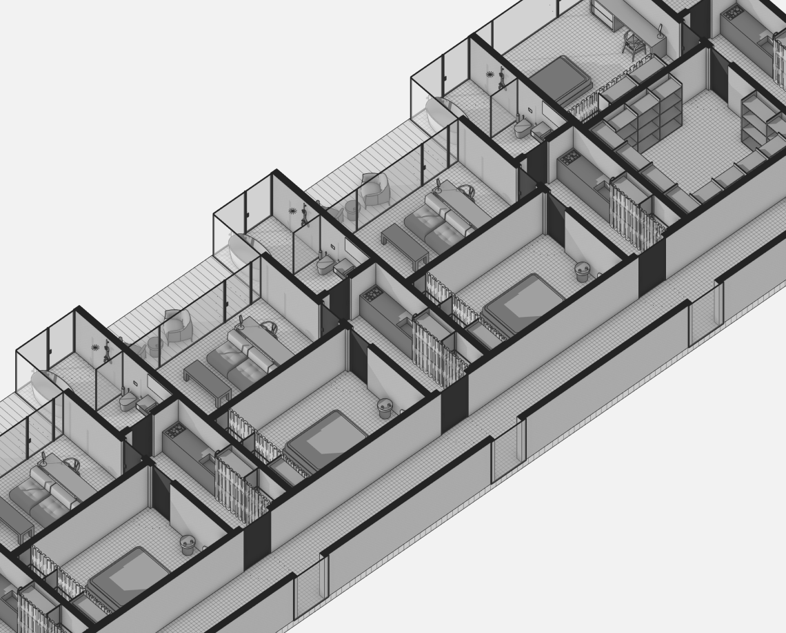 Вдоль северной границы участка расположен бутик-отель длиной 170 метров, состоящий из рядных апартаментов с индивидуальными террасами и панорамным остеклением.