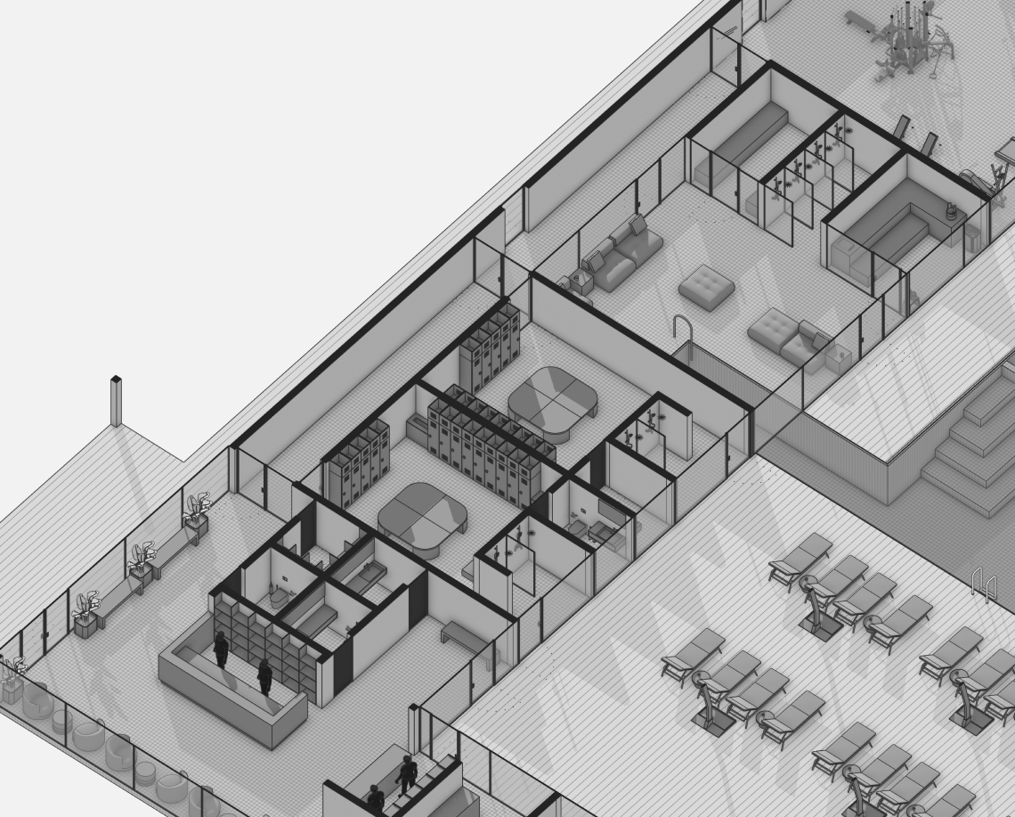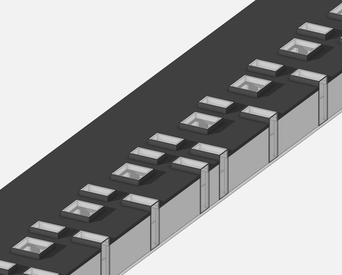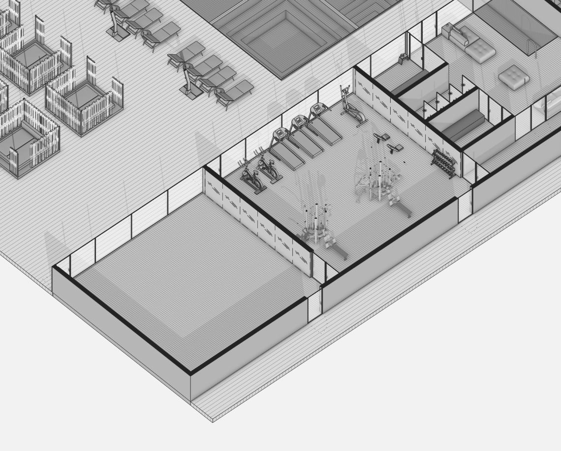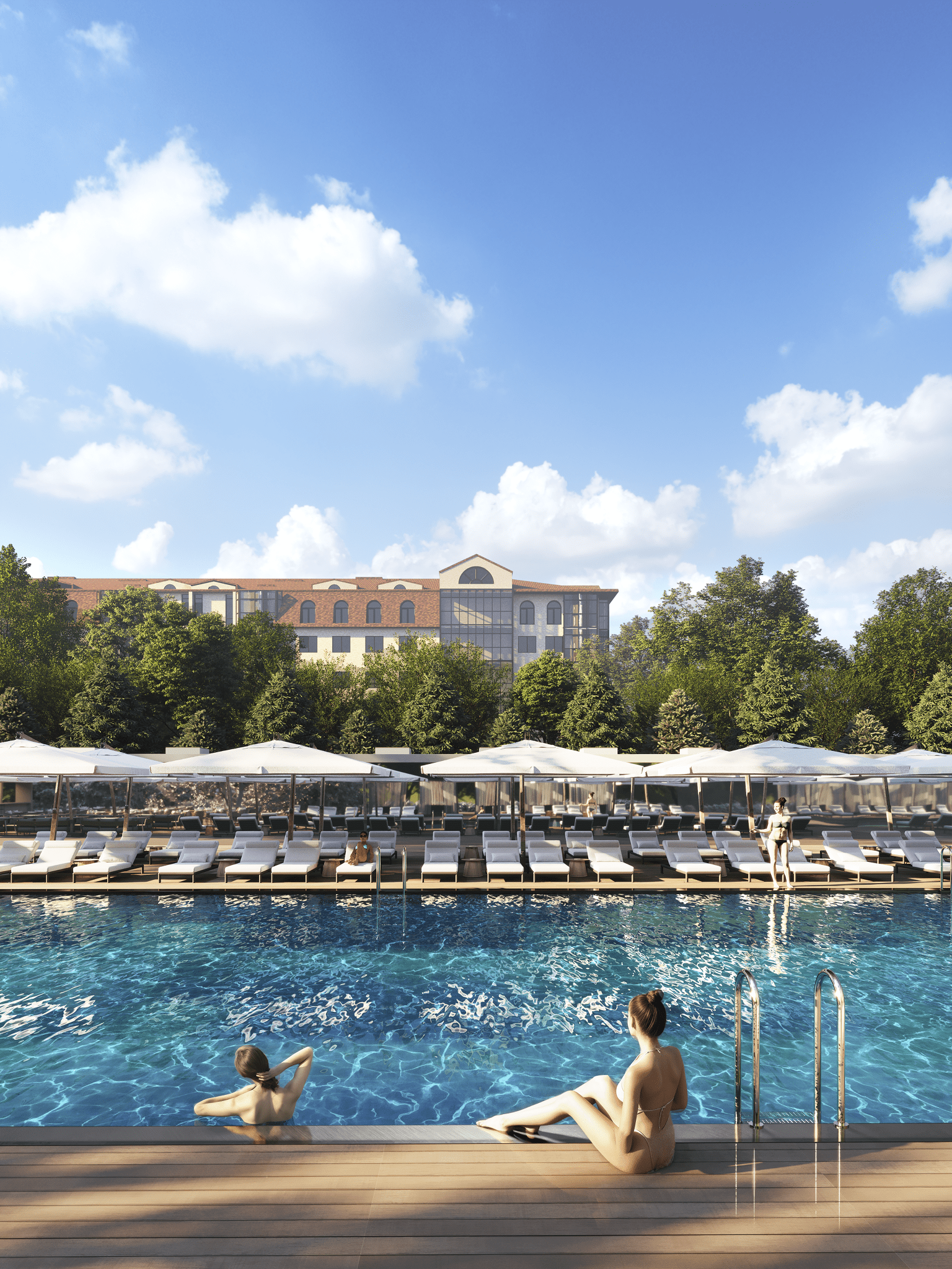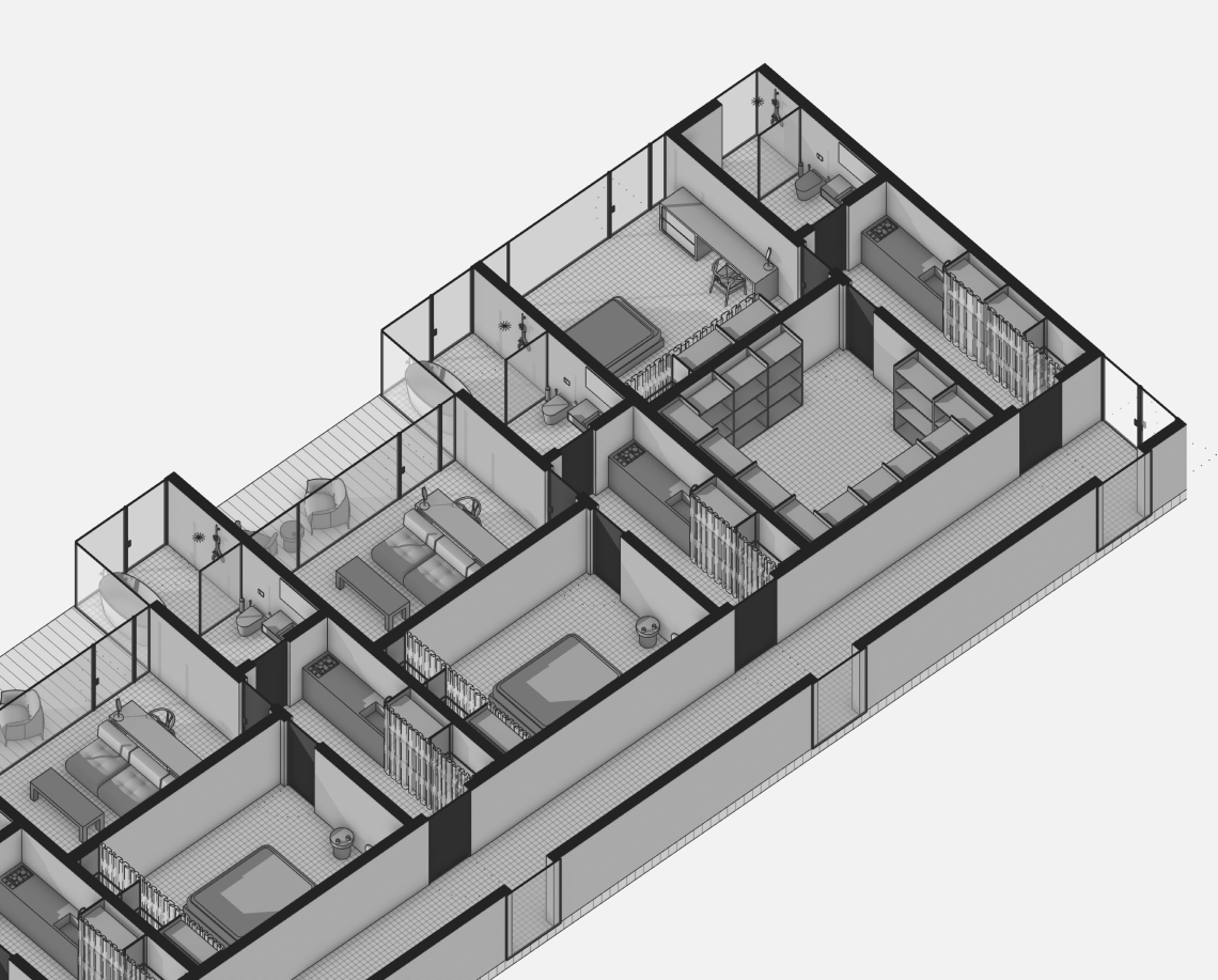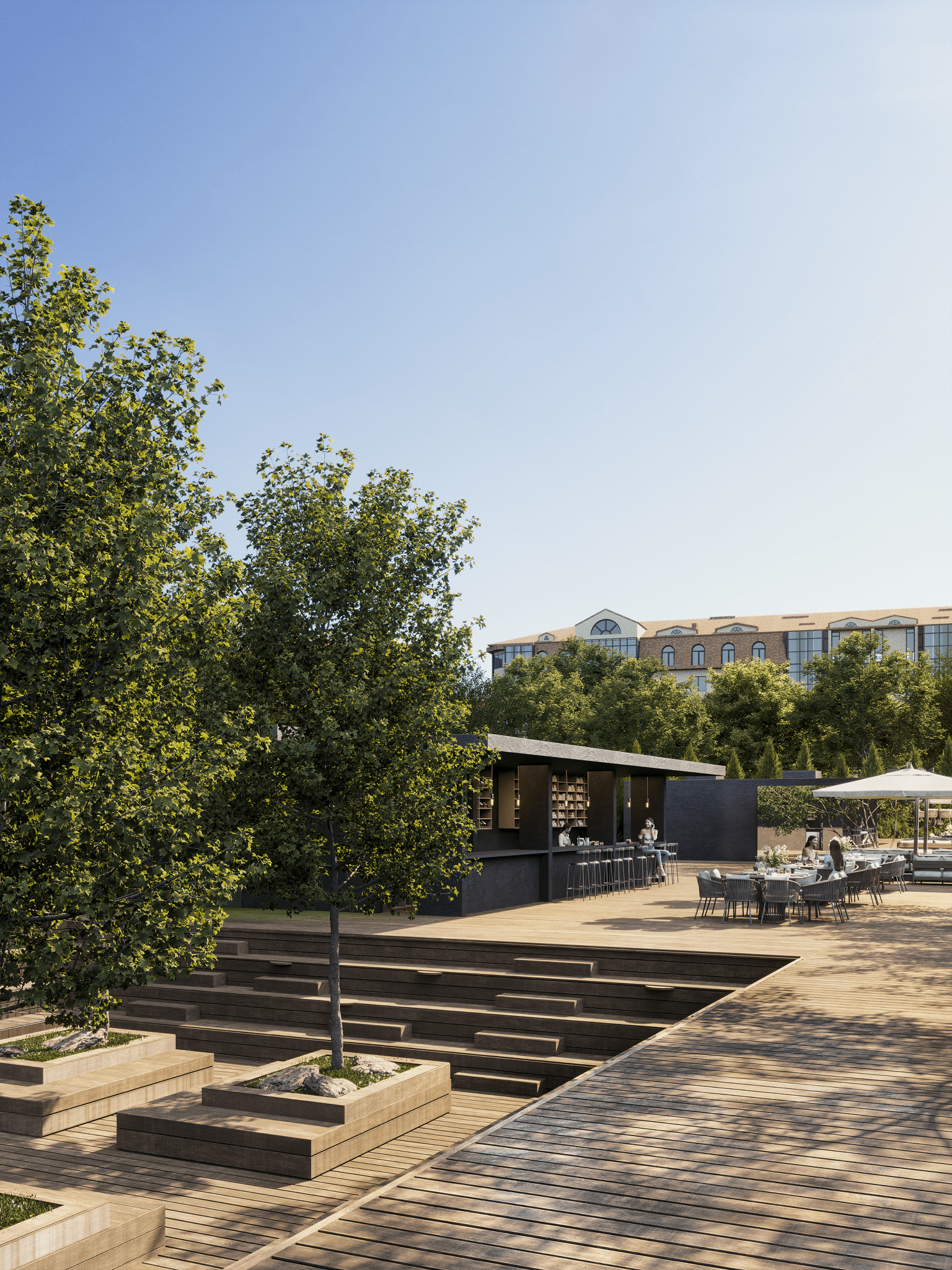 Вдоль северной границы участка расположен бутик-отель длиной 170 метров, состоящий из рядных апартаментов с индивидуальными террасами и панорамным остеклением.