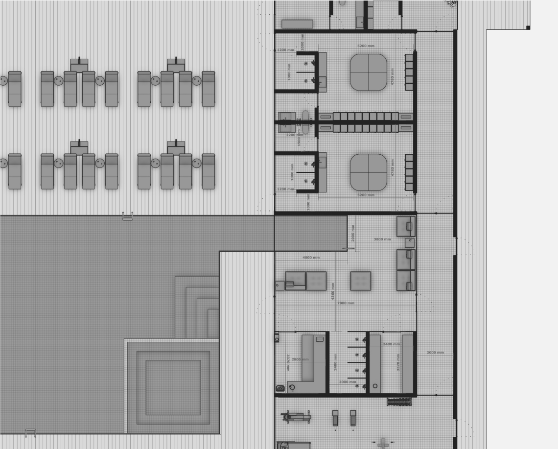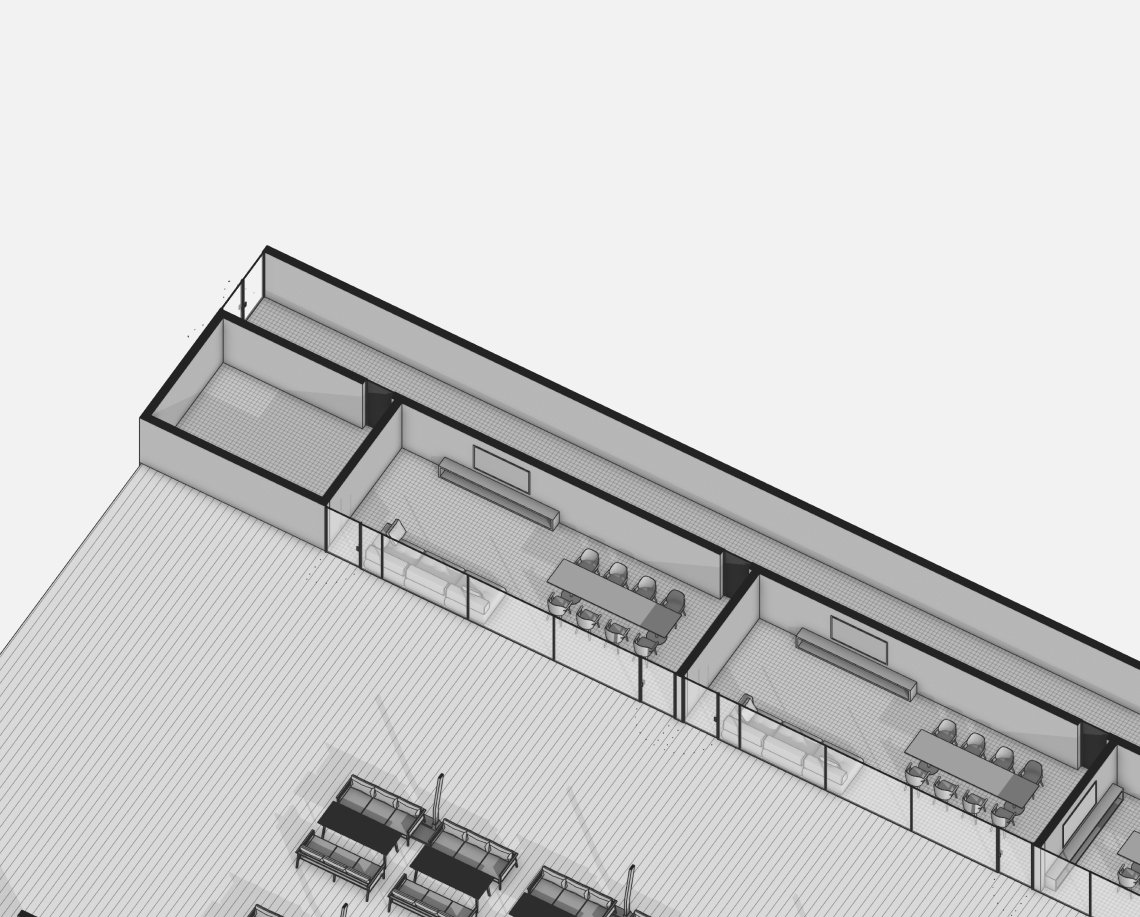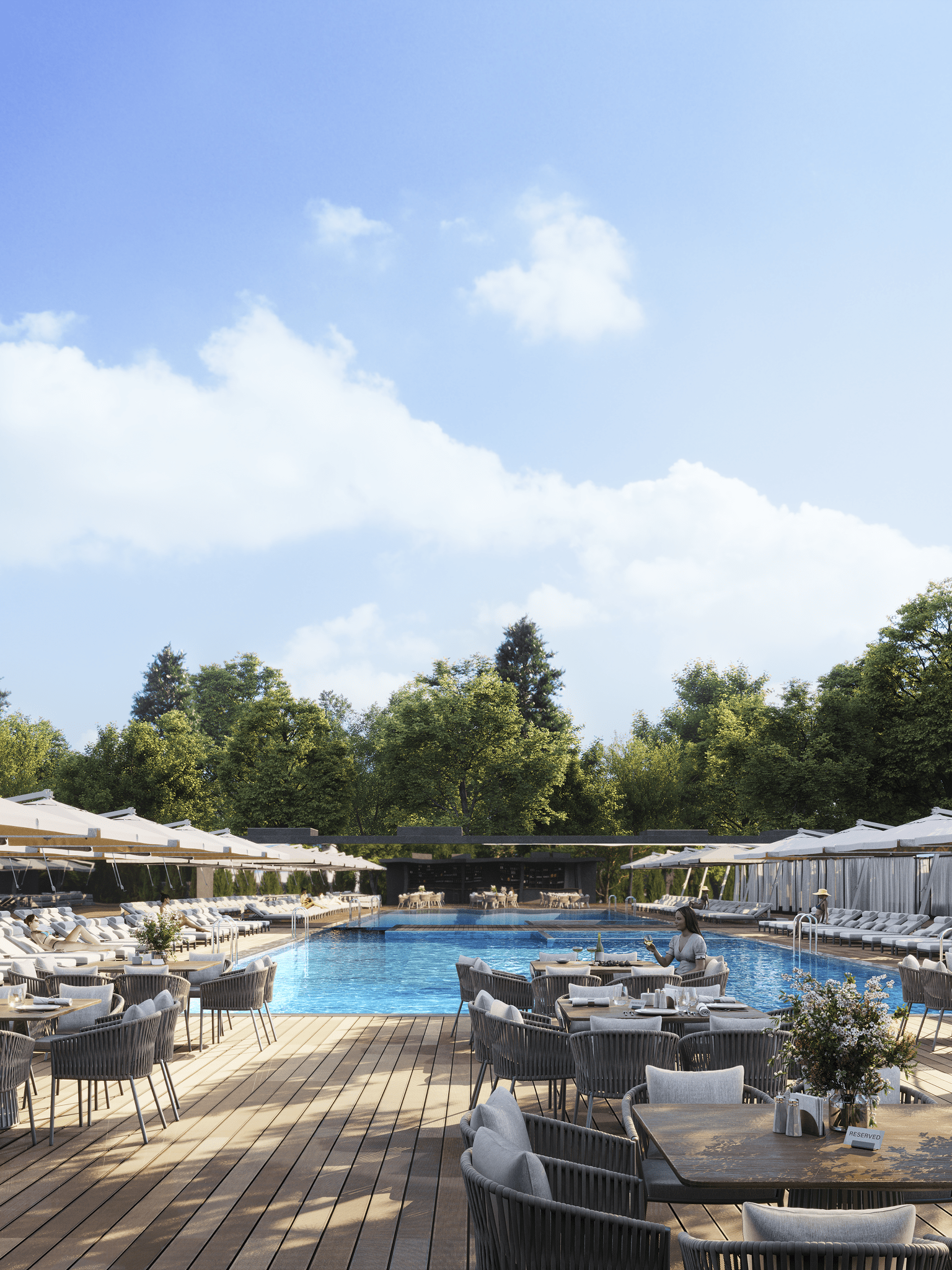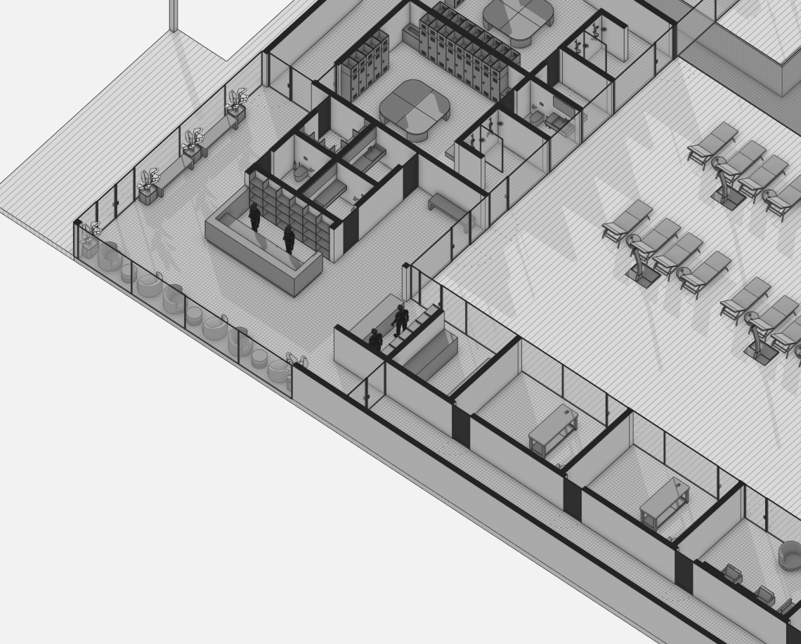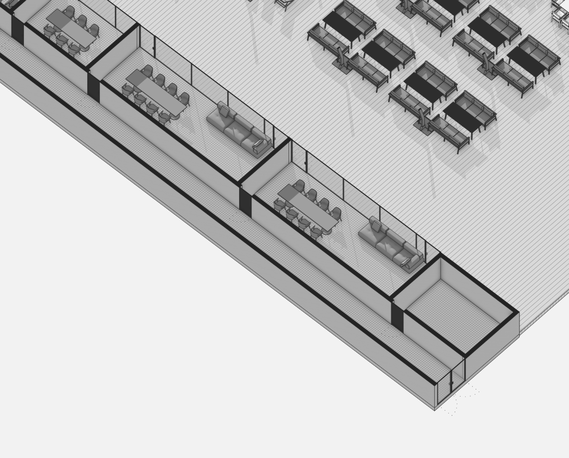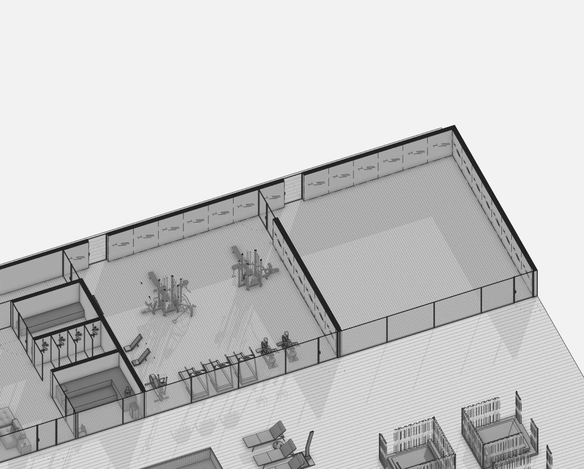 Вдоль северной границы участка расположен бутик-отель длиной 170 метров, состоящий из рядных апартаментов с индивидуальными террасами и панорамным остеклением.