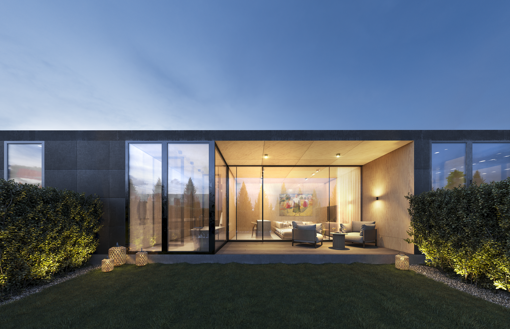Лаконичная архитектура и природная палитра материалов создают атмосферу приватности и единства с ландшафтом.
