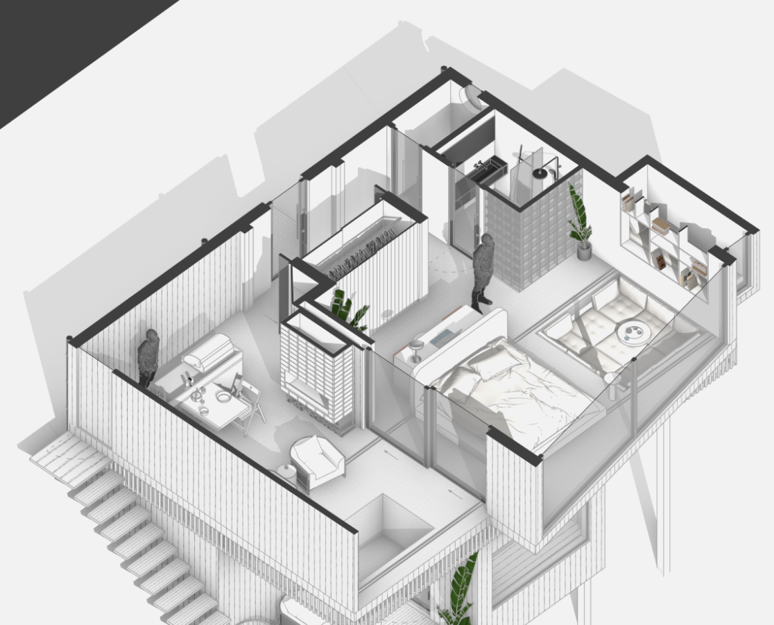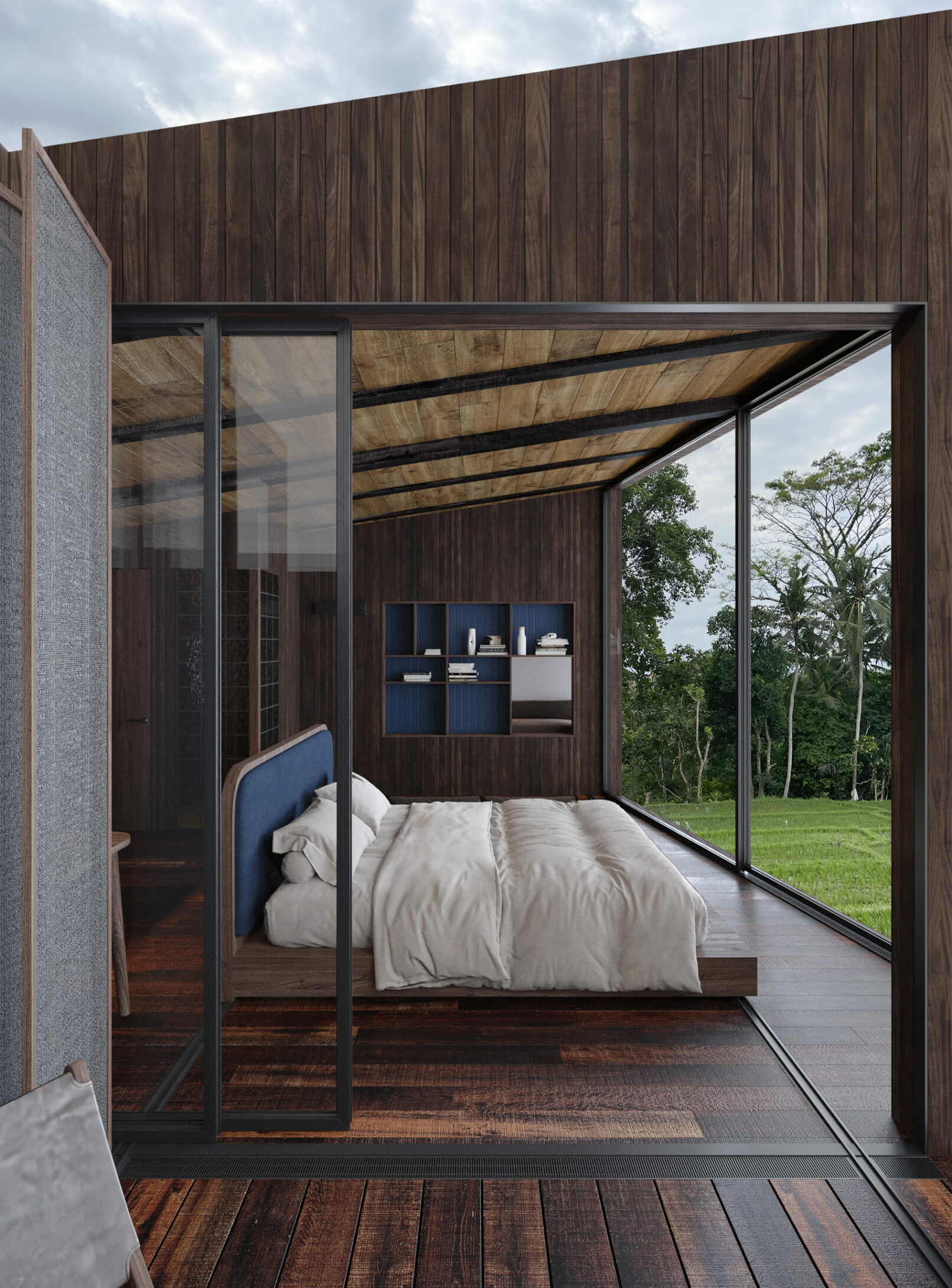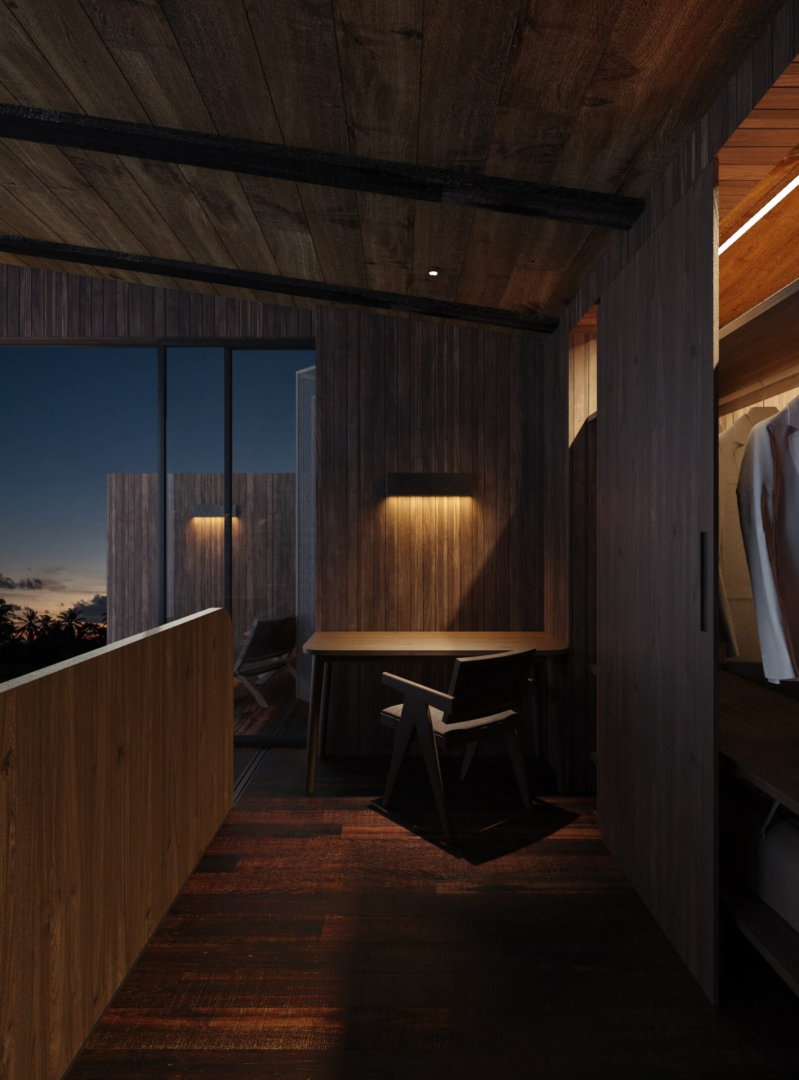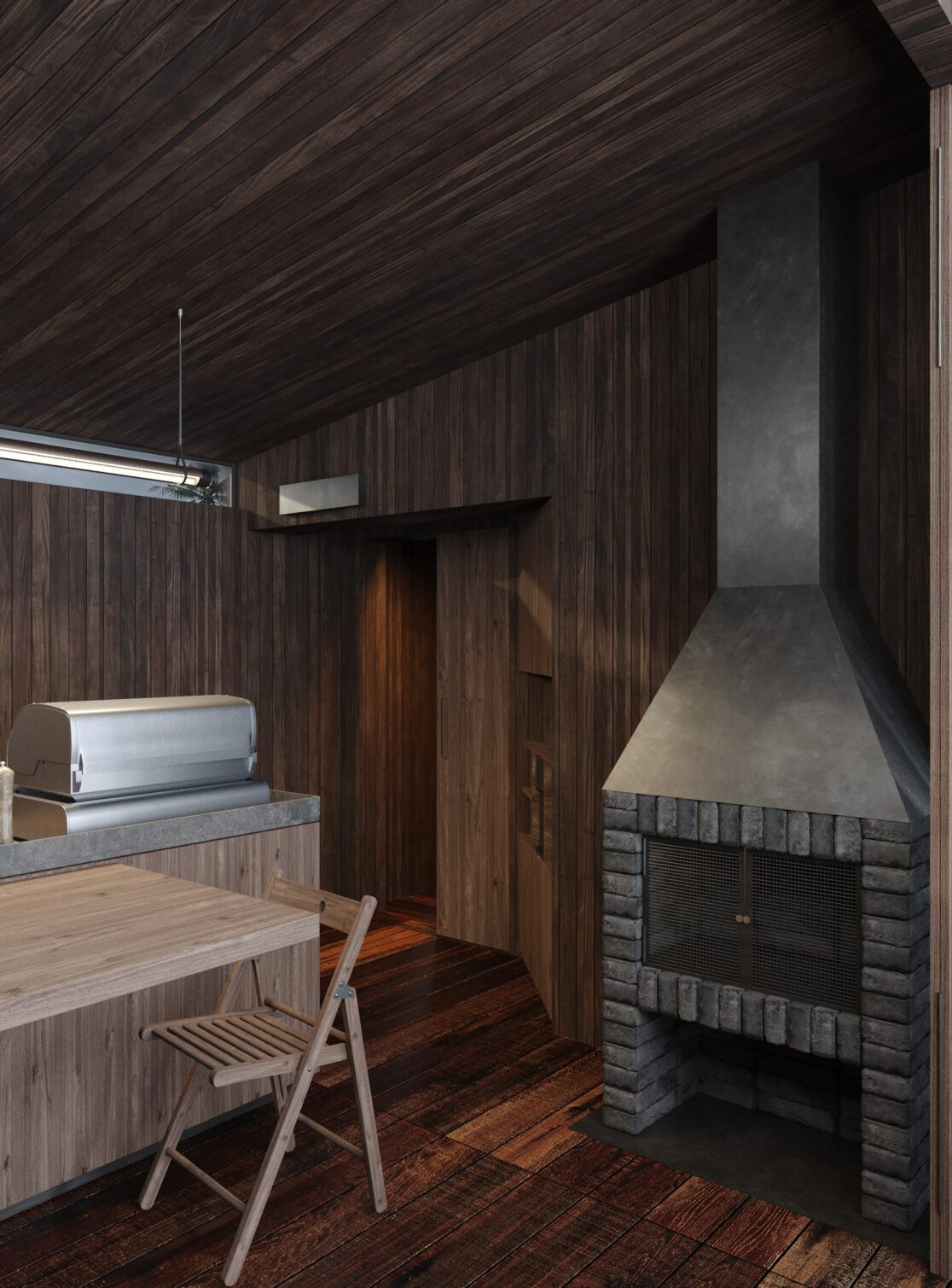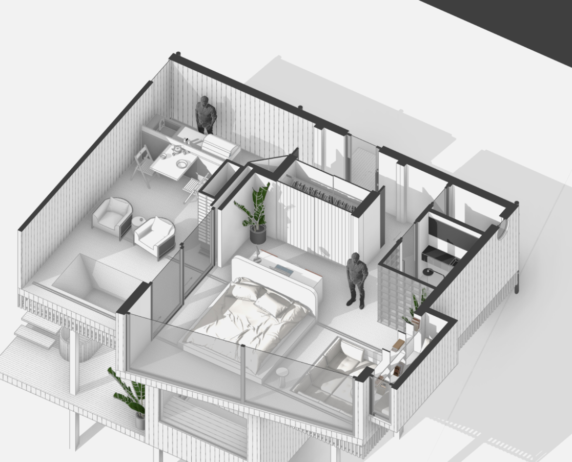 Архитектура модуля подчёркнуто простая и честная — лаконичные формы, модульная структура и выразительный ритм деревянной обшивки. Планировка продумана так, чтобы создать приватные и открытые зоны, сохранив при этом компактность. Вход ведёт на верхний уровень, где расположены уличная кухня, спальня с заглублённой зоной отдыха у окна, гардеробная, душ и туалет.