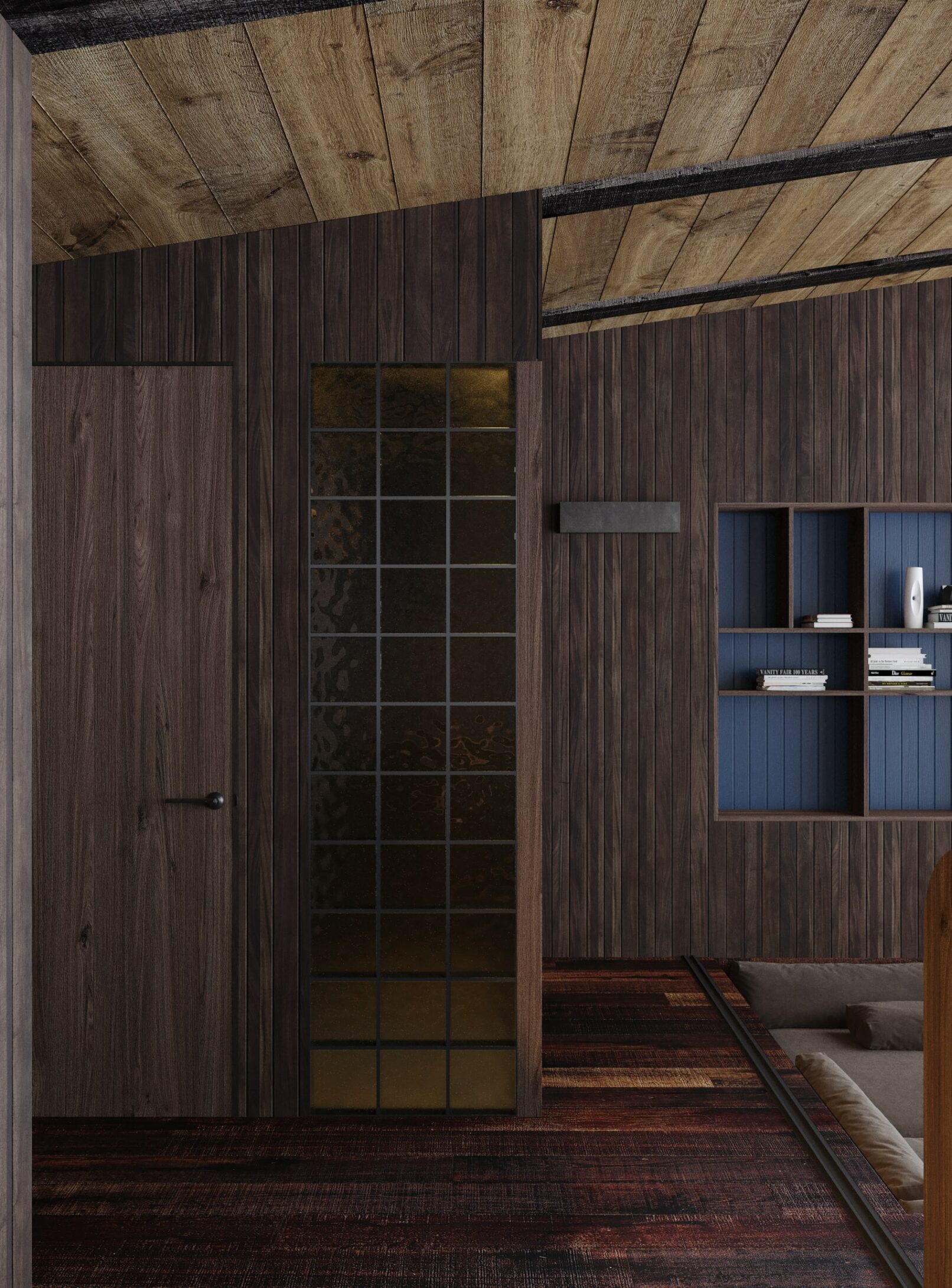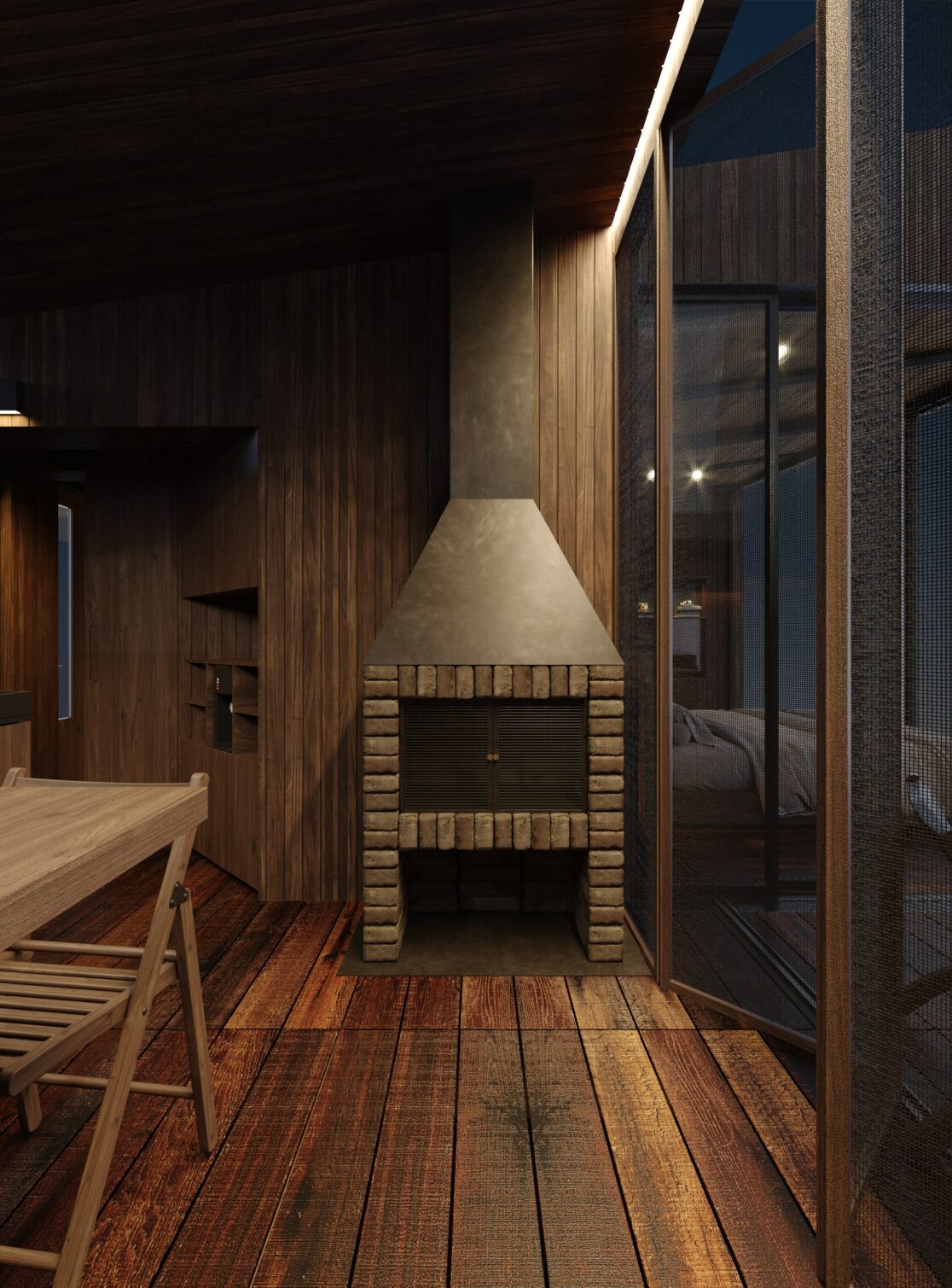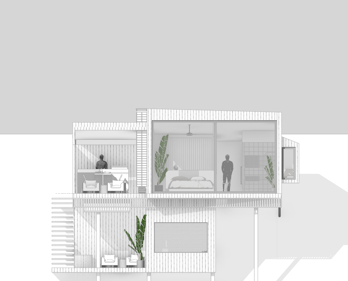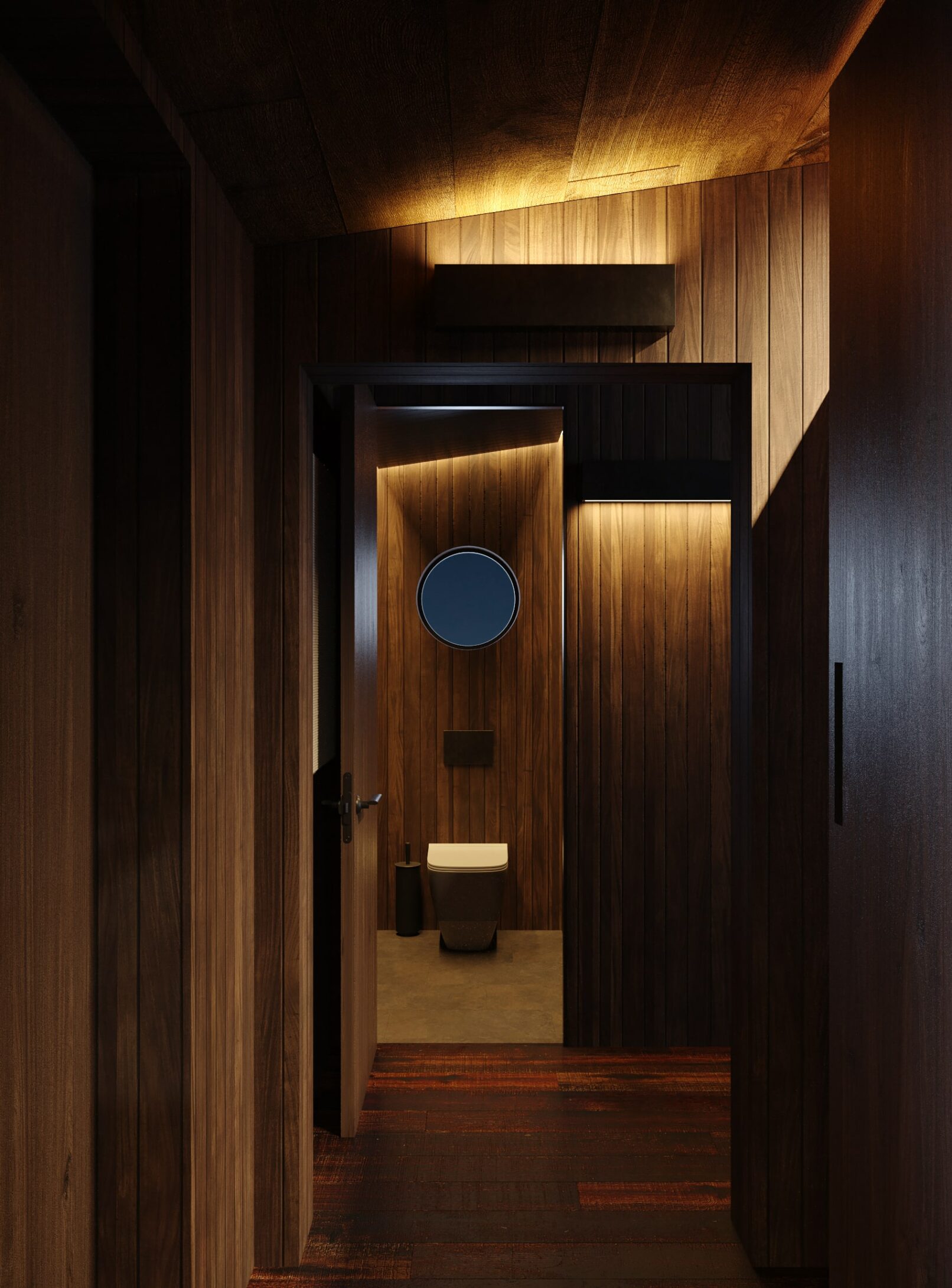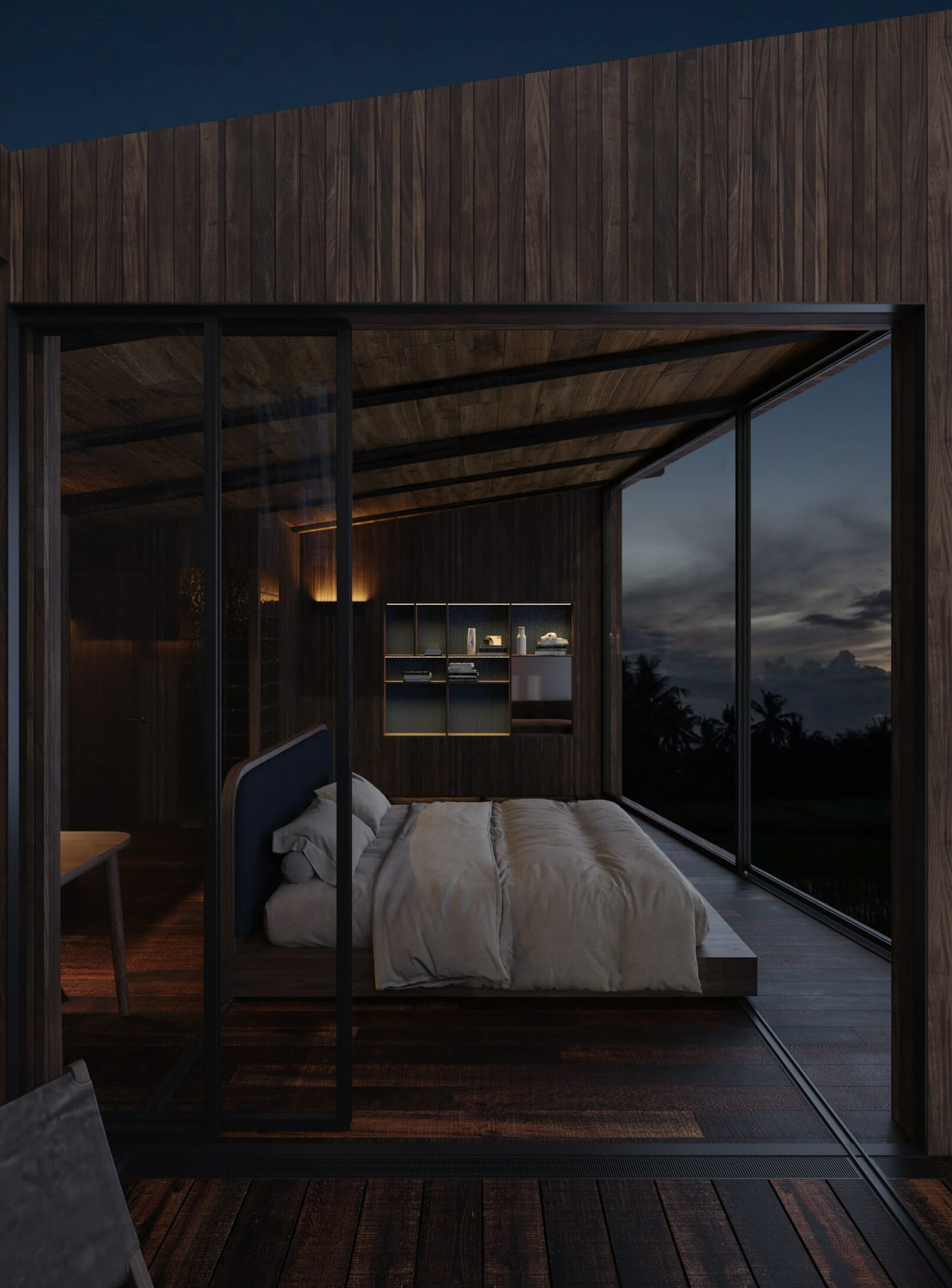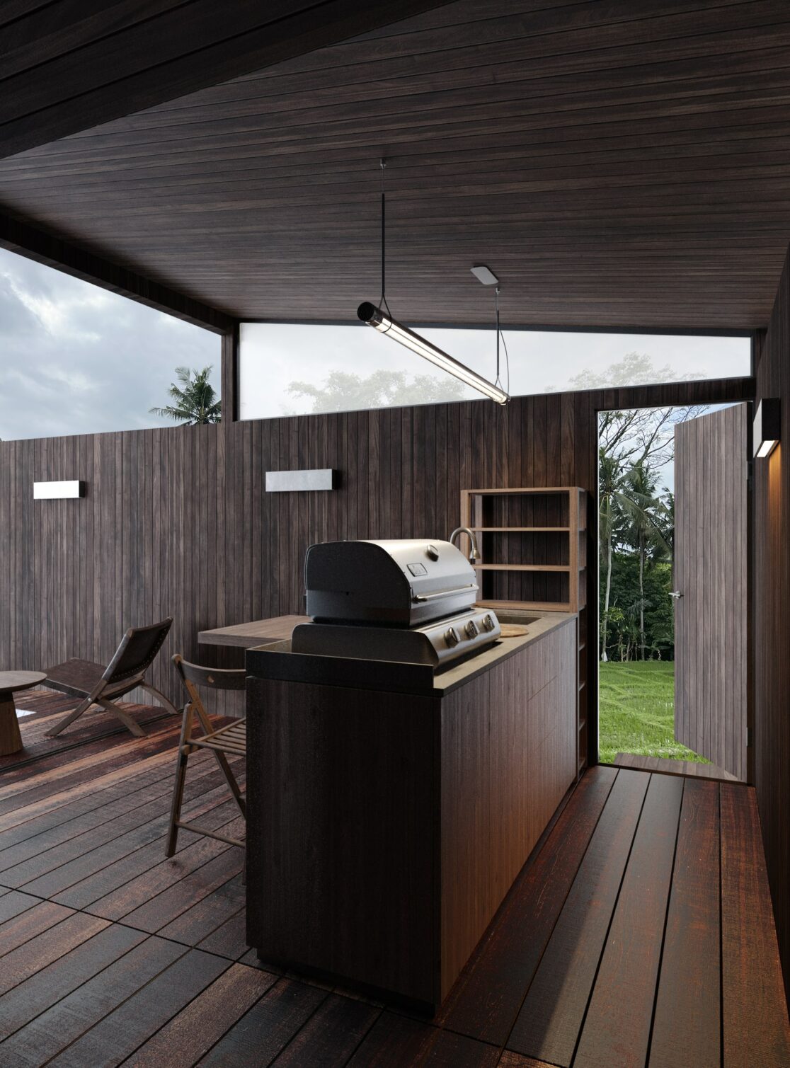 Архитектура модуля подчёркнуто простая и честная — лаконичные формы, модульная структура и выразительный ритм деревянной обшивки. Планировка продумана так, чтобы создать приватные и открытые зоны, сохранив при этом компактность. Вход ведёт на верхний уровень, где расположены уличная кухня, спальня с заглублённой зоной отдыха у окна, гардеробная, душ и туалет.