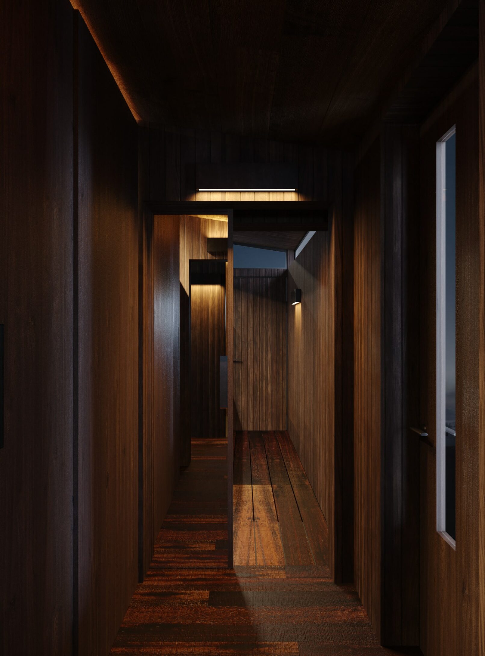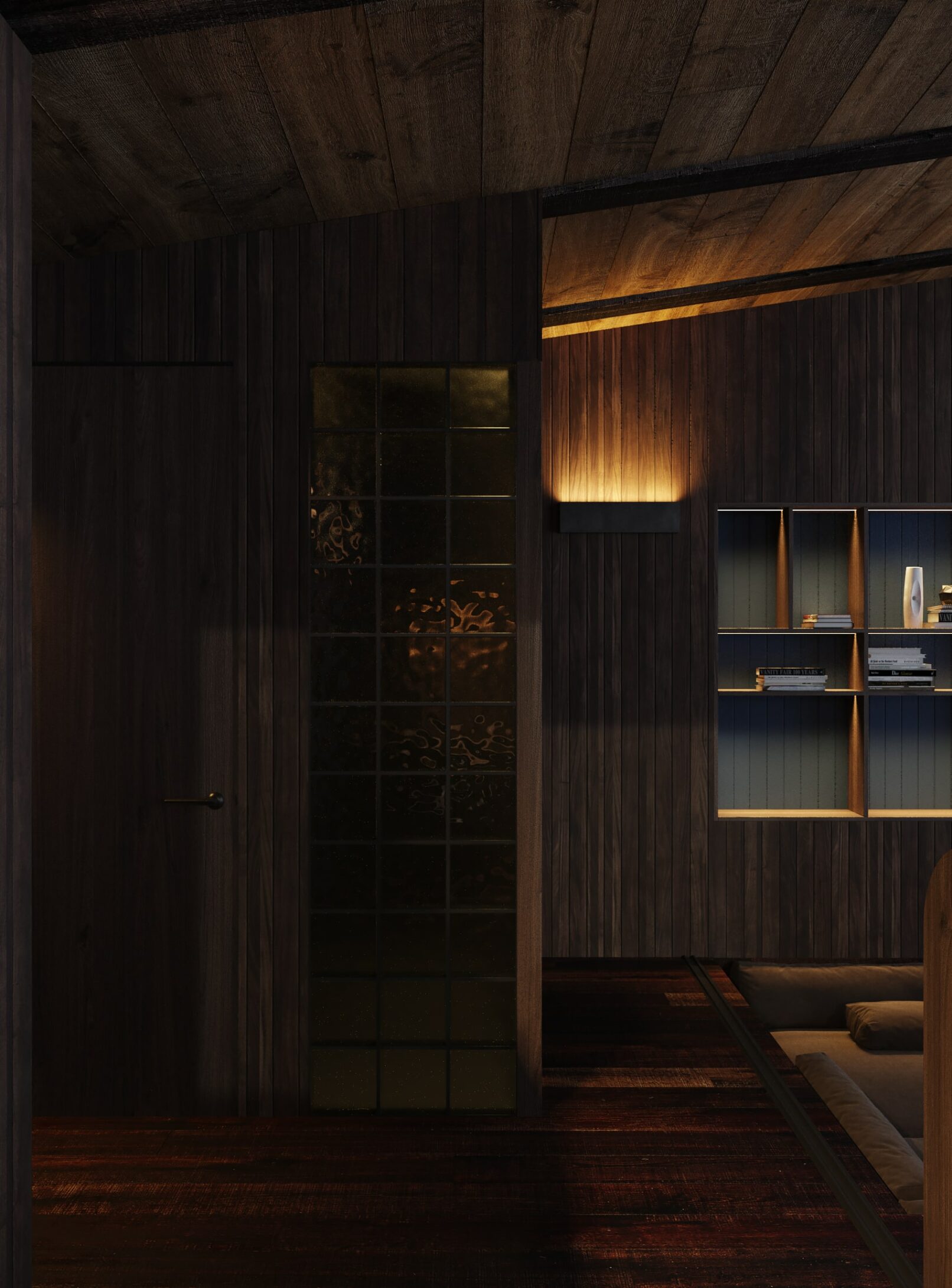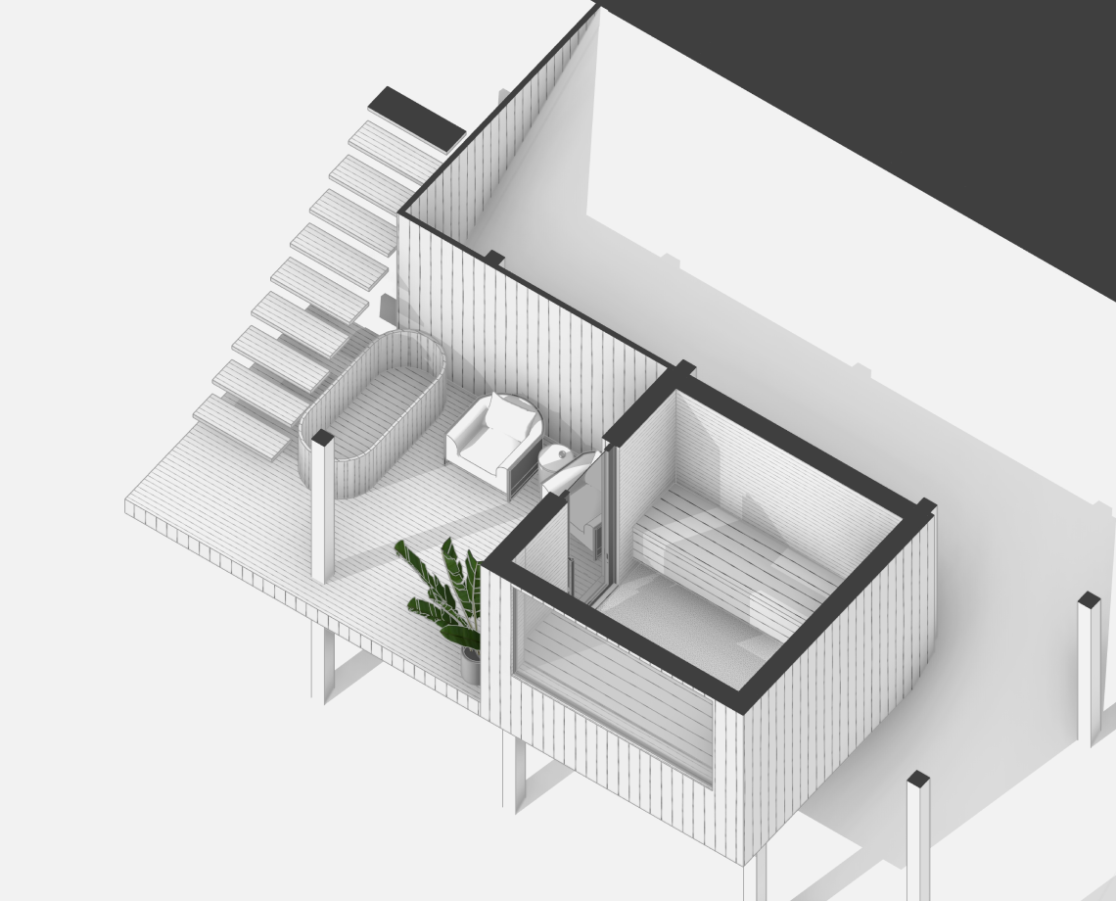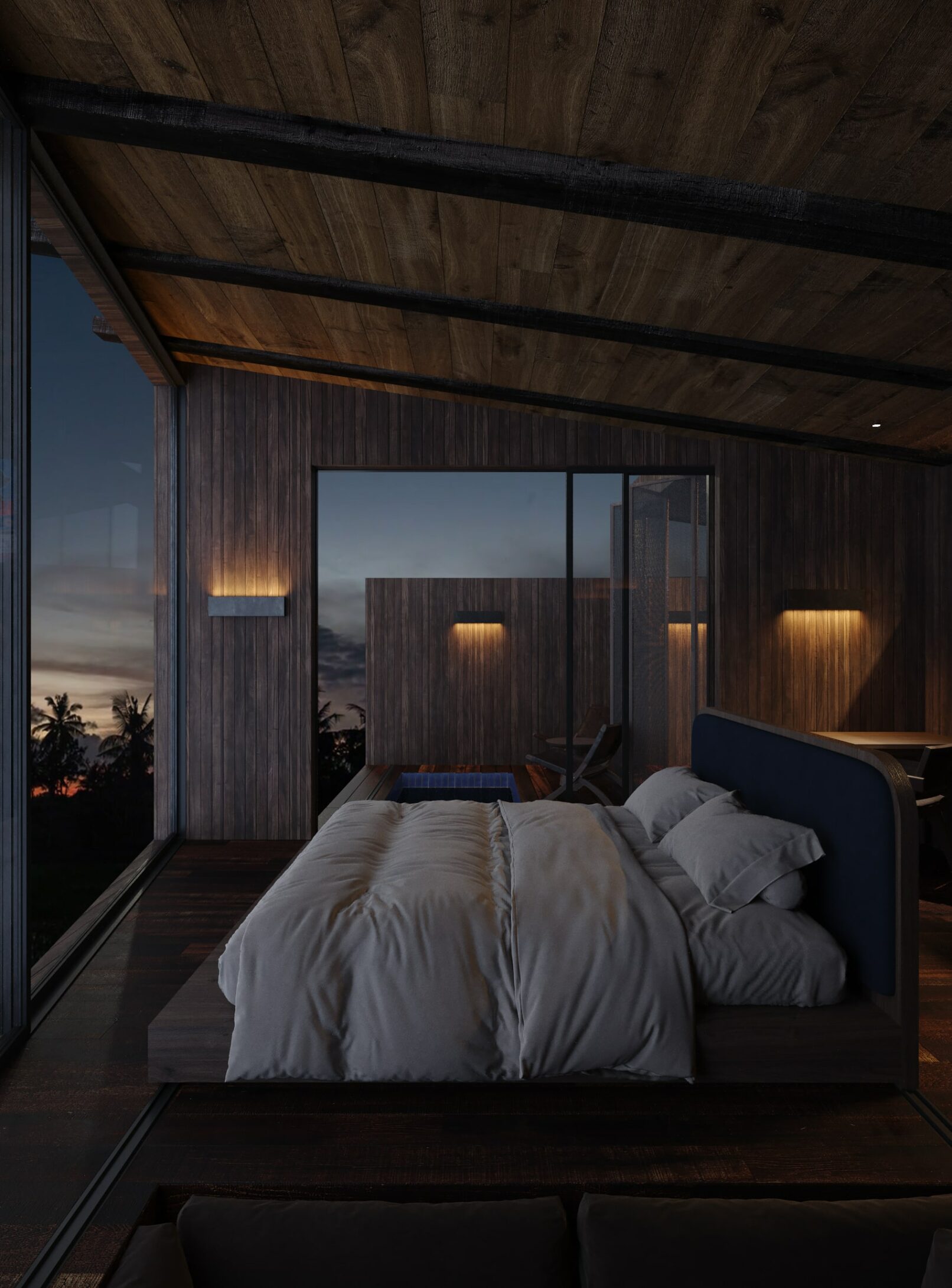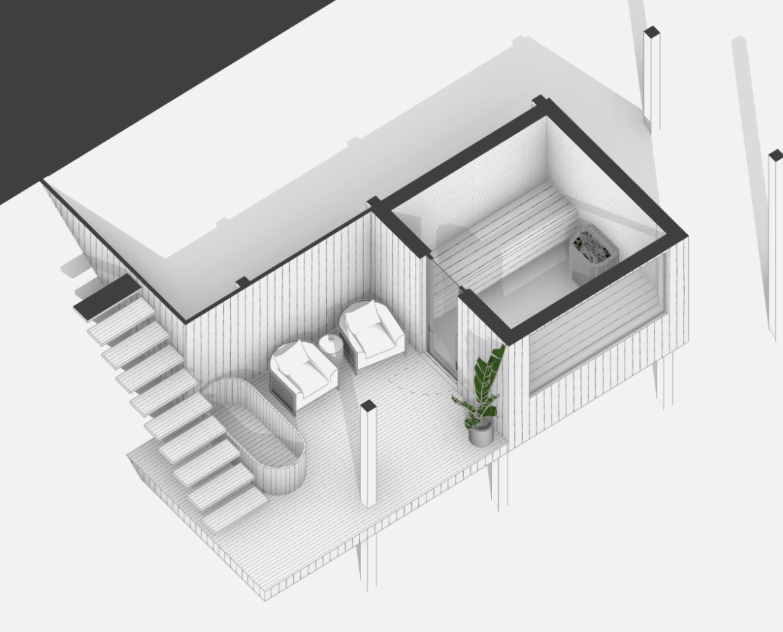 Архитектура модуля подчёркнуто простая и честная — лаконичные формы, модульная структура и выразительный ритм деревянной обшивки. Планировка продумана так, чтобы создать приватные и открытые зоны, сохранив при этом компактность. Вход ведёт на верхний уровень, где расположены уличная кухня, спальня с заглублённой зоной отдыха у окна, гардеробная, душ и туалет.