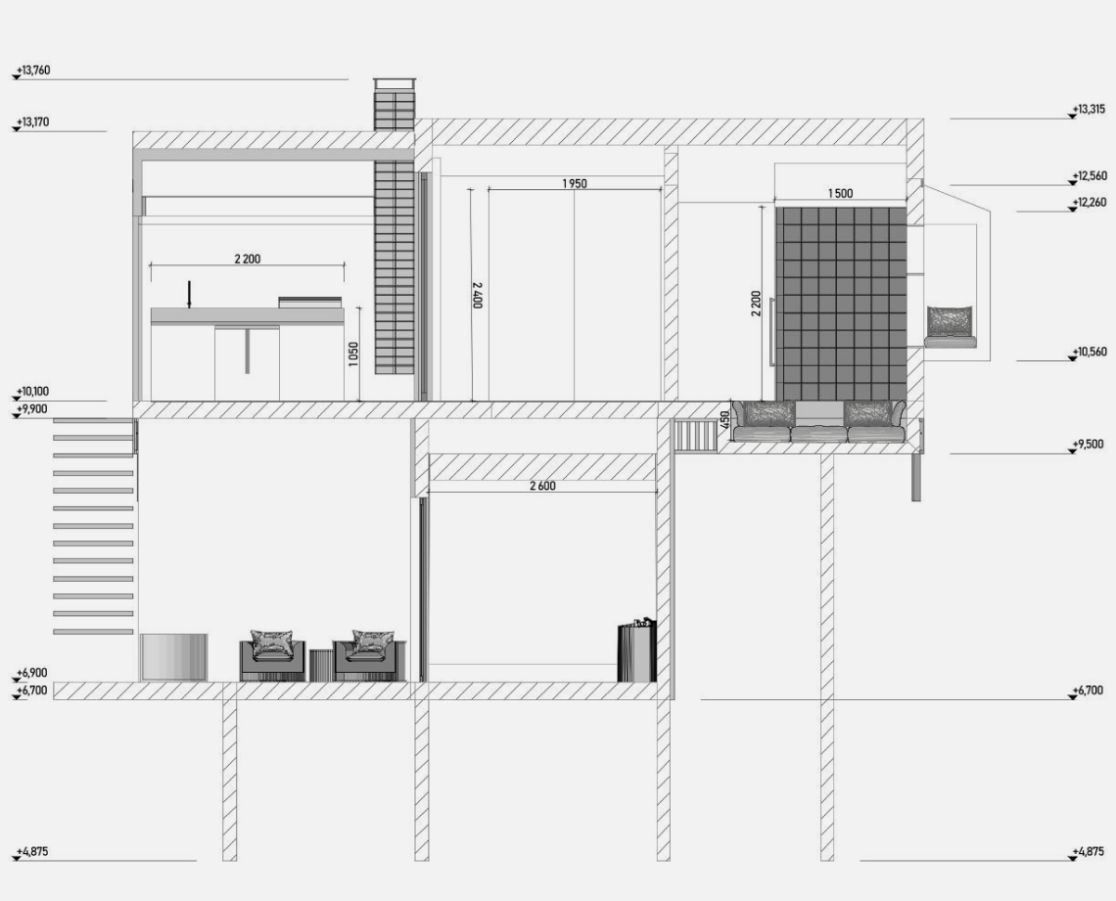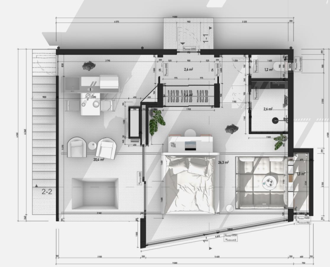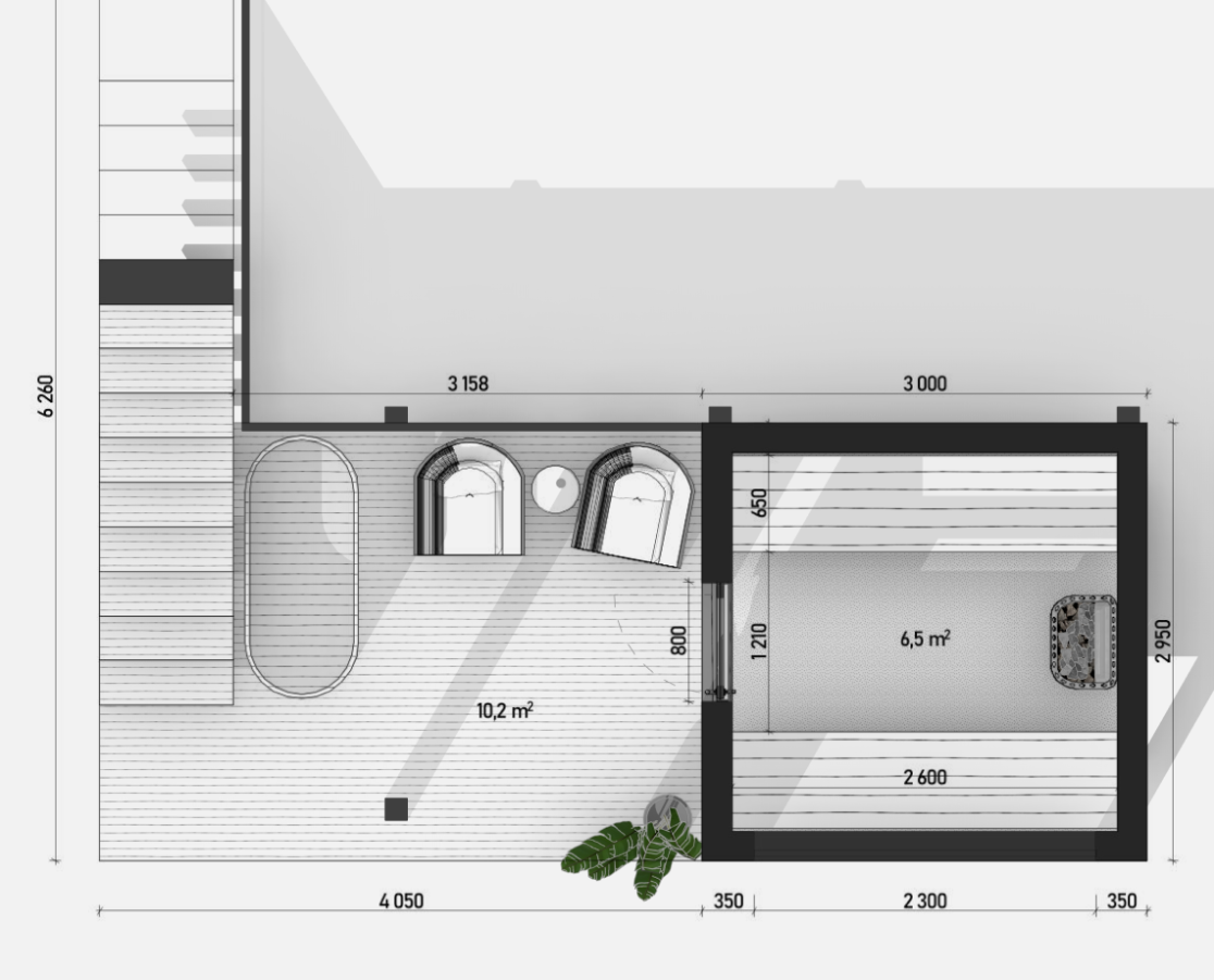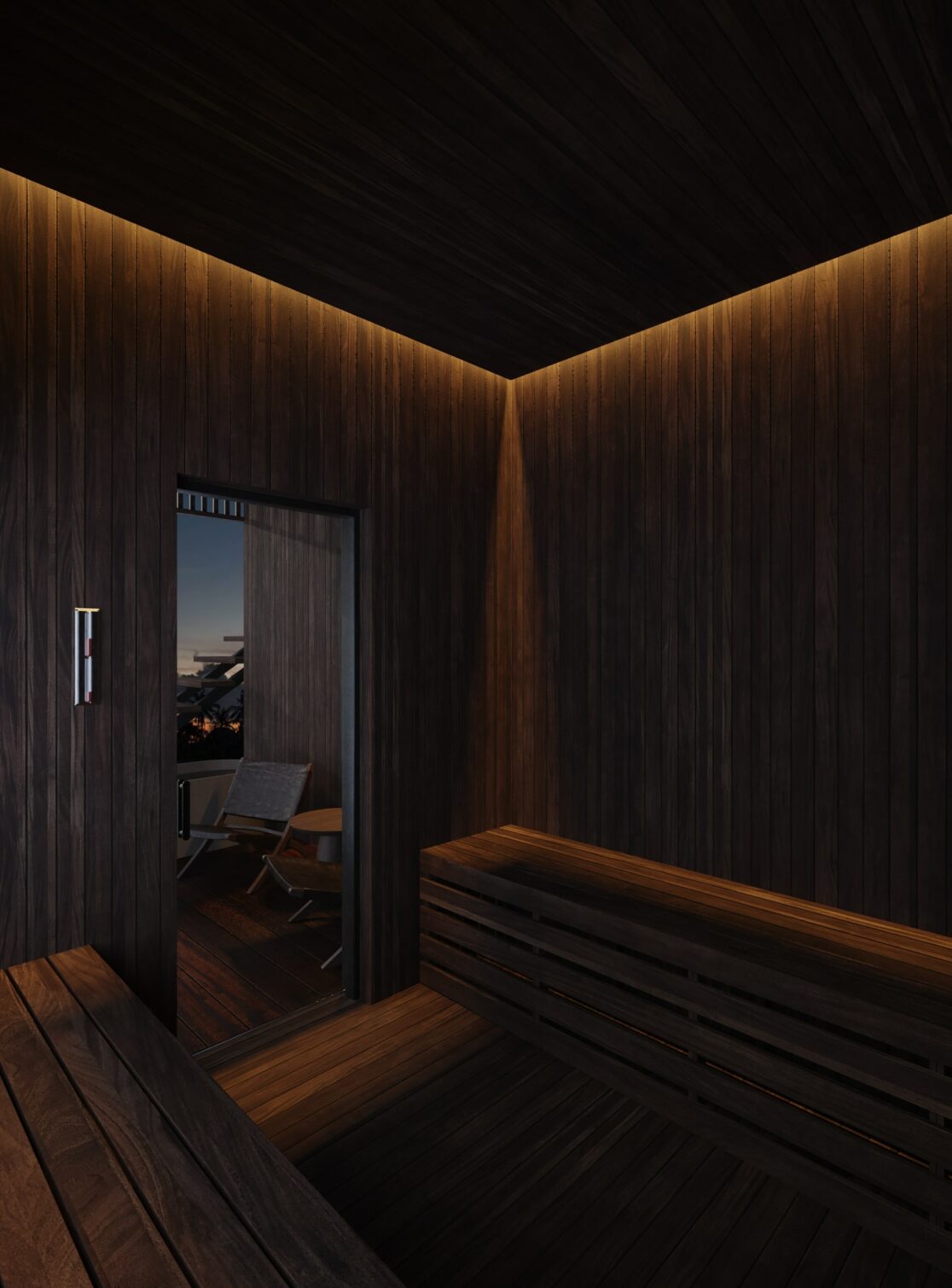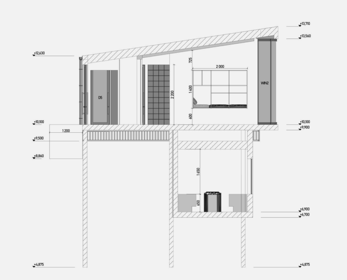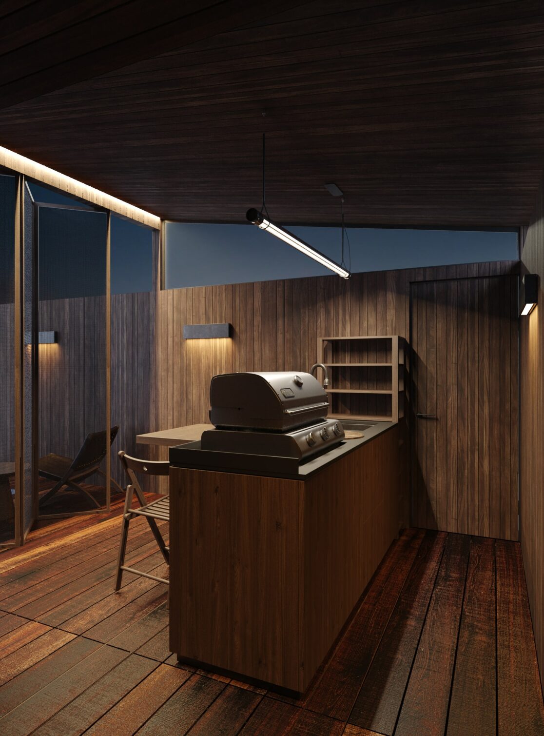 Архитектура модуля подчёркнуто простая и честная — лаконичные формы, модульная структура и выразительный ритм деревянной обшивки. Планировка продумана так, чтобы создать приватные и открытые зоны, сохранив при этом компактность. Вход ведёт на верхний уровень, где расположены уличная кухня, спальня с заглублённой зоной отдыха у окна, гардеробная, душ и туалет.