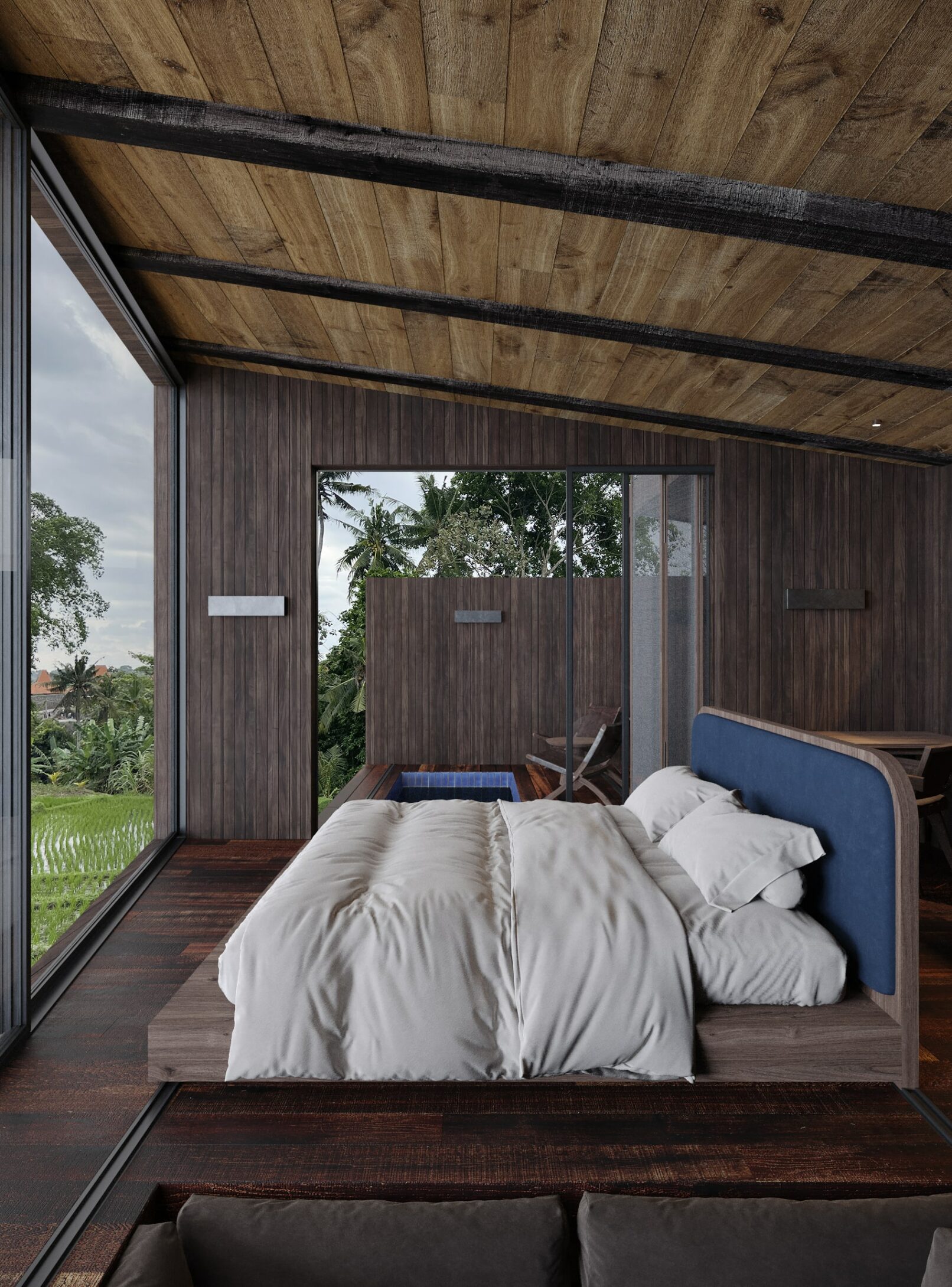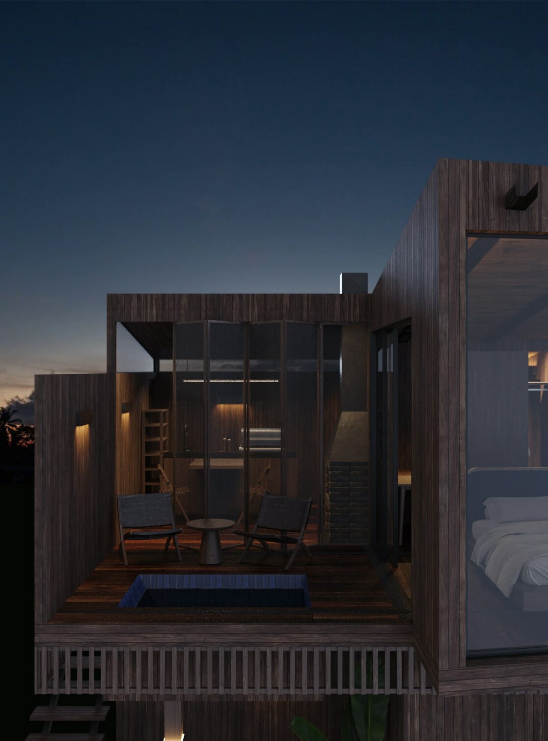 Компактный ретрит, спроектированный для жизни в тропическом климате с максимальным погружением в природную среду. Здание встроено в склон холма и приподнято на тонких опорах, что позволяет сохранить рельеф участка и обеспечить ощущение лёгкости. Основной объём развёрнут к панораме джунглей, а большая площадь остекления размывает границы между интерьером и внешним пространством.
