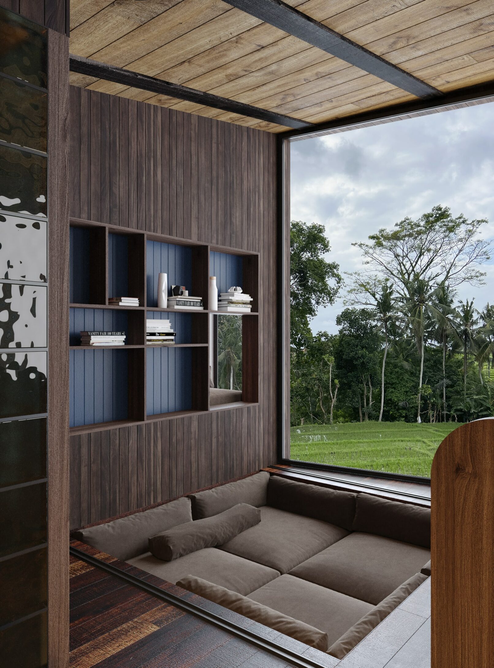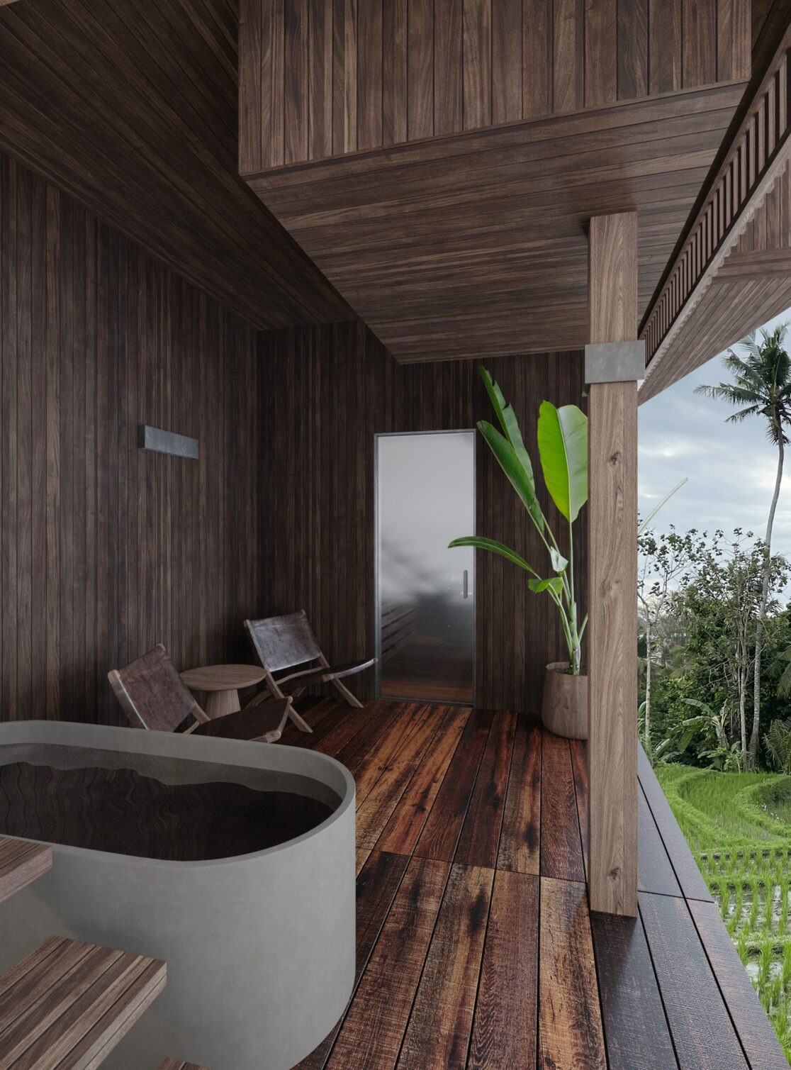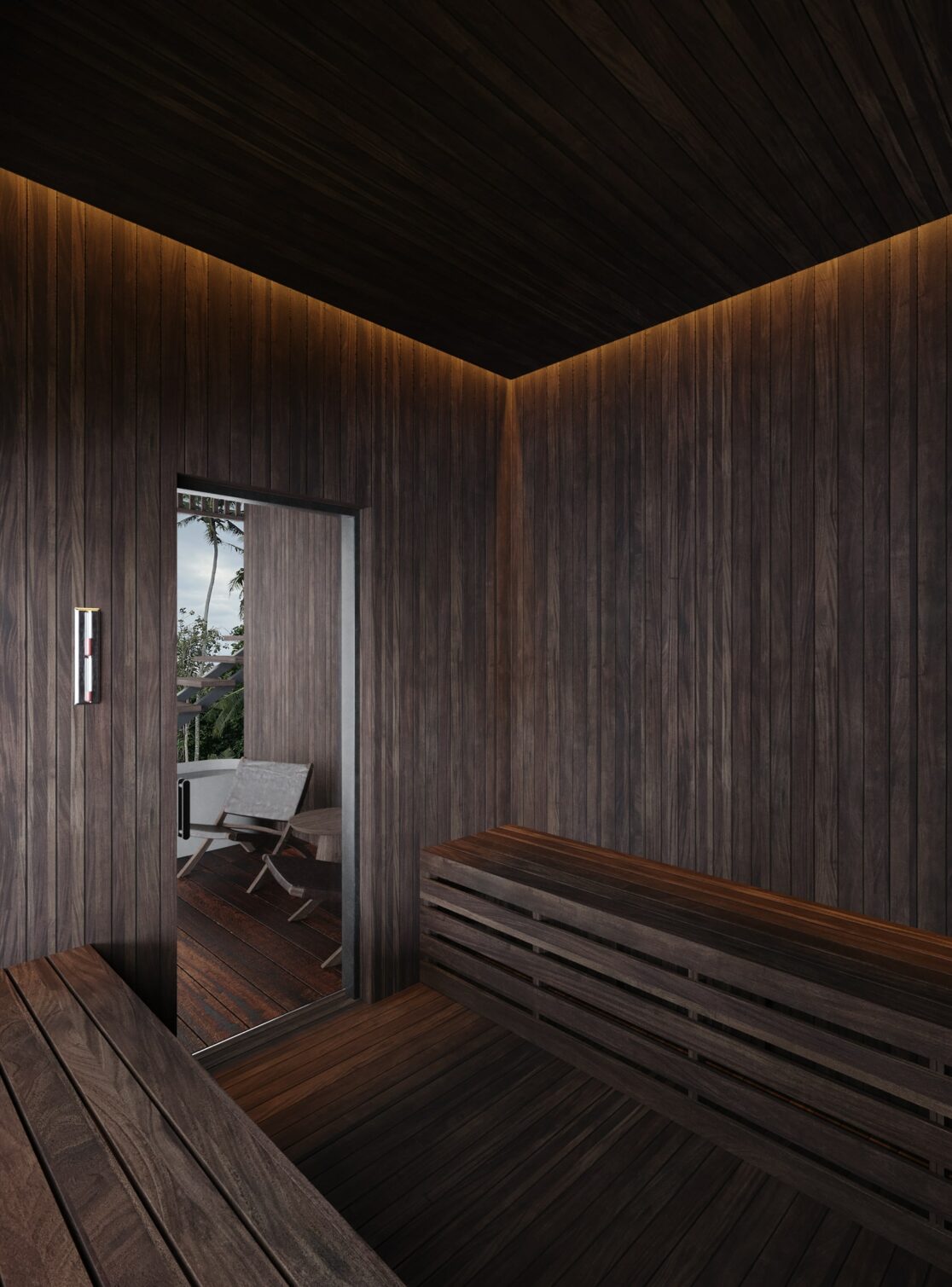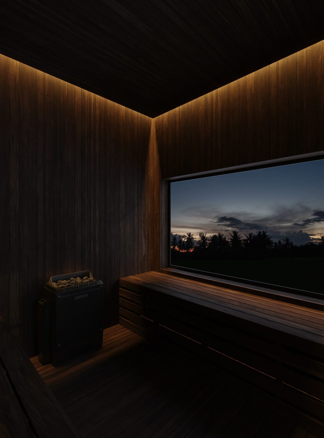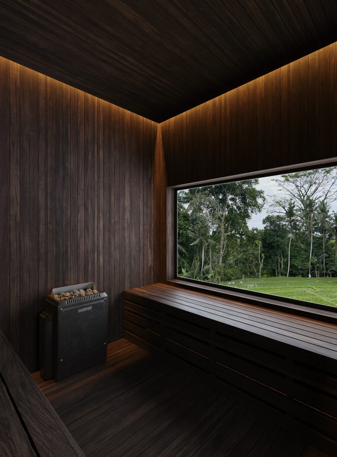 Нижний уровень — это отдельное пространство для восстановления: парная и купель с холодной водой, окружённые плотной зеленью. Натуральные материалы, естественная вентиляция, тень и продуманная ориентация дома делают его устойчивым к жаркому влажному климату, создавая комфортное и тихое убежище посреди природы.