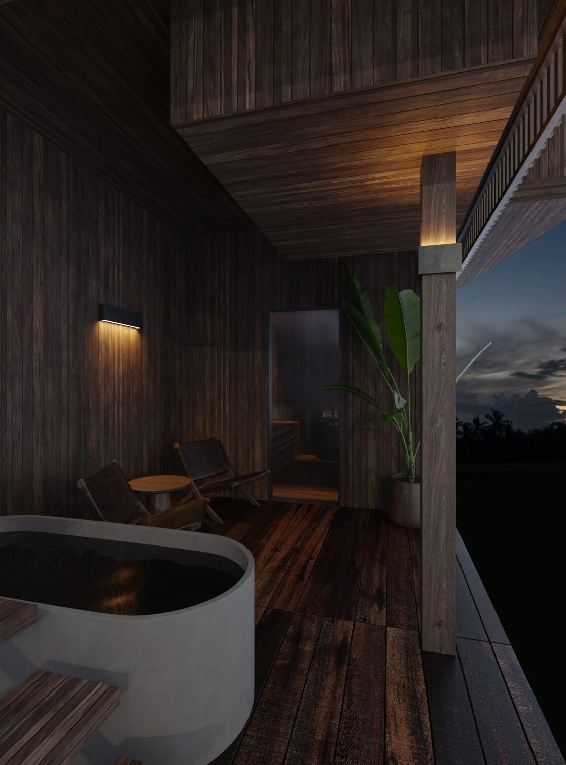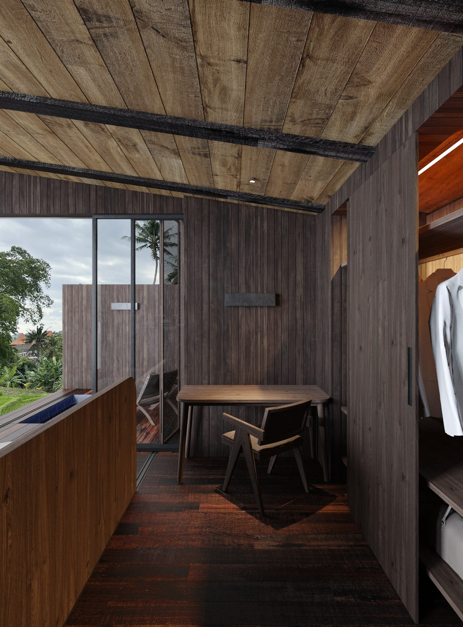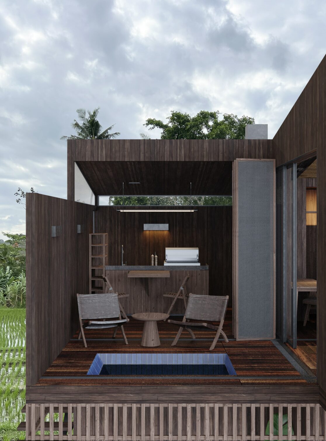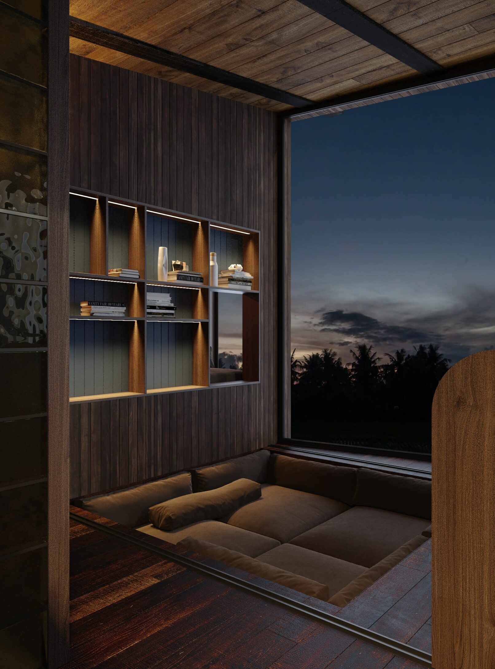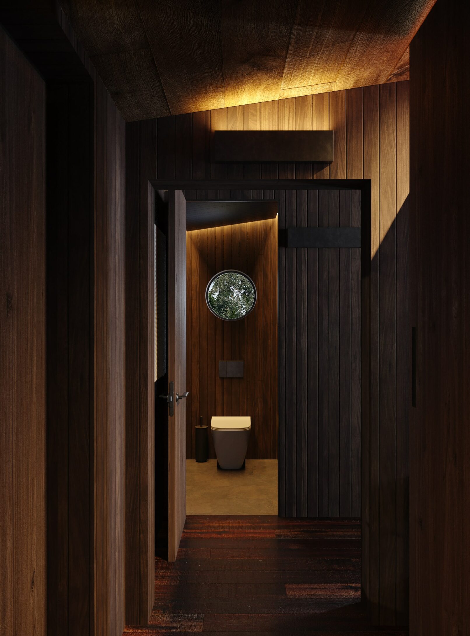 Нижний уровень — это отдельное пространство для восстановления: парная и купель с холодной водой, окружённые плотной зеленью. Натуральные материалы, естественная вентиляция, тень и продуманная ориентация дома делают его устойчивым к жаркому влажному климату, создавая комфортное и тихое убежище посреди природы.