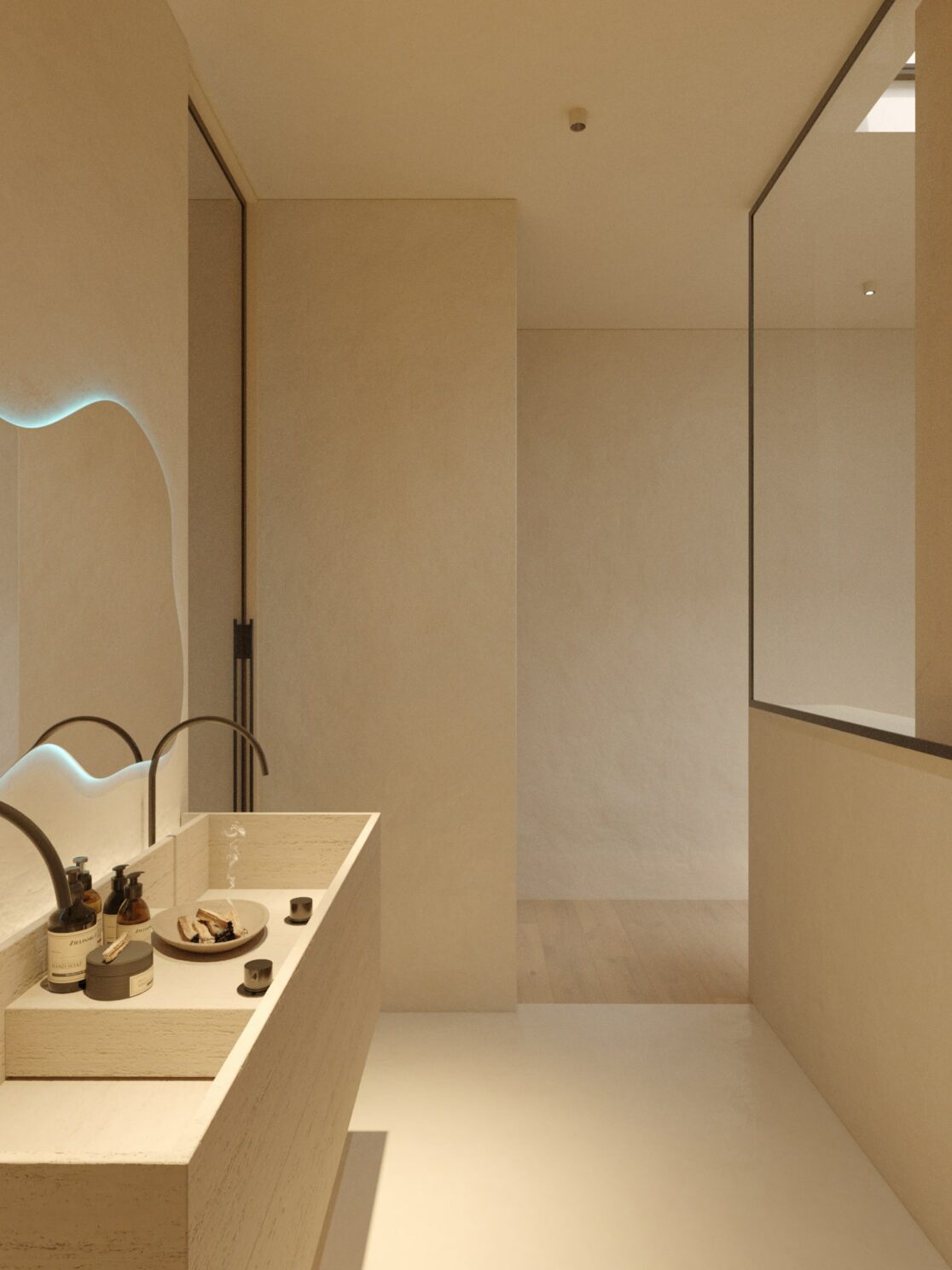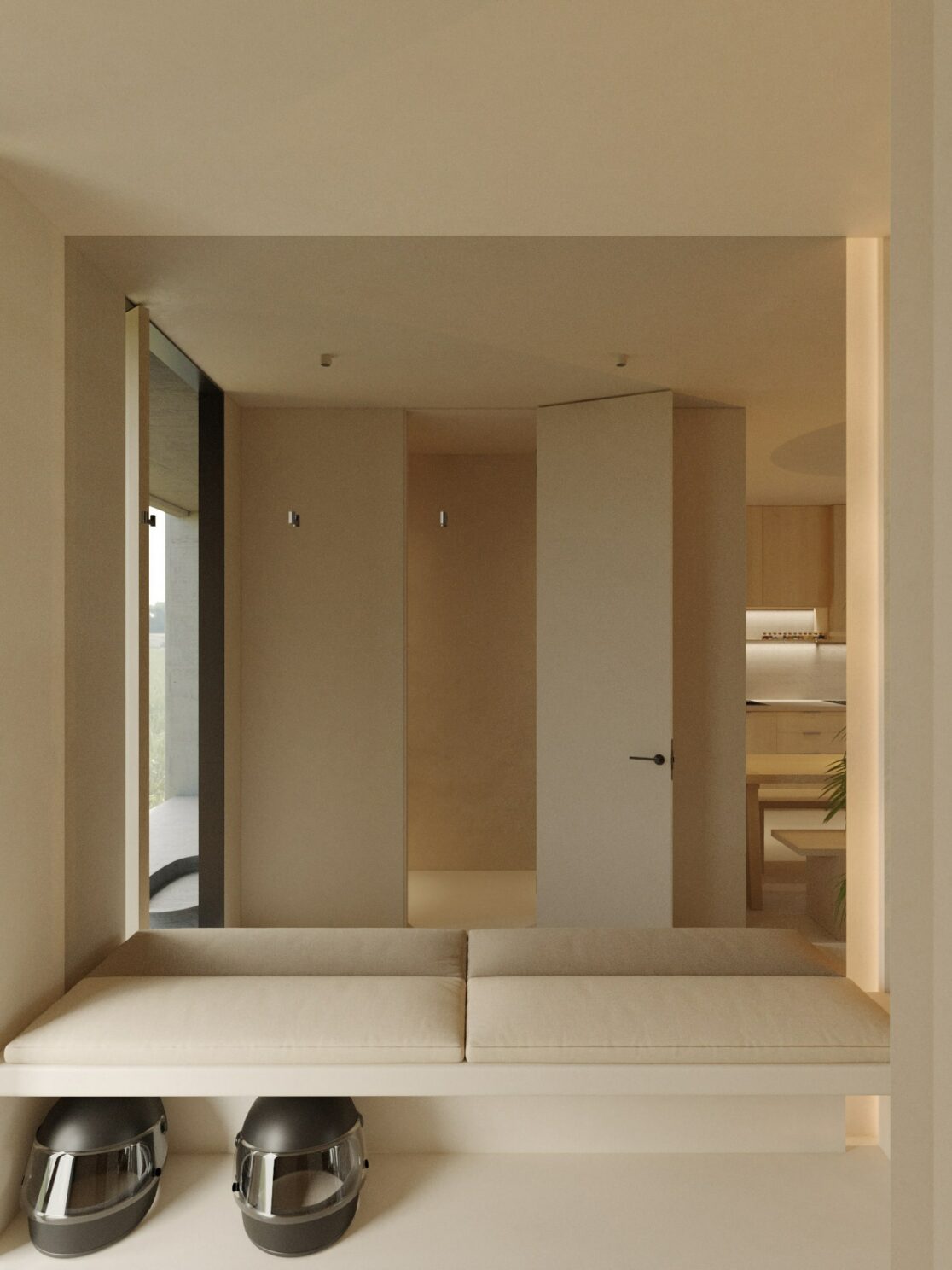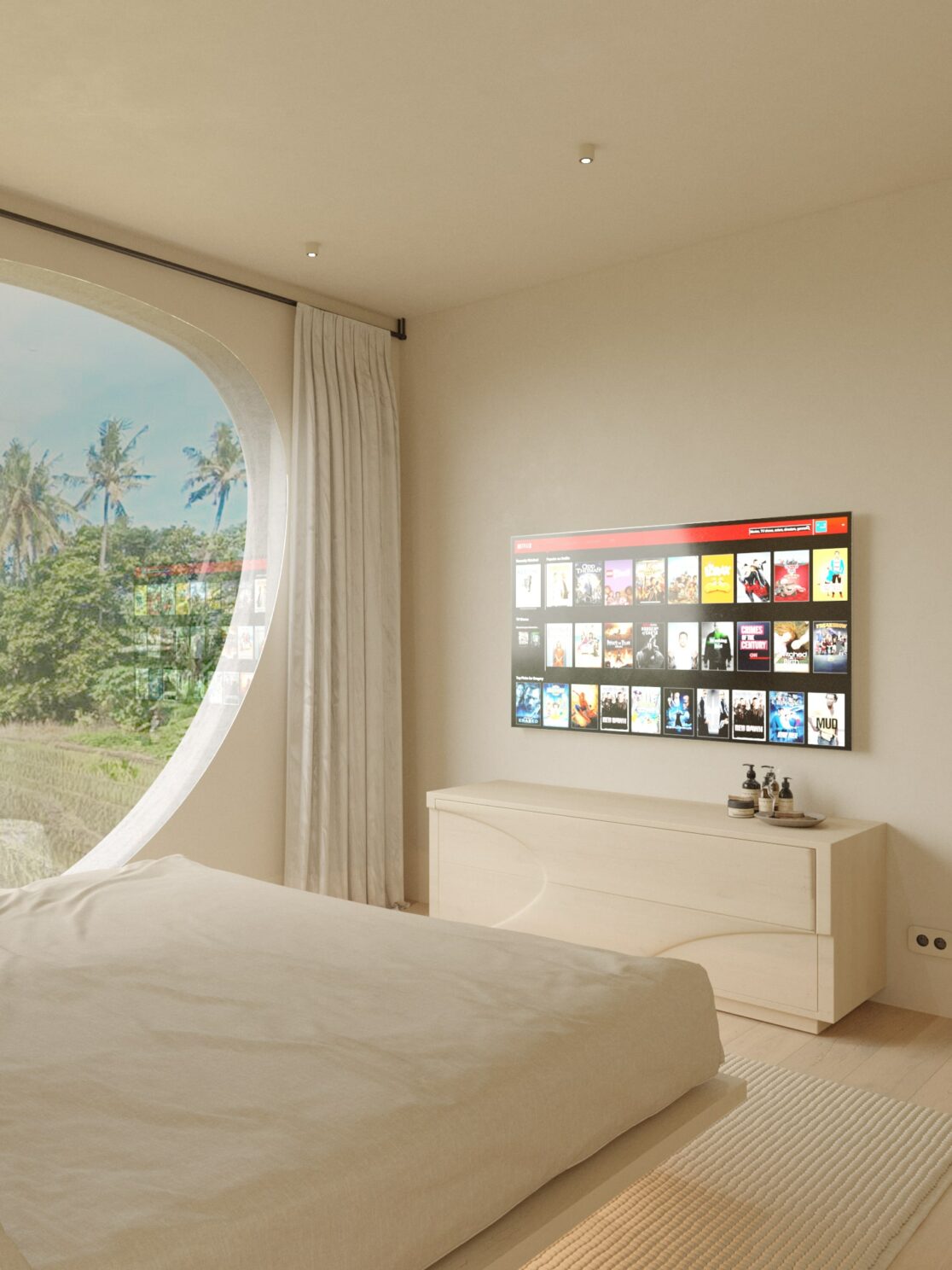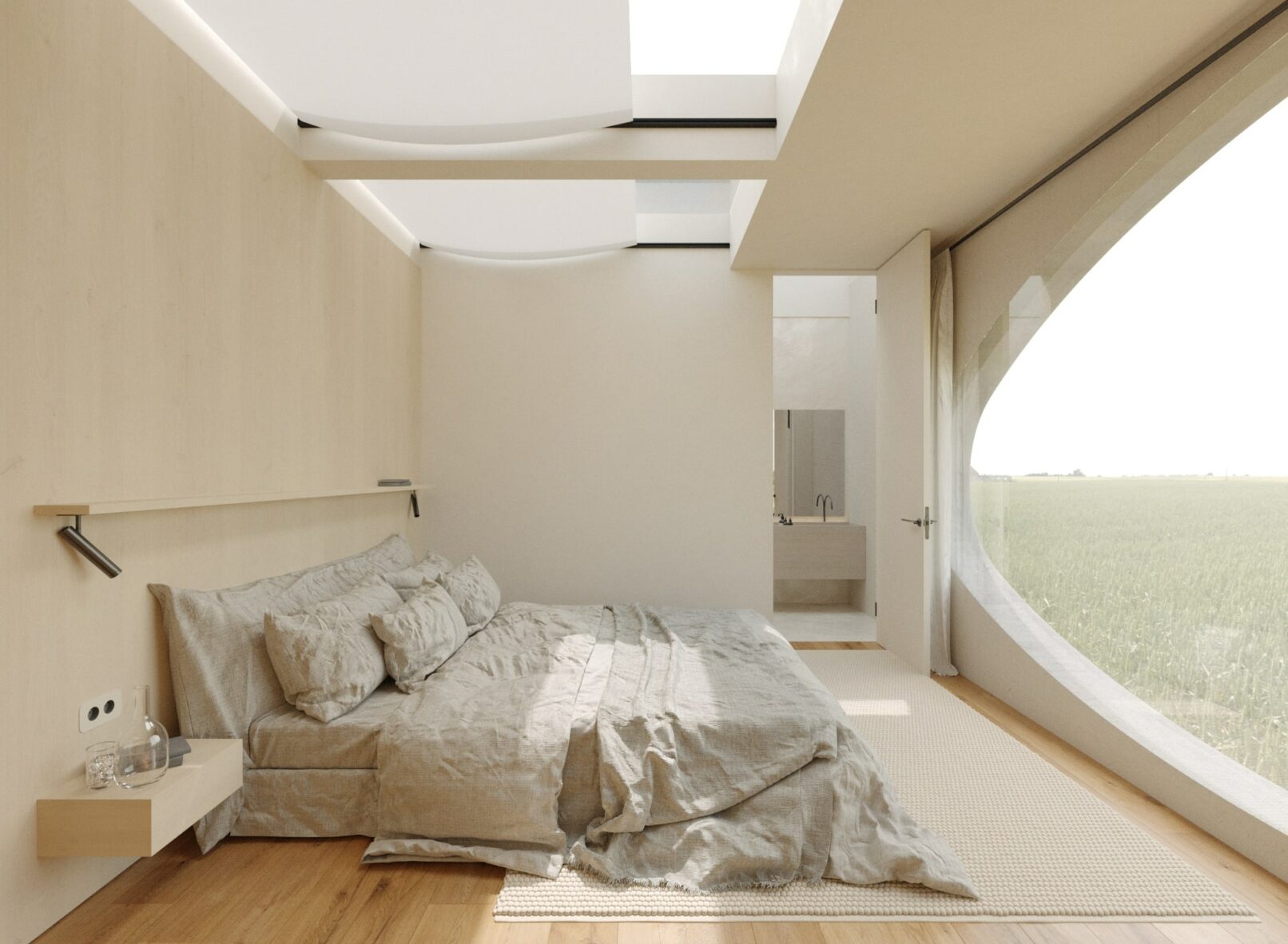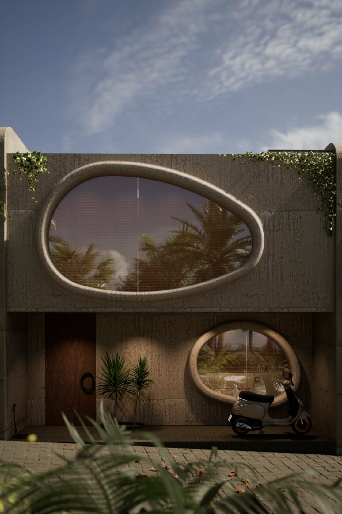 Его выразительная идея строится на пластичном использовании бетона: фасады словно вылеплены вручную и прорезаны окнами органических, текучих форм. Эти «пузырьковые» проёмы — неровные, овальные, с мягкой кромкой — кажутся вросшими в монолитную массу здания, как природные включения. Бетон сохраняет грубую фактуру опалубки, что усиливает ощущение сырой материальности и делает дом визуально тяжёлым, но при этом естественным, как скала среди зелени.