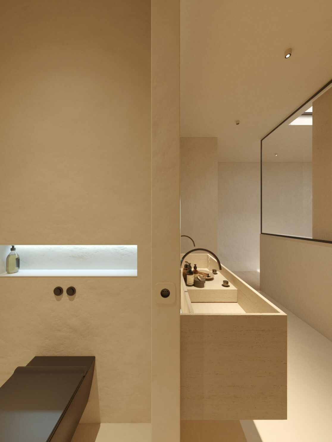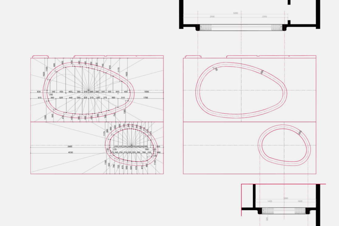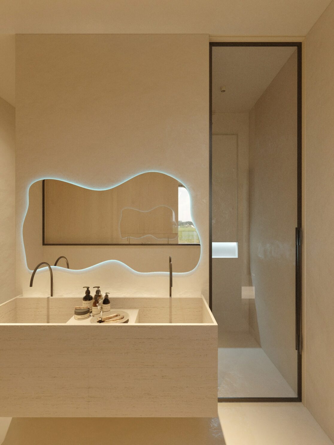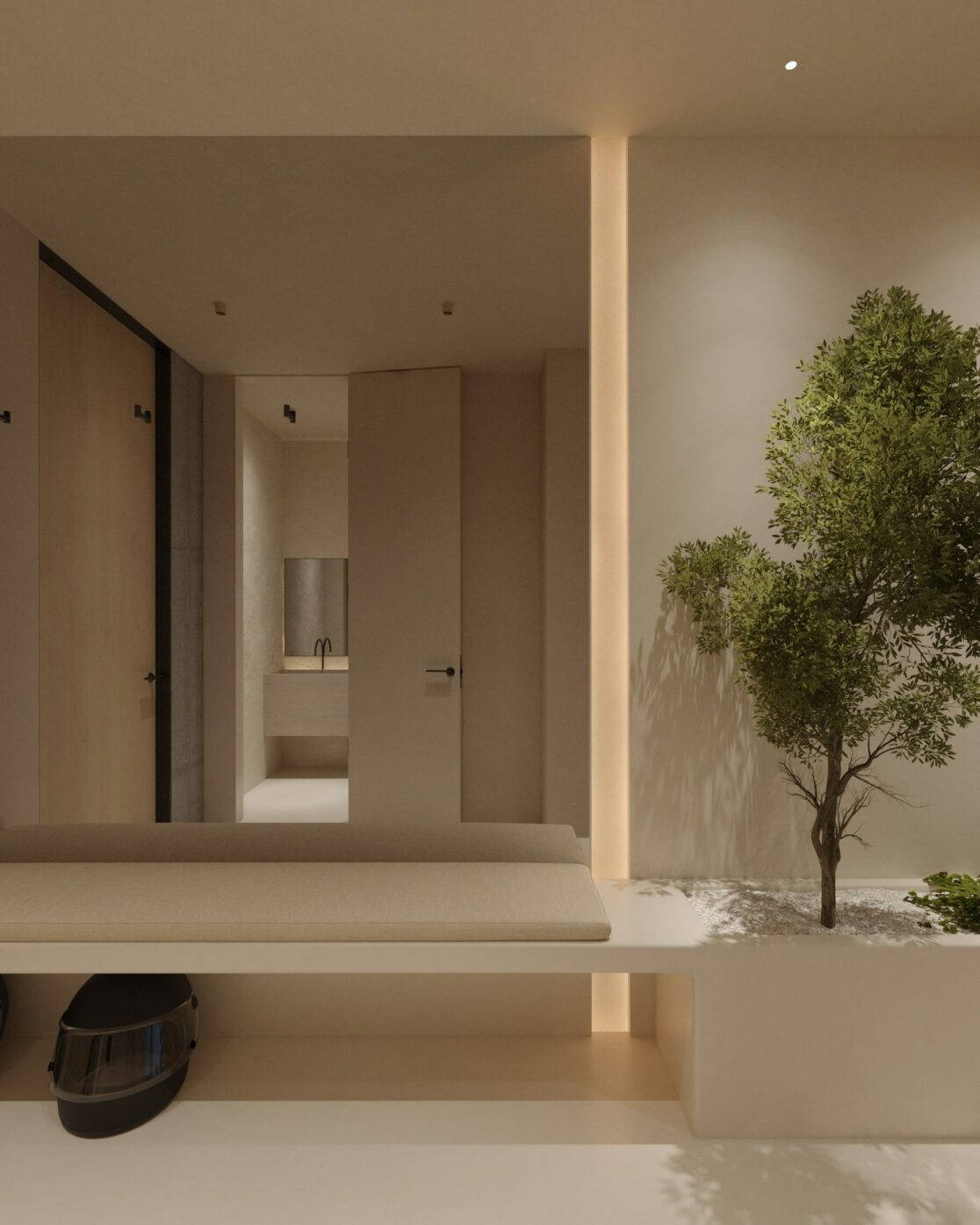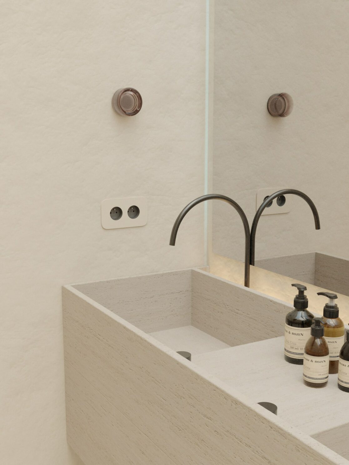 Его выразительная идея строится на пластичном использовании бетона: фасады словно вылеплены вручную и прорезаны окнами органических, текучих форм. Эти «пузырьковые» проёмы — неровные, овальные, с мягкой кромкой — кажутся вросшими в монолитную массу здания, как природные включения. Бетон сохраняет грубую фактуру опалубки, что усиливает ощущение сырой материальности и делает дом визуально тяжёлым, но при этом естественным, как скала среди зелени.