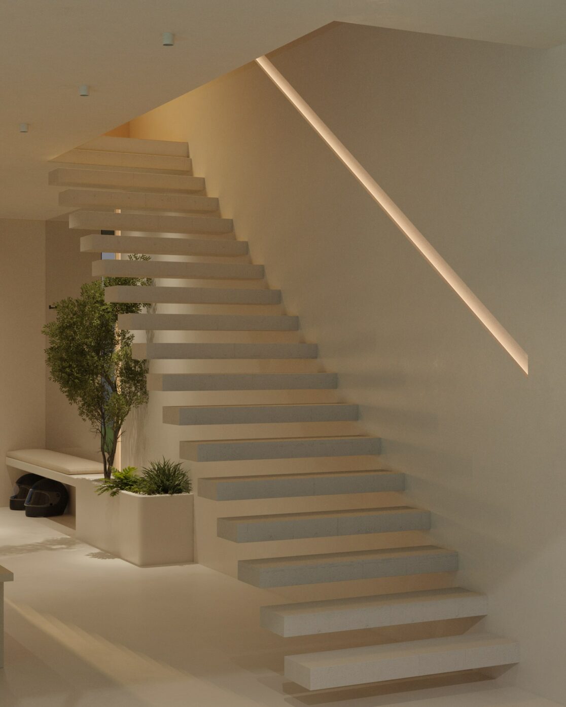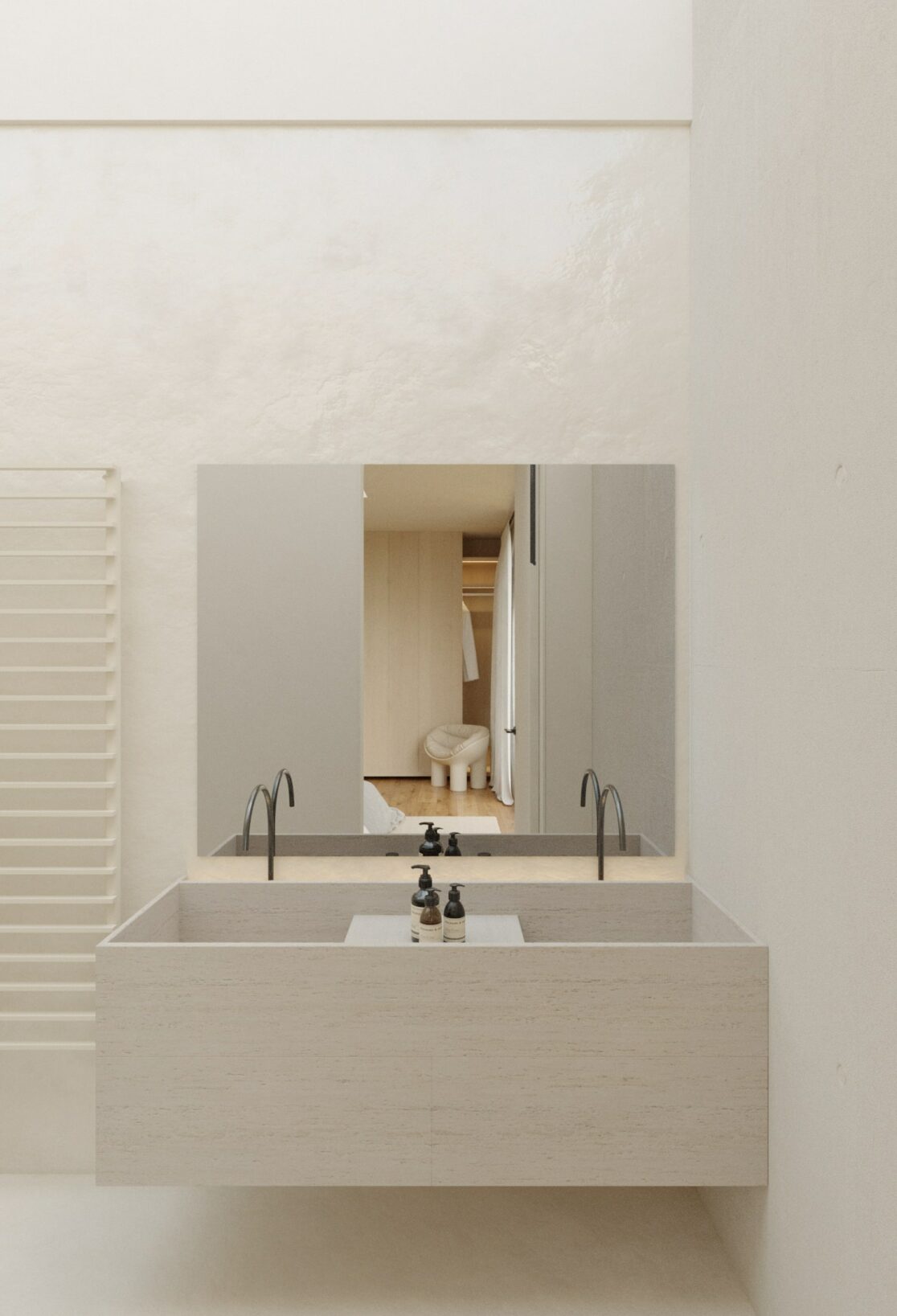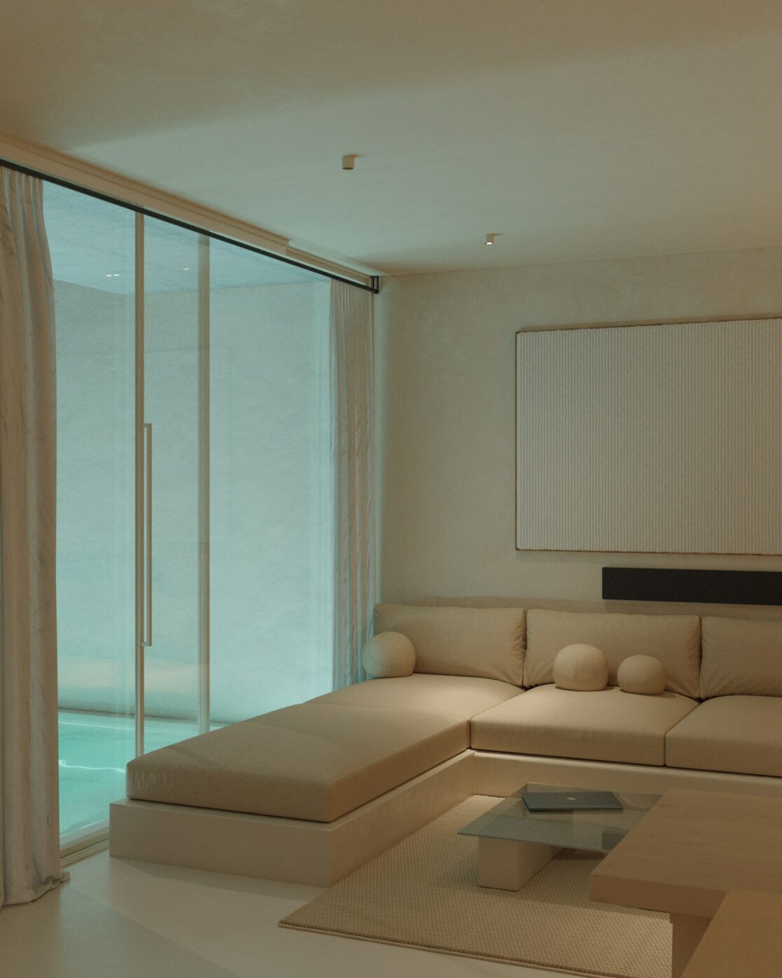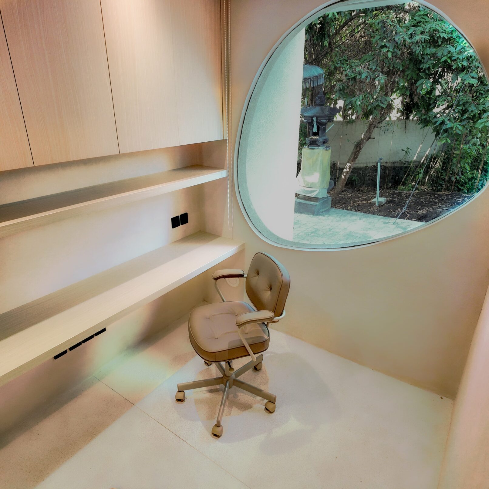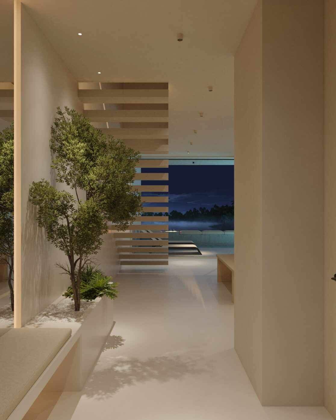 Его выразительная идея строится на пластичном использовании бетона: фасады словно вылеплены вручную и прорезаны окнами органических, текучих форм. Эти «пузырьковые» проёмы — неровные, овальные, с мягкой кромкой — кажутся вросшими в монолитную массу здания, как природные включения. Бетон сохраняет грубую фактуру опалубки, что усиливает ощущение сырой материальности и делает дом визуально тяжёлым, но при этом естественным, как скала среди зелени.
