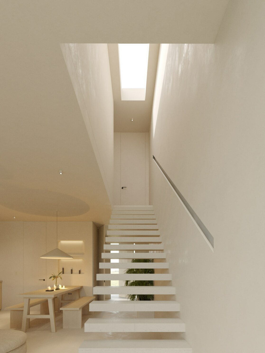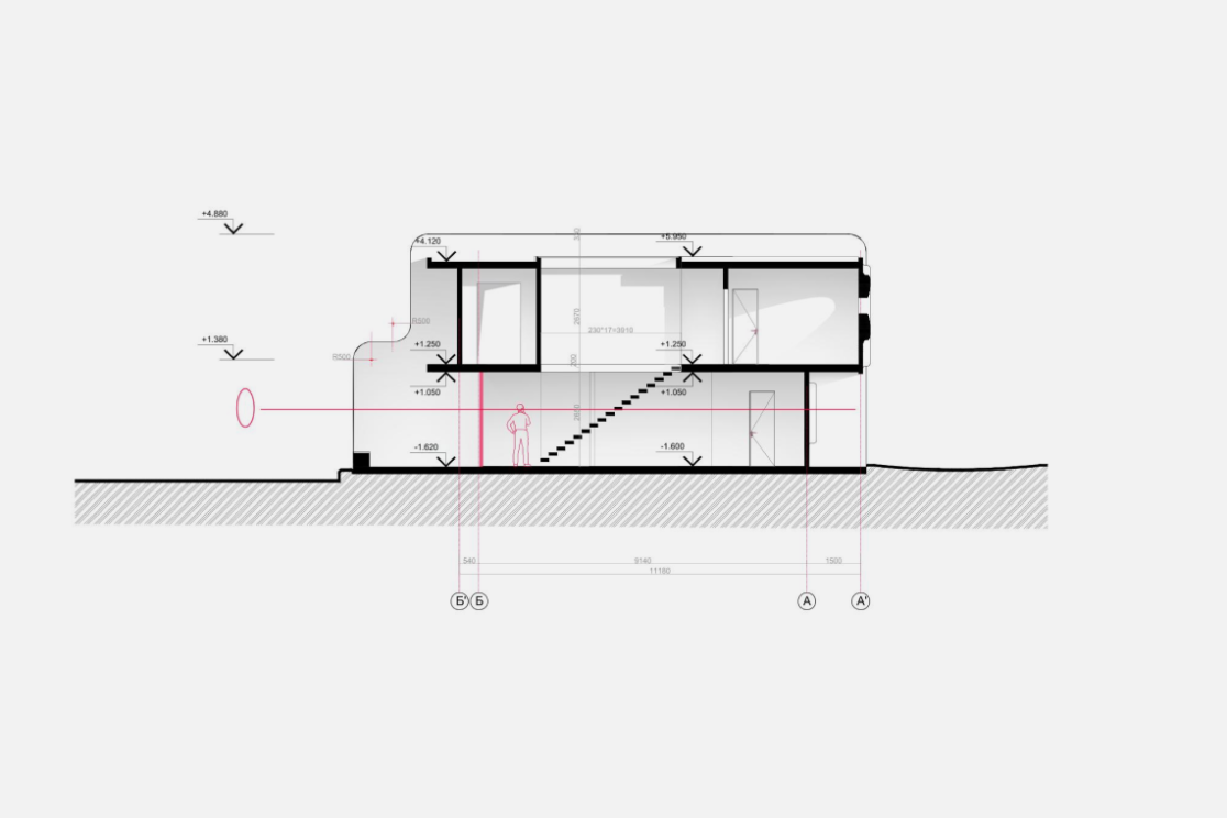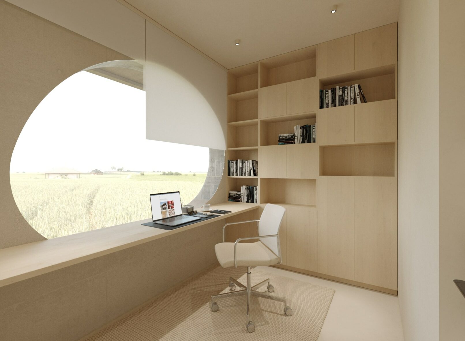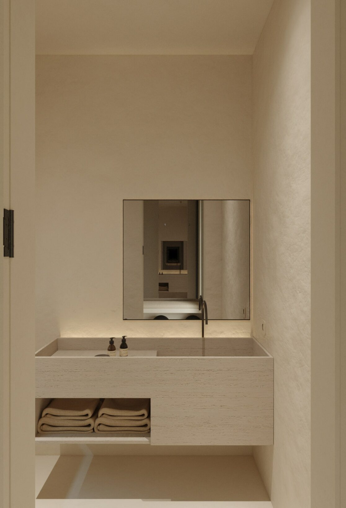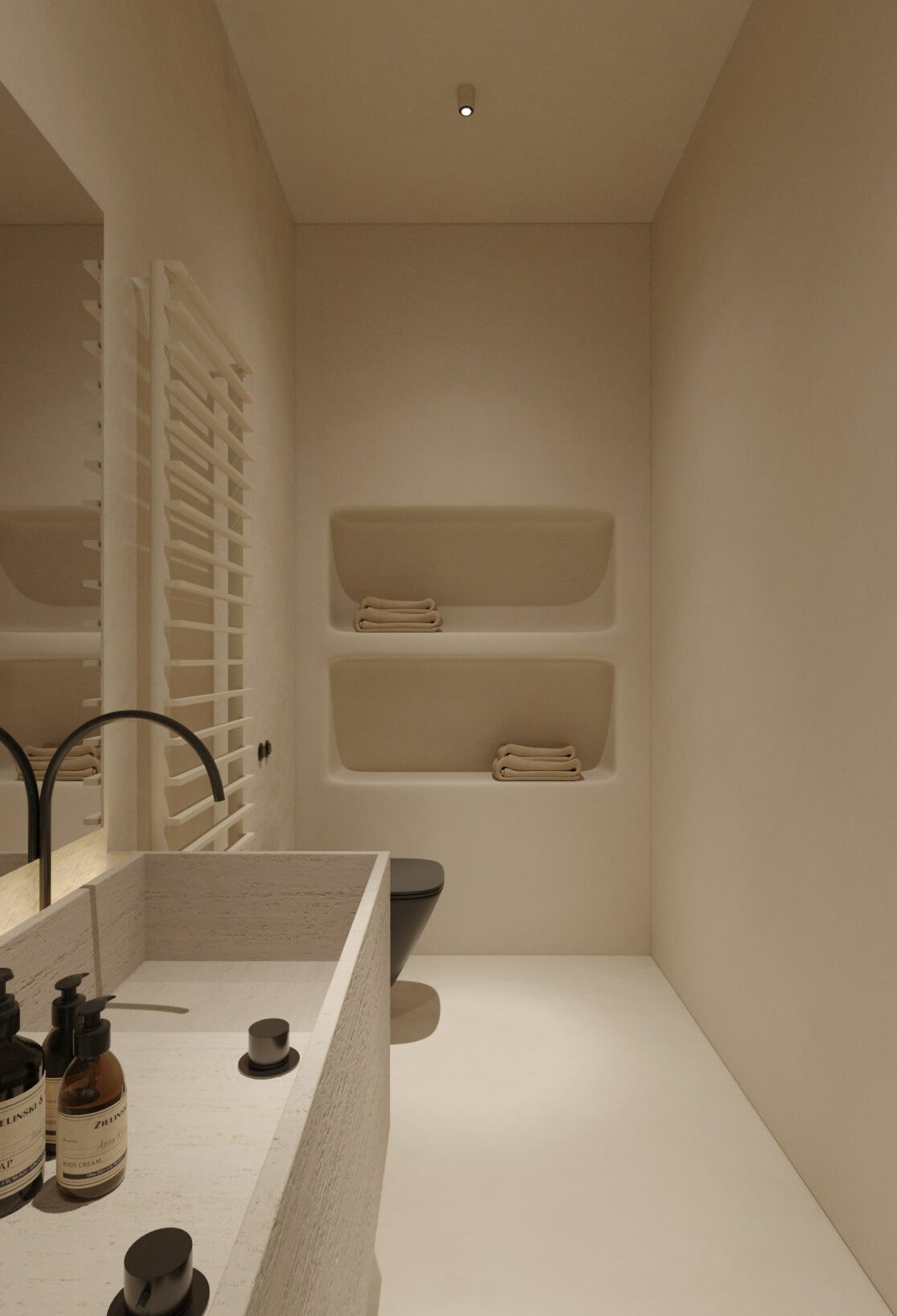 Его выразительная идея строится на пластичном использовании бетона: фасады словно вылеплены вручную и прорезаны окнами органических, текучих форм. Эти «пузырьковые» проёмы — неровные, овальные, с мягкой кромкой — кажутся вросшими в монолитную массу здания, как природные включения. Бетон сохраняет грубую фактуру опалубки, что усиливает ощущение сырой материальности и делает дом визуально тяжёлым, но при этом естественным, как скала среди зелени.