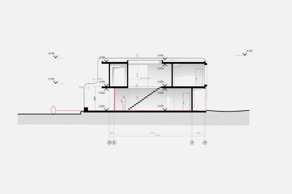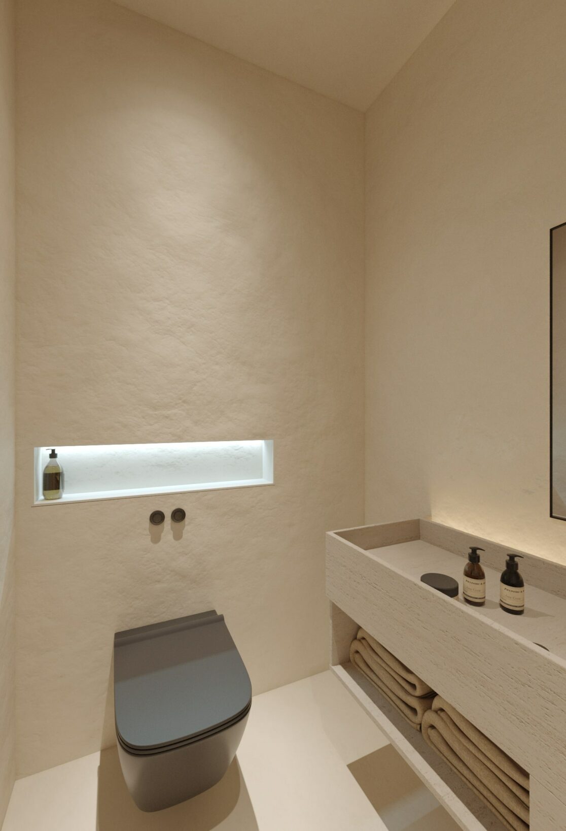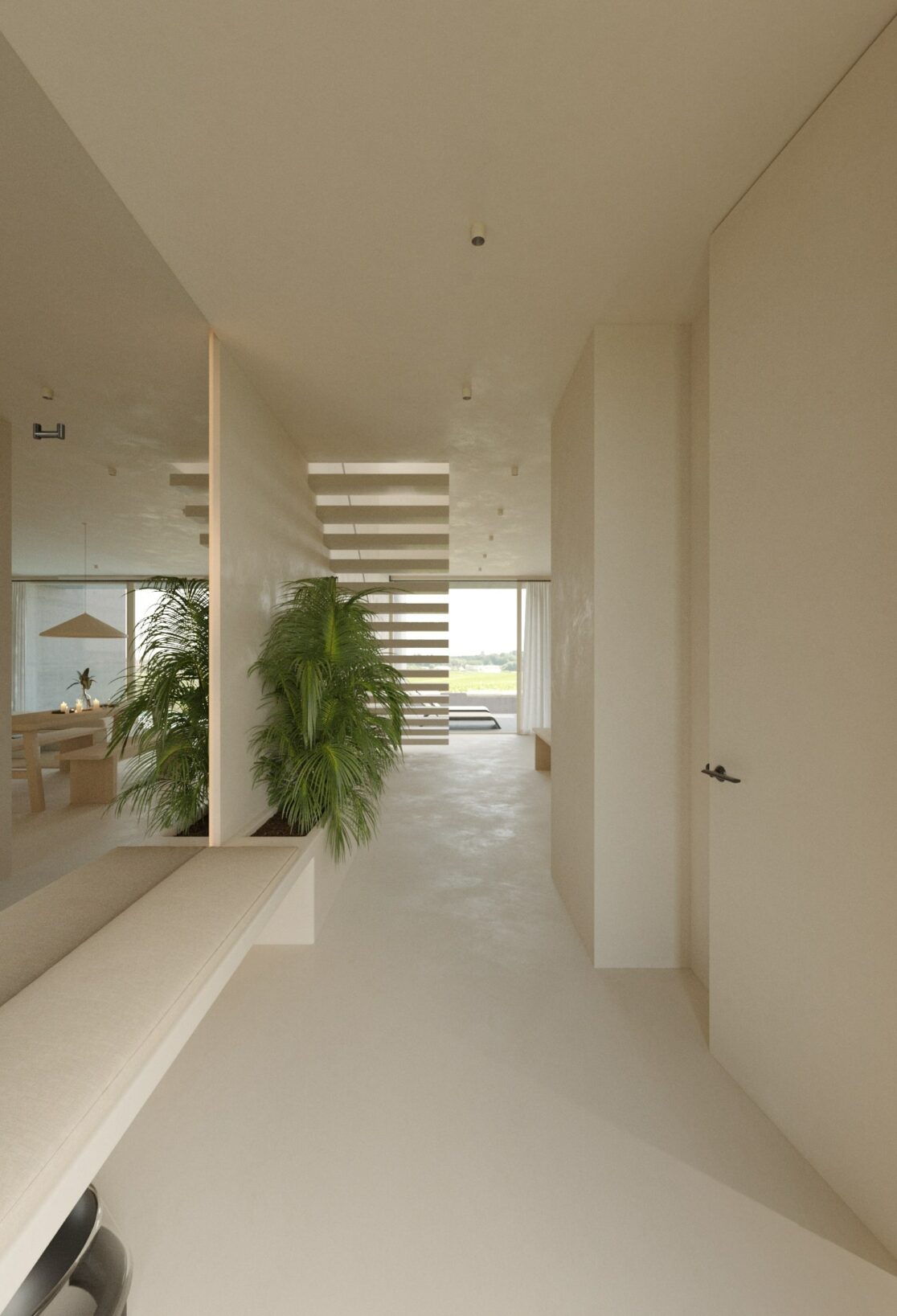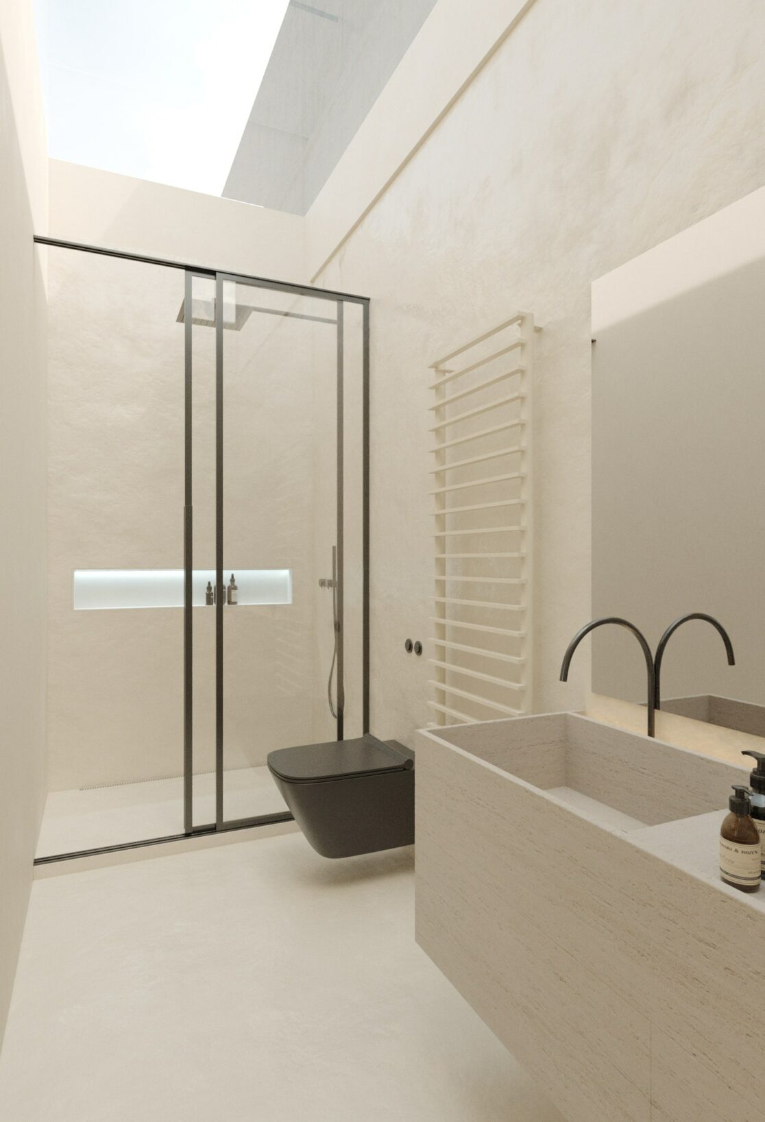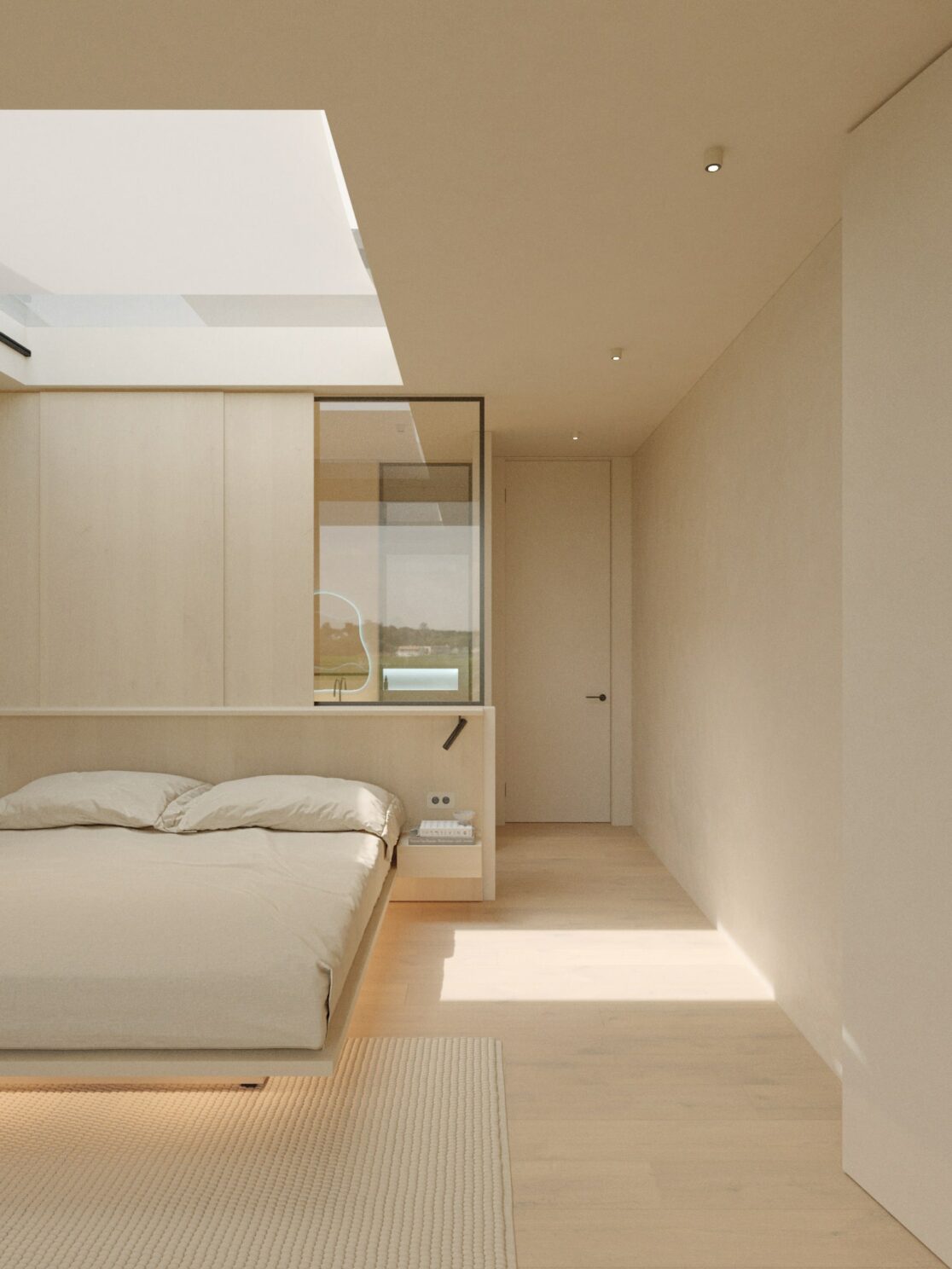 Его выразительная идея строится на пластичном использовании бетона: фасады словно вылеплены вручную и прорезаны окнами органических, текучих форм. Эти «пузырьковые» проёмы — неровные, овальные, с мягкой кромкой — кажутся вросшими в монолитную массу здания, как природные включения. Бетон сохраняет грубую фактуру опалубки, что усиливает ощущение сырой материальности и делает дом визуально тяжёлым, но при этом естественным, как скала среди зелени.