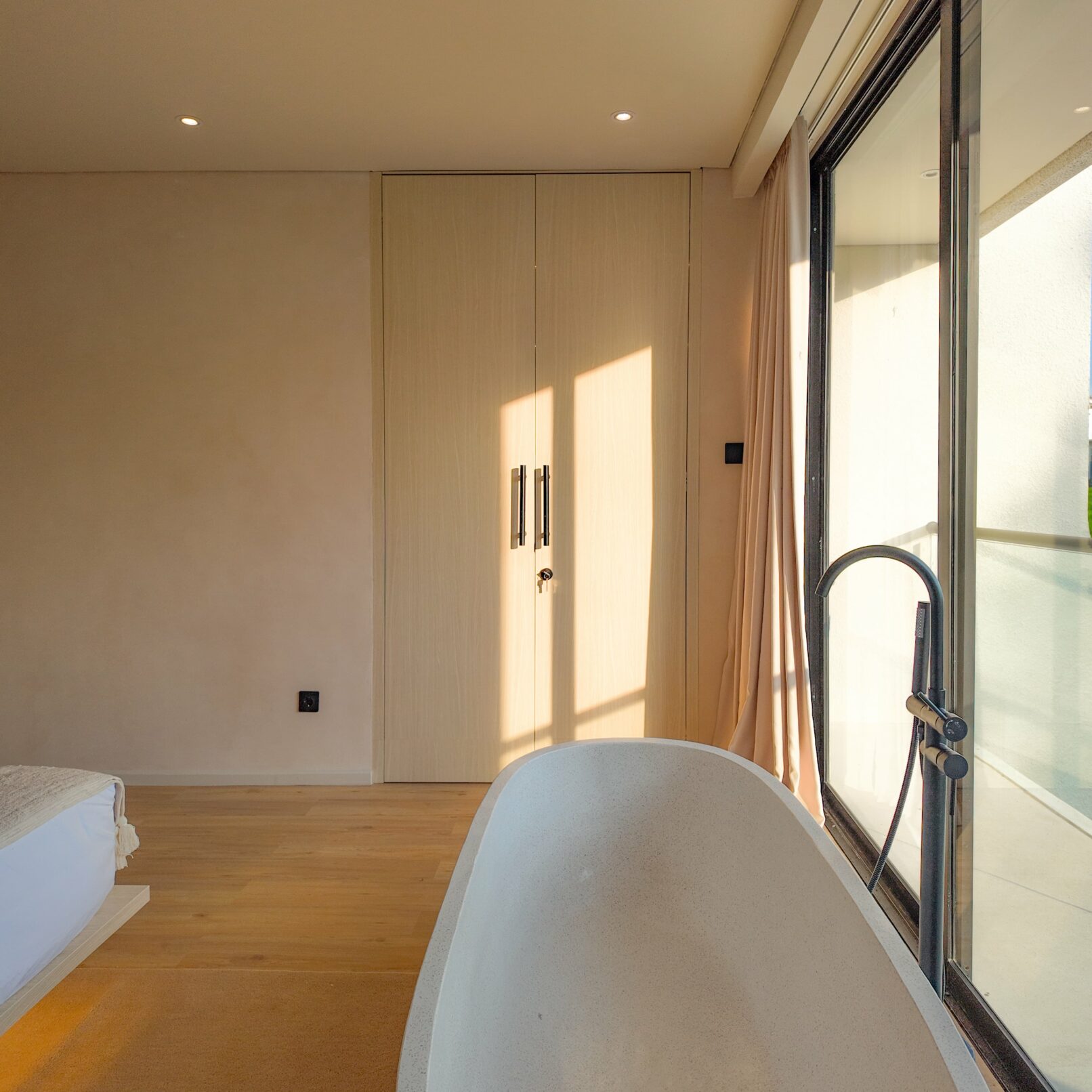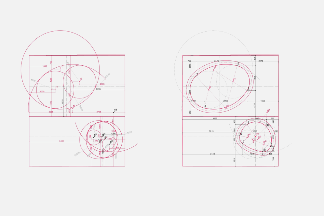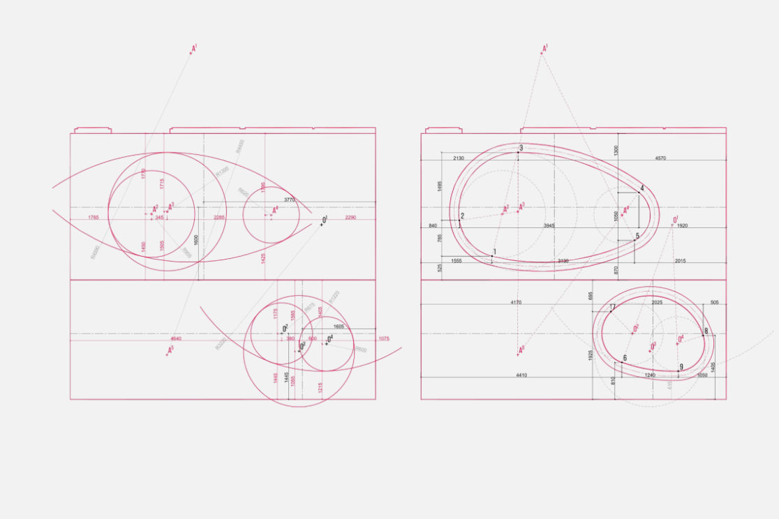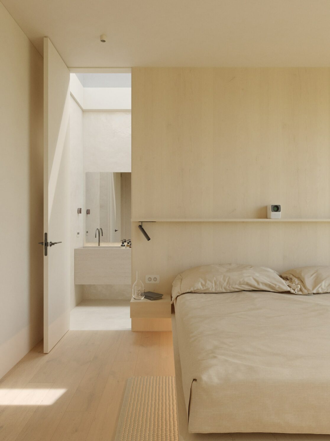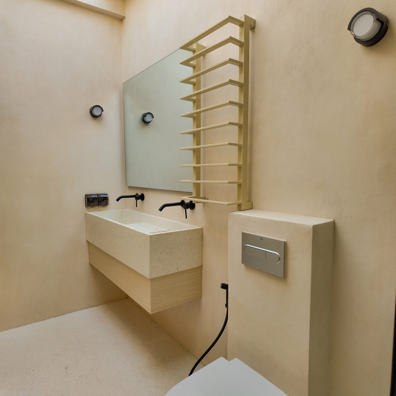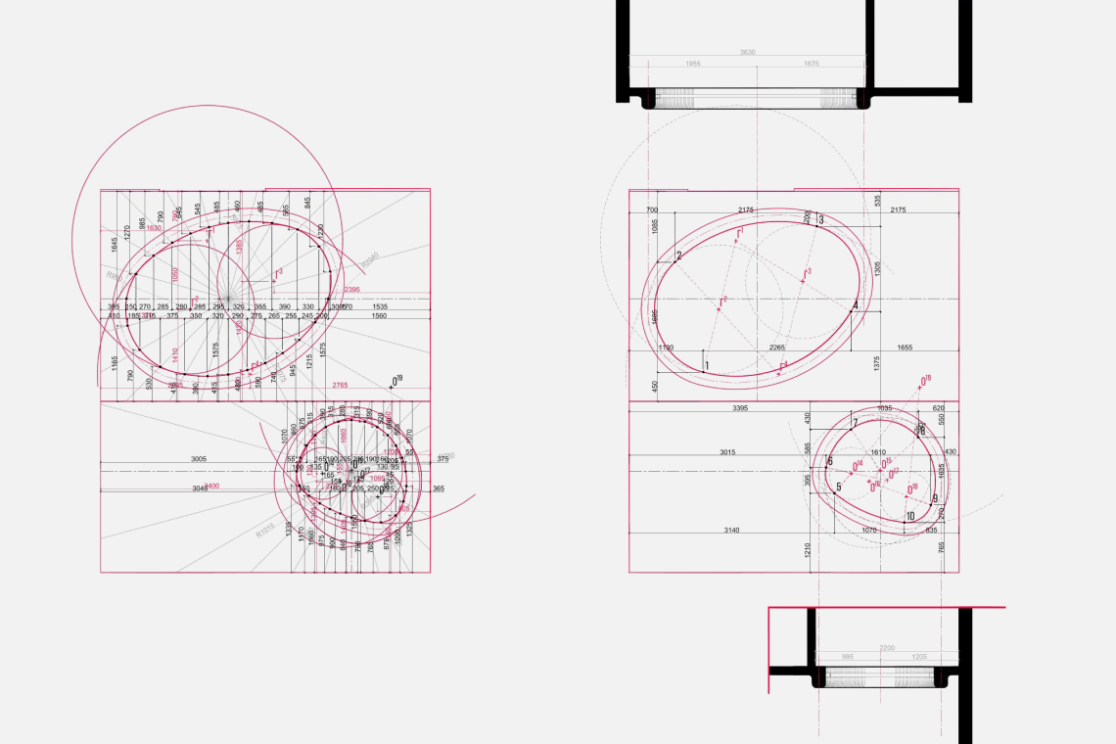 Его выразительная идея строится на пластичном использовании бетона: фасады словно вылеплены вручную и прорезаны окнами органических, текучих форм. Эти «пузырьковые» проёмы — неровные, овальные, с мягкой кромкой — кажутся вросшими в монолитную массу здания, как природные включения. Бетон сохраняет грубую фактуру опалубки, что усиливает ощущение сырой материальности и делает дом визуально тяжёлым, но при этом естественным, как скала среди зелени.