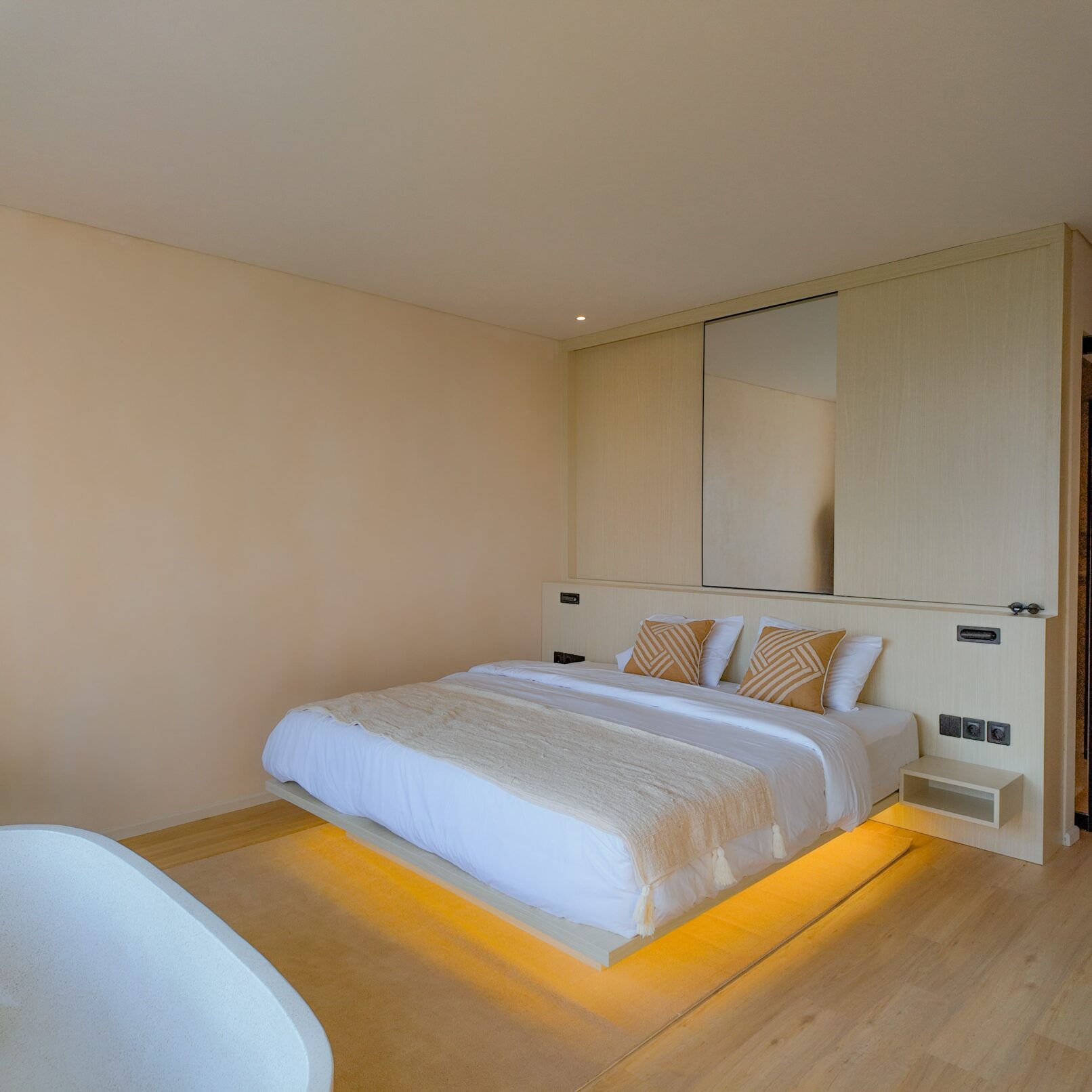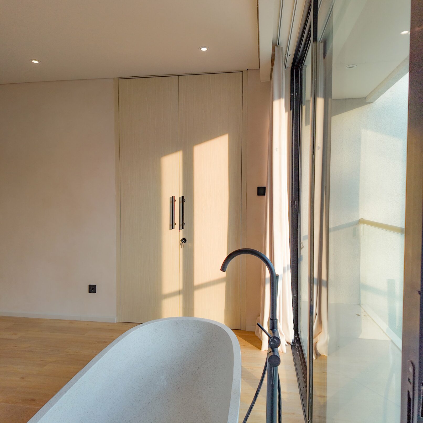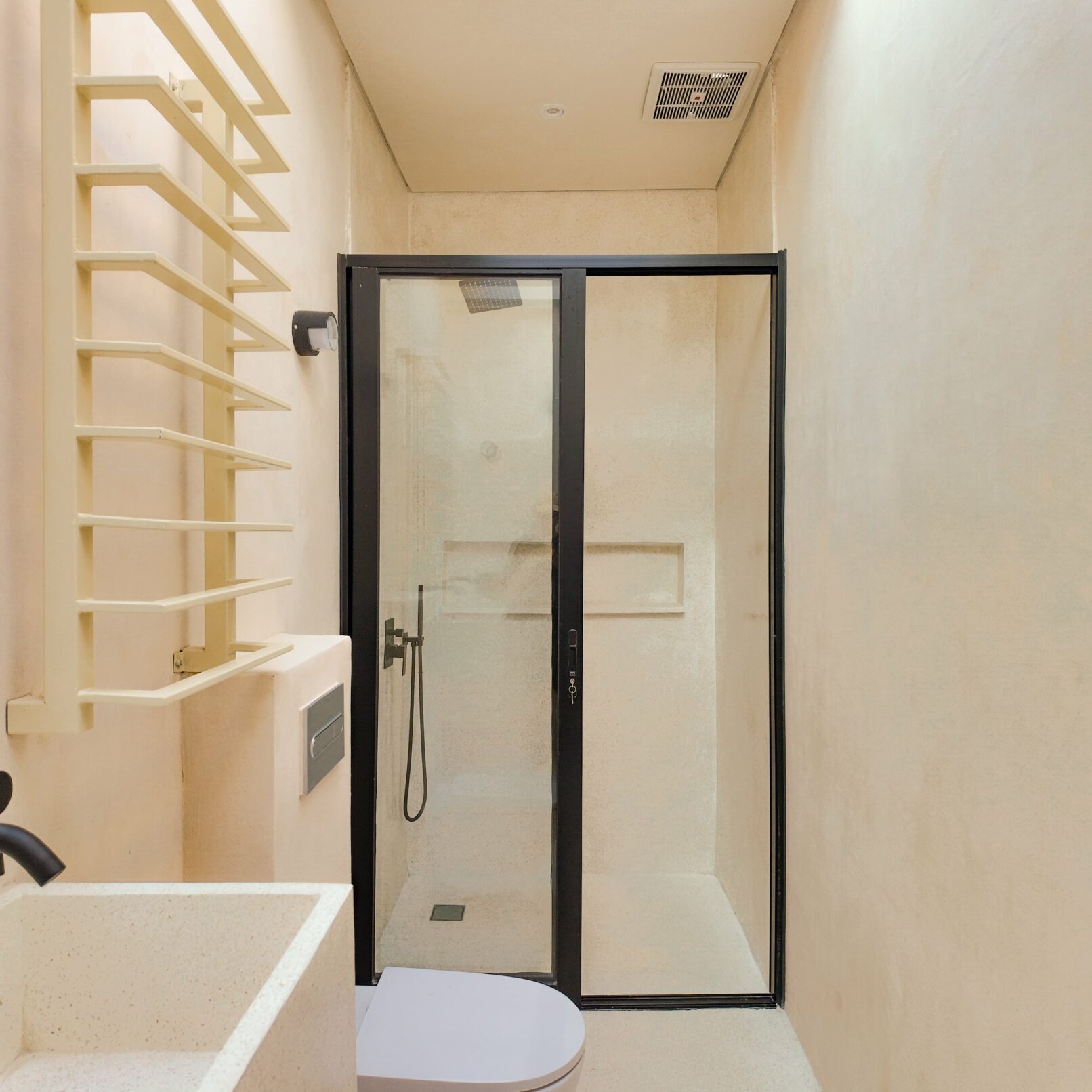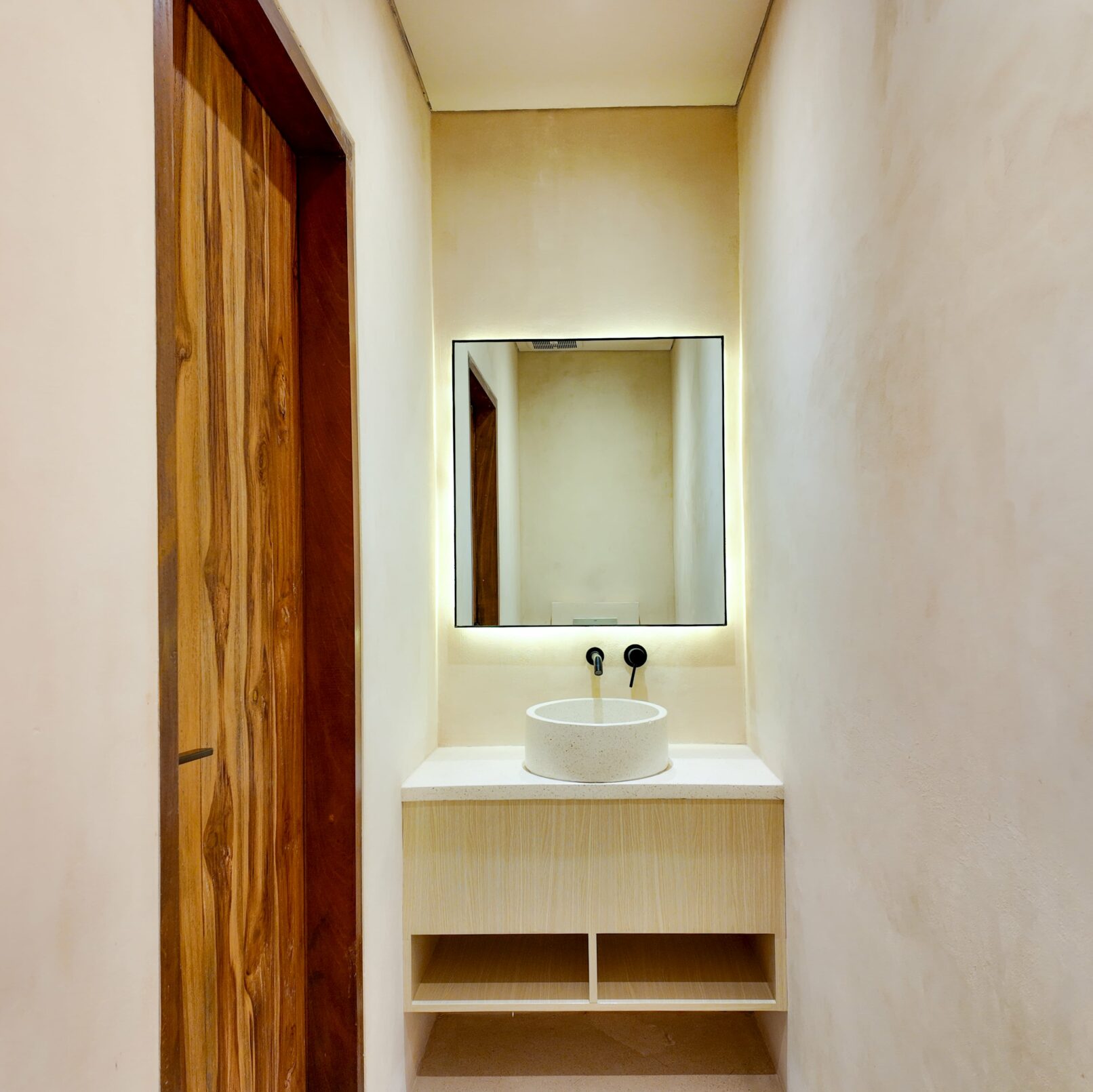 Его выразительная идея строится на пластичном использовании бетона: фасады словно вылеплены вручную и прорезаны окнами органических, текучих форм. Эти «пузырьковые» проёмы — неровные, овальные, с мягкой кромкой — кажутся вросшими в монолитную массу здания, как природные включения. Бетон сохраняет грубую фактуру опалубки, что усиливает ощущение сырой материальности и делает дом визуально тяжёлым, но при этом естественным, как скала среди зелени.