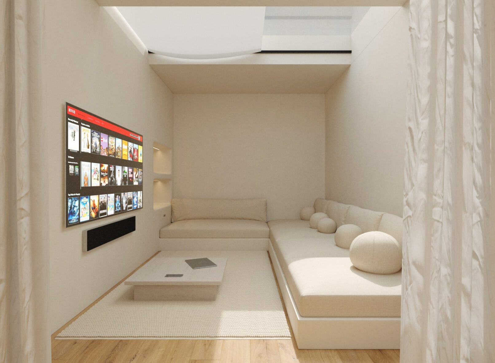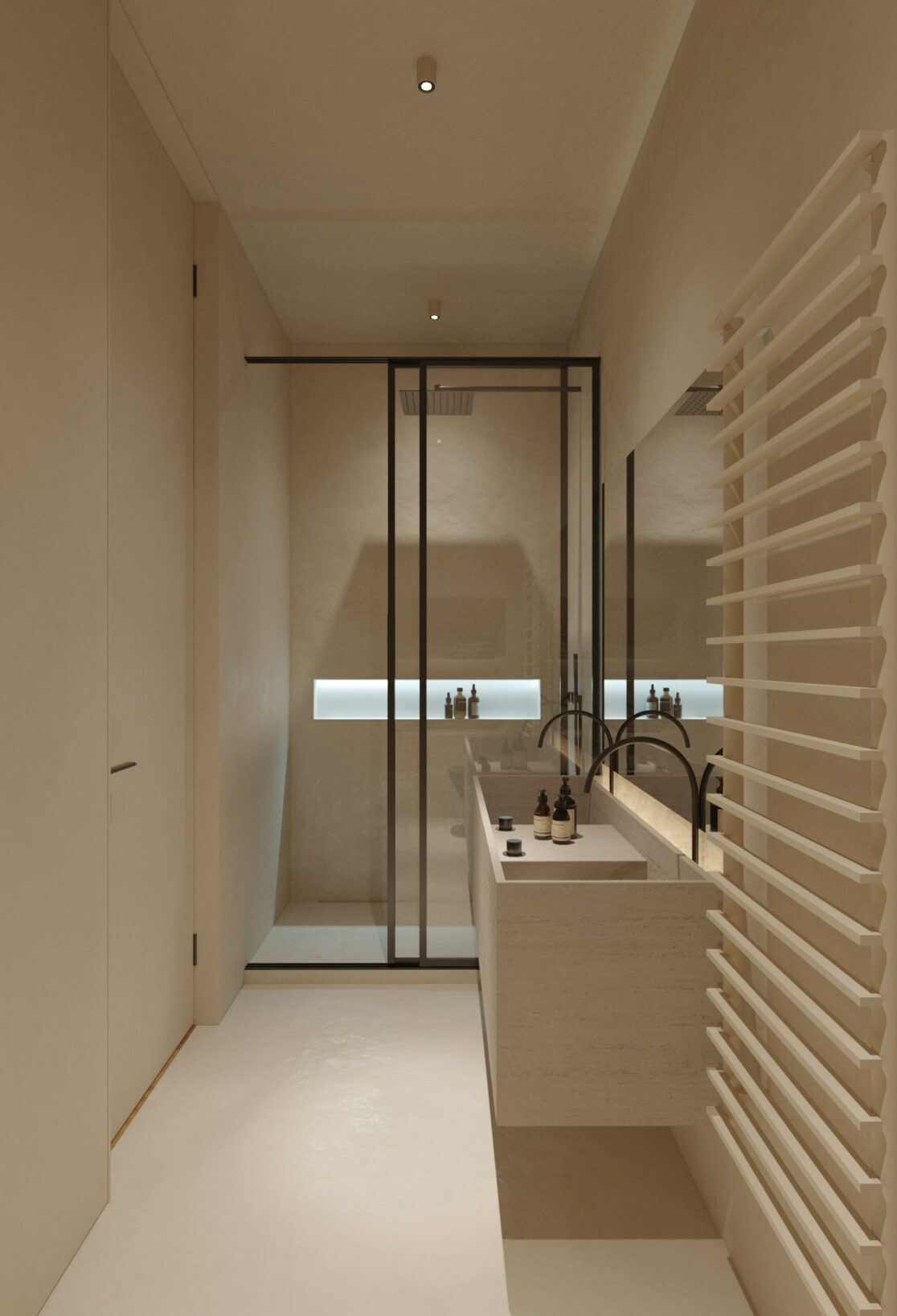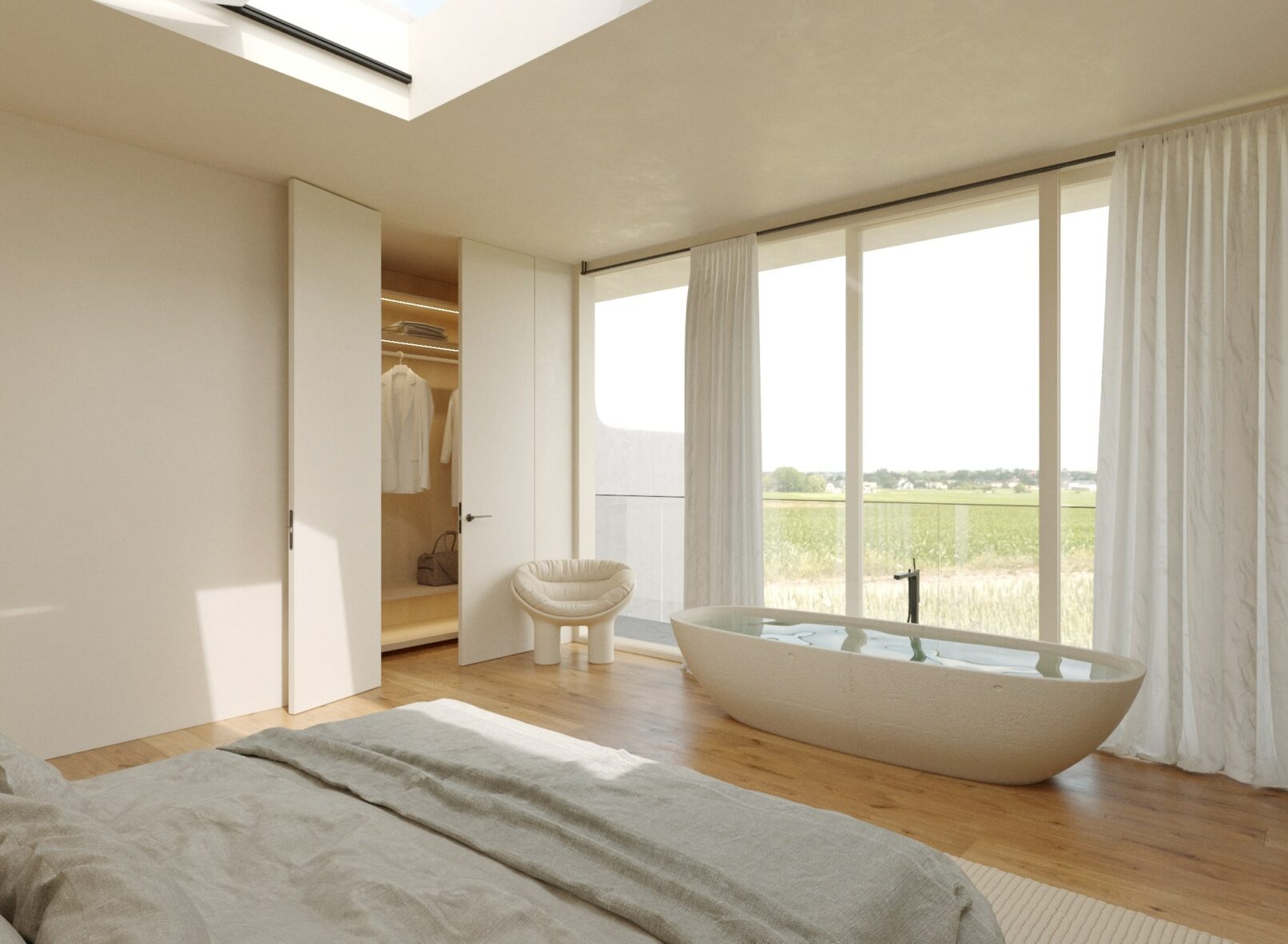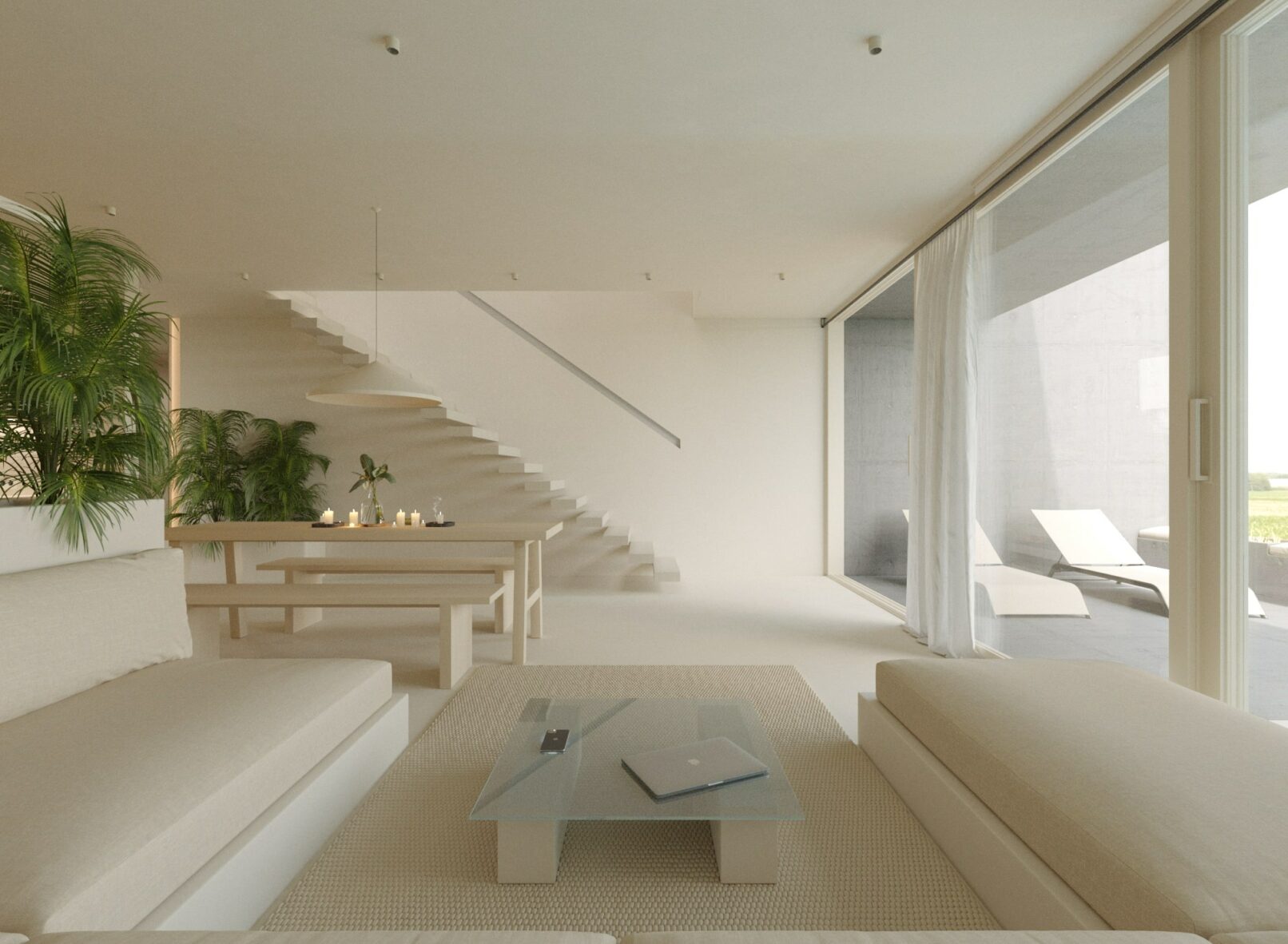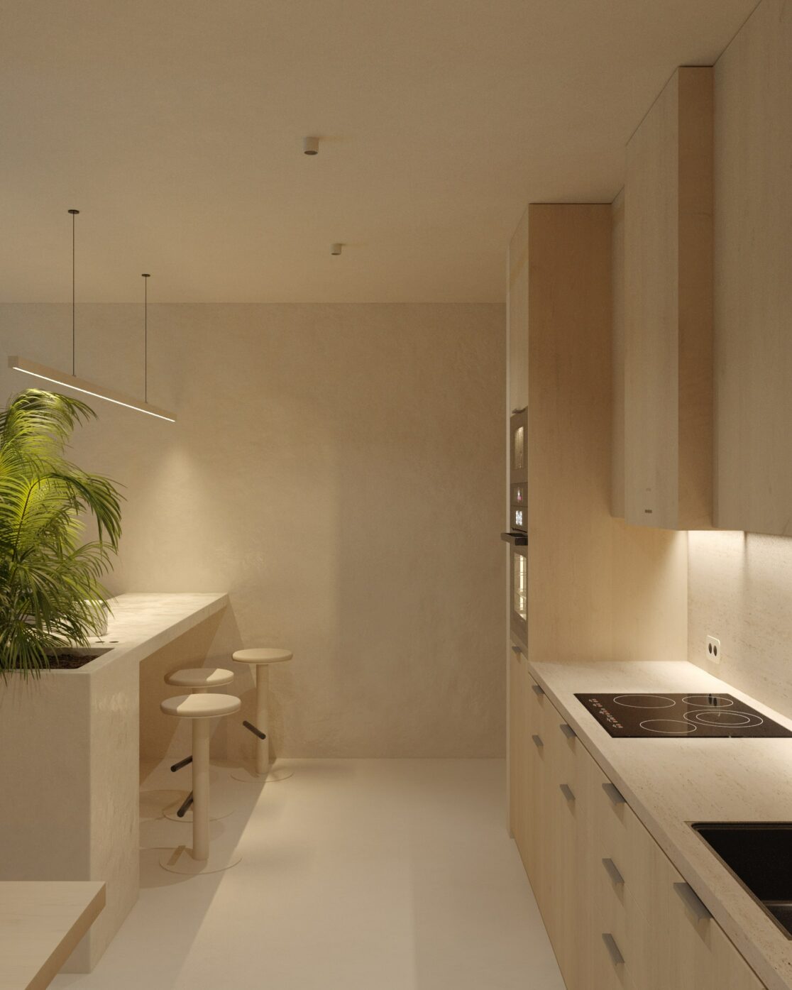 Его выразительная идея строится на пластичном использовании бетона: фасады словно вылеплены вручную и прорезаны окнами органических, текучих форм. Эти «пузырьковые» проёмы — неровные, овальные, с мягкой кромкой — кажутся вросшими в монолитную массу здания, как природные включения. Бетон сохраняет грубую фактуру опалубки, что усиливает ощущение сырой материальности и делает дом визуально тяжёлым, но при этом естественным, как скала среди зелени.