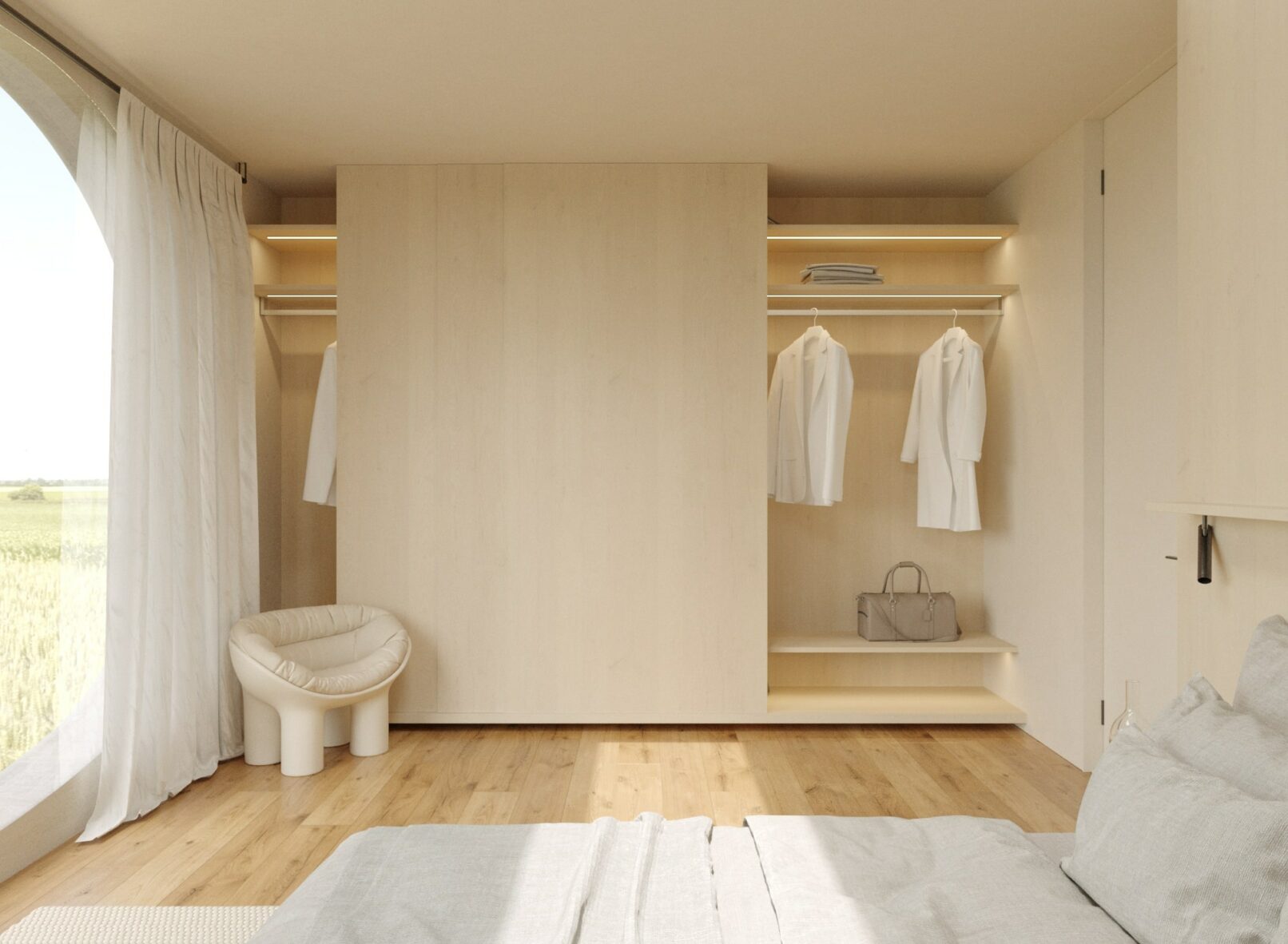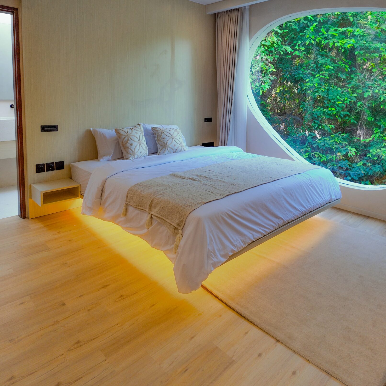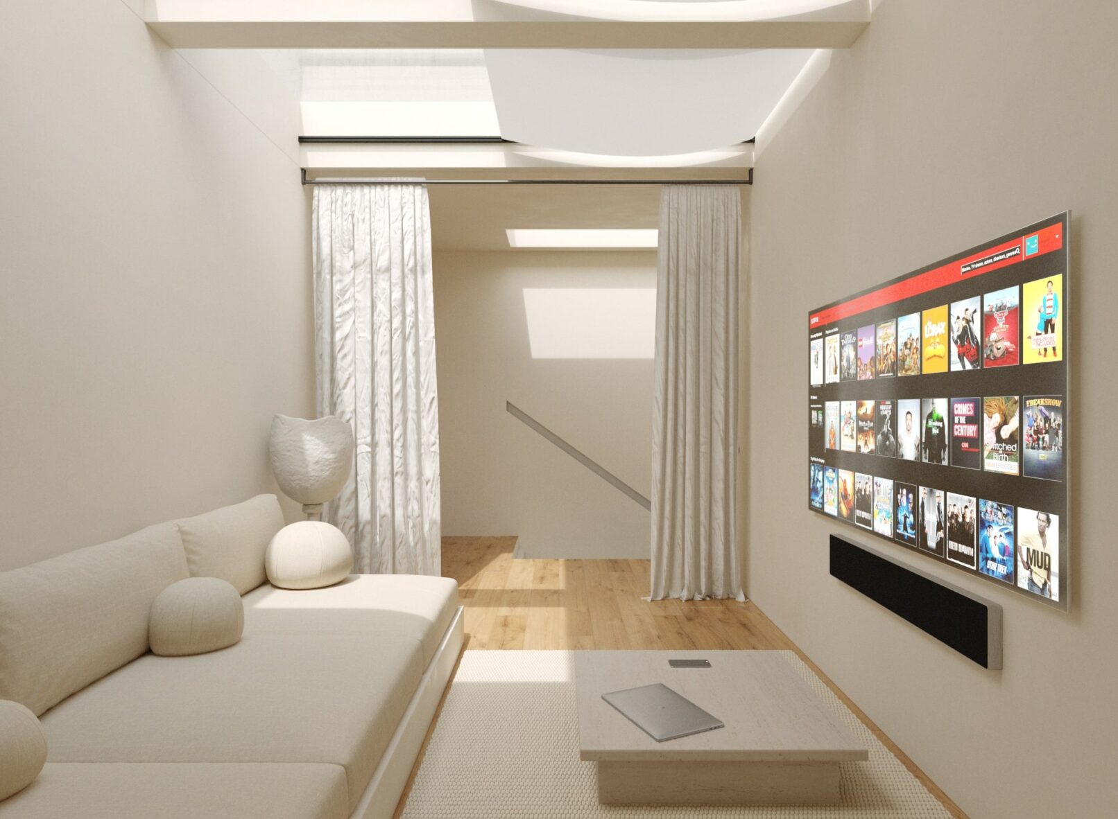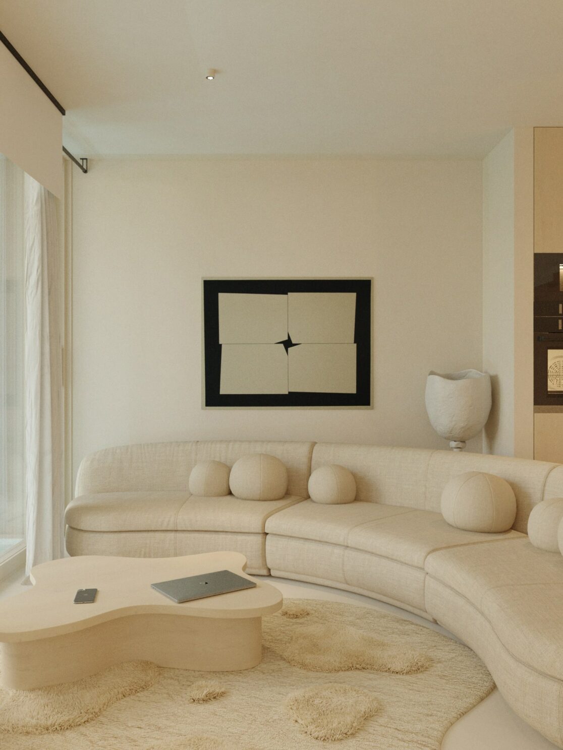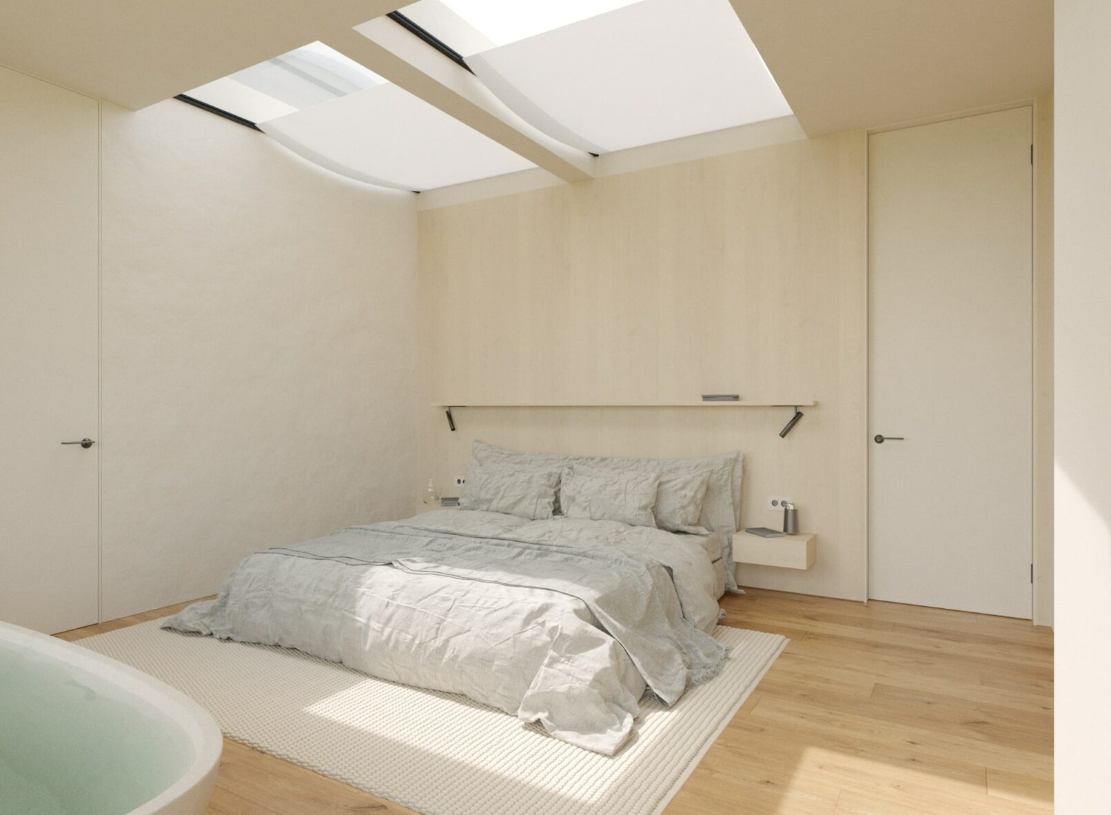 Его выразительная идея строится на пластичном использовании бетона: фасады словно вылеплены вручную и прорезаны окнами органических, текучих форм. Эти «пузырьковые» проёмы — неровные, овальные, с мягкой кромкой — кажутся вросшими в монолитную массу здания, как природные включения. Бетон сохраняет грубую фактуру опалубки, что усиливает ощущение сырой материальности и делает дом визуально тяжёлым, но при этом естественным, как скала среди зелени.