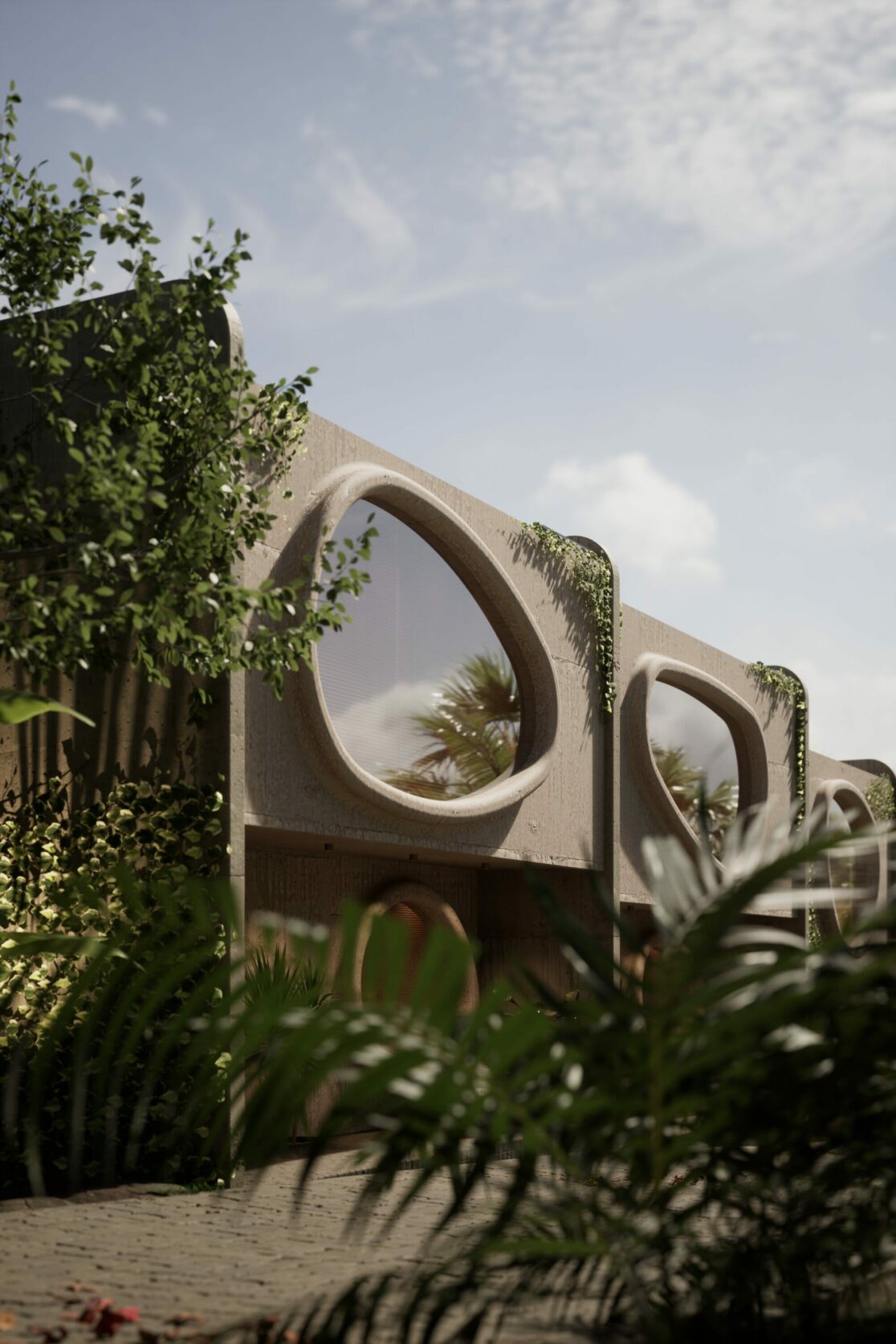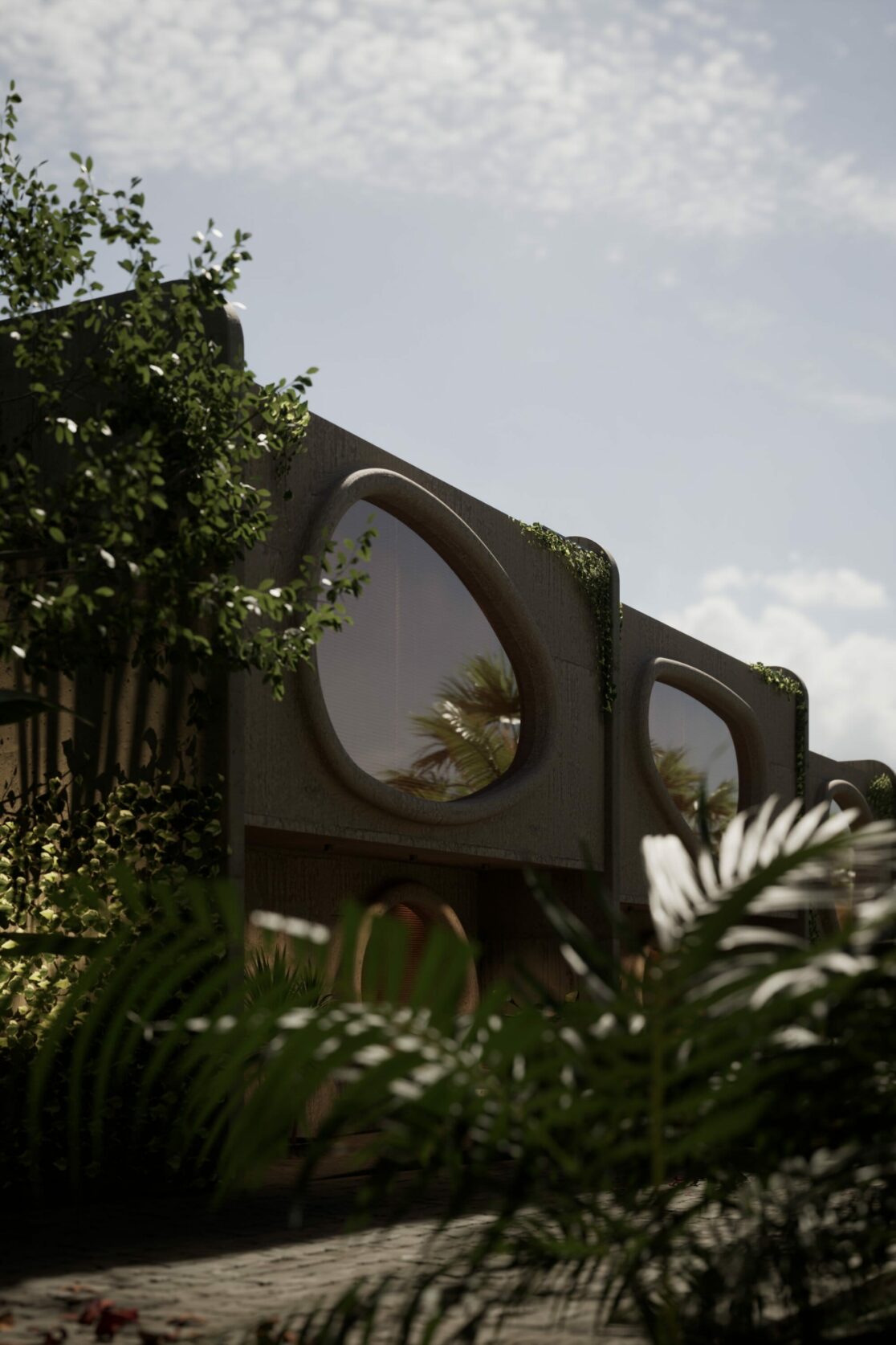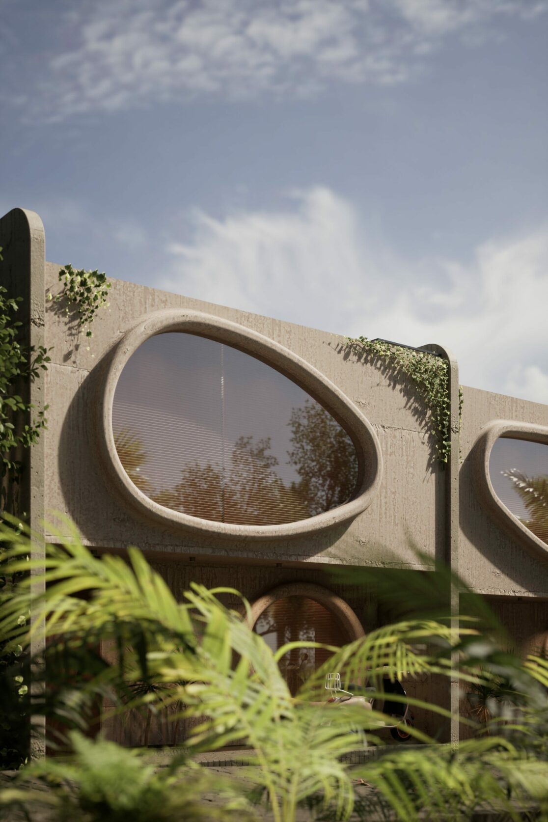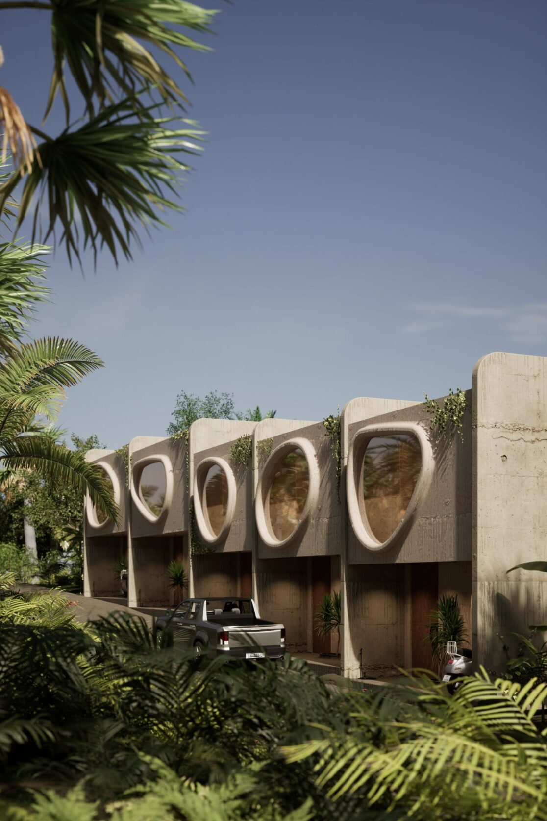 Проект Bubbles — это архитектурный комплекс таунхаусов, расположенный в тропическом контексте. Основная идея решения — выразительная бетонная пластика фасадов с органичными формами окон и глубоким взаимодействием с природной средой.