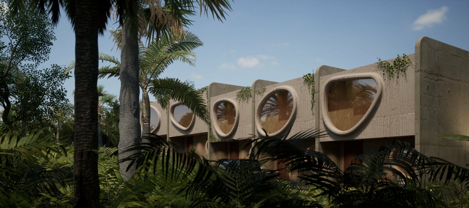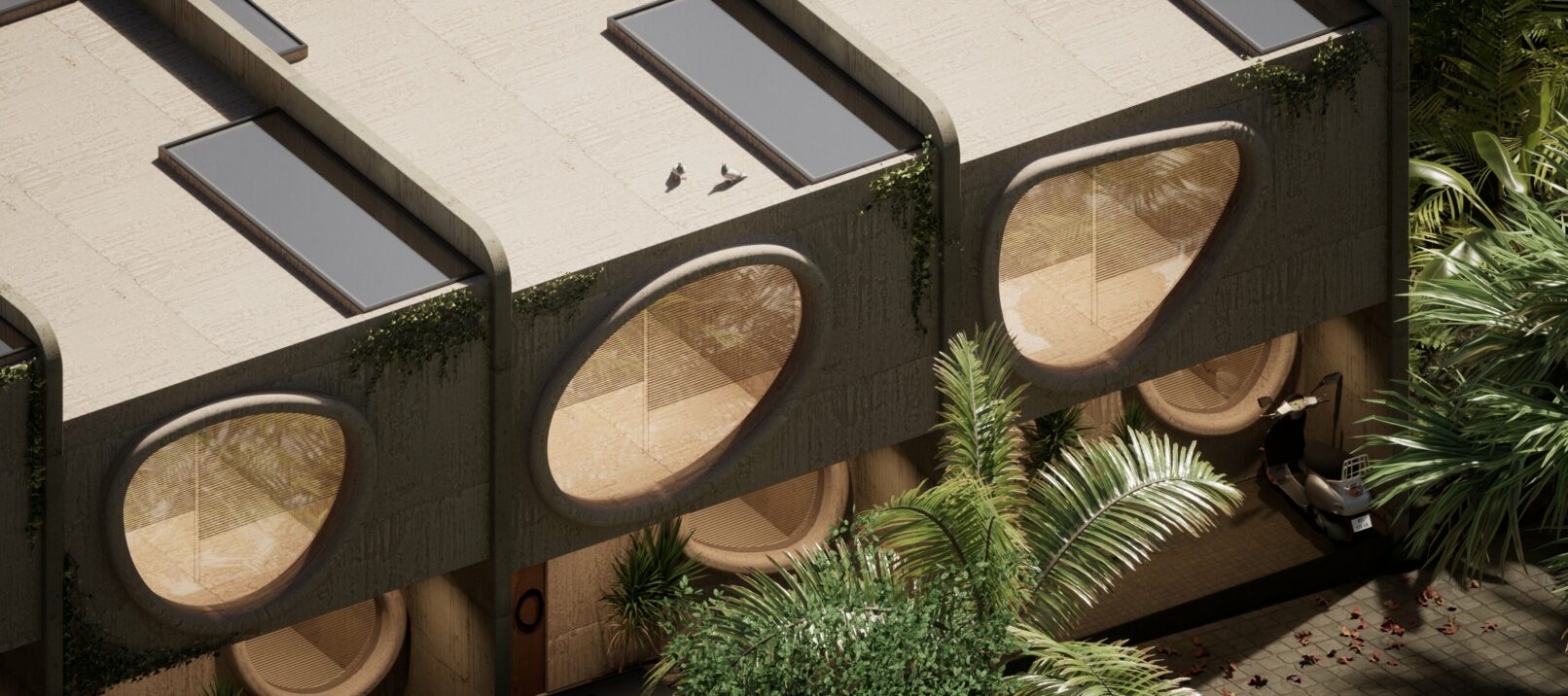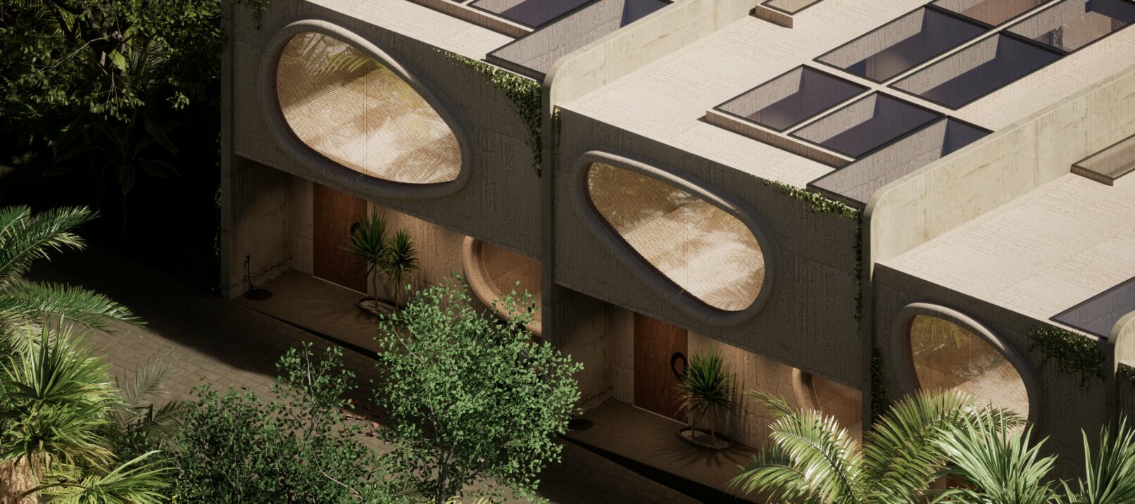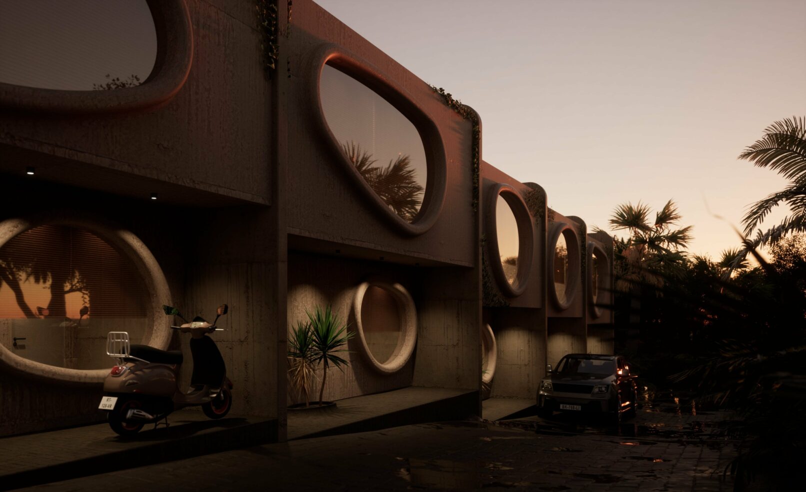 Проект Bubbles — это архитектурный комплекс таунхаусов, расположенный в тропическом контексте. Основная идея решения — выразительная бетонная пластика фасадов с органичными формами окон и глубоким взаимодействием с природной средой.