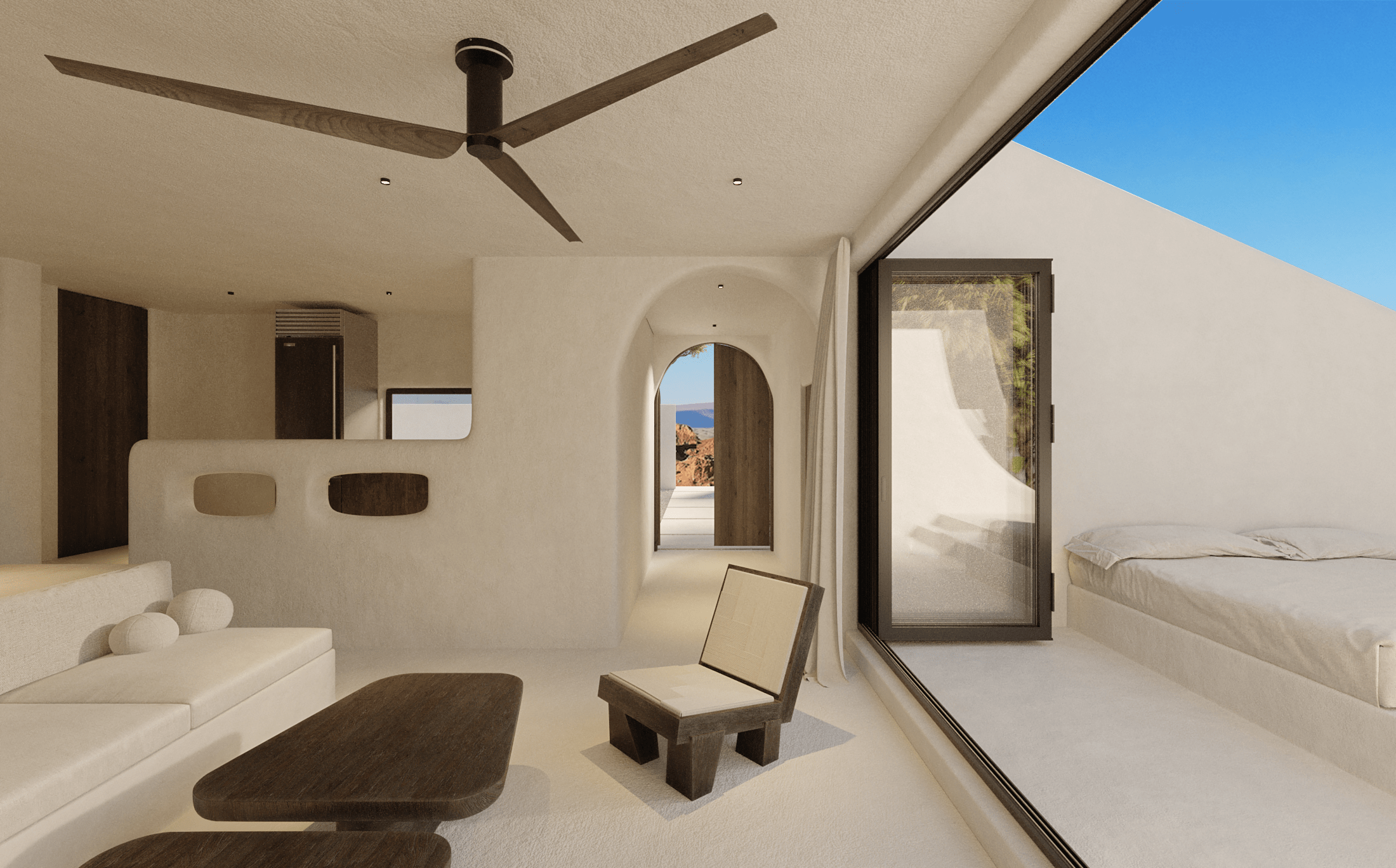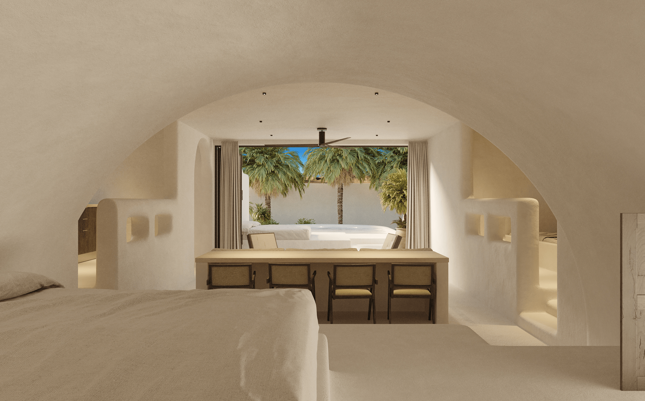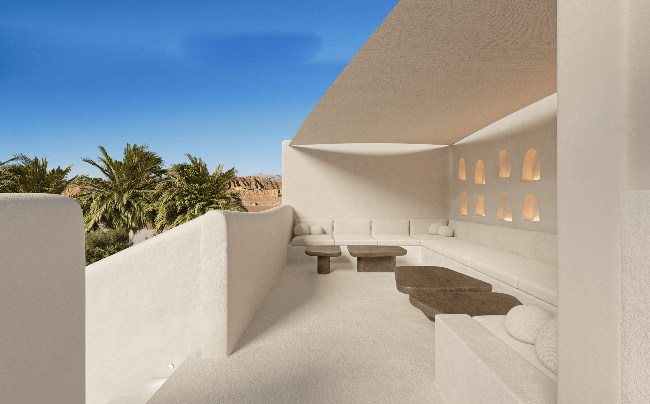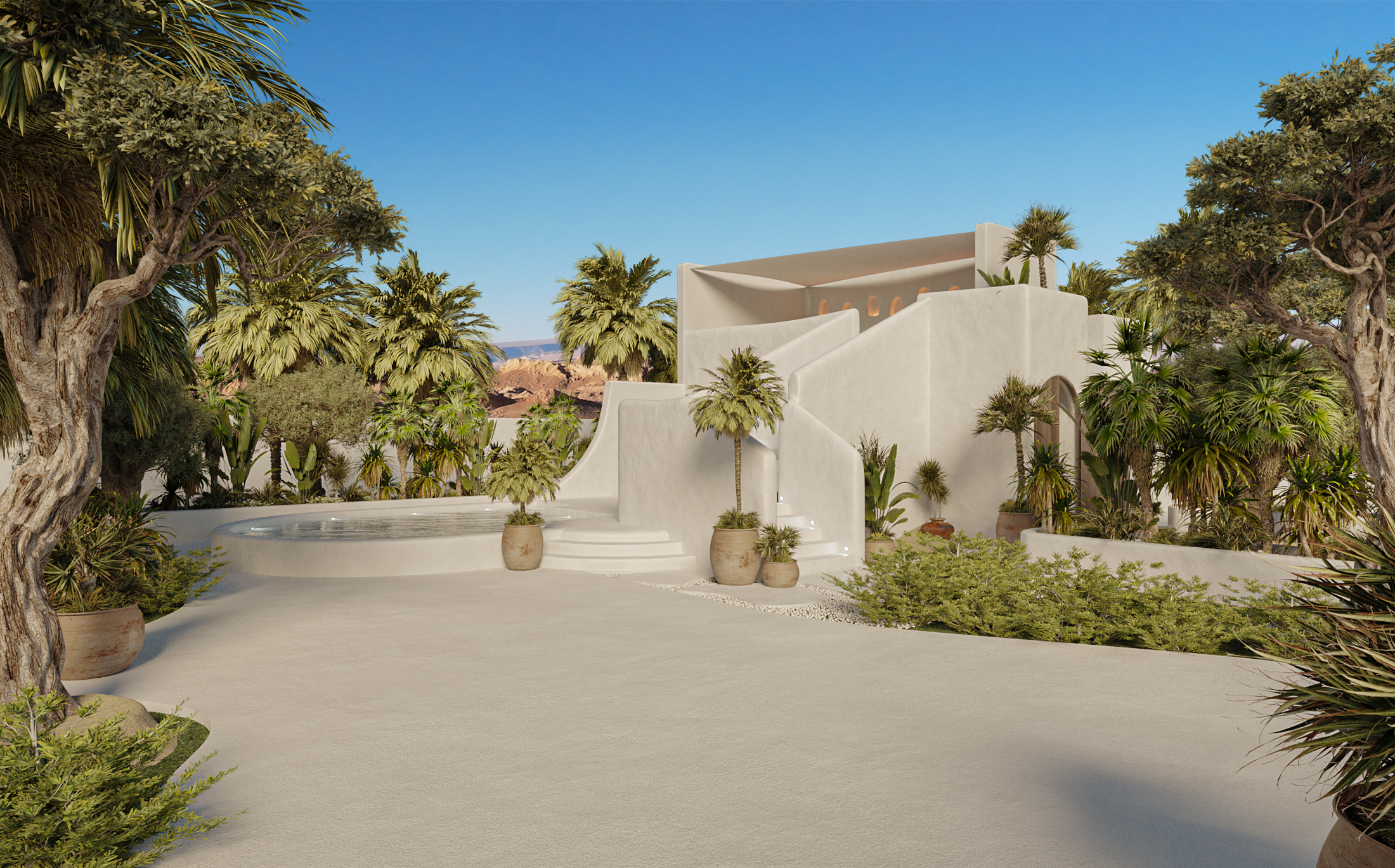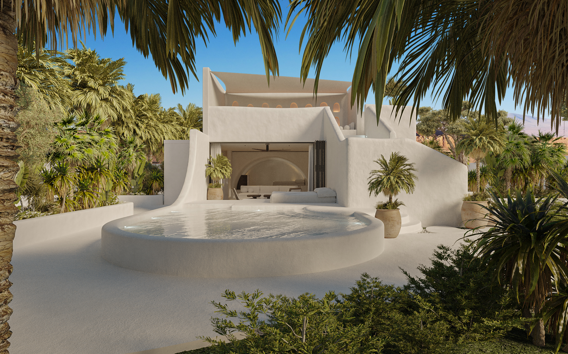 Архитектура строится на игре мягких объемов и теней: белые оштукатуренные стены плавно переходят друг в друга, формируя текучие линии, вдохновлённые природными ландшафтами региона. В интерьере доминирует светлая палитра, текстуры известняка и песчаника, крупная мебель из дерева — всё подчеркивает атмосферу покоя и уединения среди пальмовых садов.