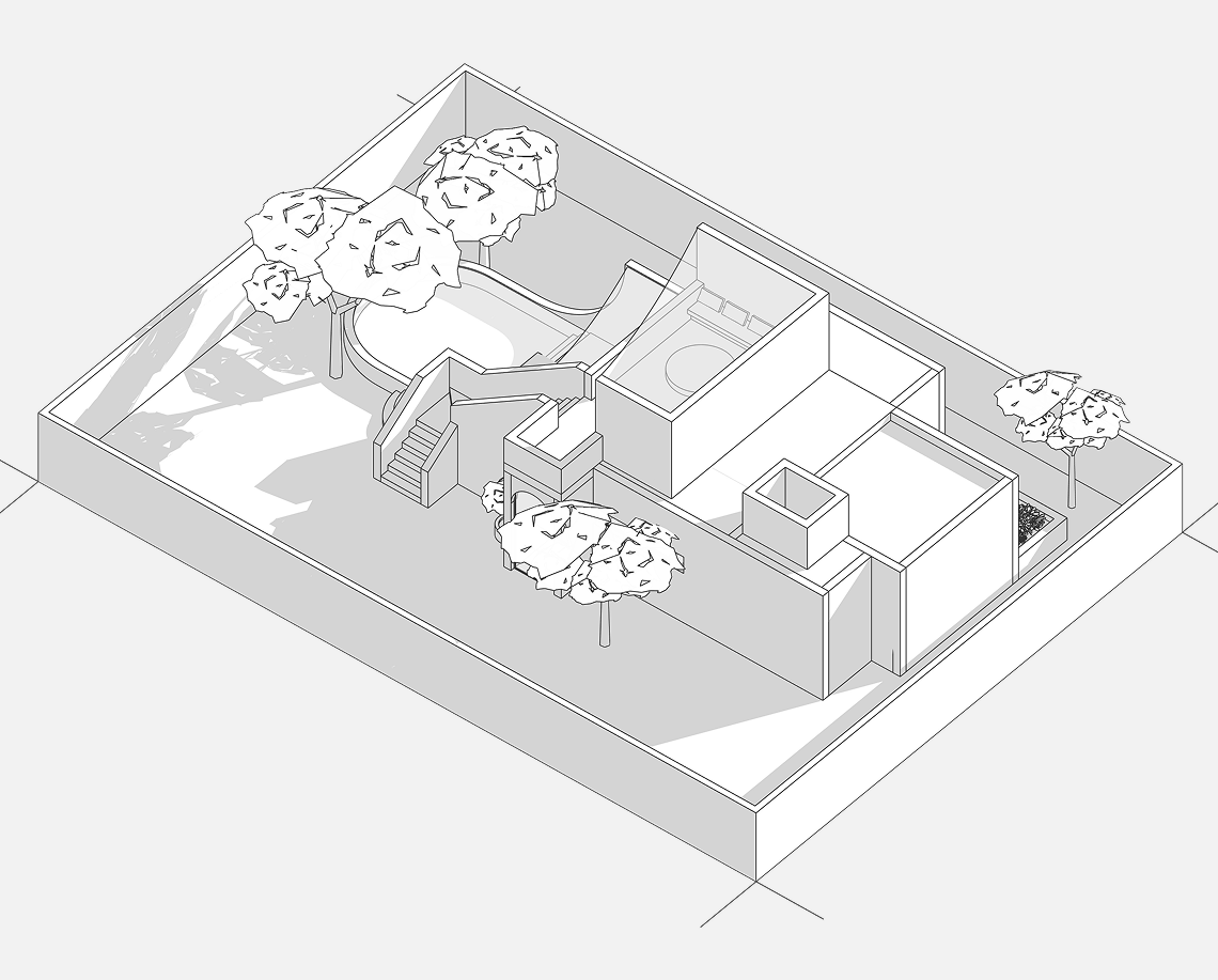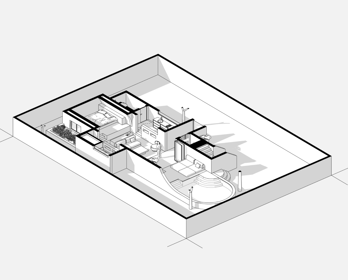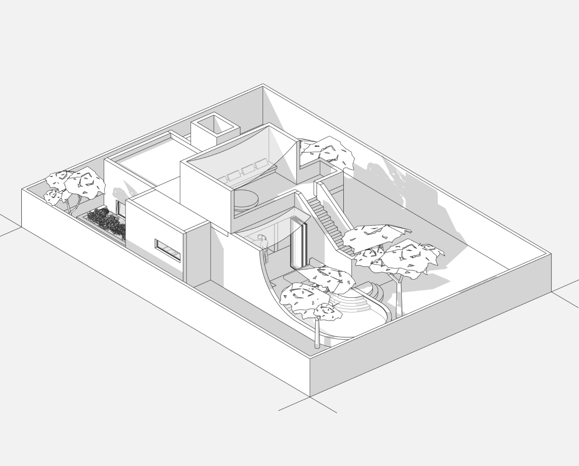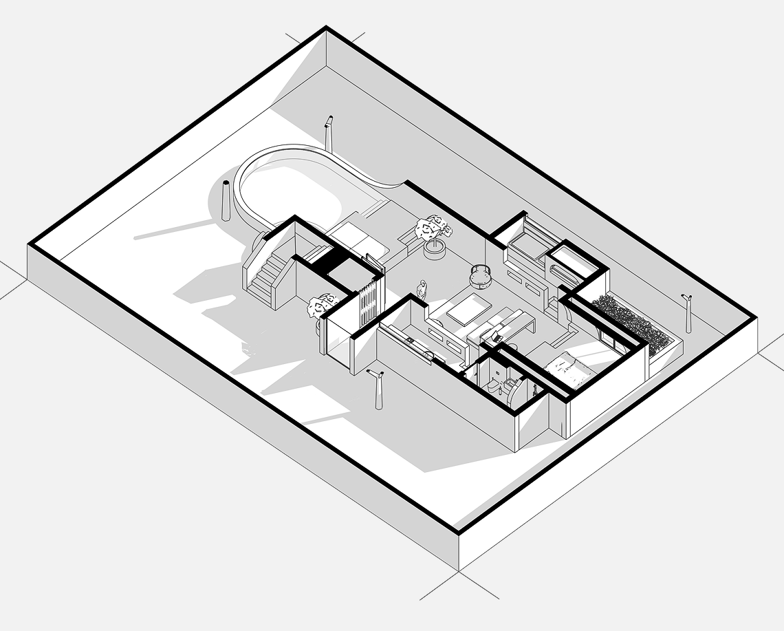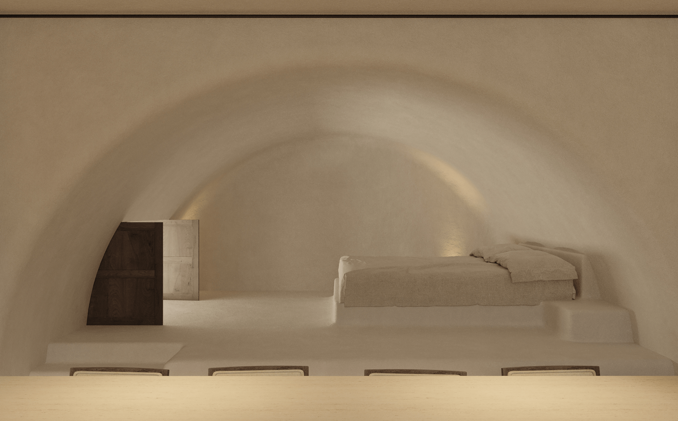 Архитектура строится на игре мягких объемов и теней: белые оштукатуренные стены плавно переходят друг в друга, формируя текучие линии, вдохновлённые природными ландшафтами региона. В интерьере доминирует светлая палитра, текстуры известняка и песчаника, крупная мебель из дерева — всё подчеркивает атмосферу покоя и уединения среди пальмовых садов.
