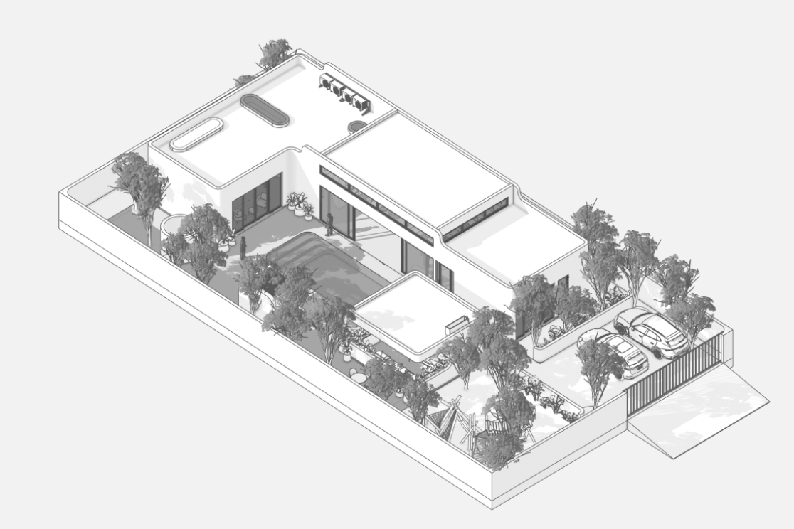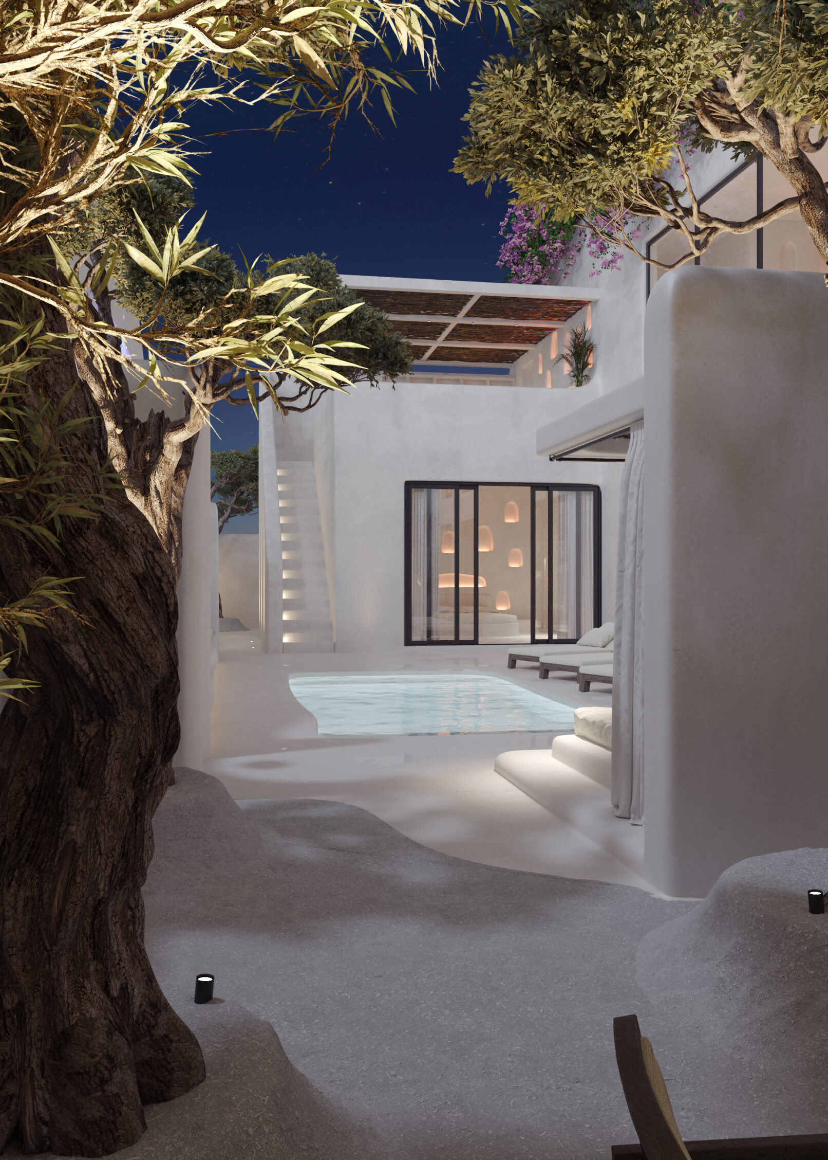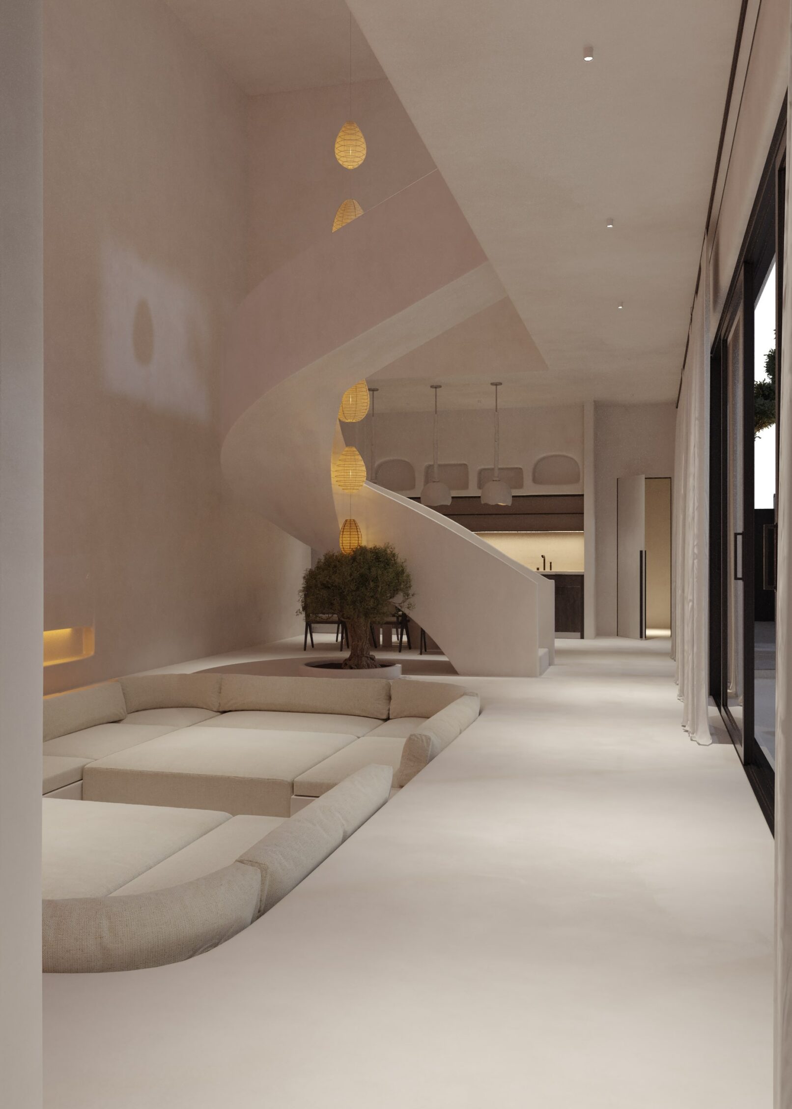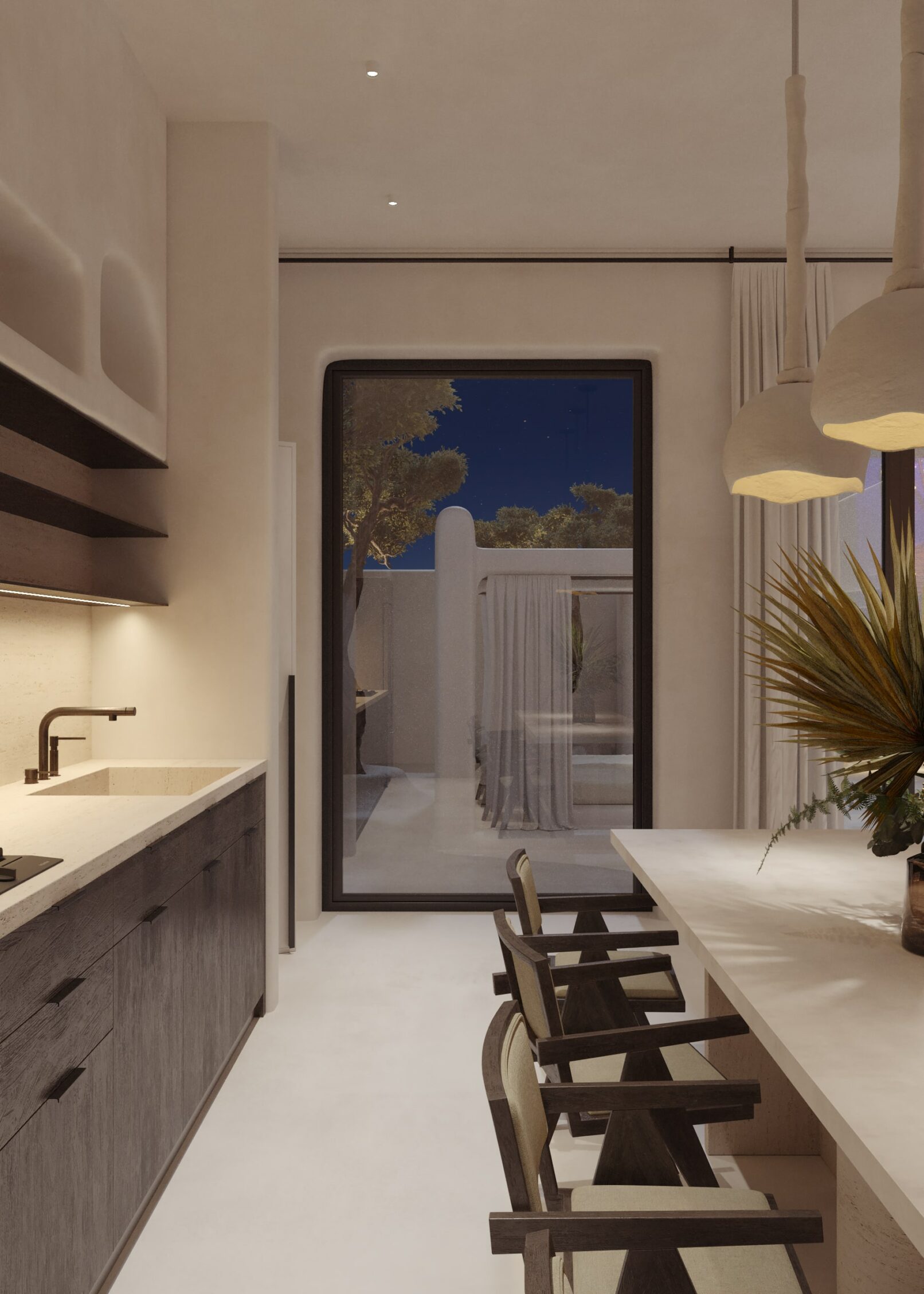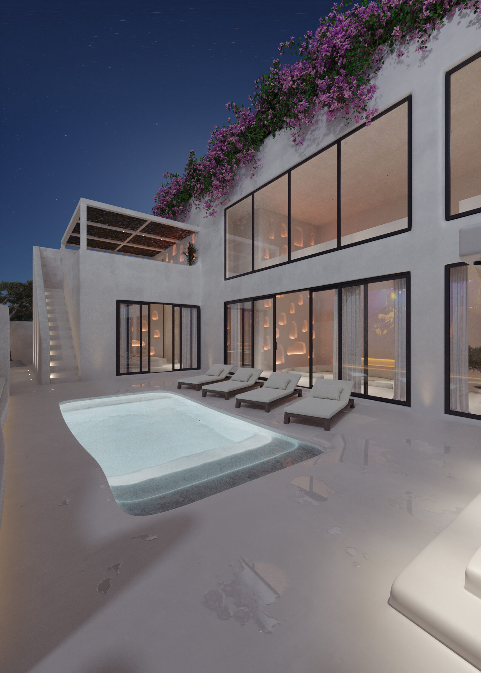 Все виллы имеют одинаковую планировочную структуру и ориентированы внутрь — на собственный двор с бассейном, уличной кухней и озеленением. Архитектура подчёркнуто простая: белые объемы, плавные линии, ритмичные проёмы. Это создаёт фон для жизни, где природа и свет играют главную роль.