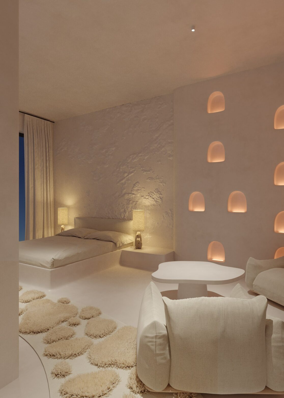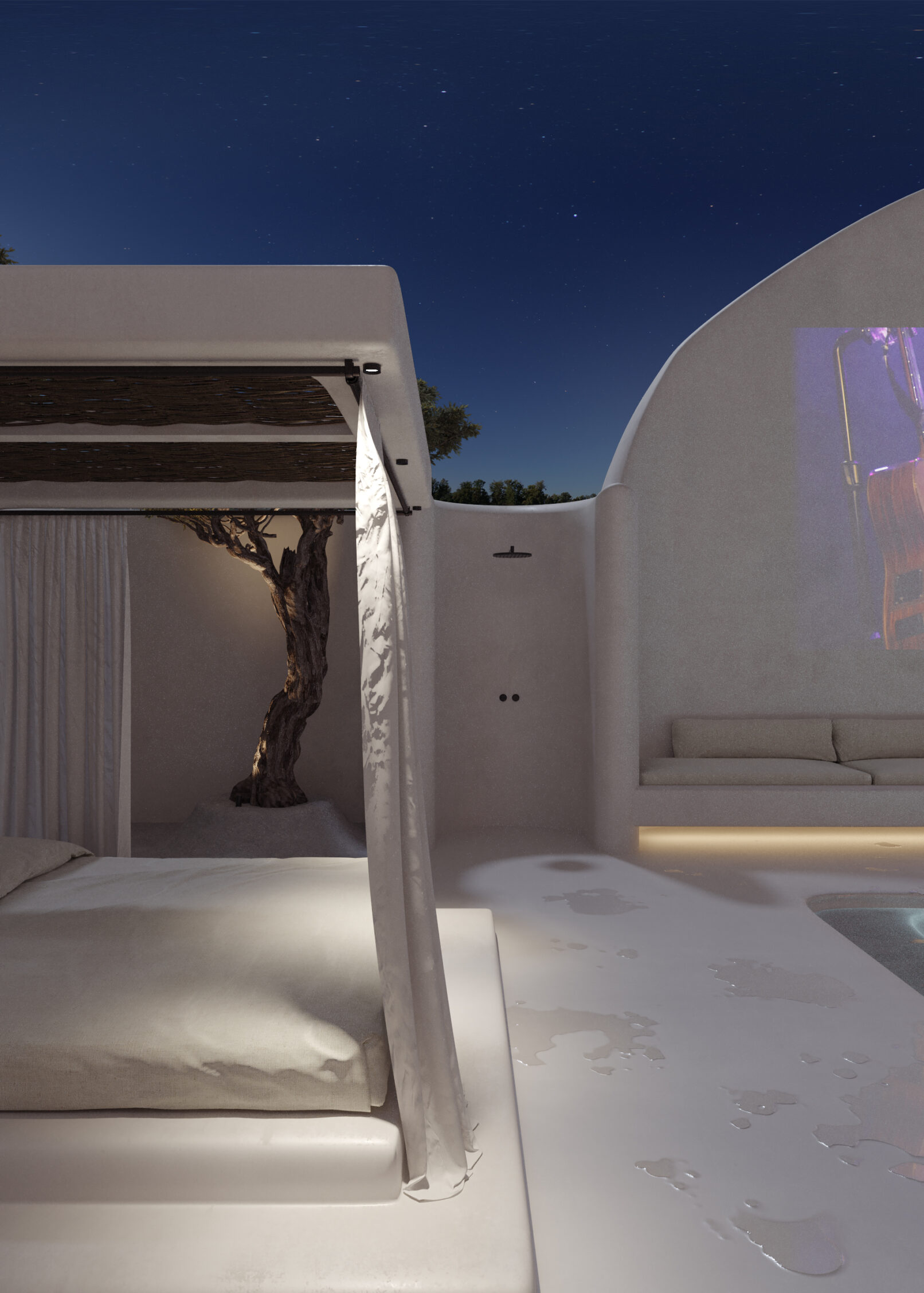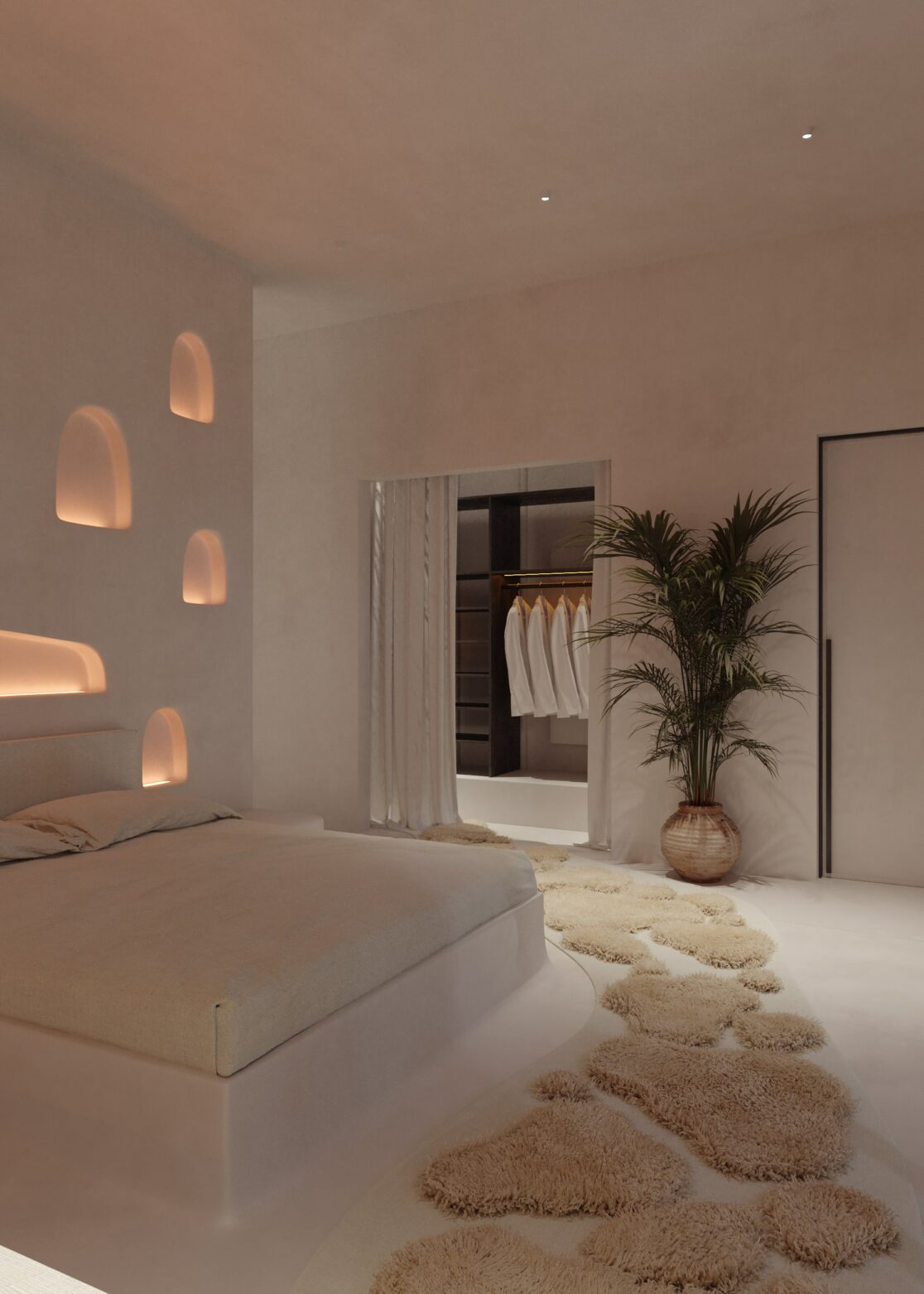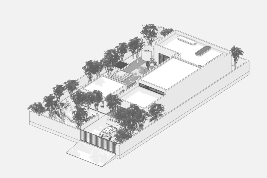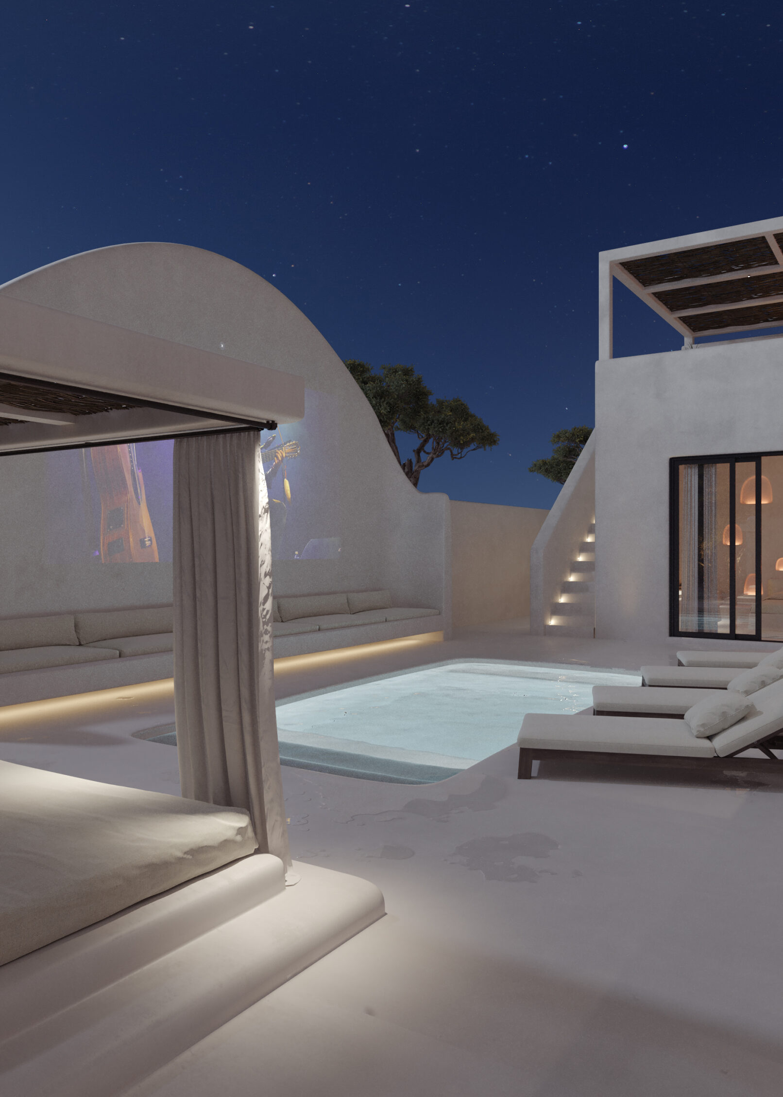 Все виллы имеют одинаковую планировочную структуру и ориентированы внутрь — на собственный двор с бассейном, уличной кухней и озеленением. Архитектура подчёркнуто простая: белые объемы, плавные линии, ритмичные проёмы. Это создаёт фон для жизни, где природа и свет играют главную роль.