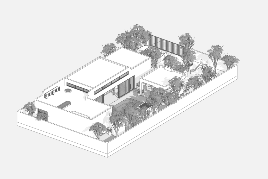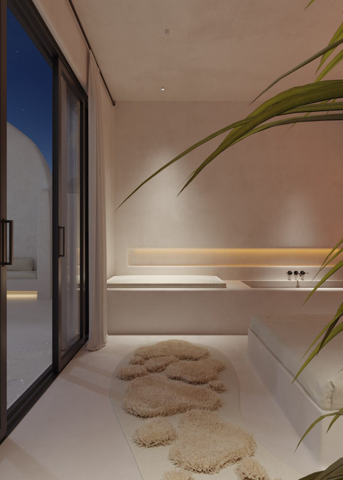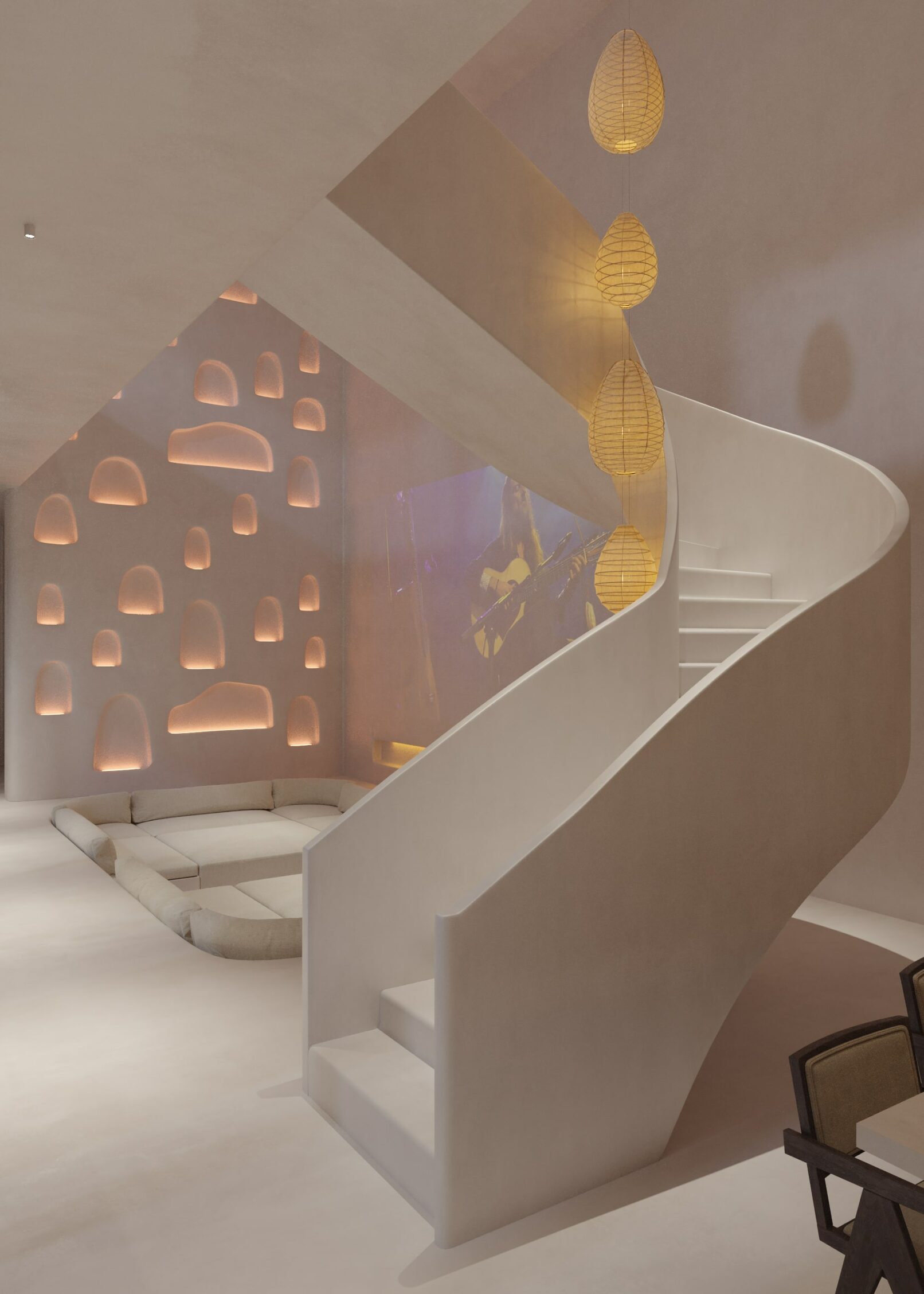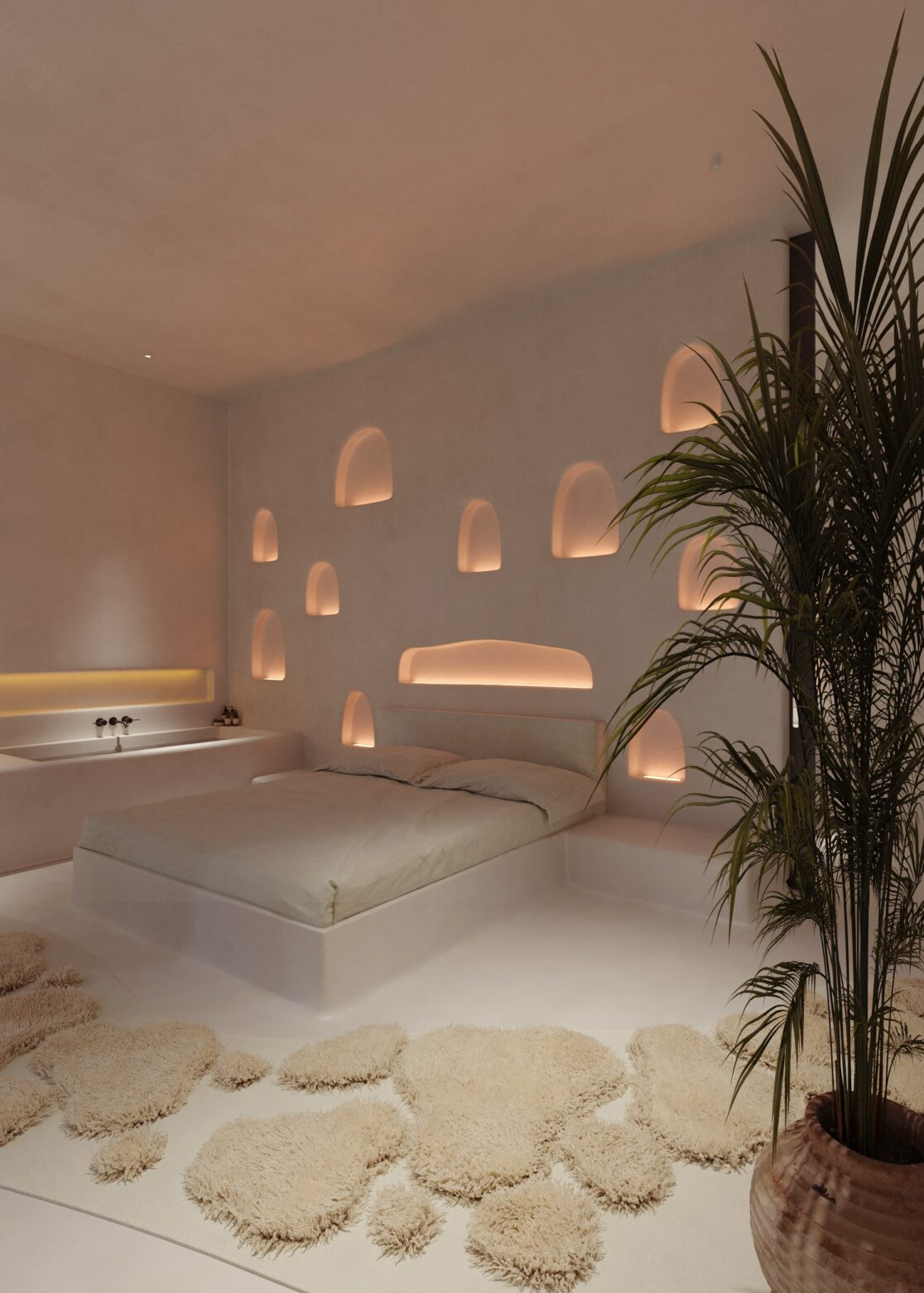 Все виллы имеют одинаковую планировочную структуру и ориентированы внутрь — на собственный двор с бассейном, уличной кухней и озеленением. Архитектура подчёркнуто простая: белые объемы, плавные линии, ритмичные проёмы. Это создаёт фон для жизни, где природа и свет играют главную роль.