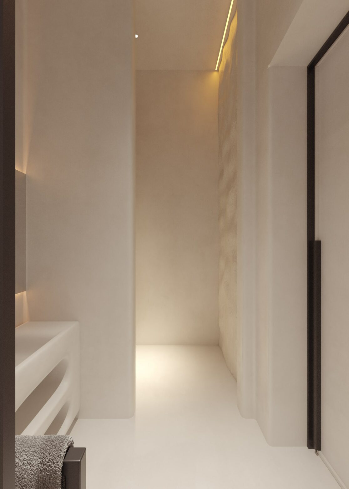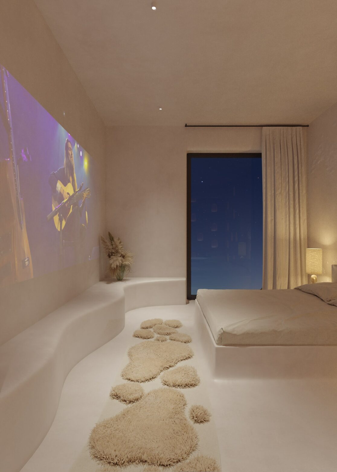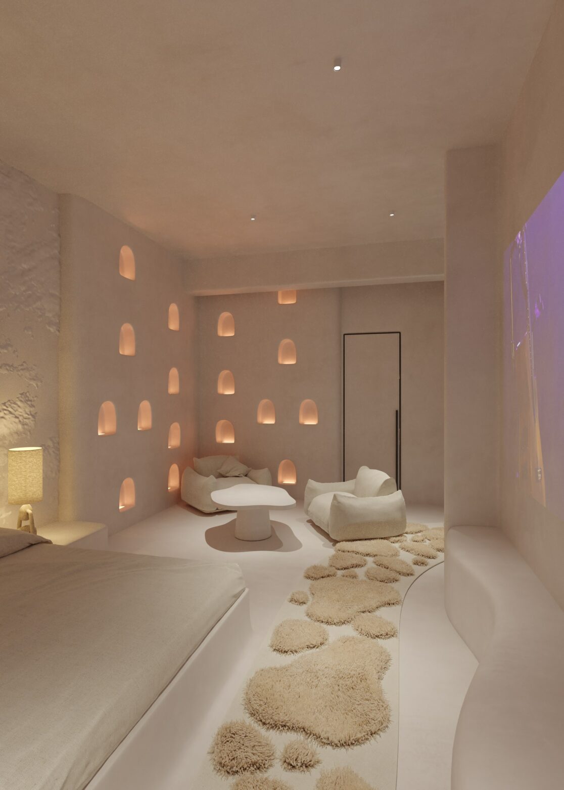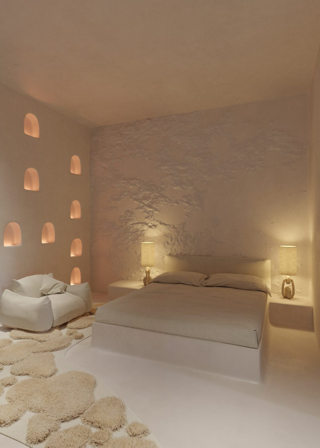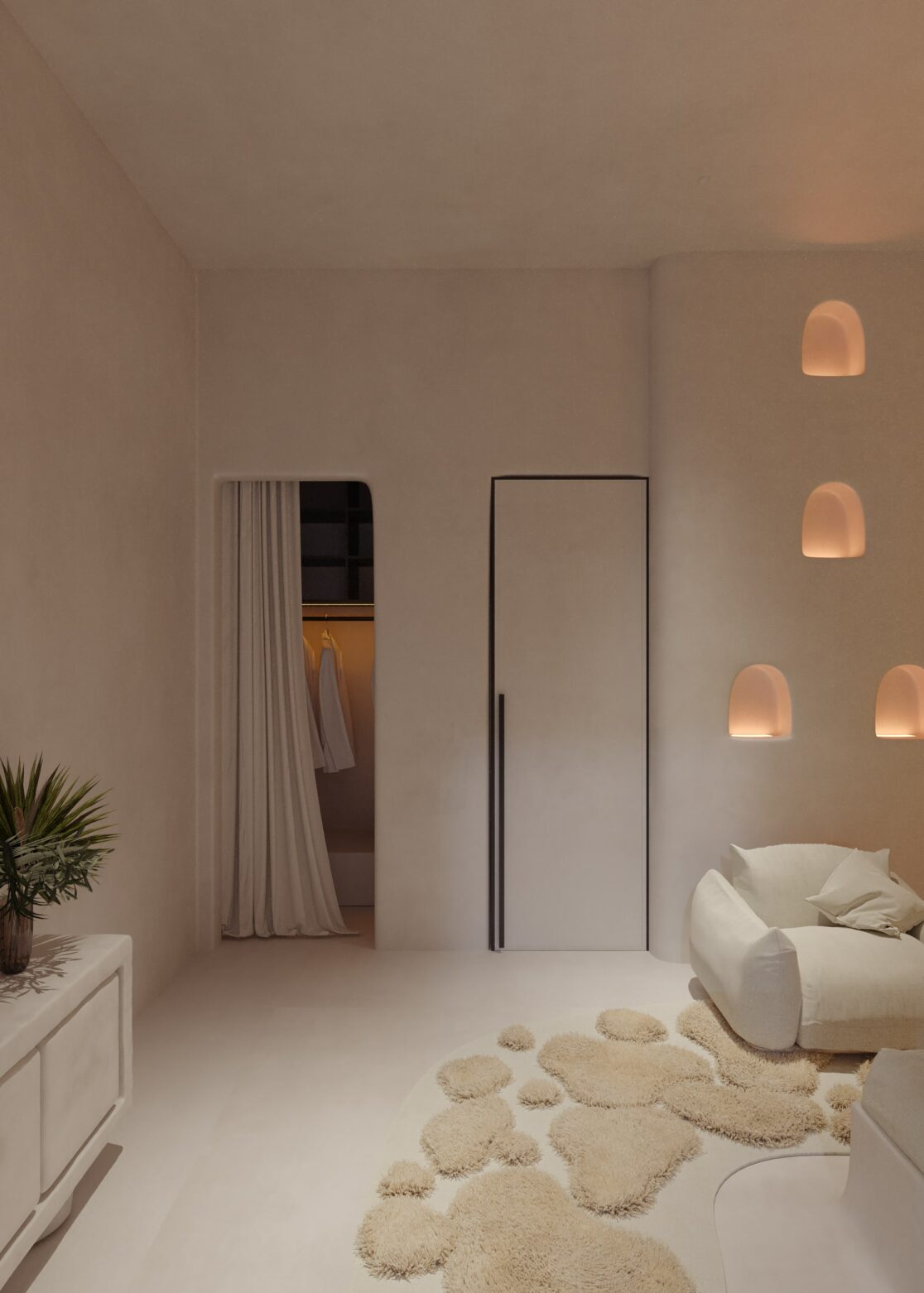 Все виллы имеют одинаковую планировочную структуру и ориентированы внутрь — на собственный двор с бассейном, уличной кухней и озеленением. Архитектура подчёркнуто простая: белые объемы, плавные линии, ритмичные проёмы. Это создаёт фон для жизни, где природа и свет играют главную роль.