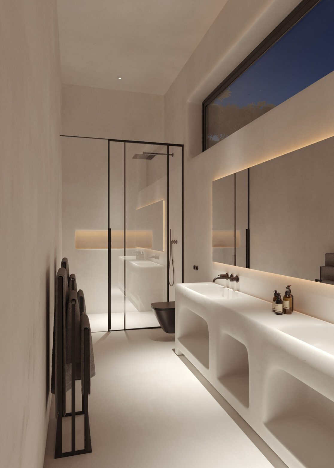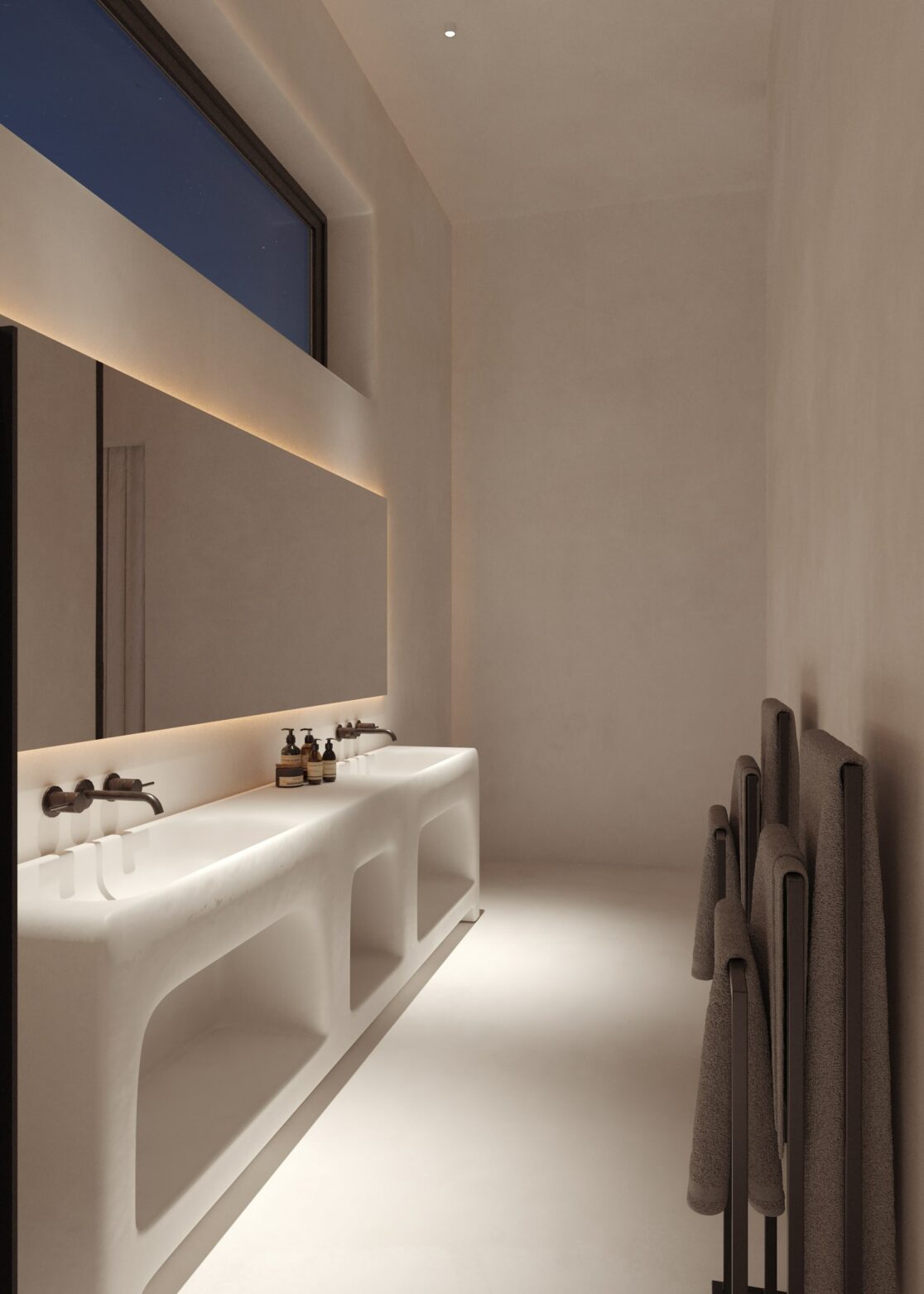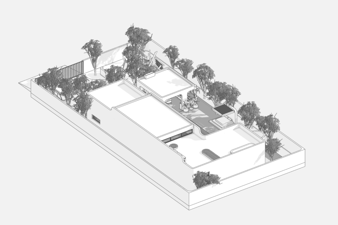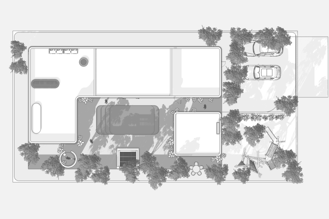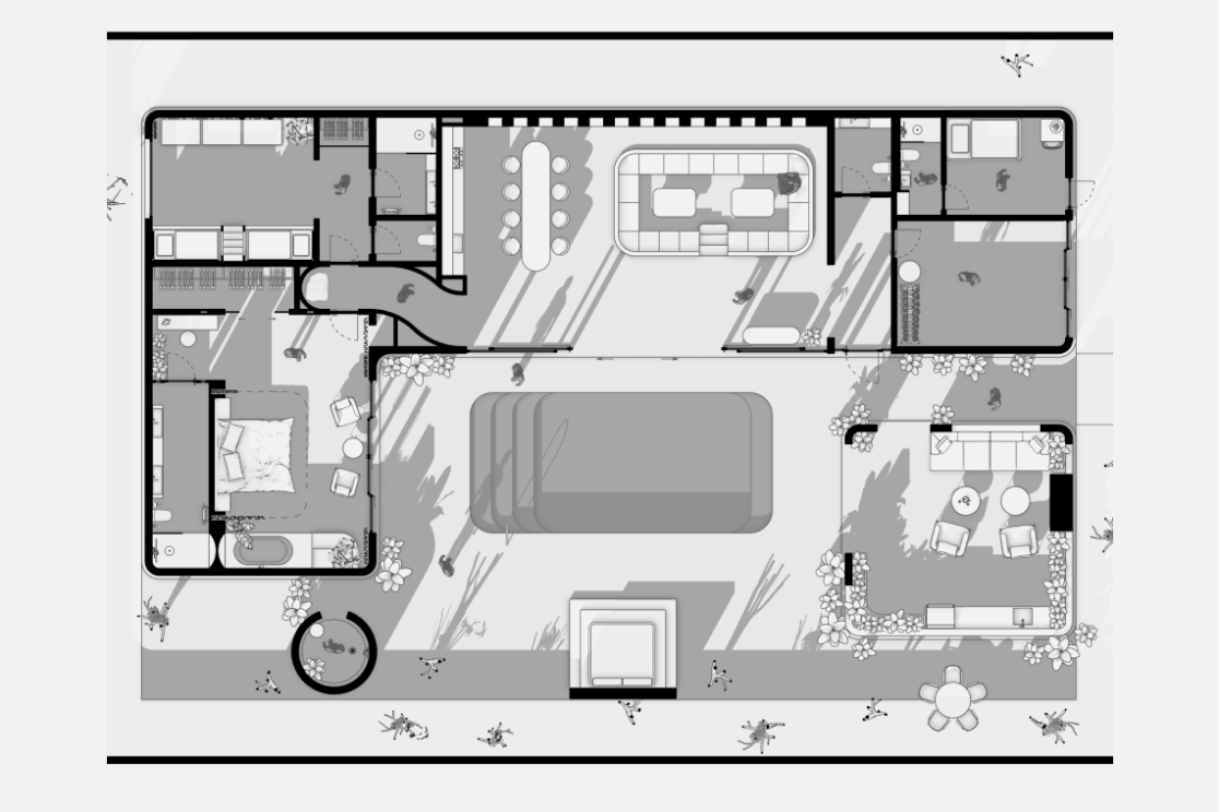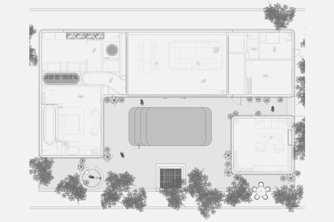 Планировочная структура виллы Mirah организована вокруг центрального двора с бассейном, объединяющего внутренние и наружные пространства. Вдоль северной стороны расположены основные общественные зоны — кухня с островом, обеденная зона и гостиная, которые открываются во двор через панорамные раздвижные перегородки, создавая ощущение лёгкости и свободы. Это сердце дома связывает оба жилых крыла и обеспечивает удобную навигацию по пространству.