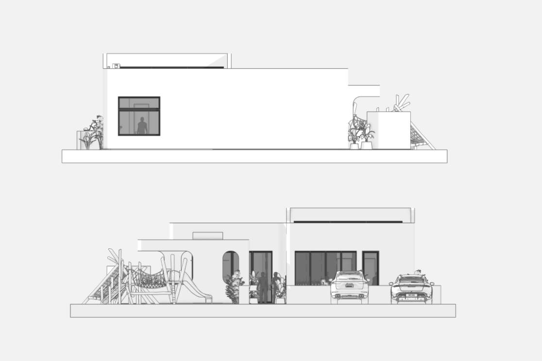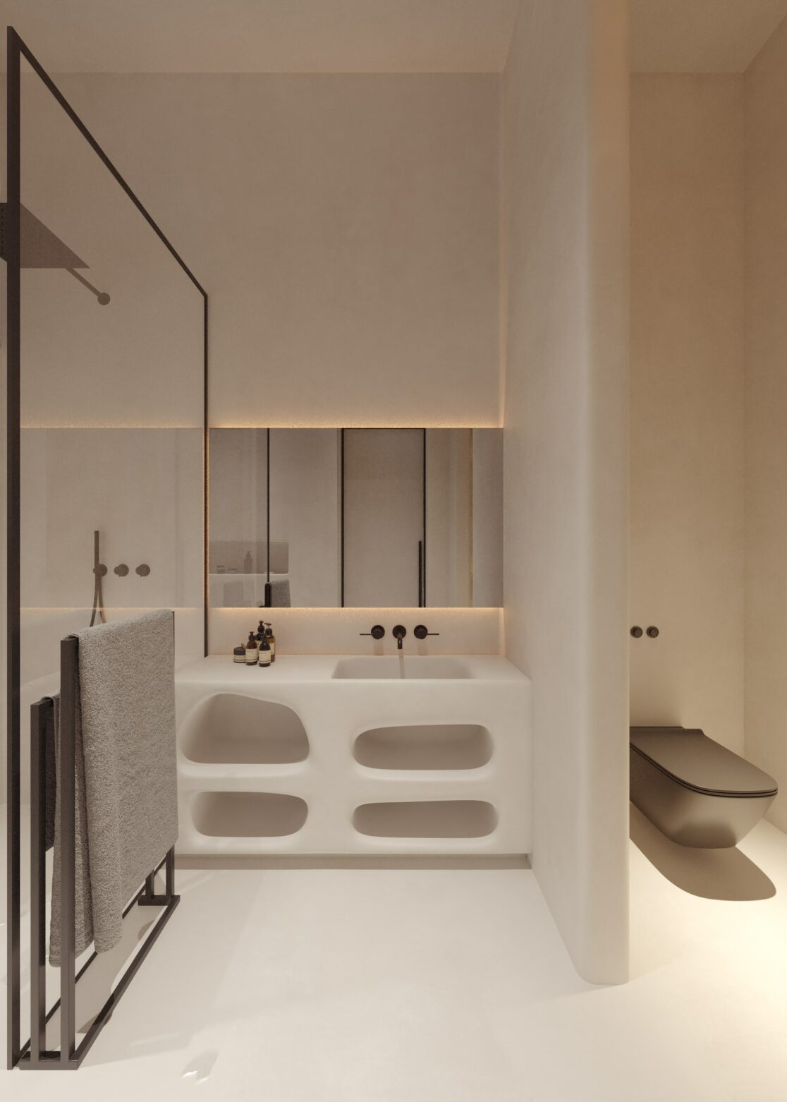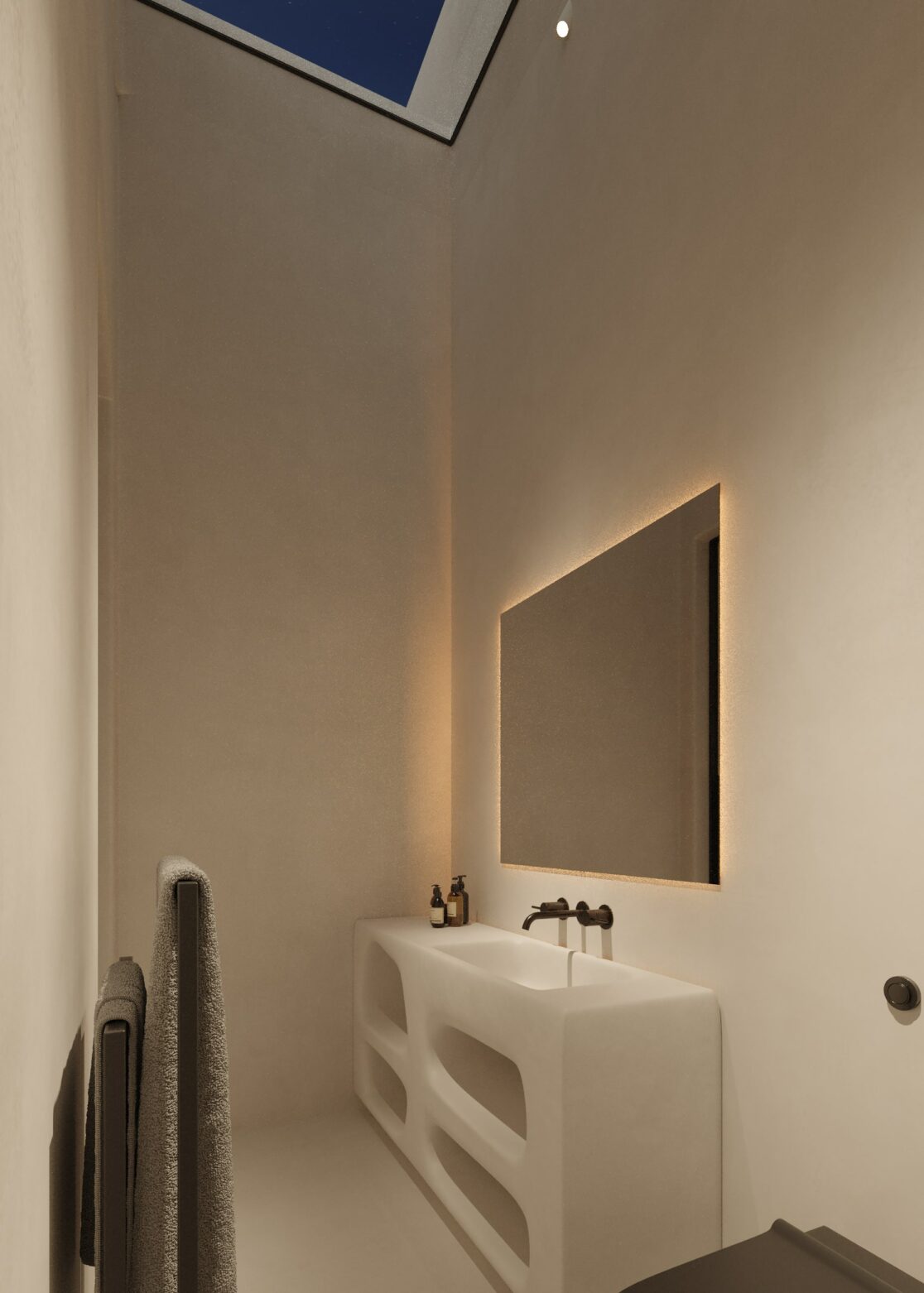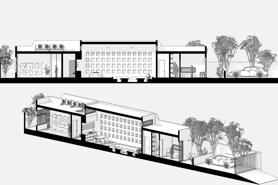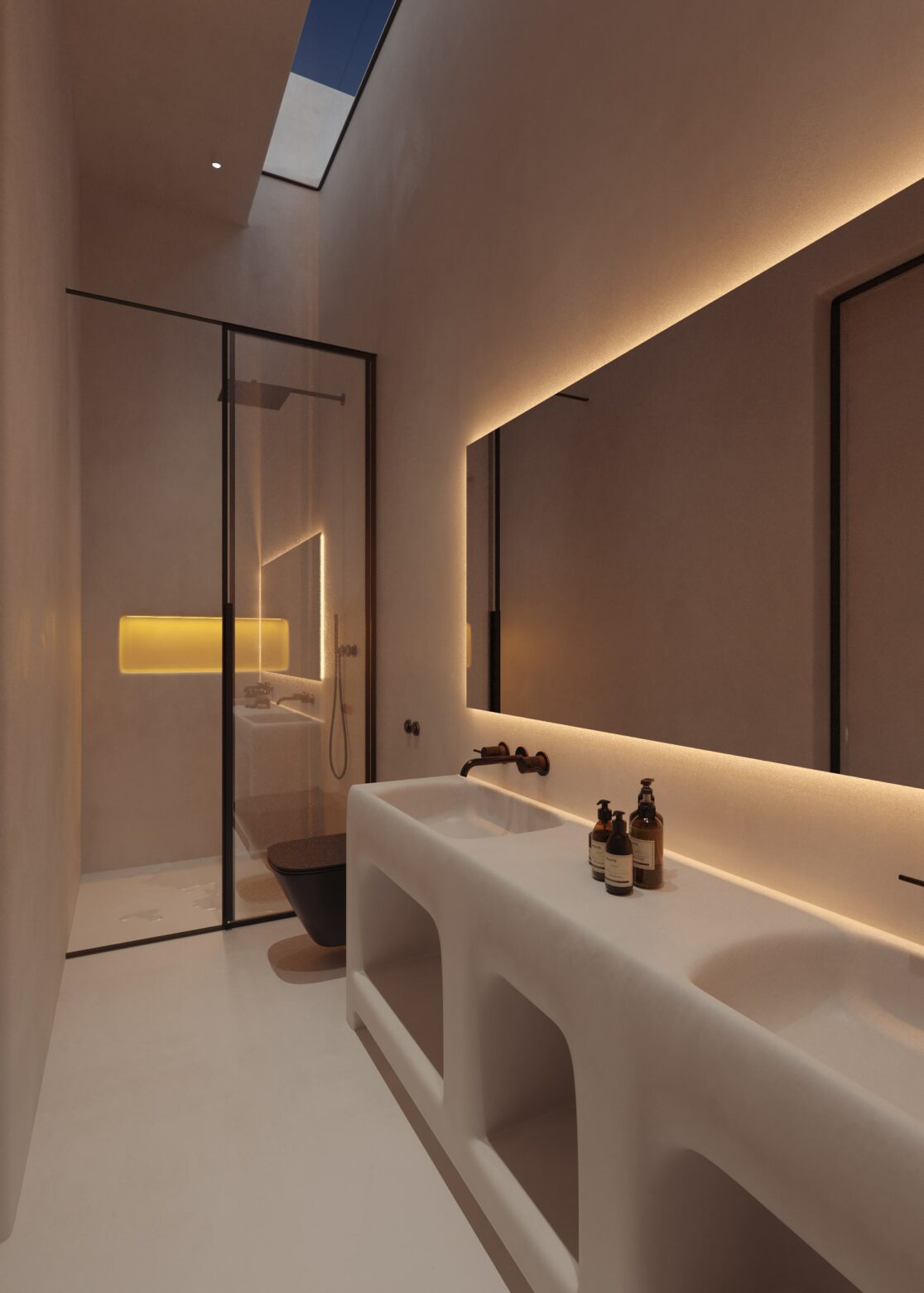 Планировочная структура виллы Mirah организована вокруг центрального двора с бассейном, объединяющего внутренние и наружные пространства. Вдоль северной стороны расположены основные общественные зоны — кухня с островом, обеденная зона и гостиная, которые открываются во двор через панорамные раздвижные перегородки, создавая ощущение лёгкости и свободы. Это сердце дома связывает оба жилых крыла и обеспечивает удобную навигацию по пространству.