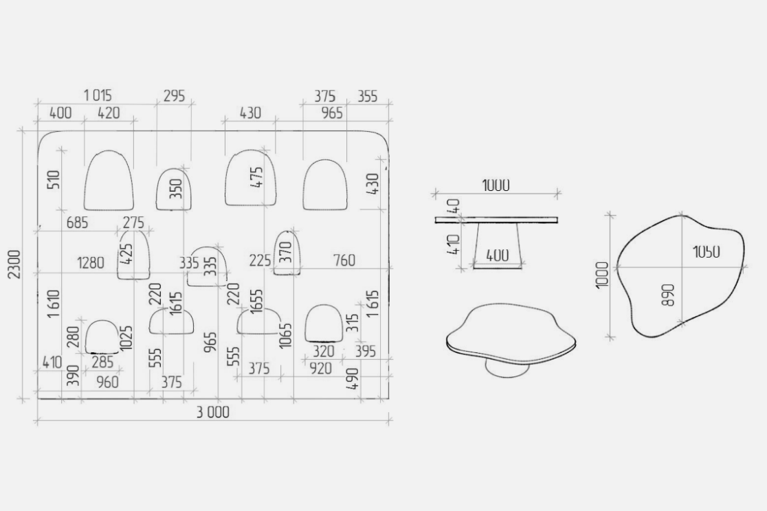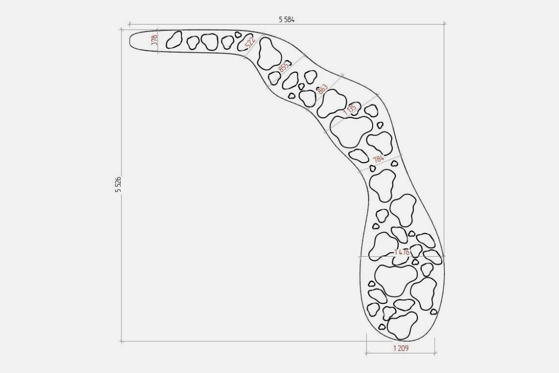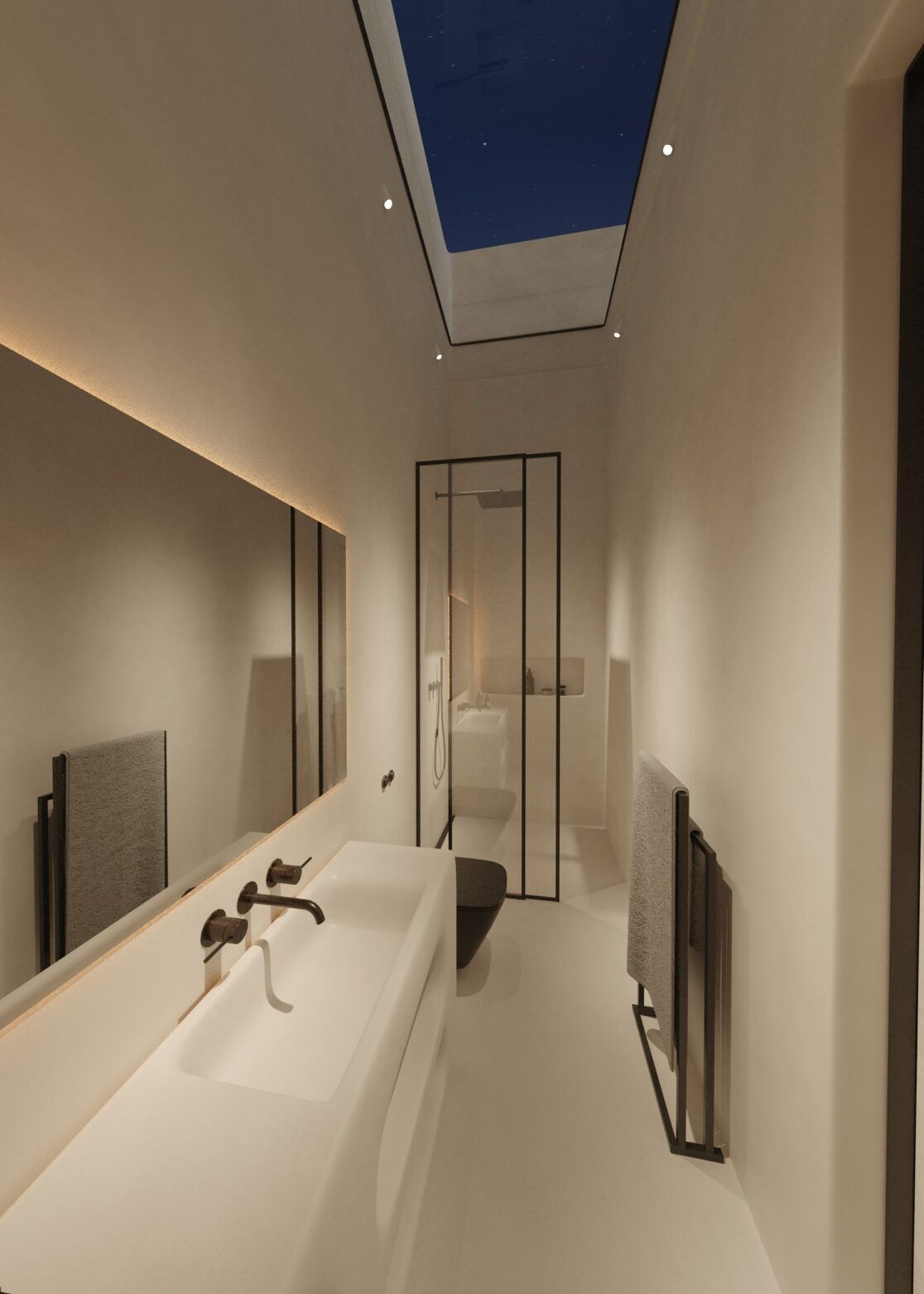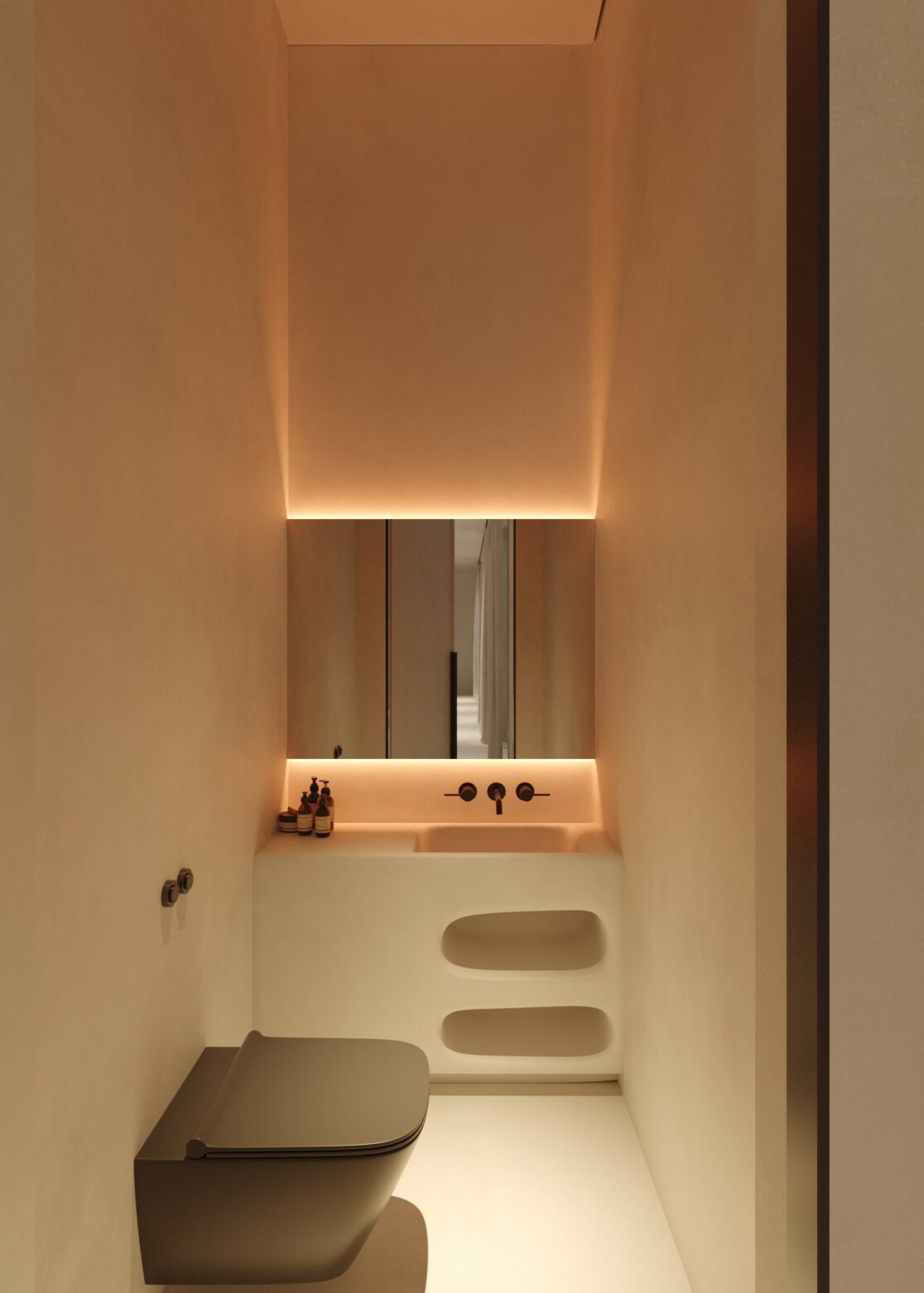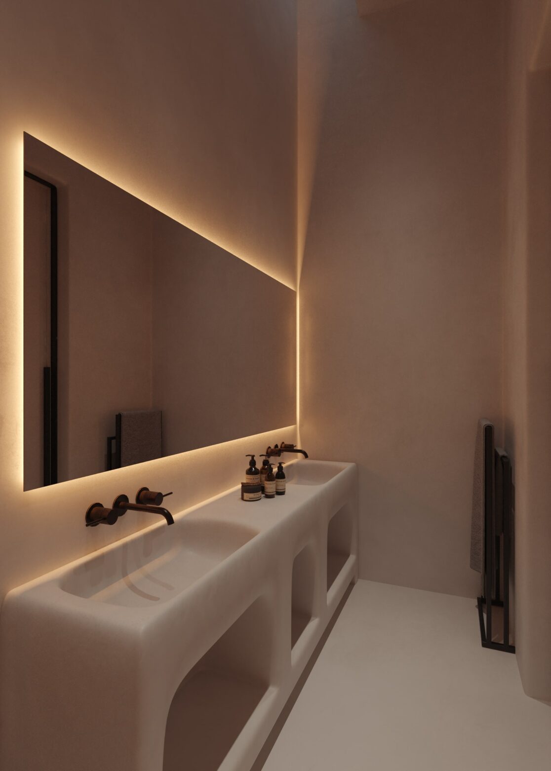 Планировочная структура виллы Mirah организована вокруг центрального двора с бассейном, объединяющего внутренние и наружные пространства. Вдоль северной стороны расположены основные общественные зоны — кухня с островом, обеденная зона и гостиная, которые открываются во двор через панорамные раздвижные перегородки, создавая ощущение лёгкости и свободы. Это сердце дома связывает оба жилых крыла и обеспечивает удобную навигацию по пространству.