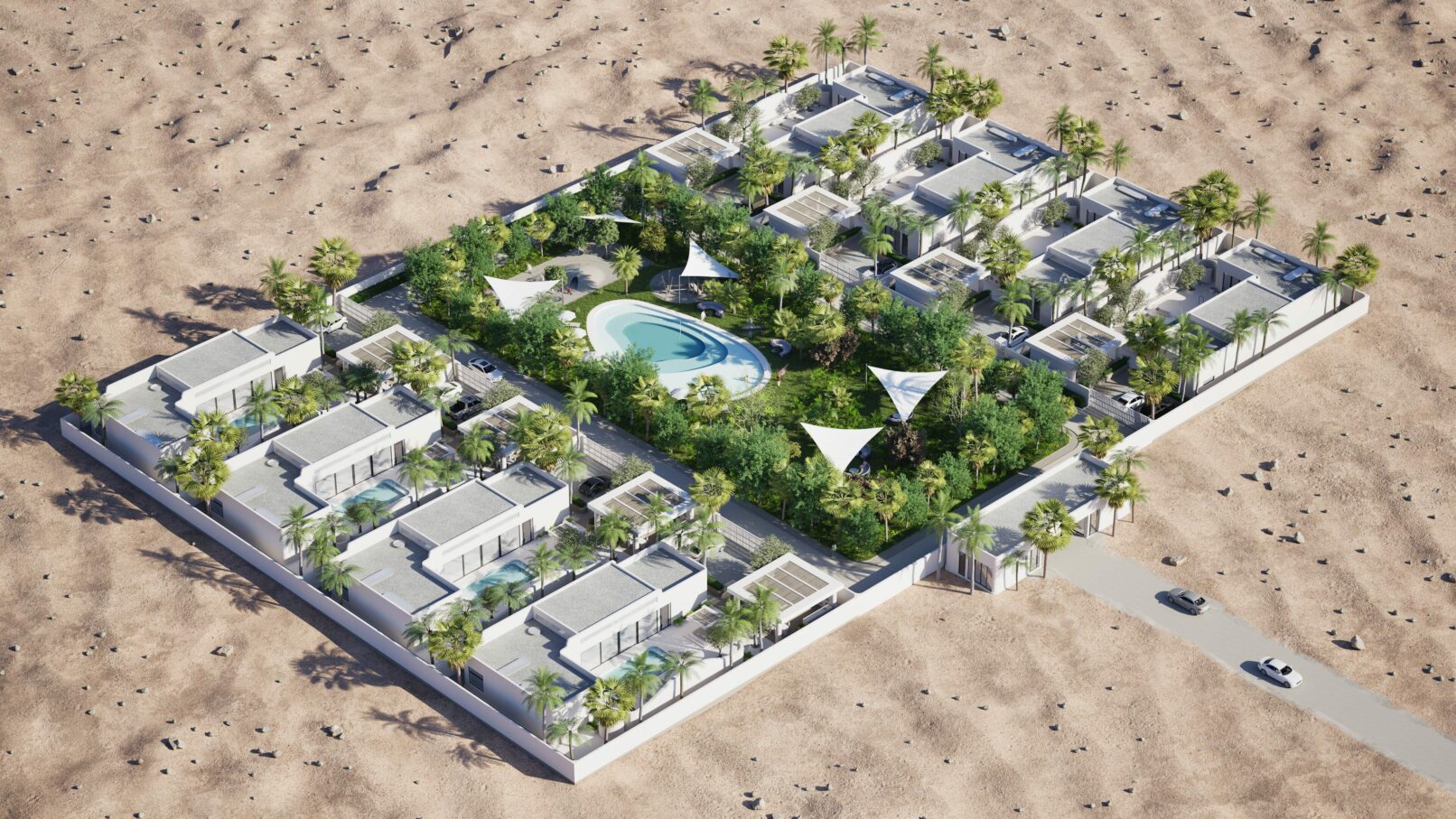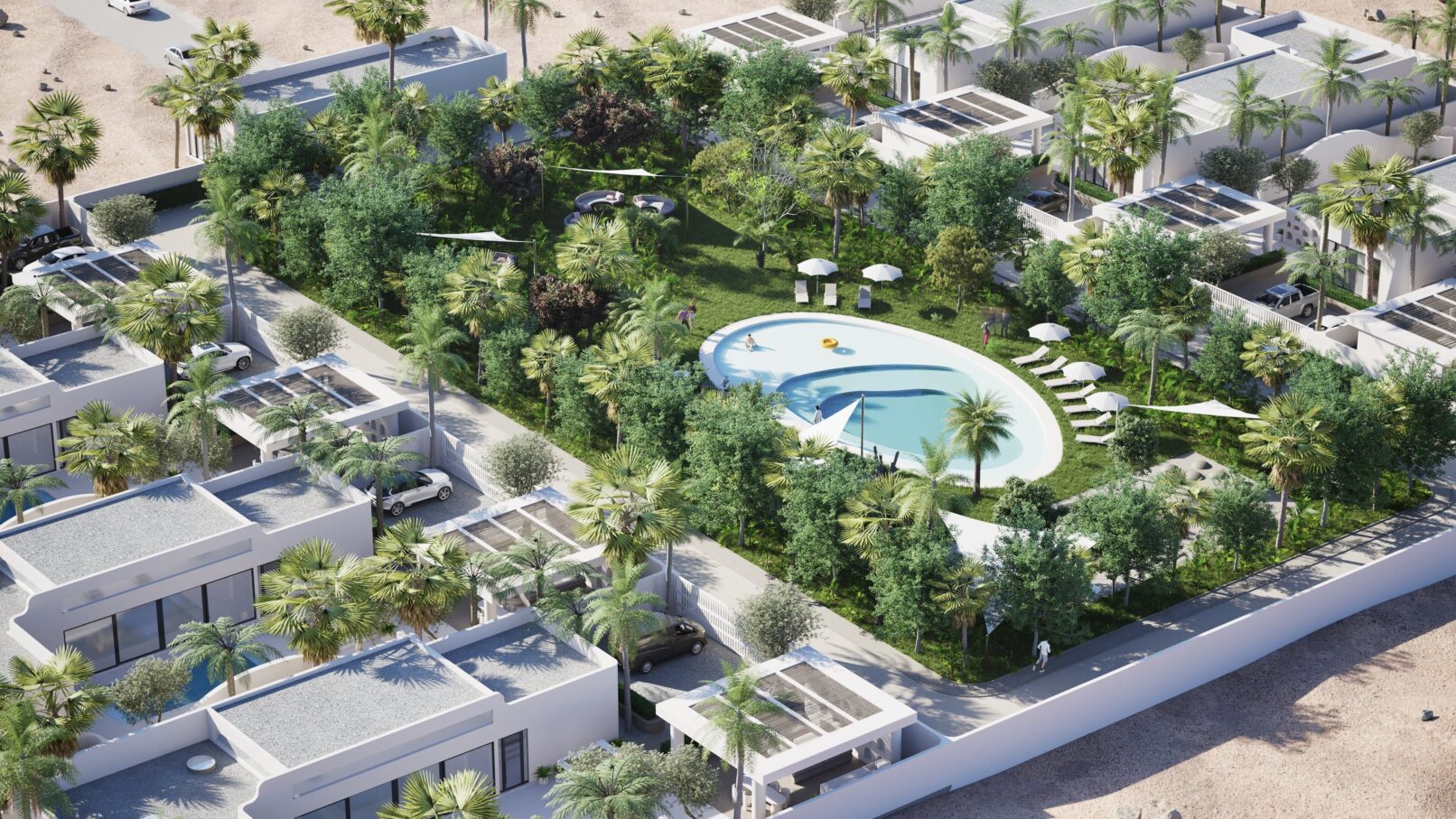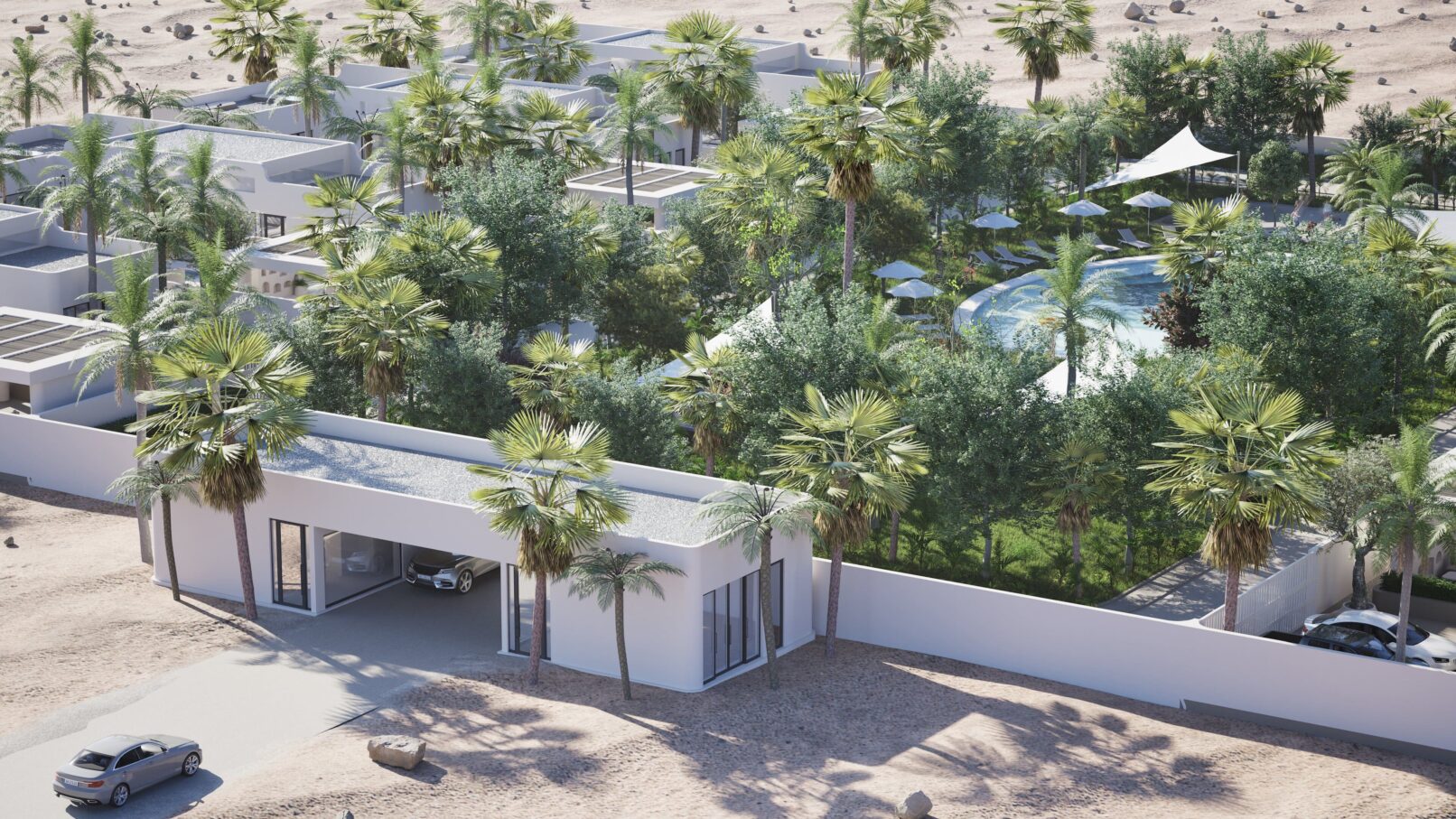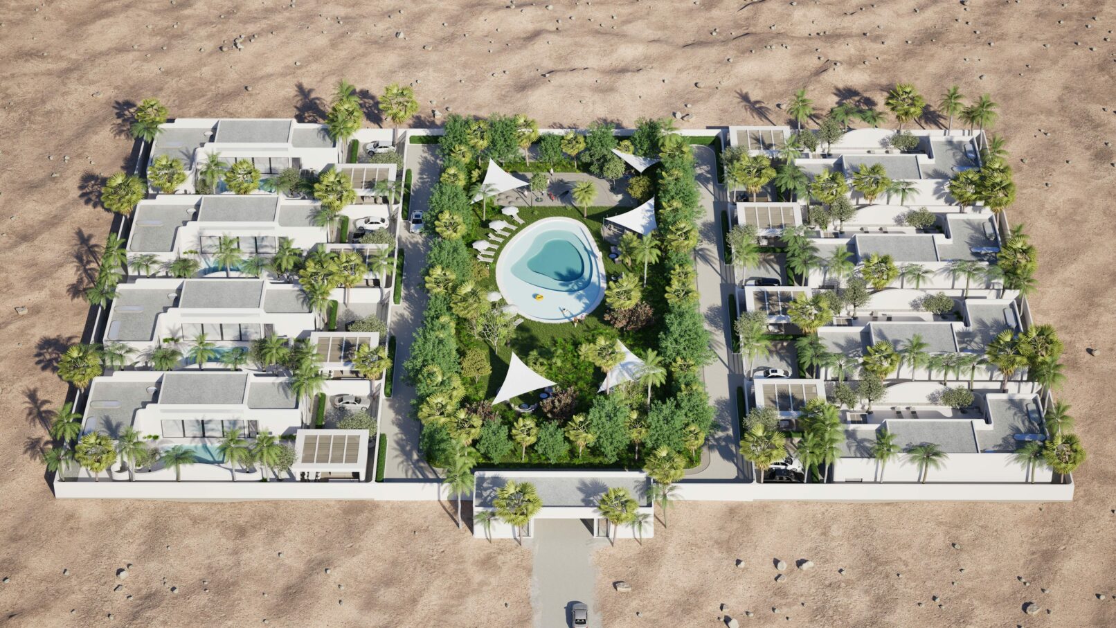 Жилой комплекс из восьми современных вилл спроектирован как приватное убежище в самом сердце пустынного ландшафта. За строгими стенами периметра раскрывается зелёный мир с тенистыми садами, плавательным бассейном и ощущением тишины. Каждая вилла имеет собственную зону отдыха с бассейном и уличной кухней под перголой, а центр посёлка отдан под общее пространство с тропическим садом. Это место создано для неспешной жизни, уединения и естественного ритма, в полной гармонии с природной средой.