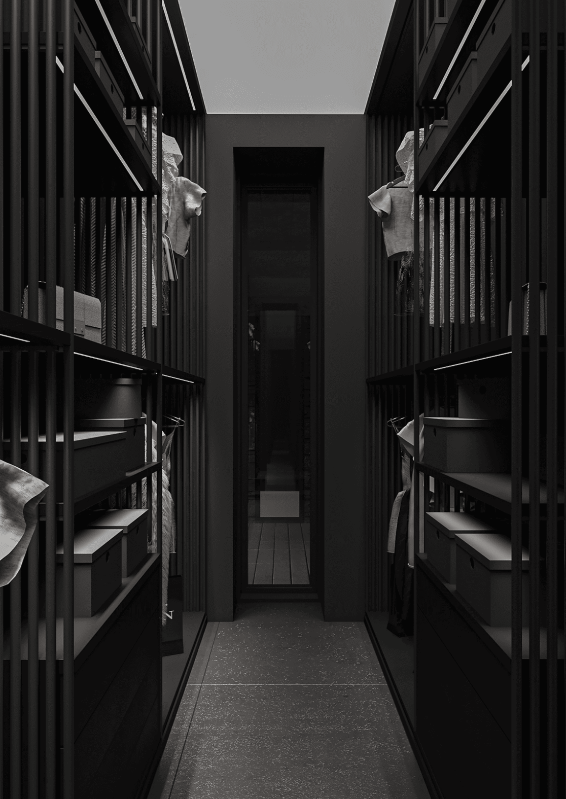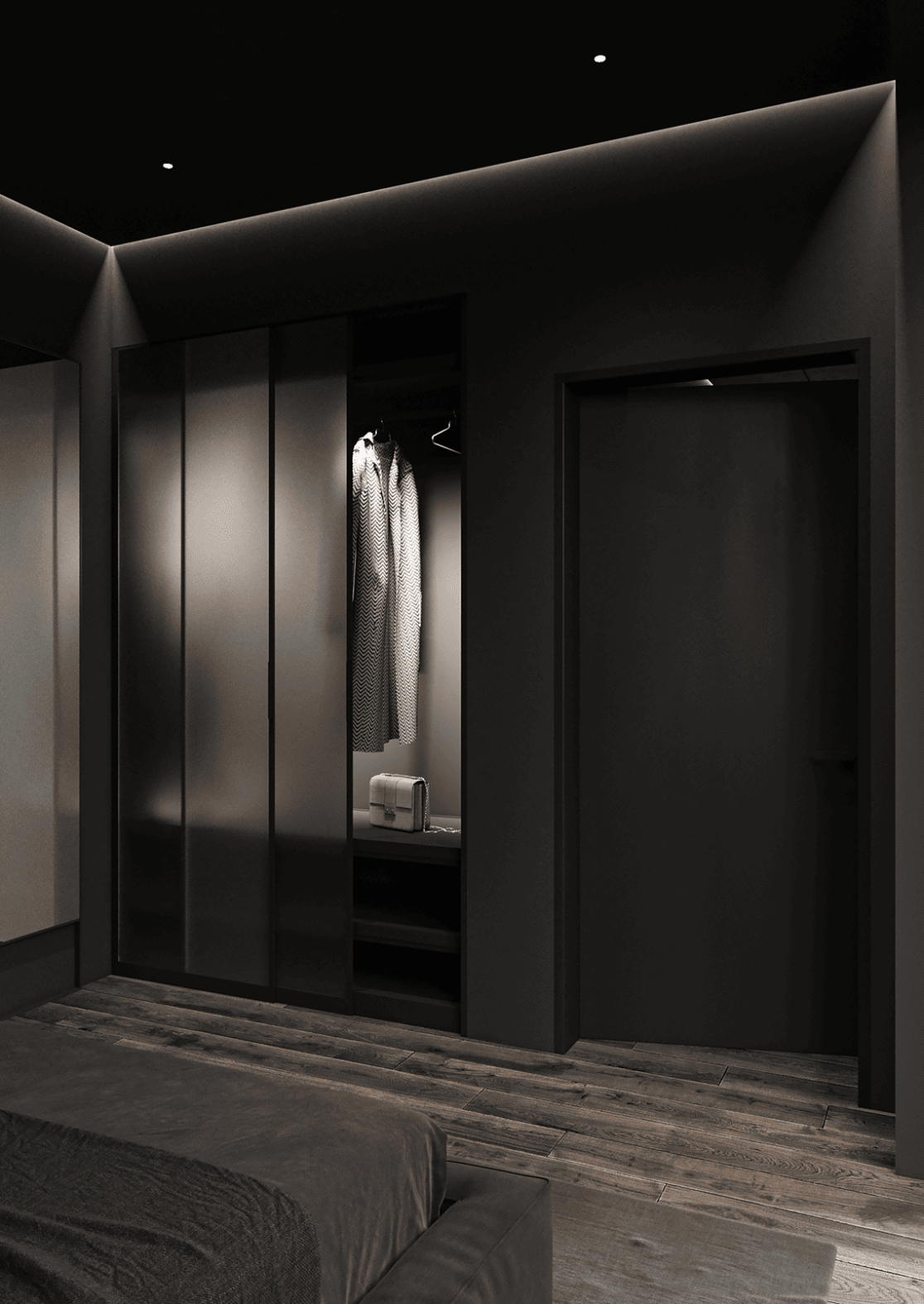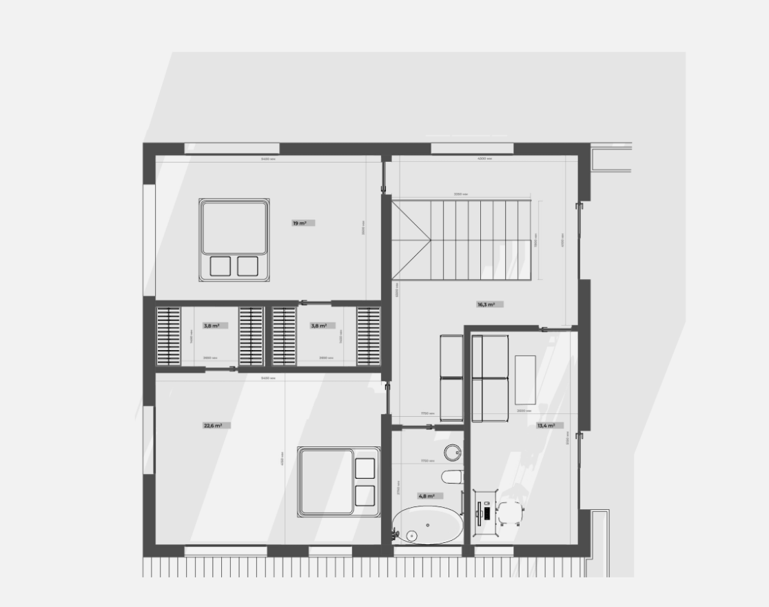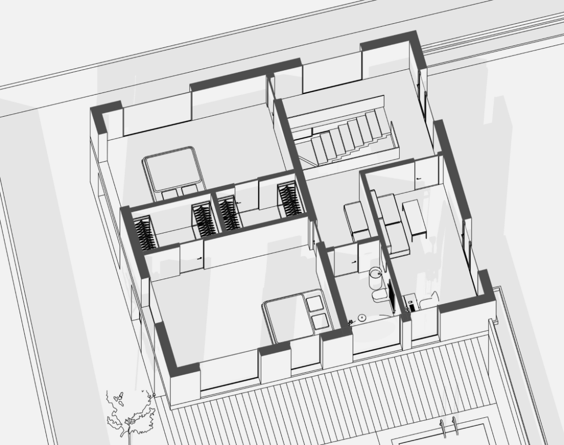 На втором этаже находятся две спальни, каждая со своей гардеробной, общий санузел с ванной, а также кабинет, который может использоваться как игровая. С этажа предусмотрен выход на открытую террасу — зону отдыха, расположенную на крыше гаража.