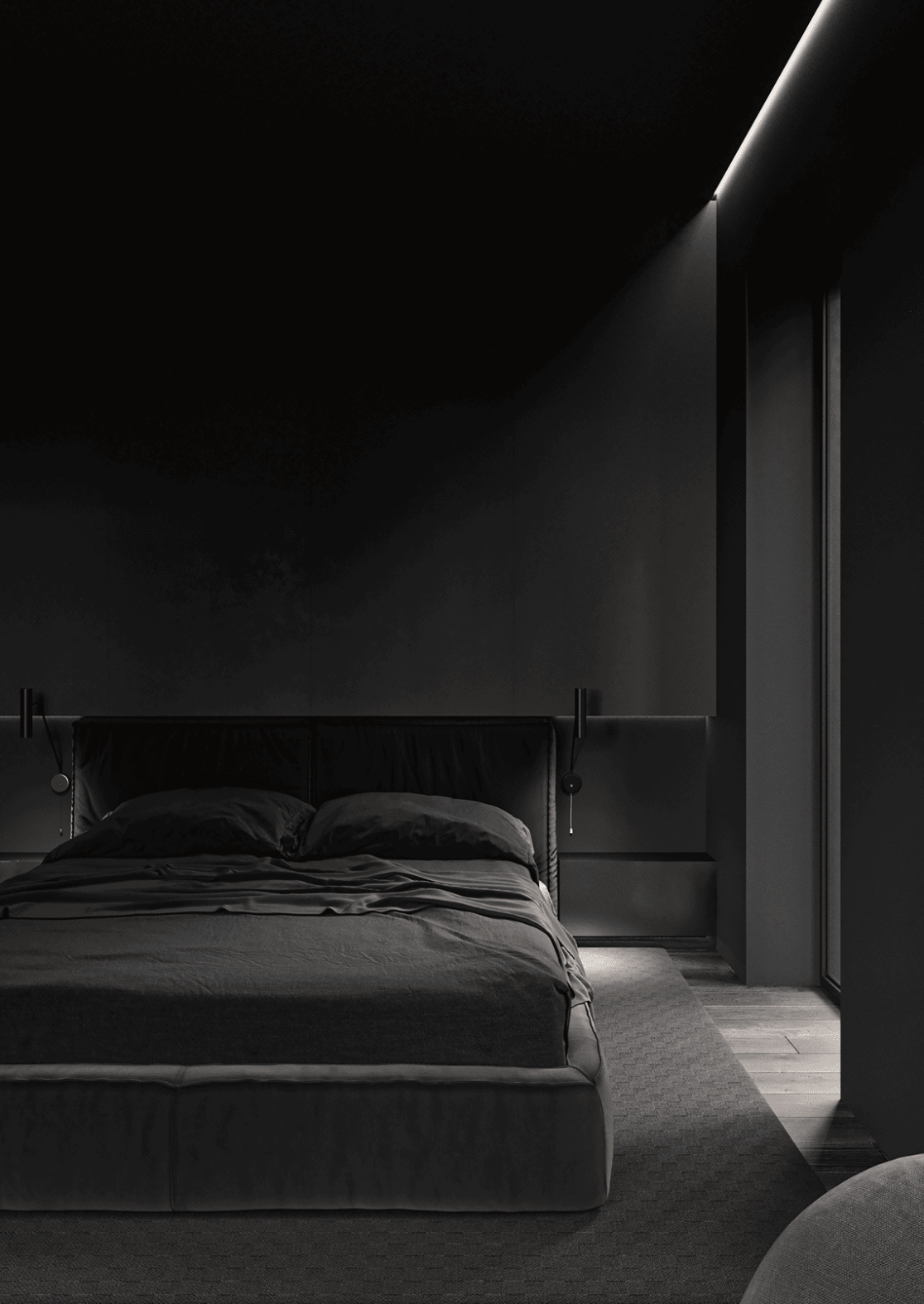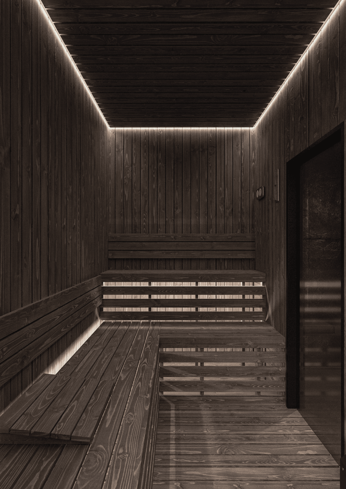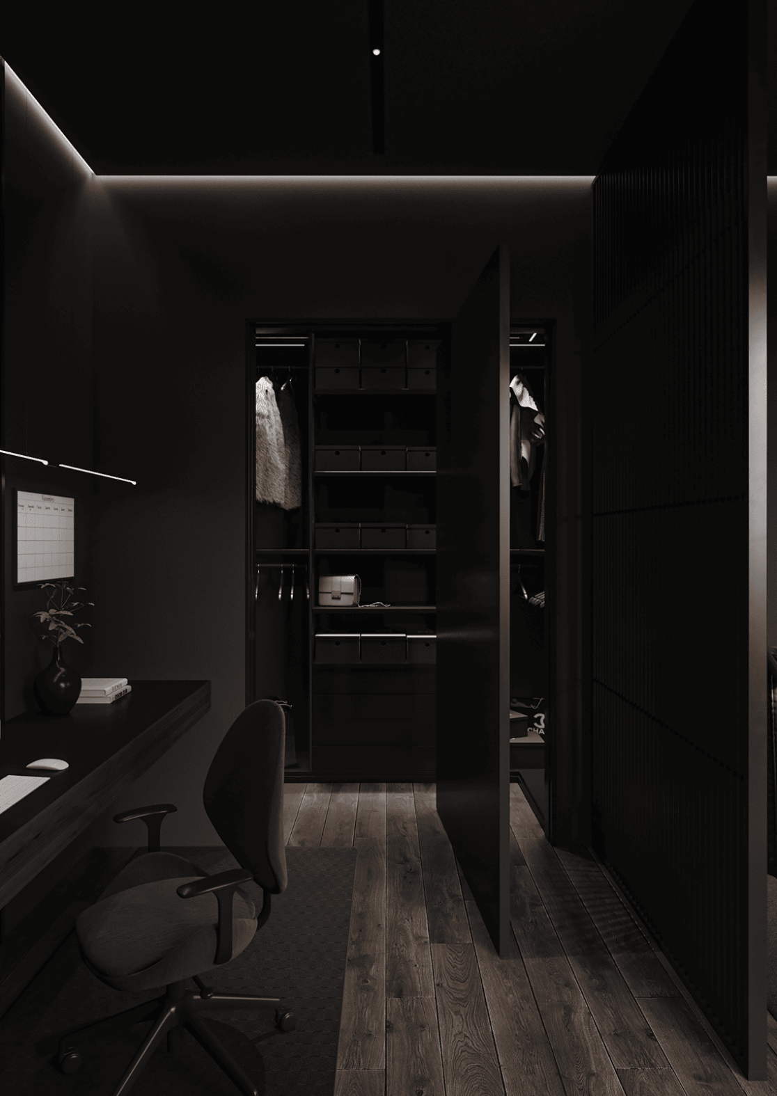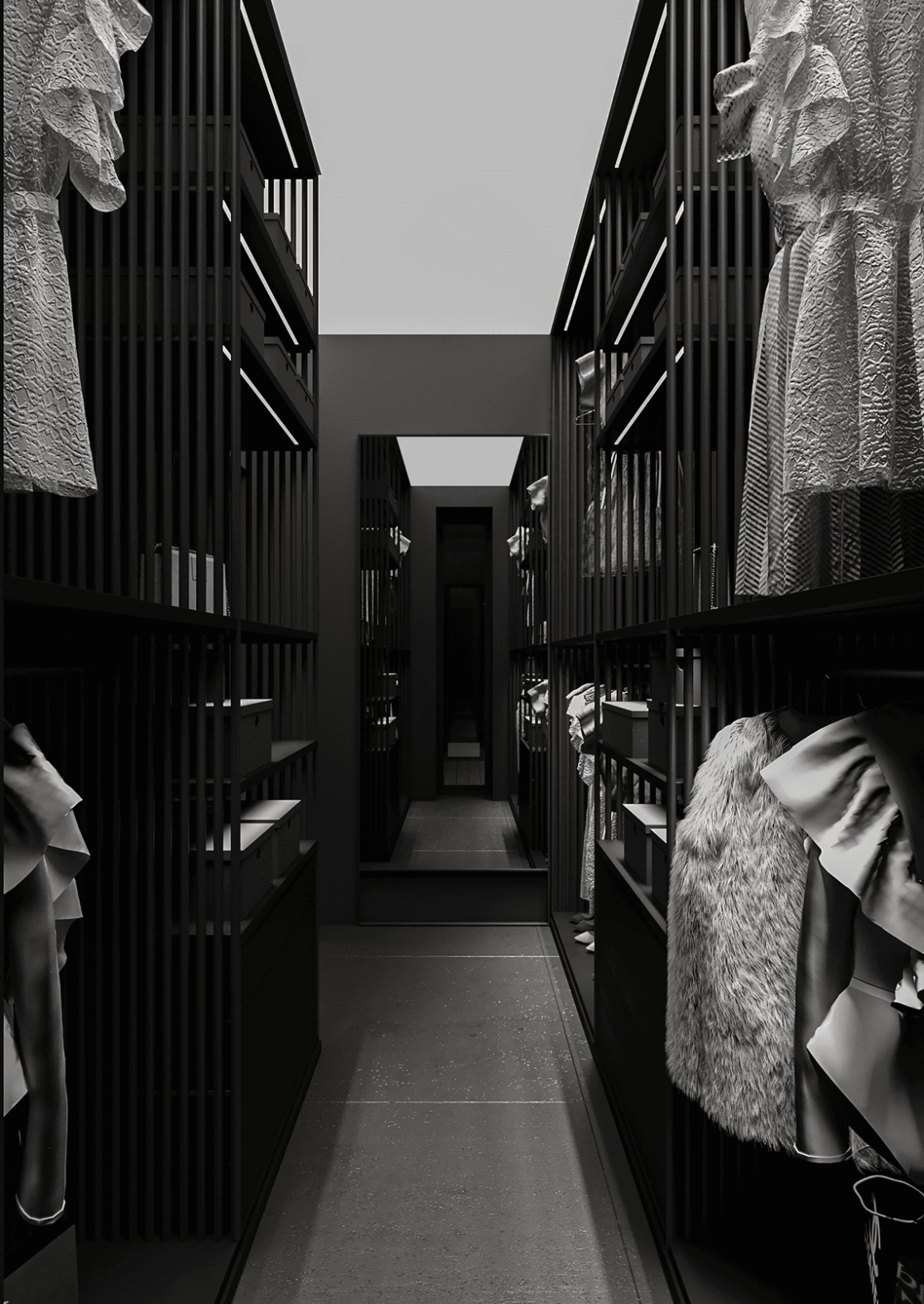 На втором этаже находятся две спальни, каждая со своей гардеробной, общий санузел с ванной, а также кабинет, который может использоваться как игровая. С этажа предусмотрен выход на открытую террасу — зону отдыха, расположенную на крыше гаража.