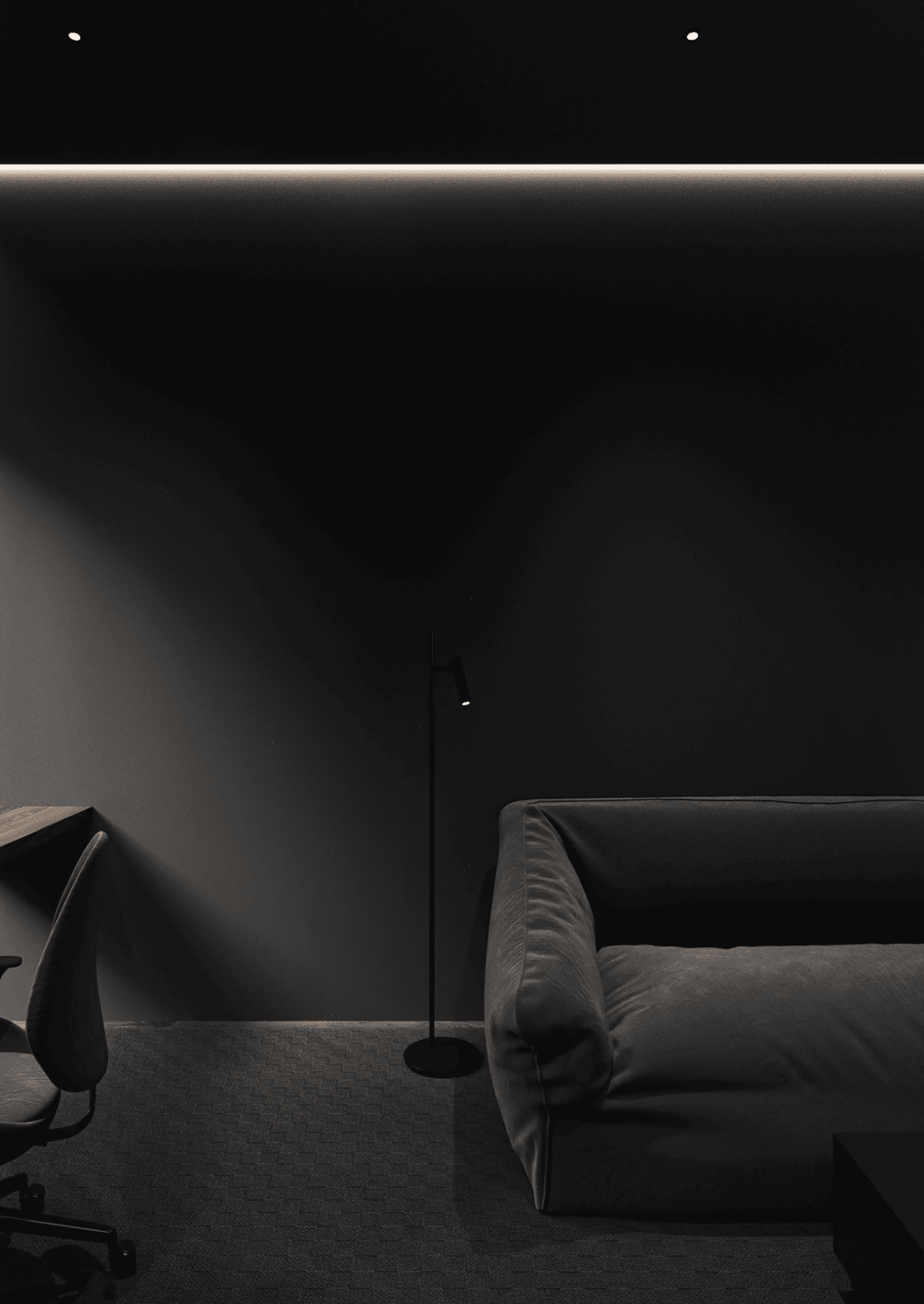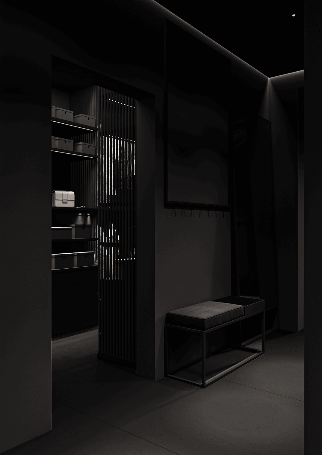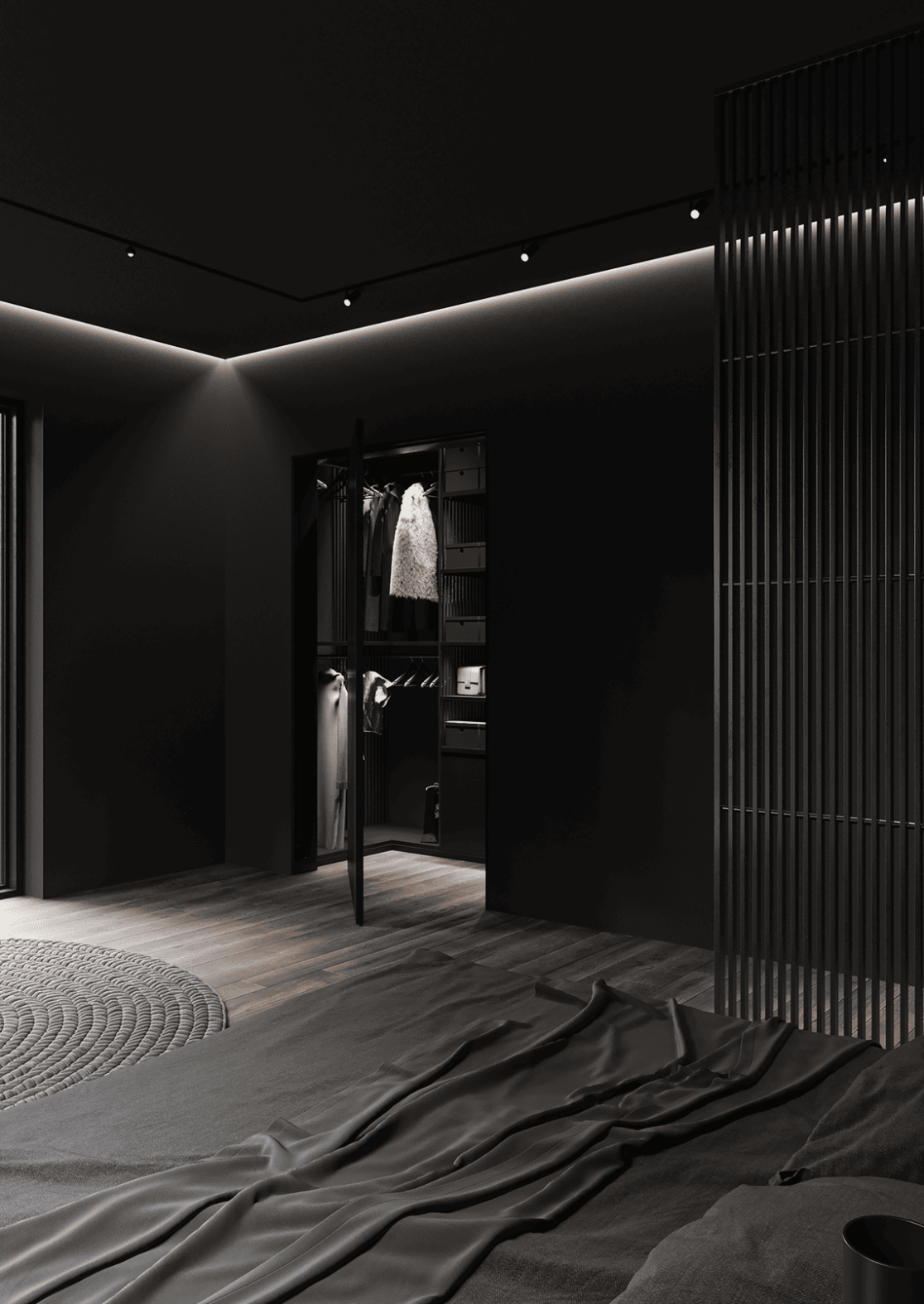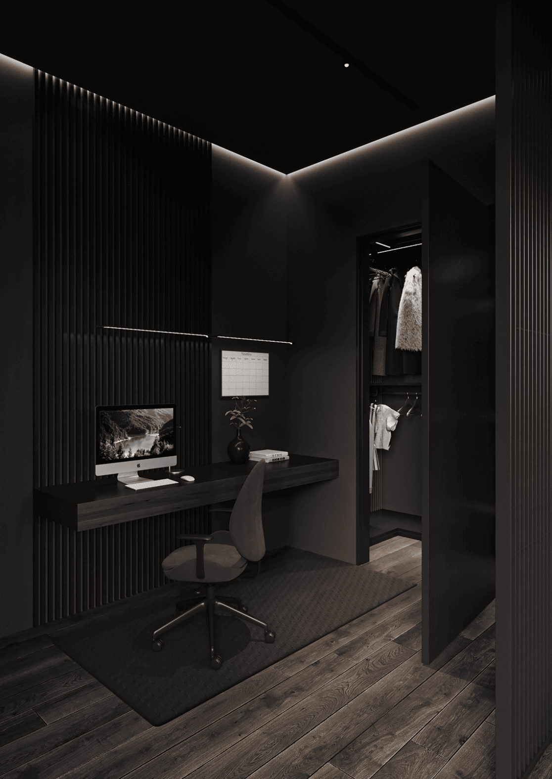 На втором этаже находятся две спальни, каждая со своей гардеробной, общий санузел с ванной, а также кабинет, который может использоваться как игровая. С этажа предусмотрен выход на открытую террасу — зону отдыха, расположенную на крыше гаража.