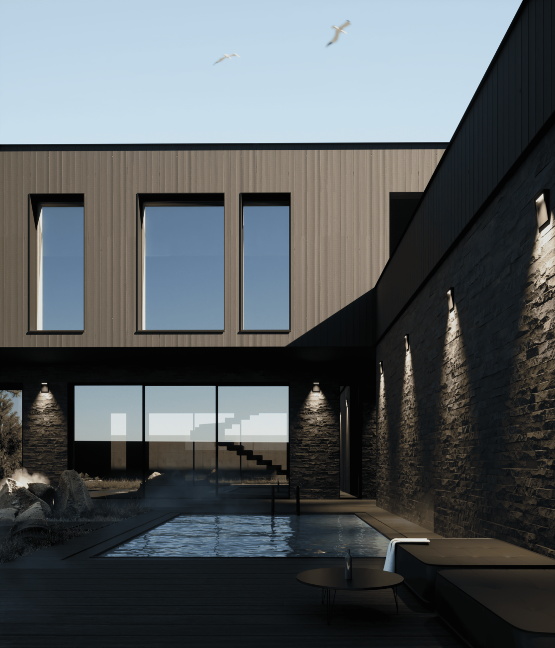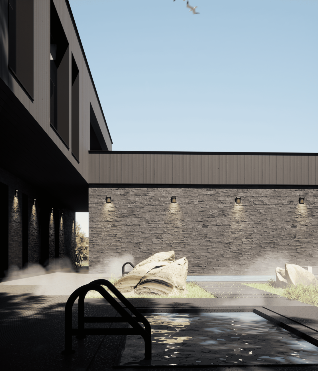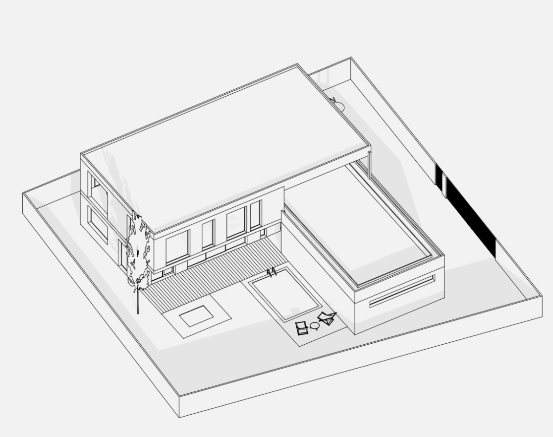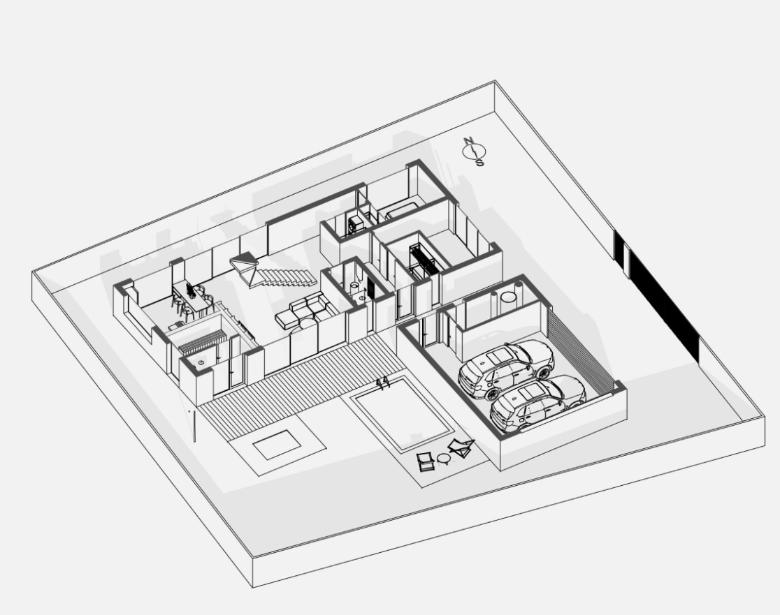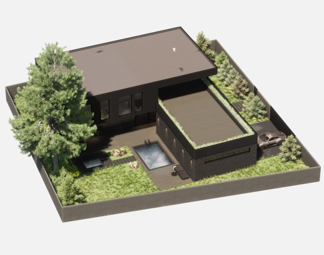 Функционально дом спроектирован для круглогодичного проживания семьи, с гибкими сценариями использования пространств и возможностью принимать гостей. Окружающий участок облагорожен: в центральной зоне расположена терраса с бассейном и купелью, предусмотрено мощение, газон, посадки вдоль ограждения и отдельная входная зона.