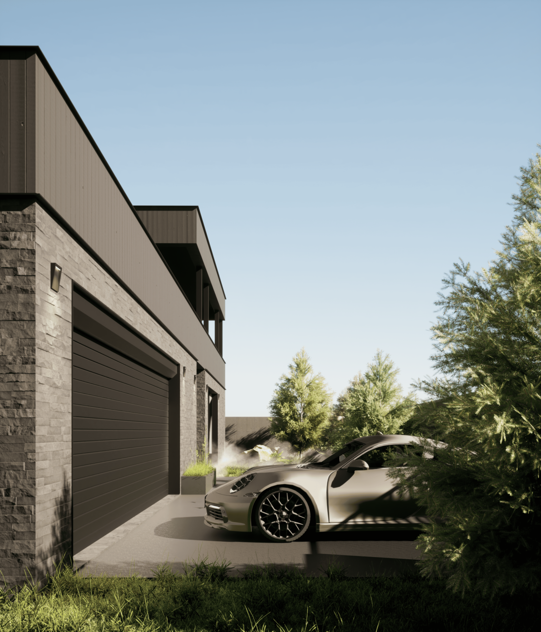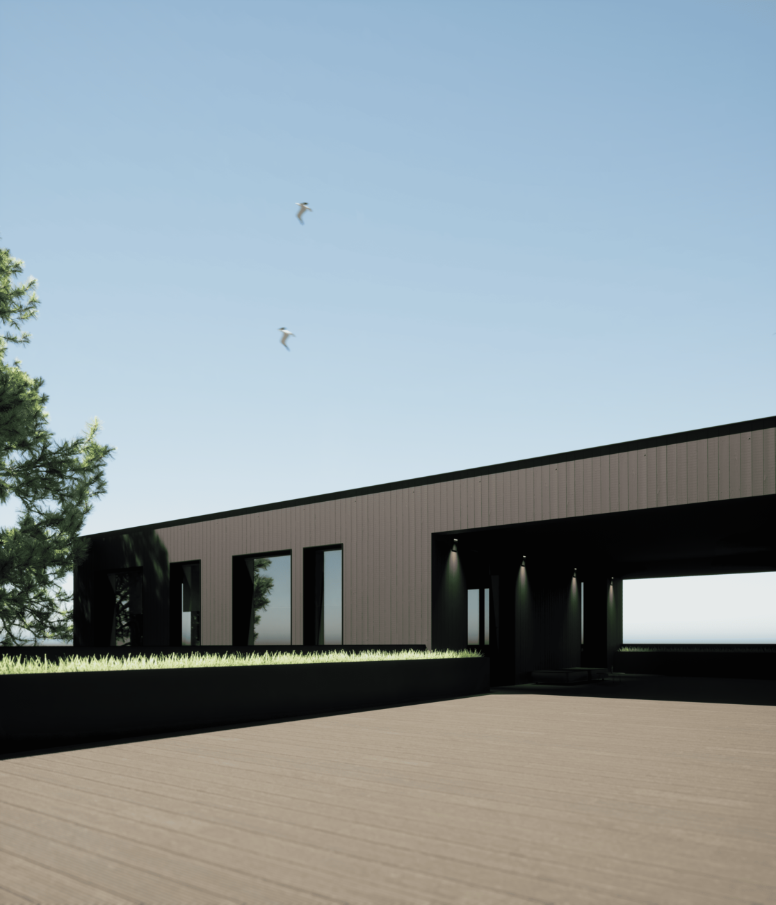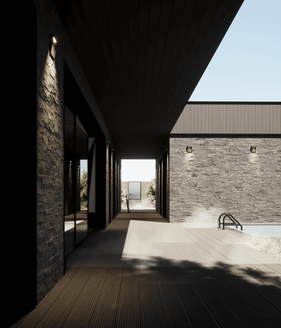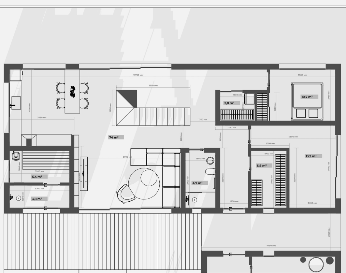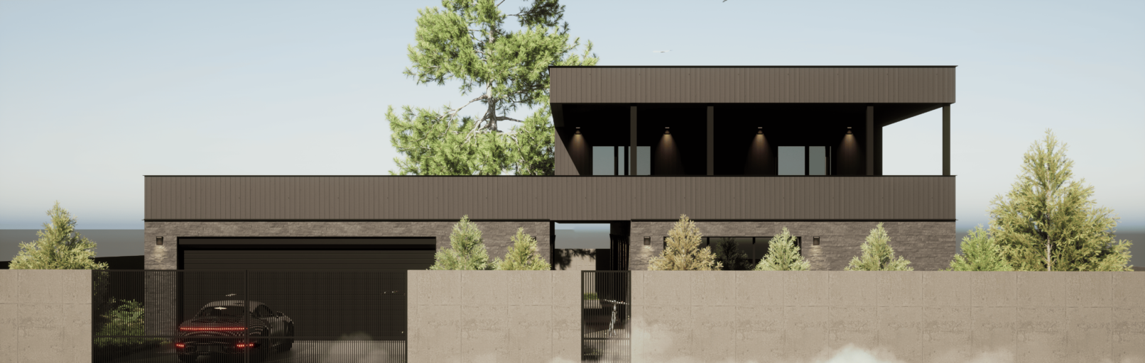 Функционально дом спроектирован для круглогодичного проживания семьи, с гибкими сценариями использования пространств и возможностью принимать гостей. Окружающий участок облагорожен: в центральной зоне расположена терраса с бассейном и купелью, предусмотрено мощение, газон, посадки вдоль ограждения и отдельная входная зона.