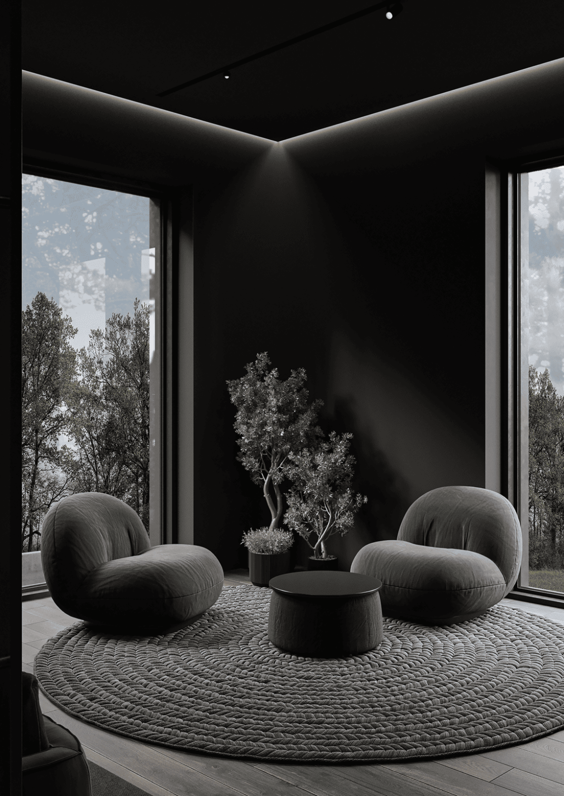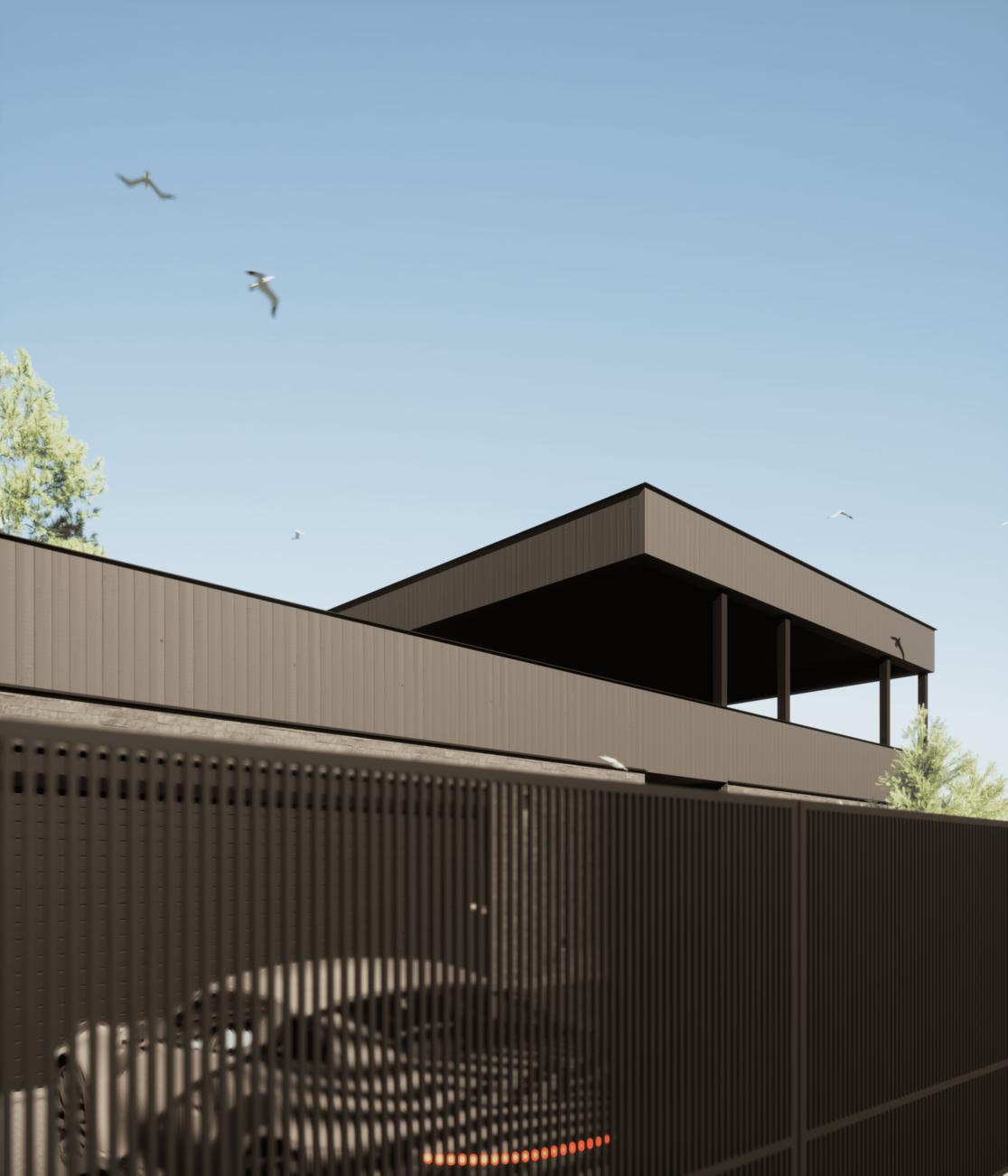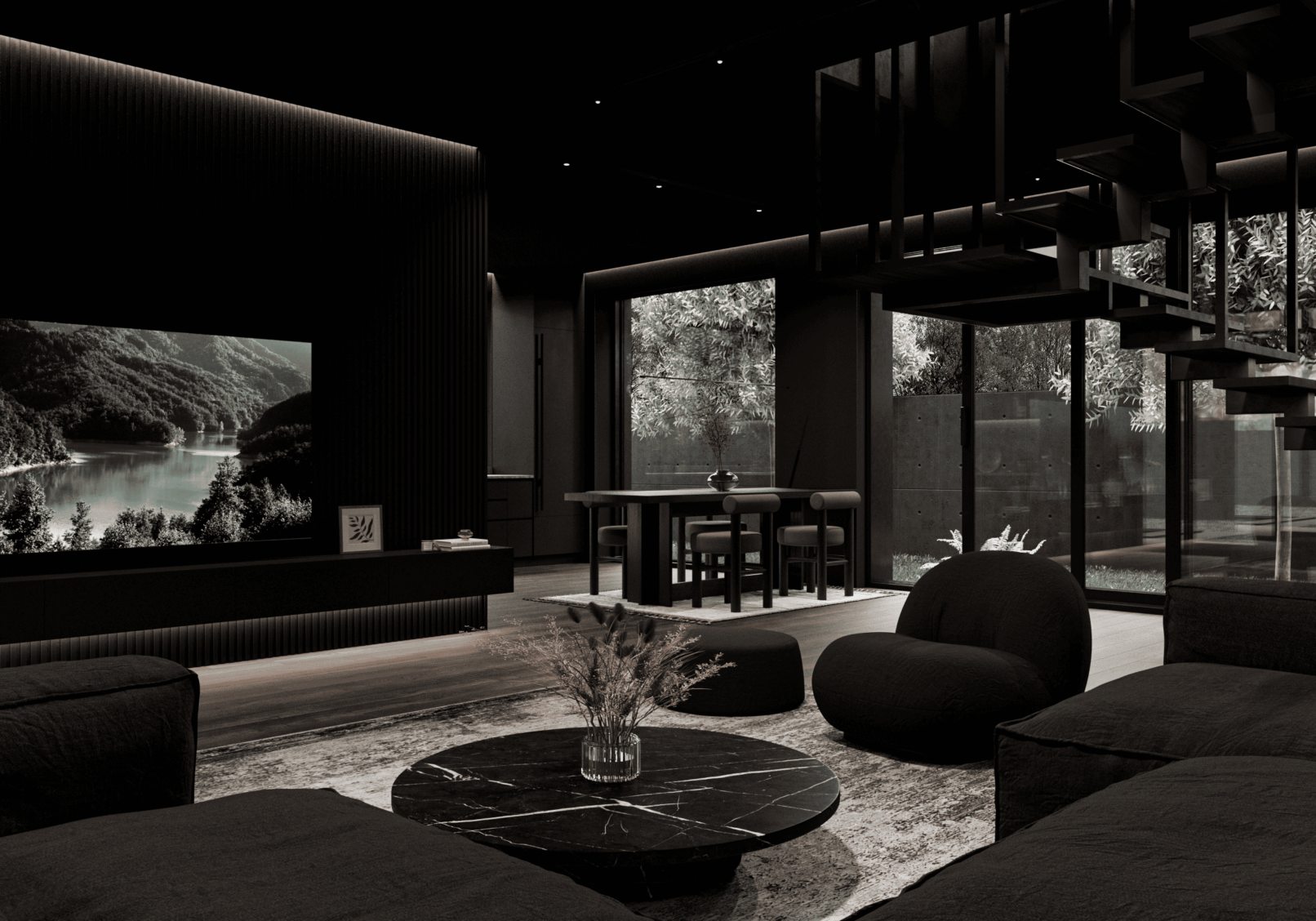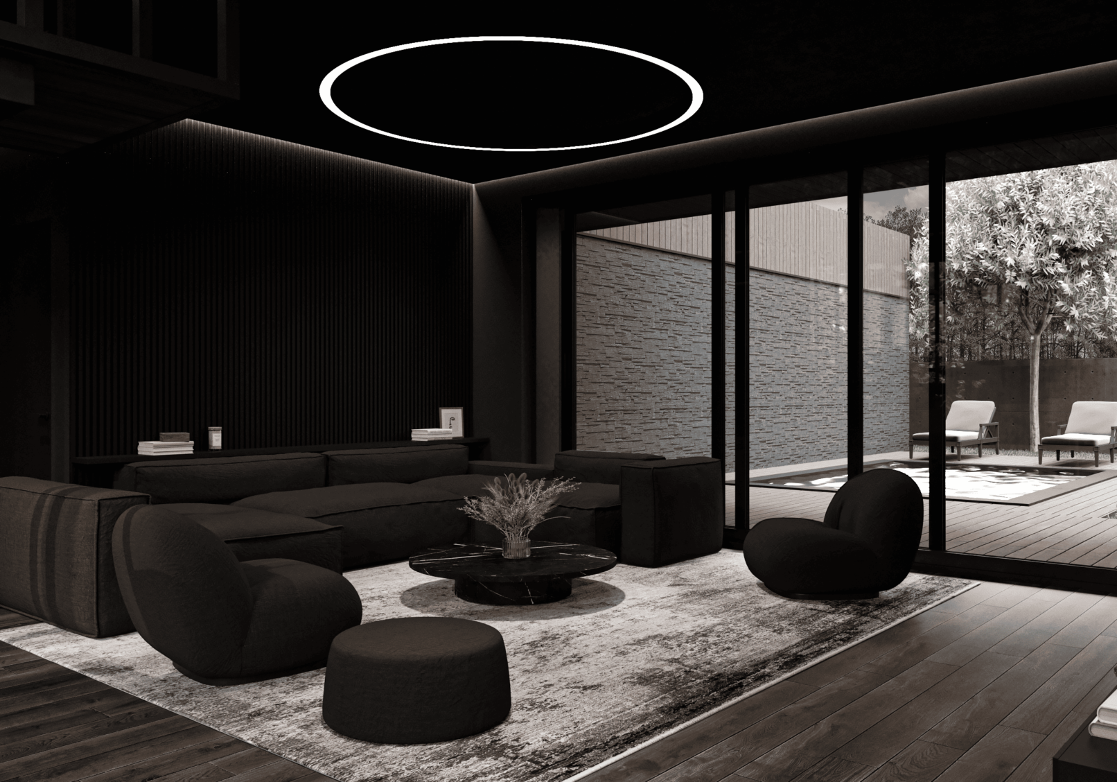 Функционально дом спроектирован для круглогодичного проживания семьи, с гибкими сценариями использования пространств и возможностью принимать гостей. Окружающий участок облагорожен: в центральной зоне расположена терраса с бассейном и купелью, предусмотрено мощение, газон, посадки вдоль ограждения и отдельная входная зона.