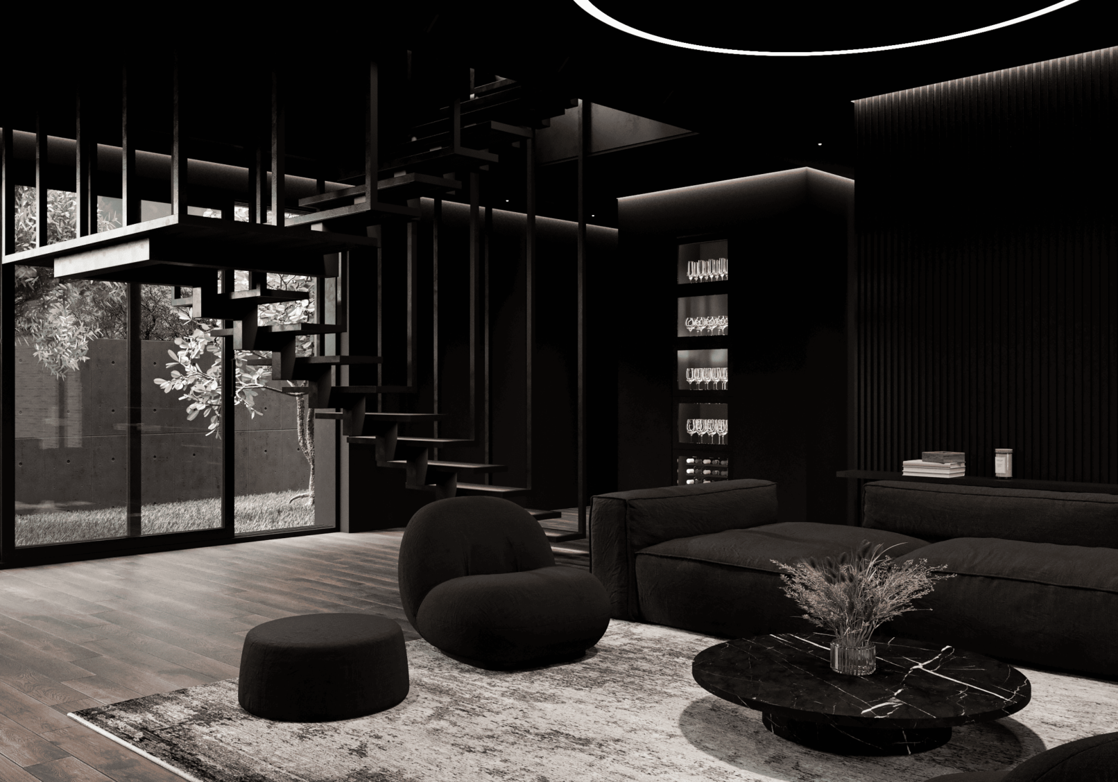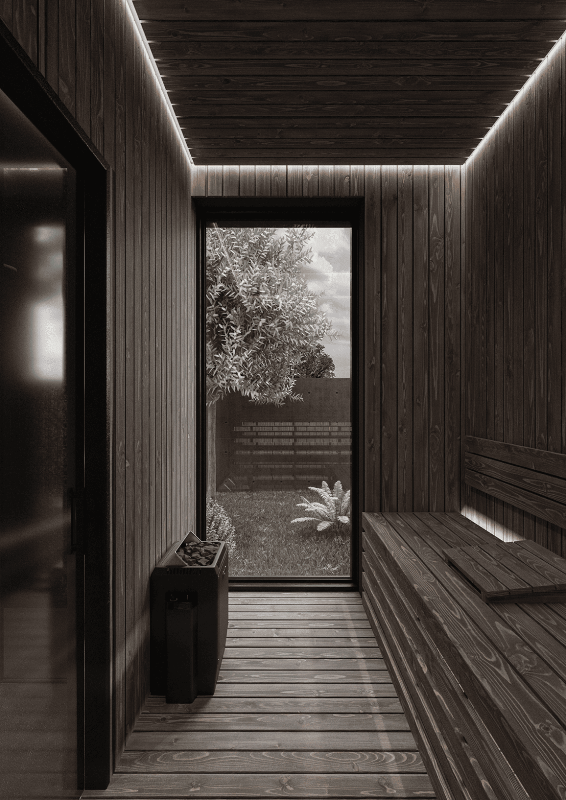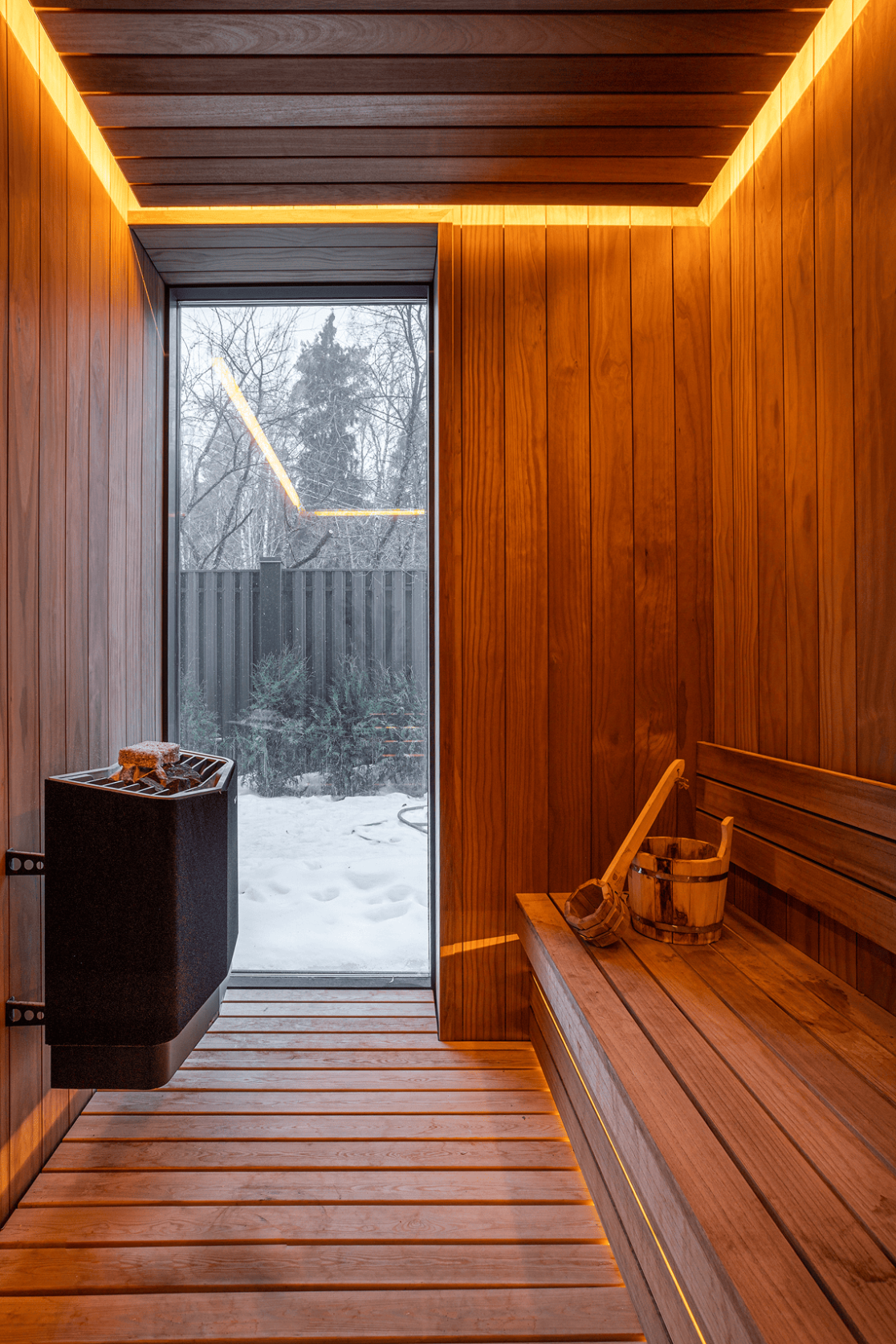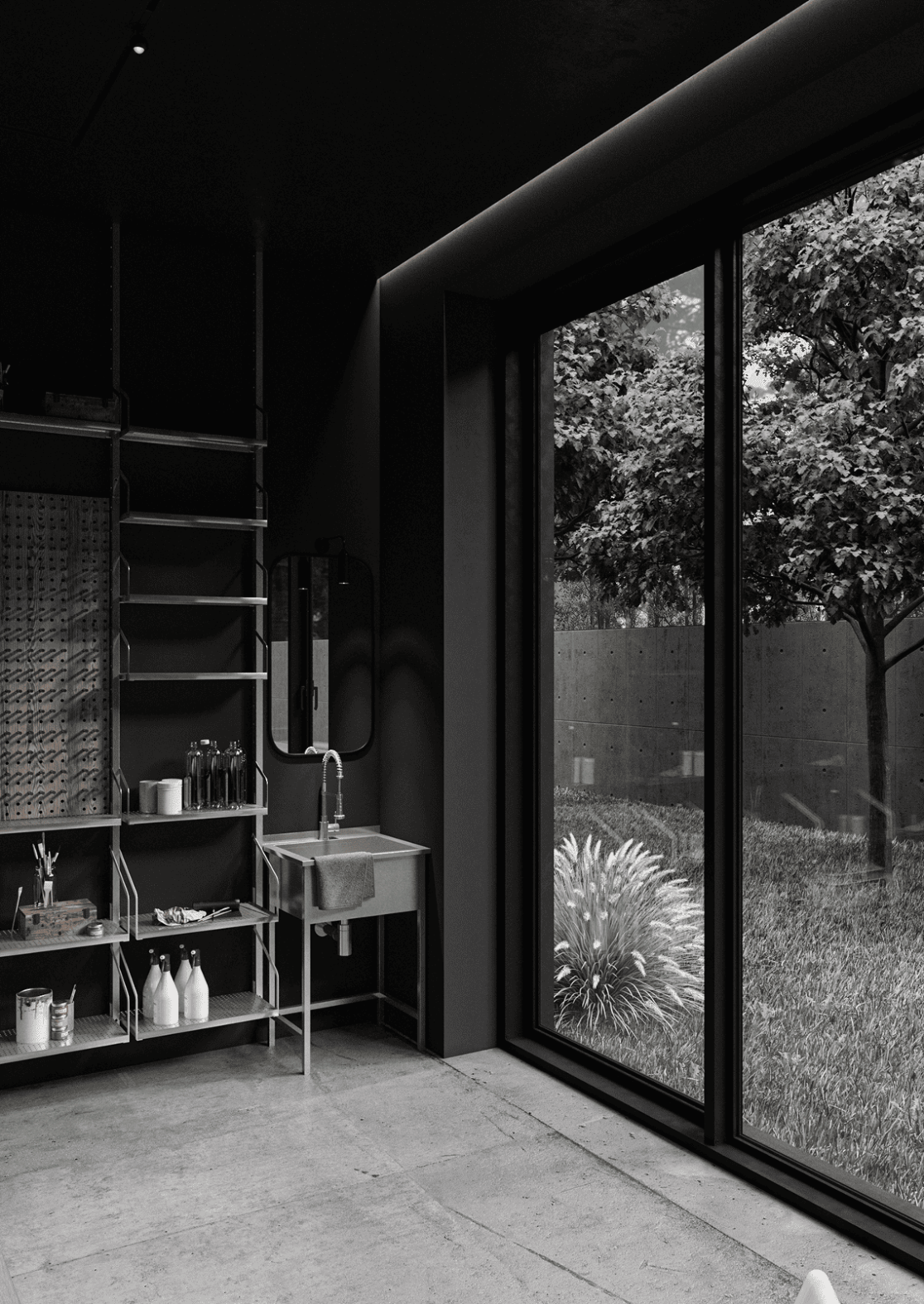Планировка первого этажа включает просторную гостиную и кухню-столовую с выходами в сад, а также санузел с душем, гардеробную при входе, художественную мастерскую и полноценную парную. Здесь же расположена гостевая спальня. В отдельном примыкающем объёме размещён гараж на два автомобиля.