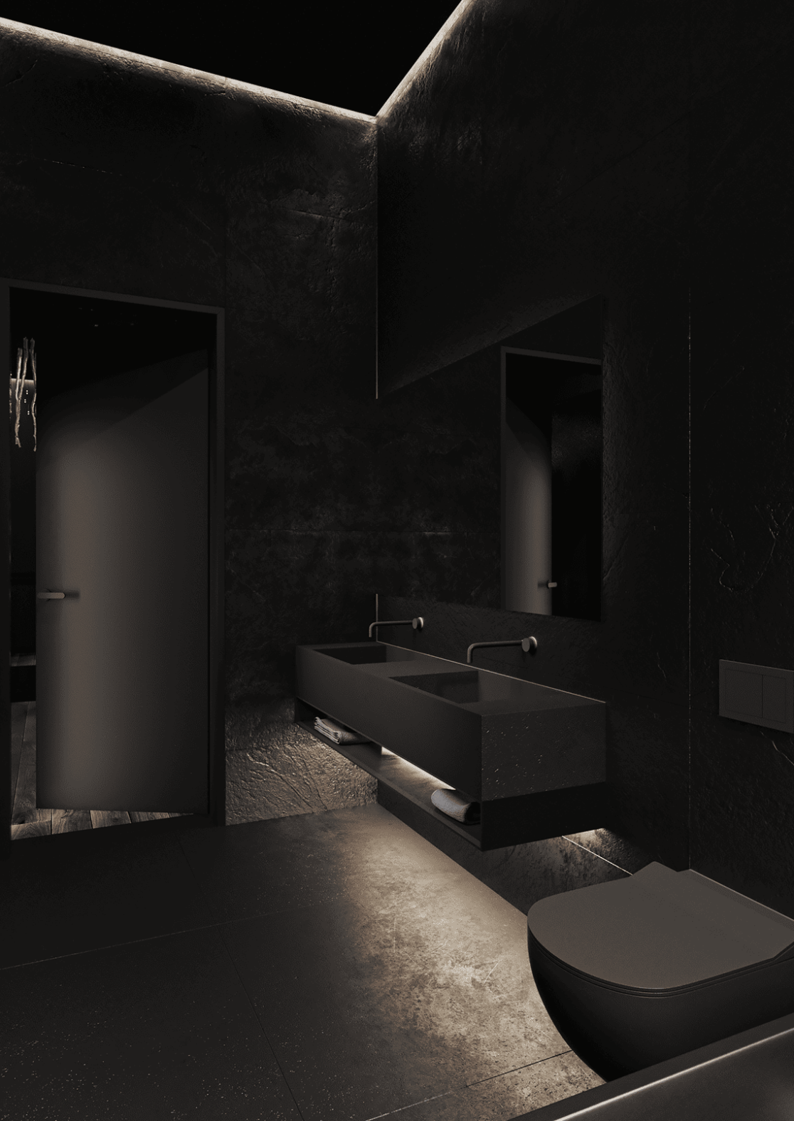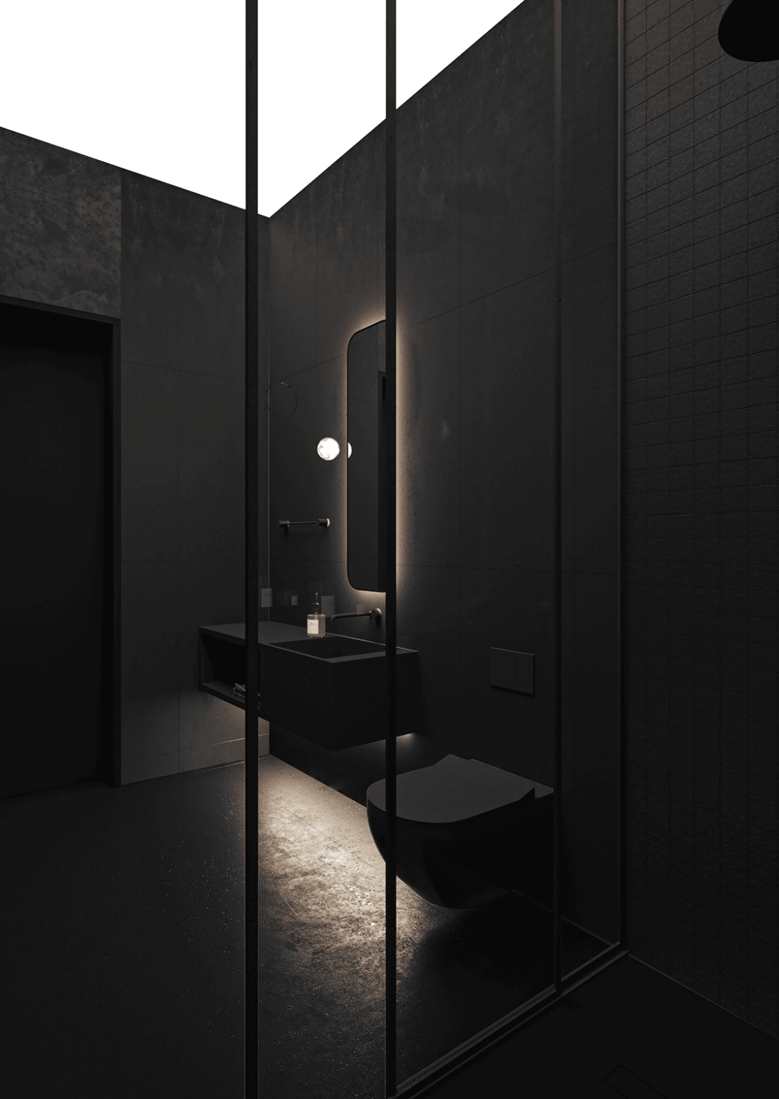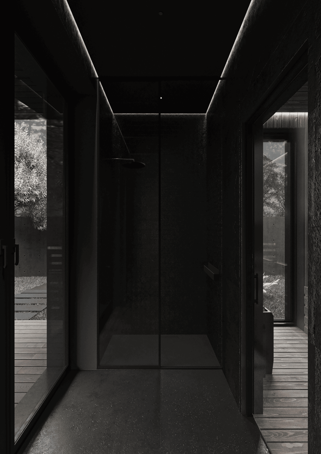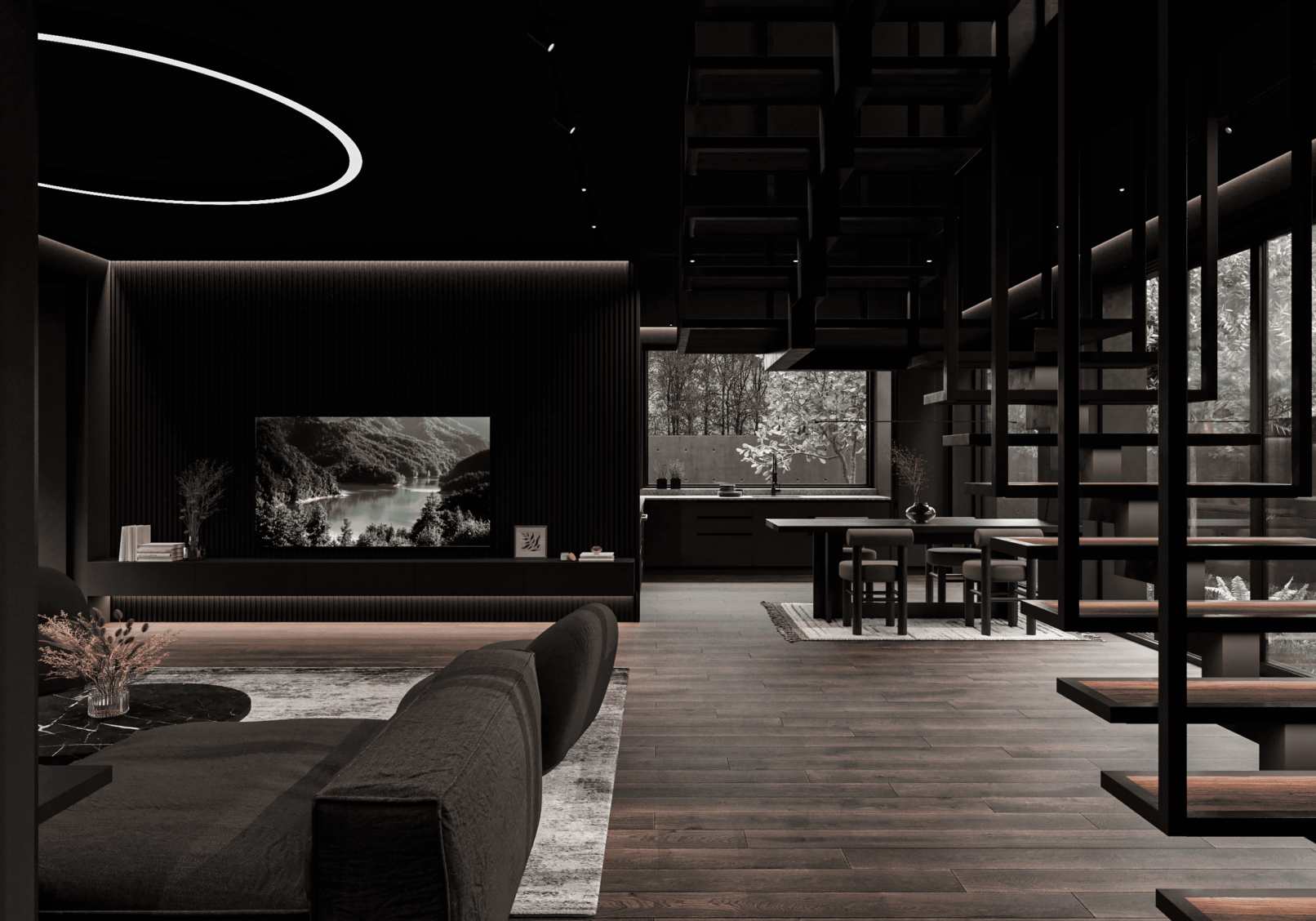 Планировка первого этажа включает просторную гостиную и кухню-столовую с выходами в сад, а также санузел с душем, гардеробную при входе, художественную мастерскую и полноценную парную. Здесь же расположена гостевая спальня. В отдельном примыкающем объёме размещён гараж на два автомобиля.