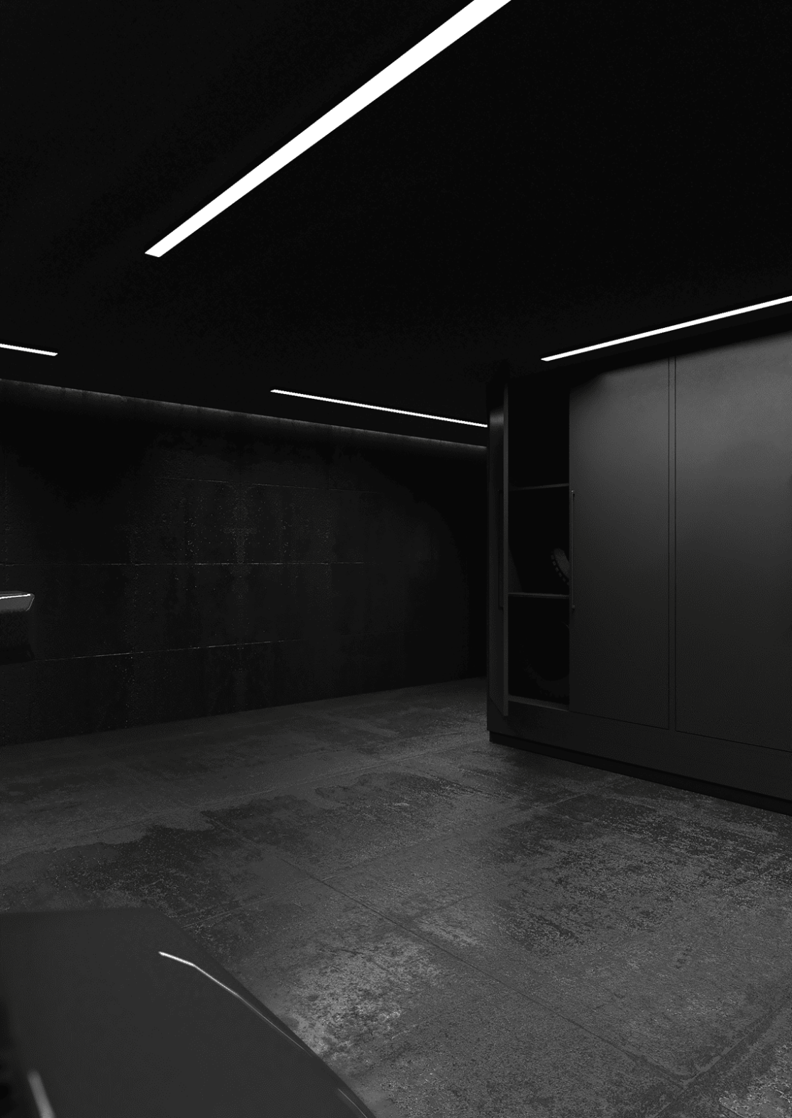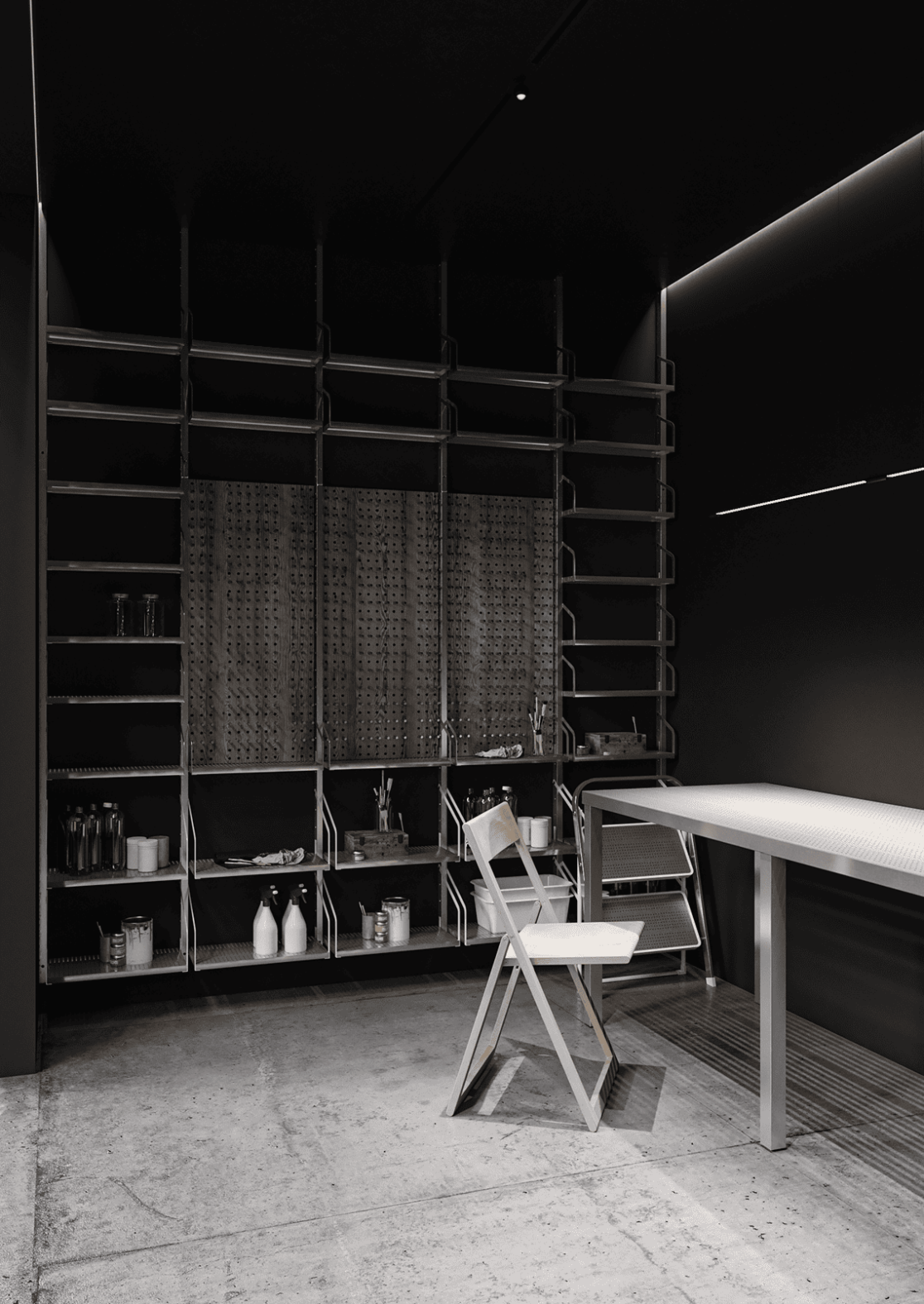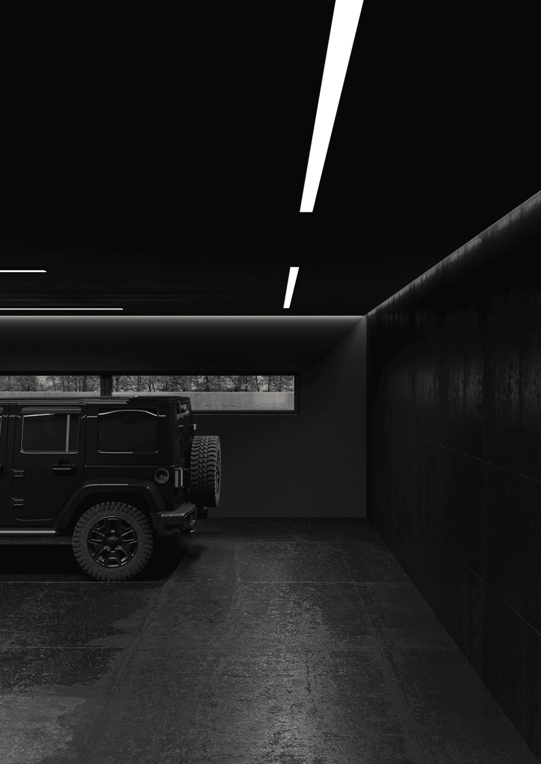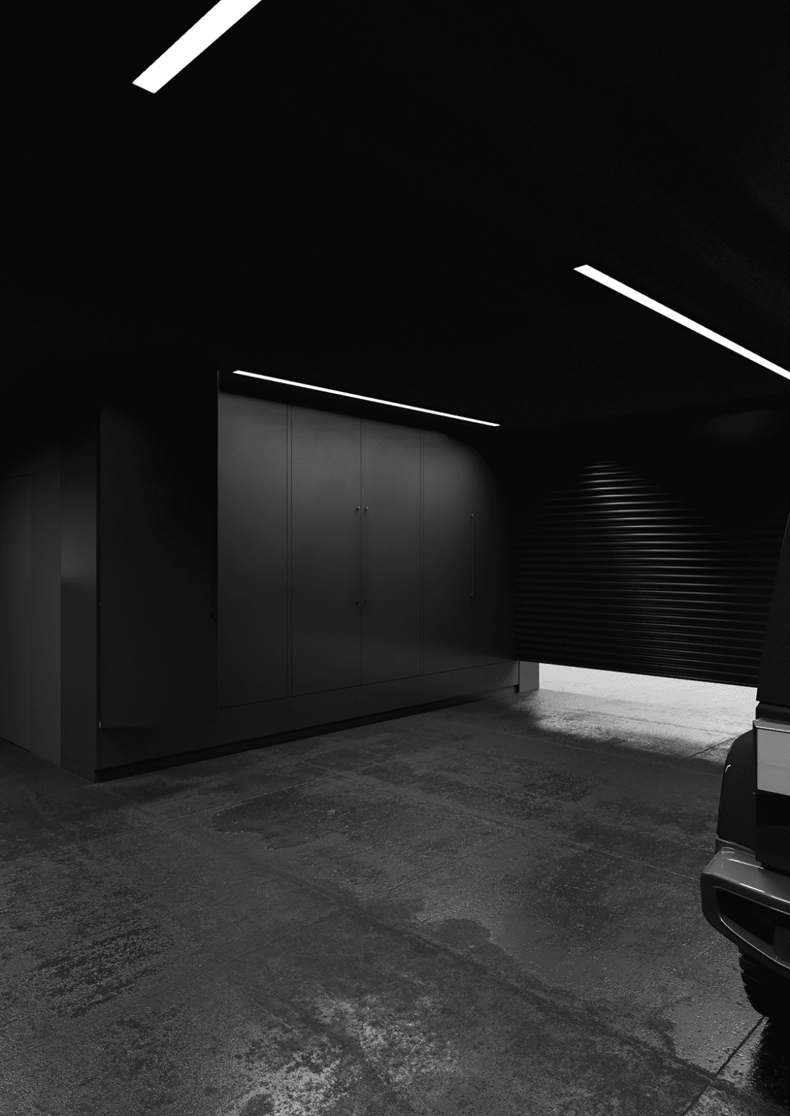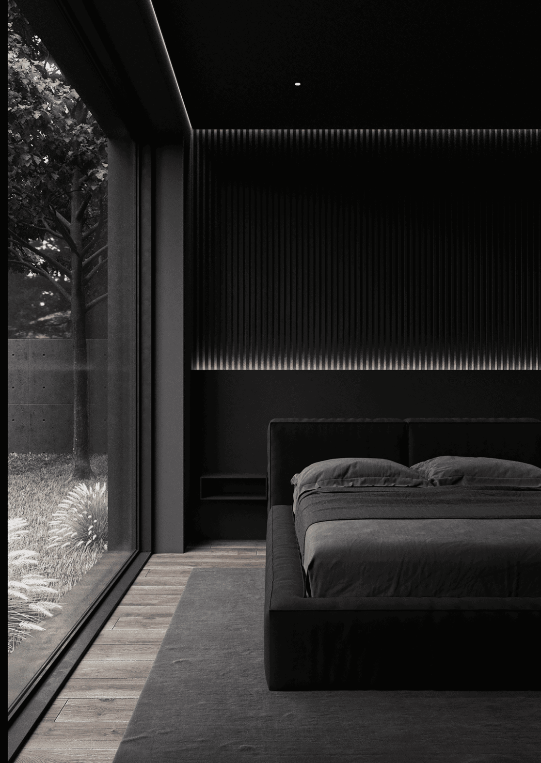 Планировка первого этажа включает просторную гостиную и кухню-столовую с выходами в сад, а также санузел с душем, гардеробную при входе, художественную мастерскую и полноценную парную. Здесь же расположена гостевая спальня. В отдельном примыкающем объёме размещён гараж на два автомобиля.