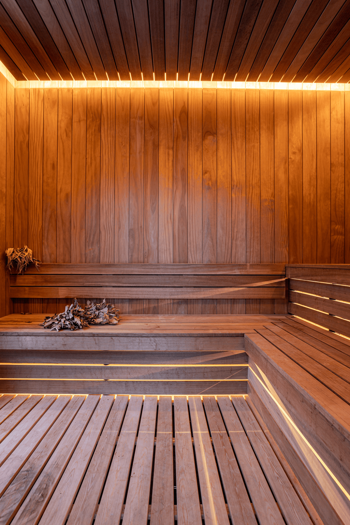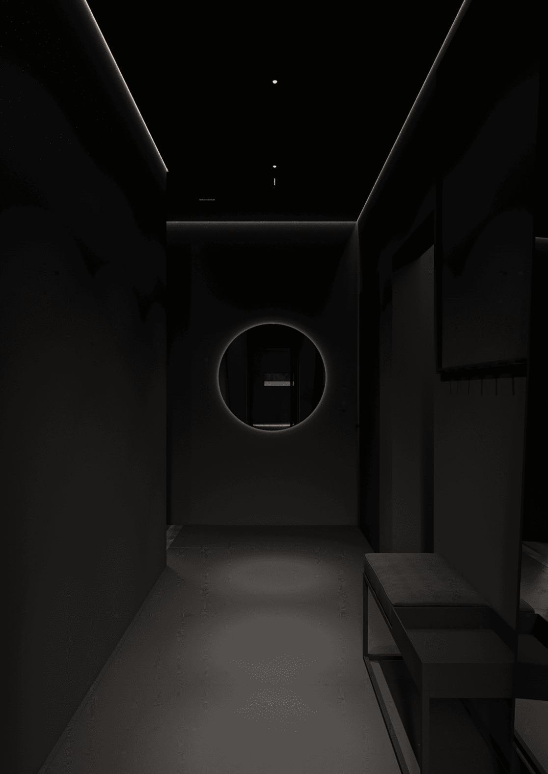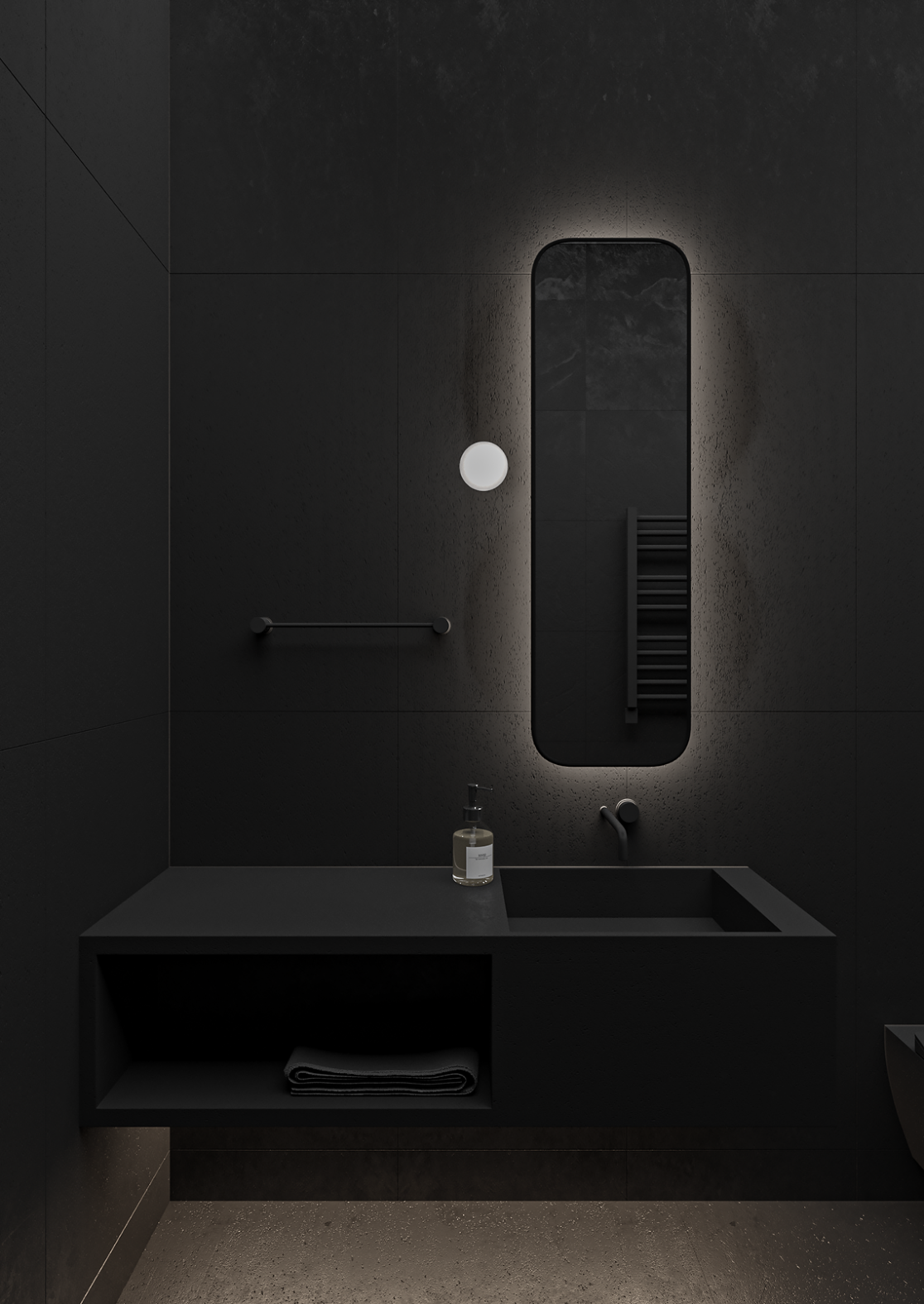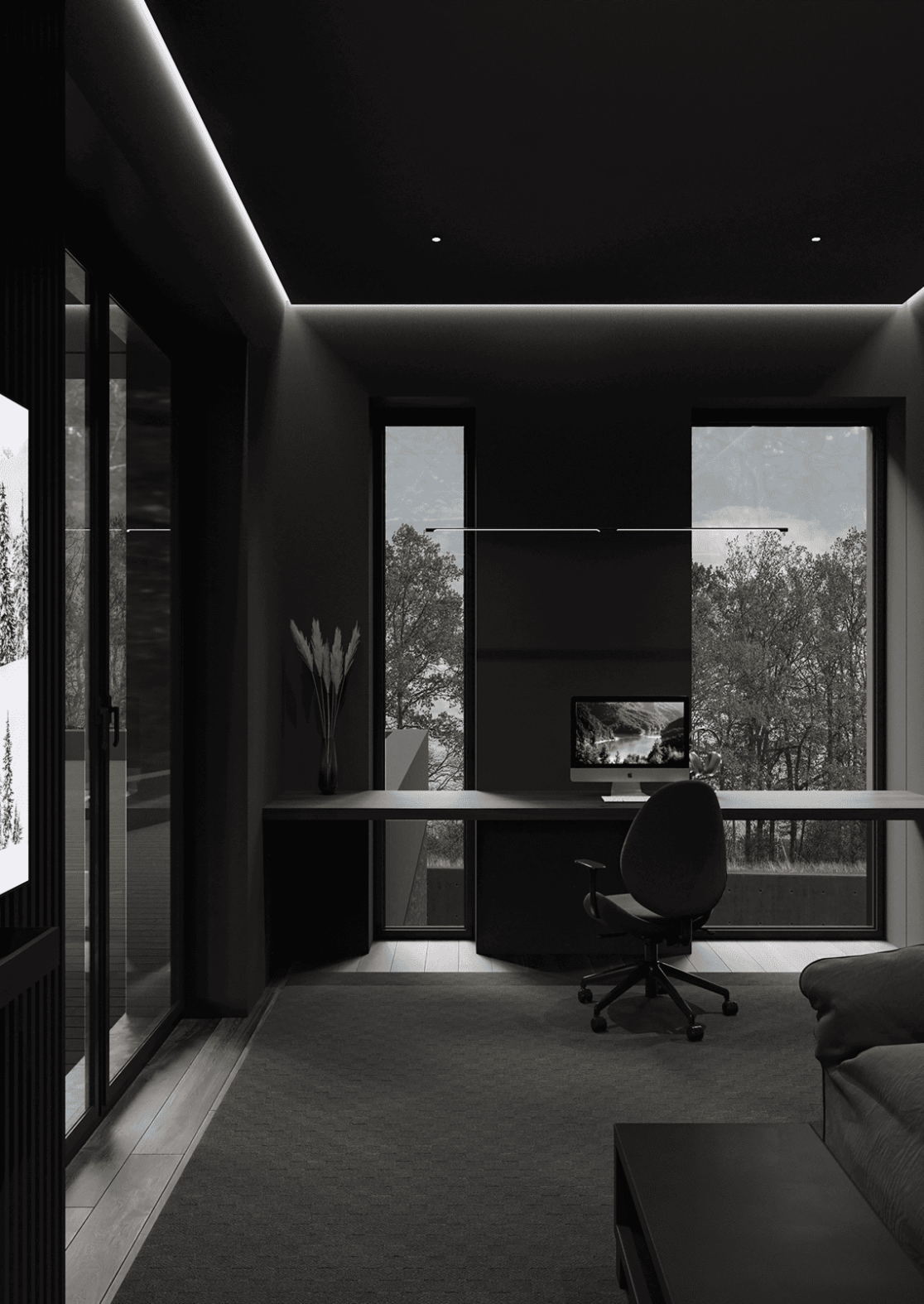 Планировка первого этажа включает просторную гостиную и кухню-столовую с выходами в сад, а также санузел с душем, гардеробную при входе, художественную мастерскую и полноценную парную. Здесь же расположена гостевая спальня. В отдельном примыкающем объёме размещён гараж на два автомобиля.