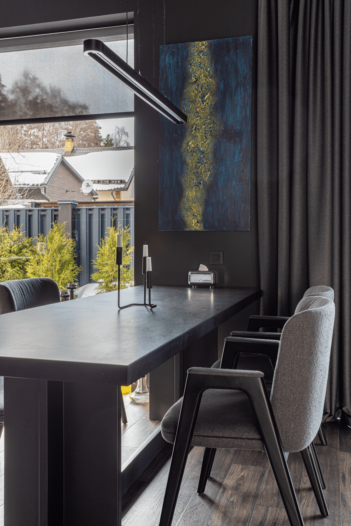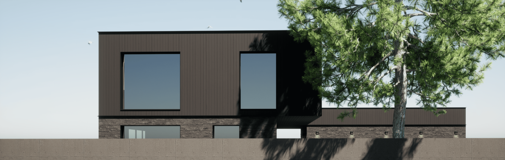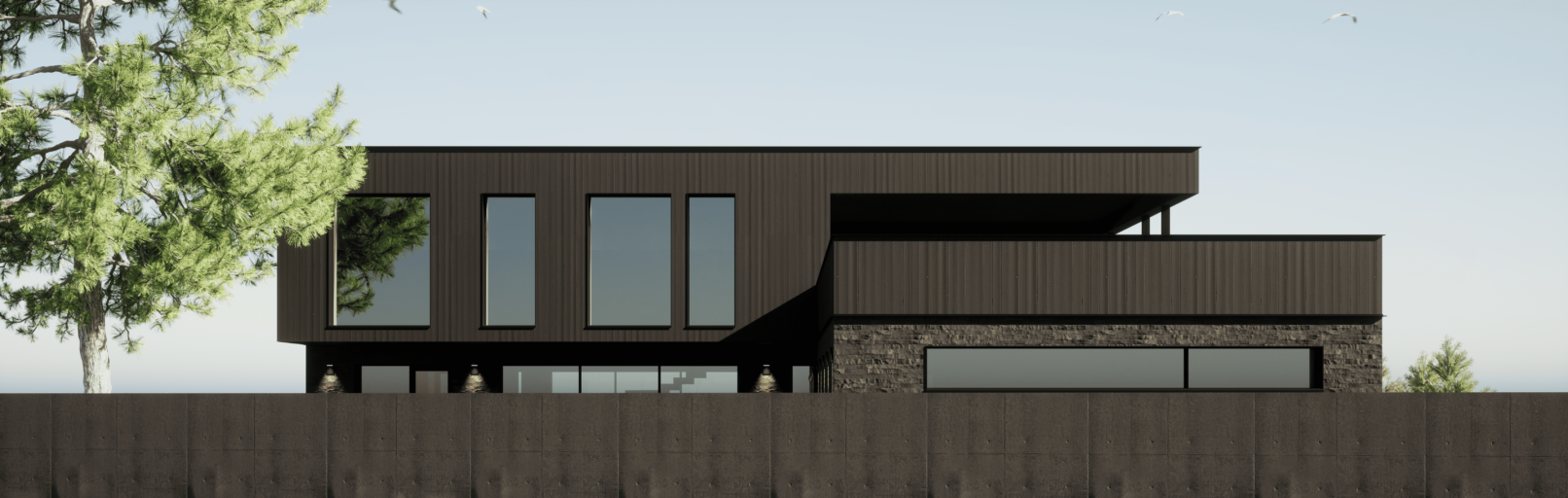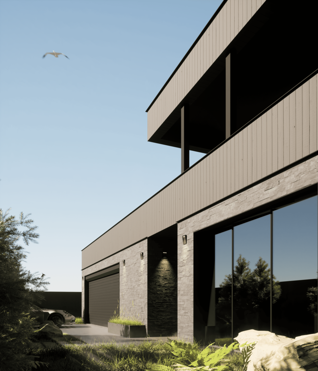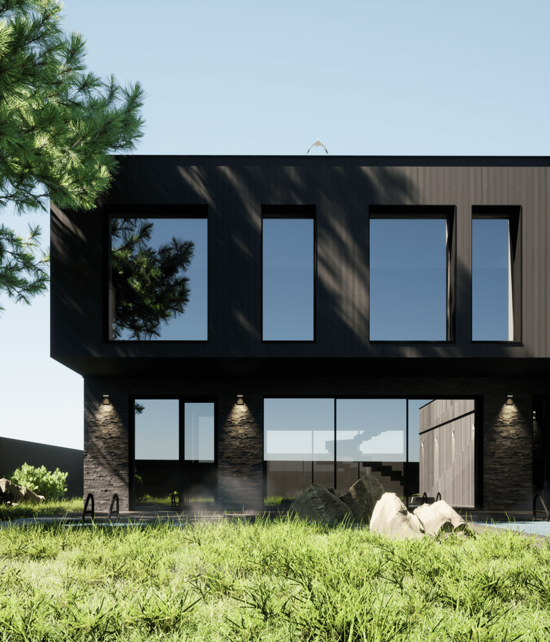 Жилой дом в посёлке Истра выполнен в современной лаконичной стилистике. Архитектура построена на сочетании двух выразительных материалов: камня тёмного оттенка в отделке первого этажа и вертикальной деревянной обшивки на втором. Контраст фактур подчёркивает горизонтальное деление объёмов и усиливает цельность архитектурного образа.