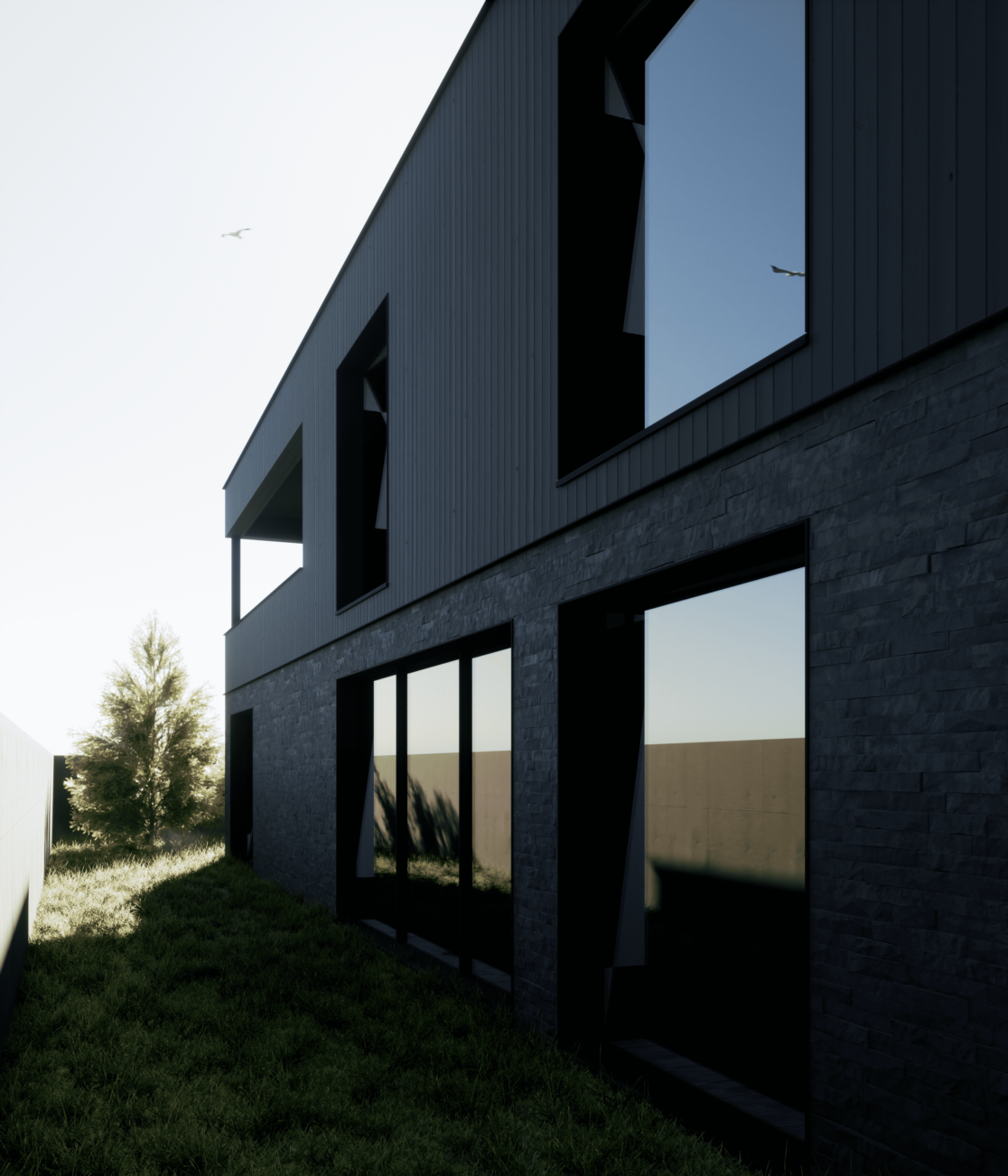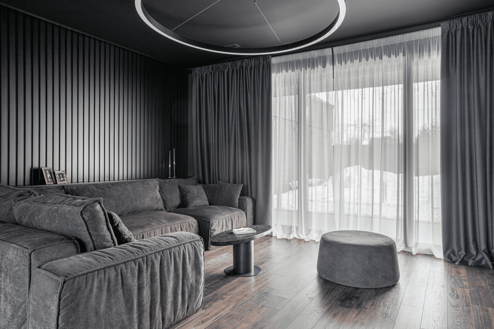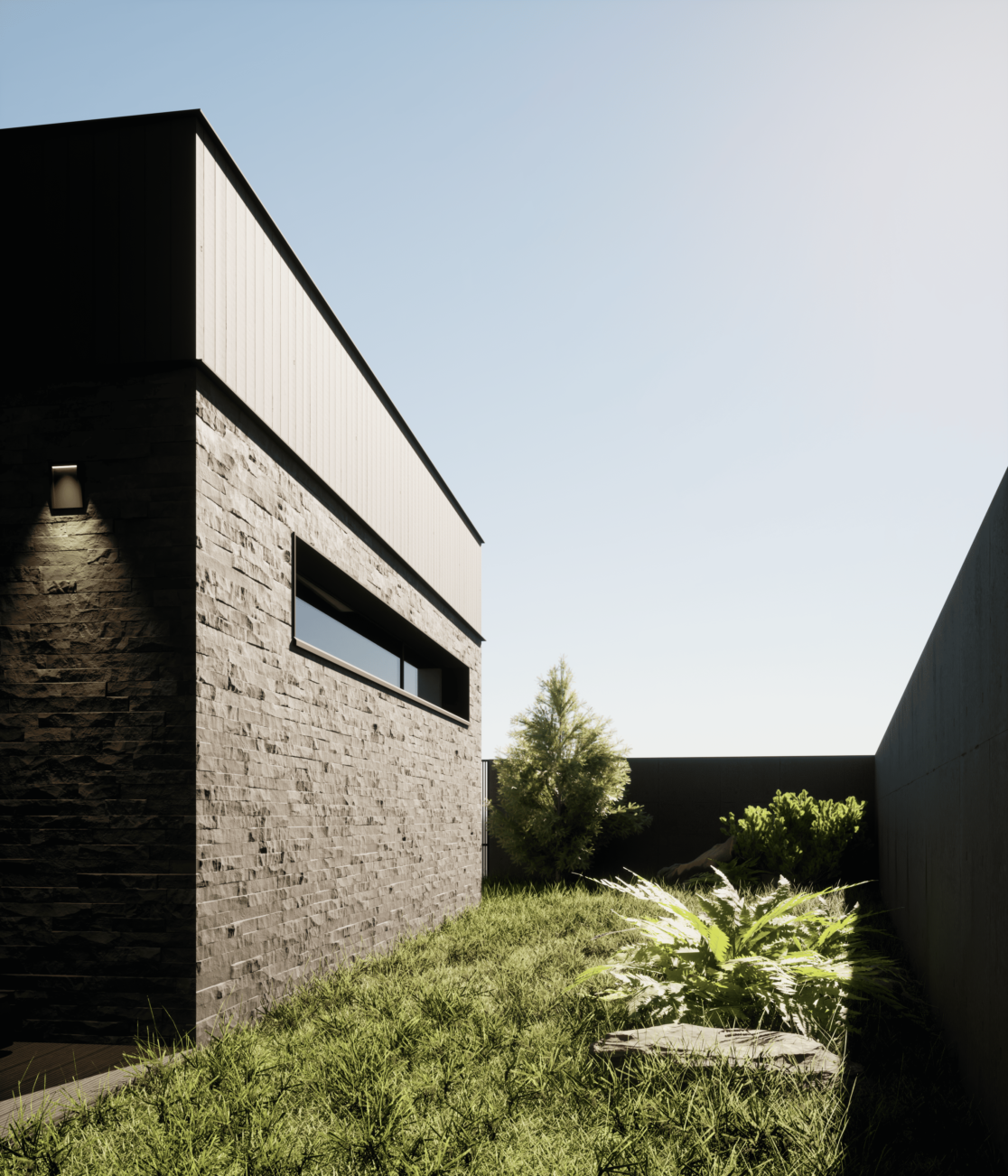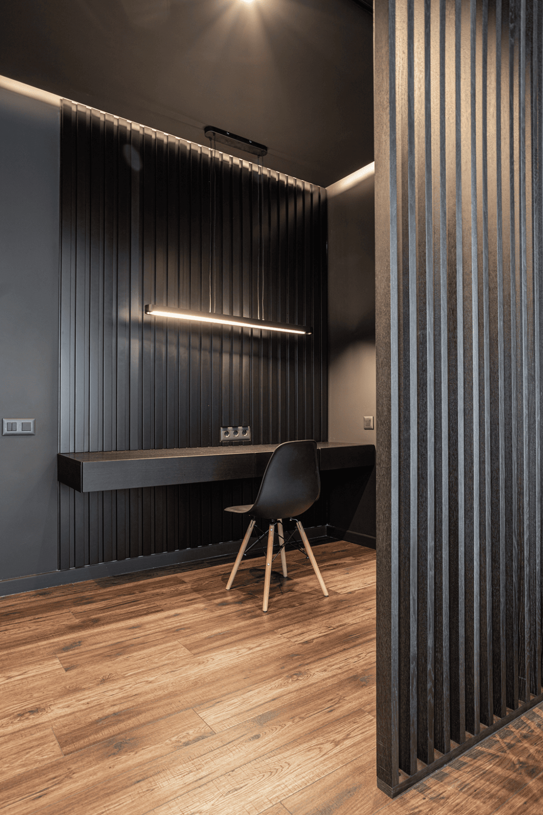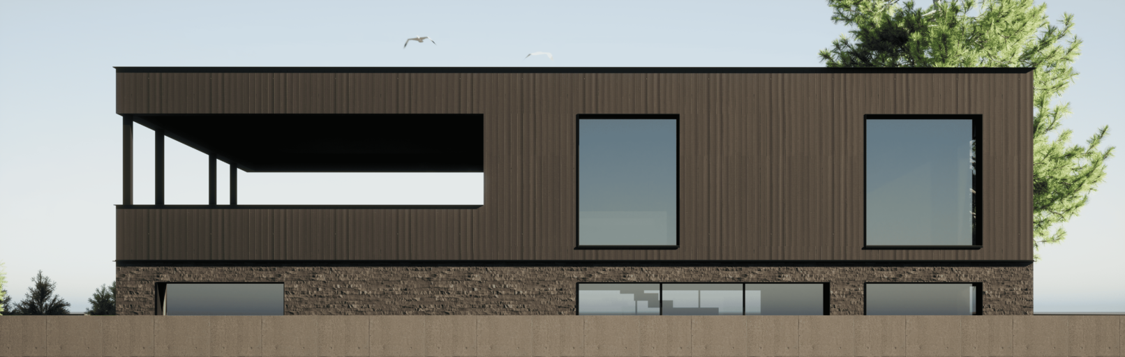 Жилой дом в посёлке Истра выполнен в современной лаконичной стилистике. Архитектура построена на сочетании двух выразительных материалов: камня тёмного оттенка в отделке первого этажа и вертикальной деревянной обшивки на втором. Контраст фактур подчёркивает горизонтальное деление объёмов и усиливает цельность архитектурного образа.