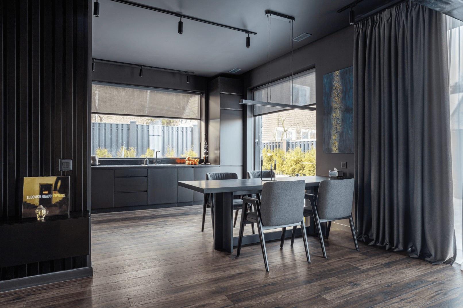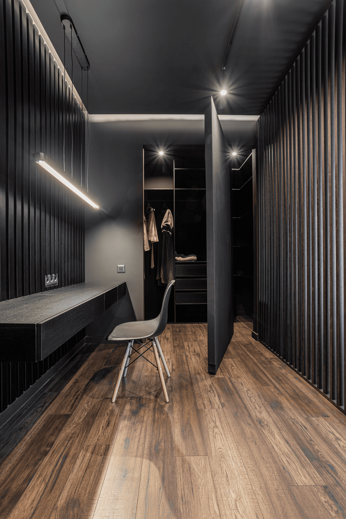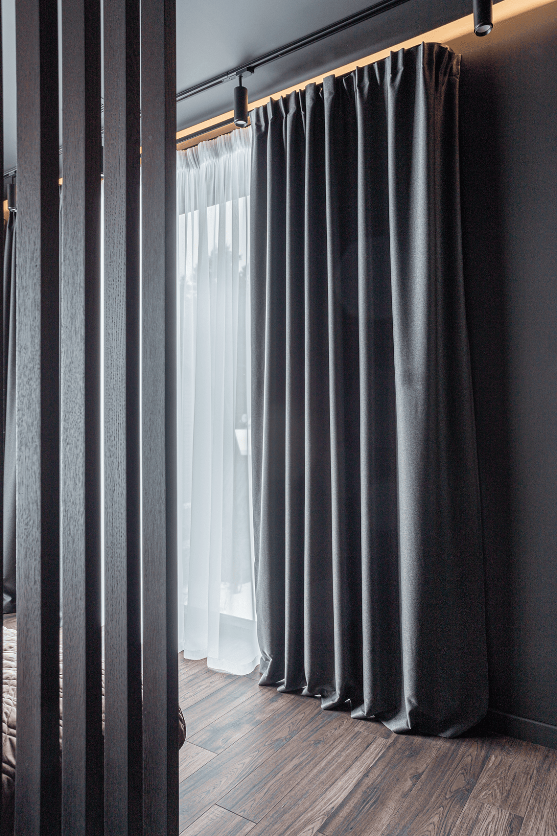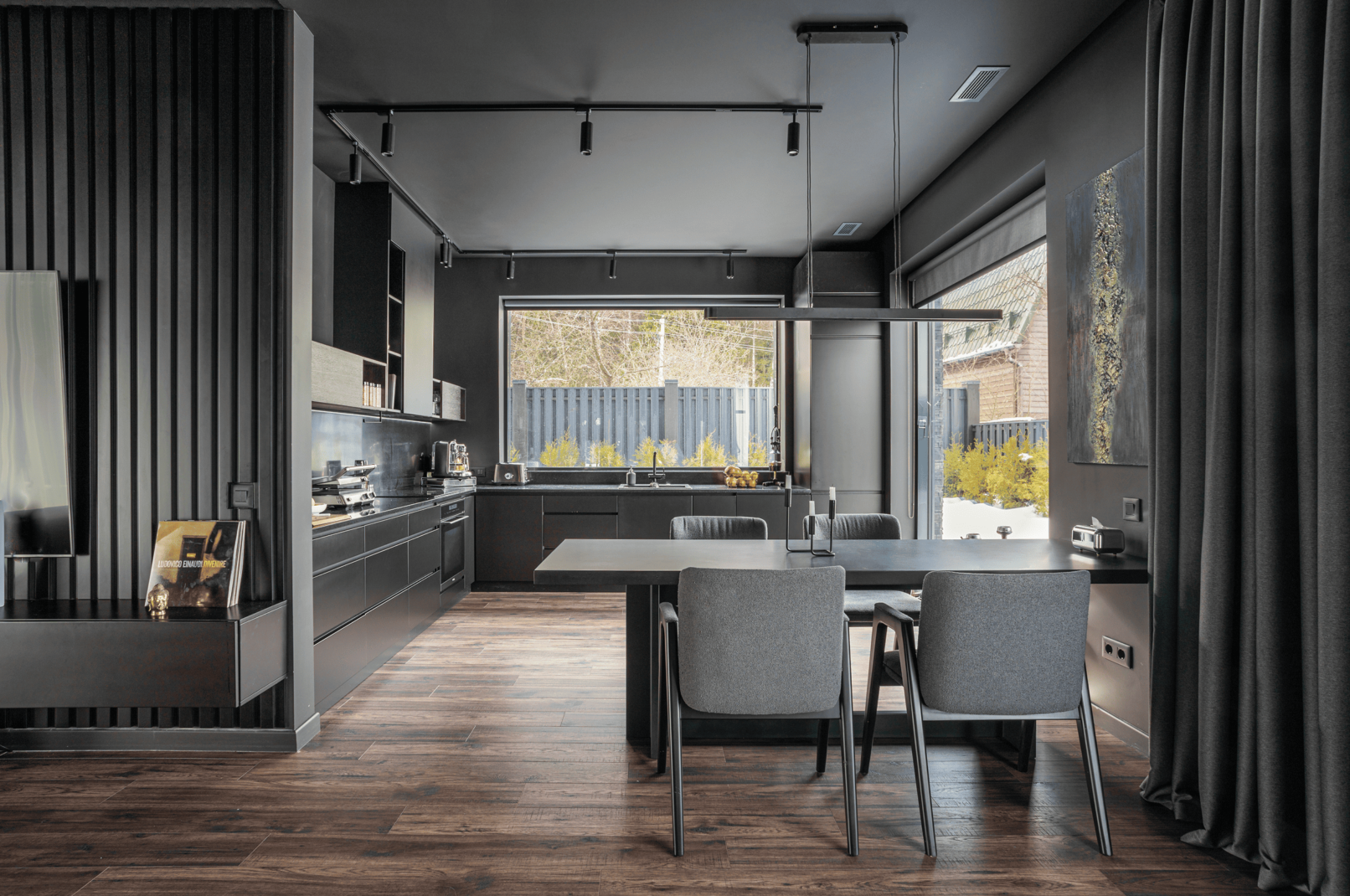 Жилой дом в посёлке Истра выполнен в современной лаконичной стилистике. Архитектура построена на сочетании двух выразительных материалов: камня тёмного оттенка в отделке первого этажа и вертикальной деревянной обшивки на втором. Контраст фактур подчёркивает горизонтальное деление объёмов и усиливает цельность архитектурного образа.