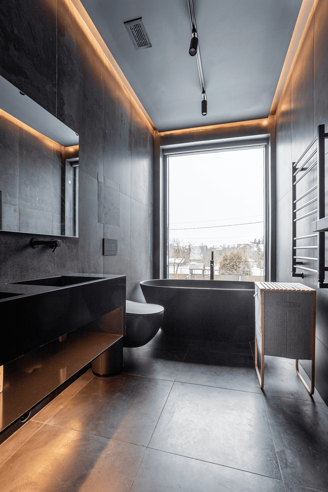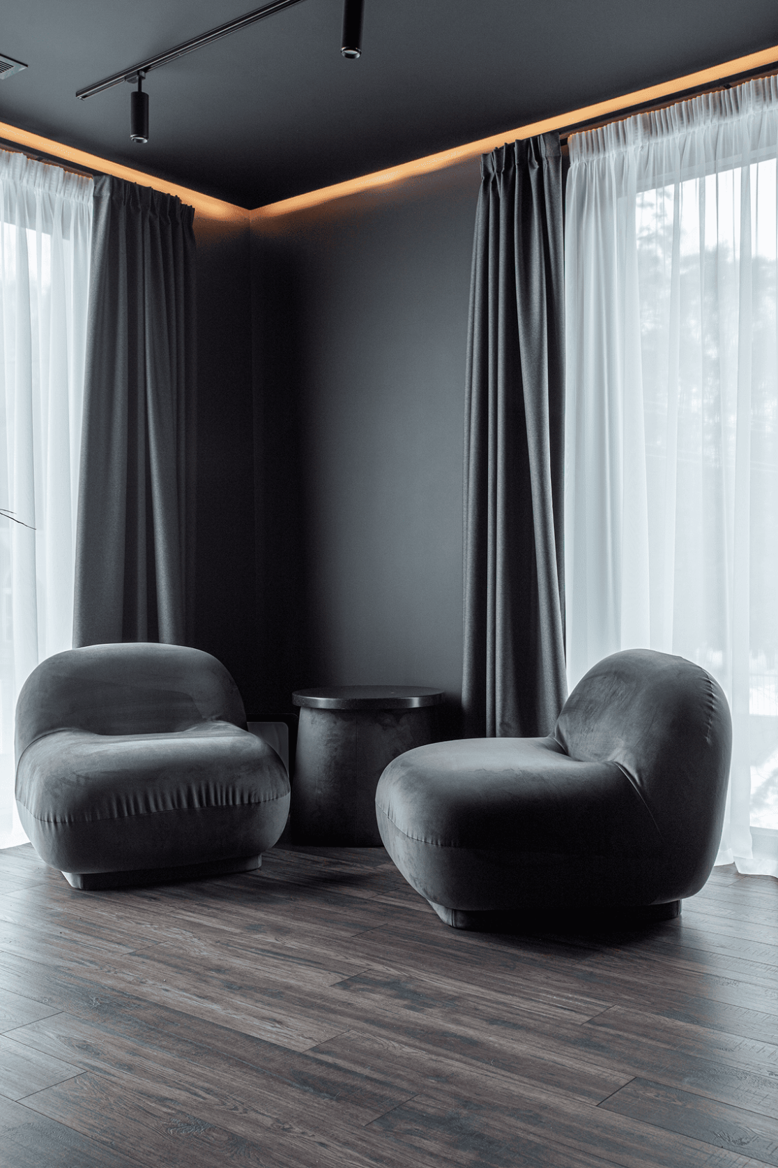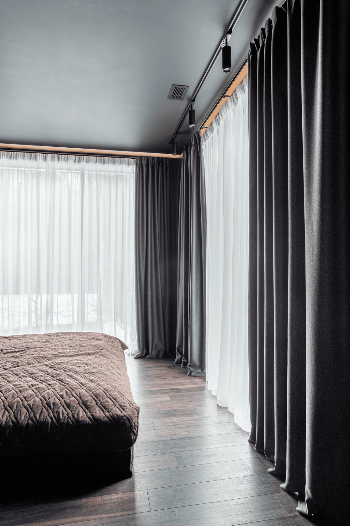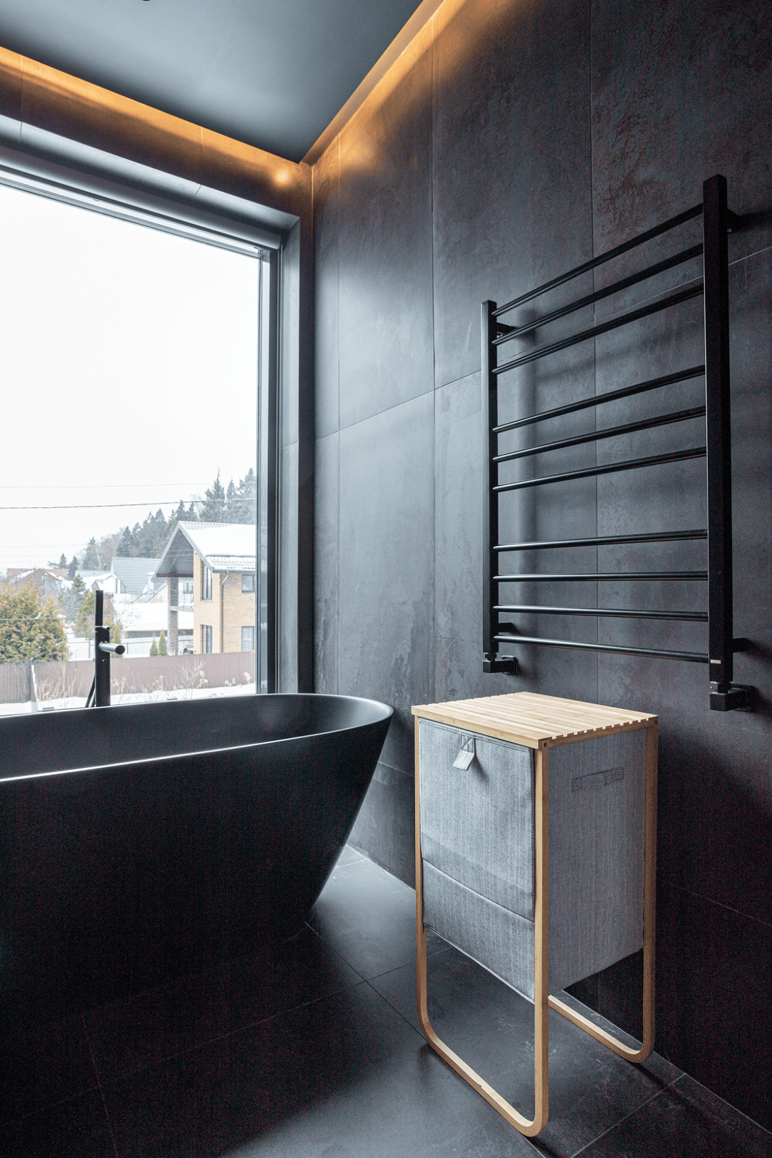 Жилой дом в посёлке Истра выполнен в современной лаконичной стилистике. Архитектура построена на сочетании двух выразительных материалов: камня тёмного оттенка в отделке первого этажа и вертикальной деревянной обшивки на втором. Контраст фактур подчёркивает горизонтальное деление объёмов и усиливает цельность архитектурного образа.