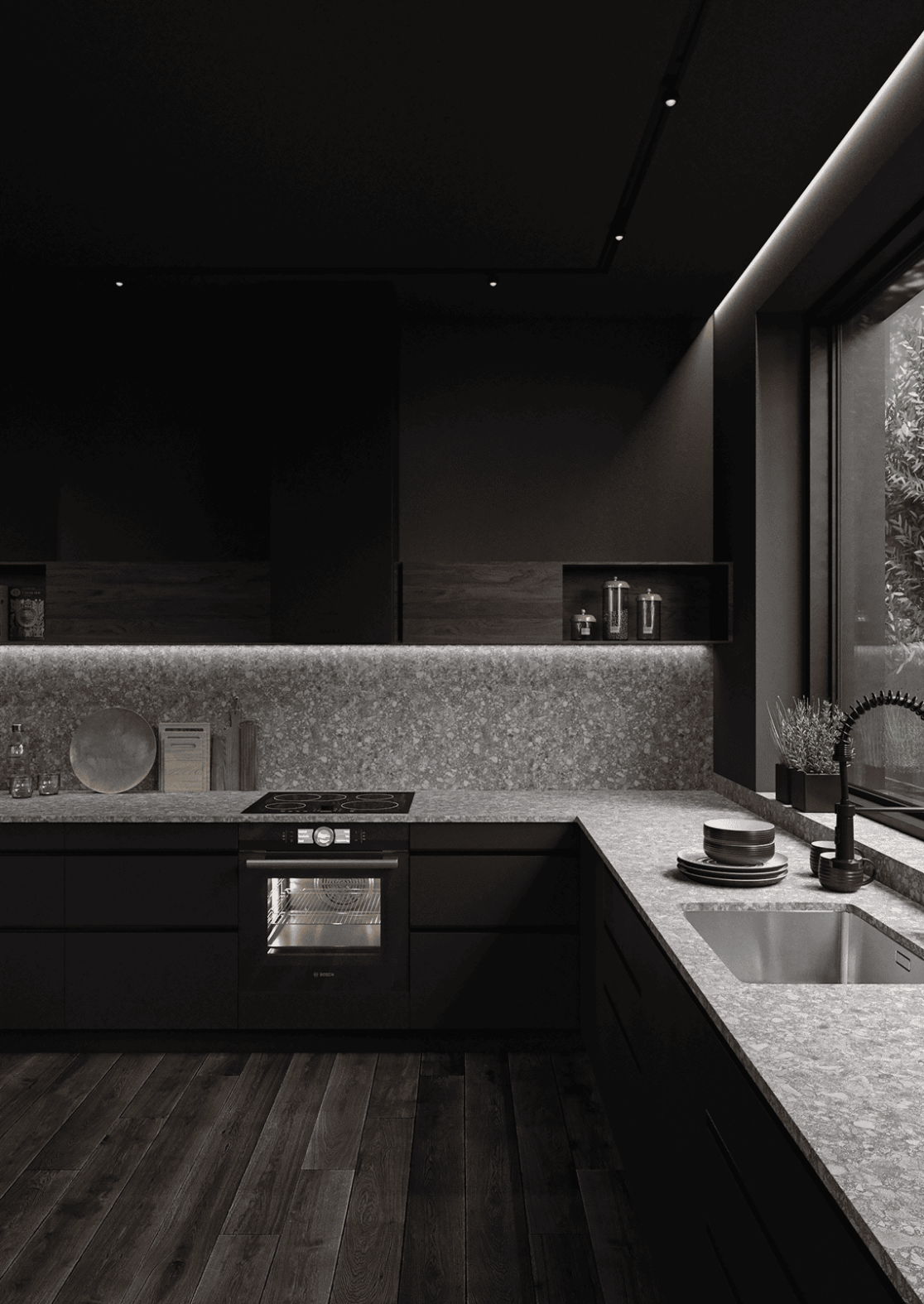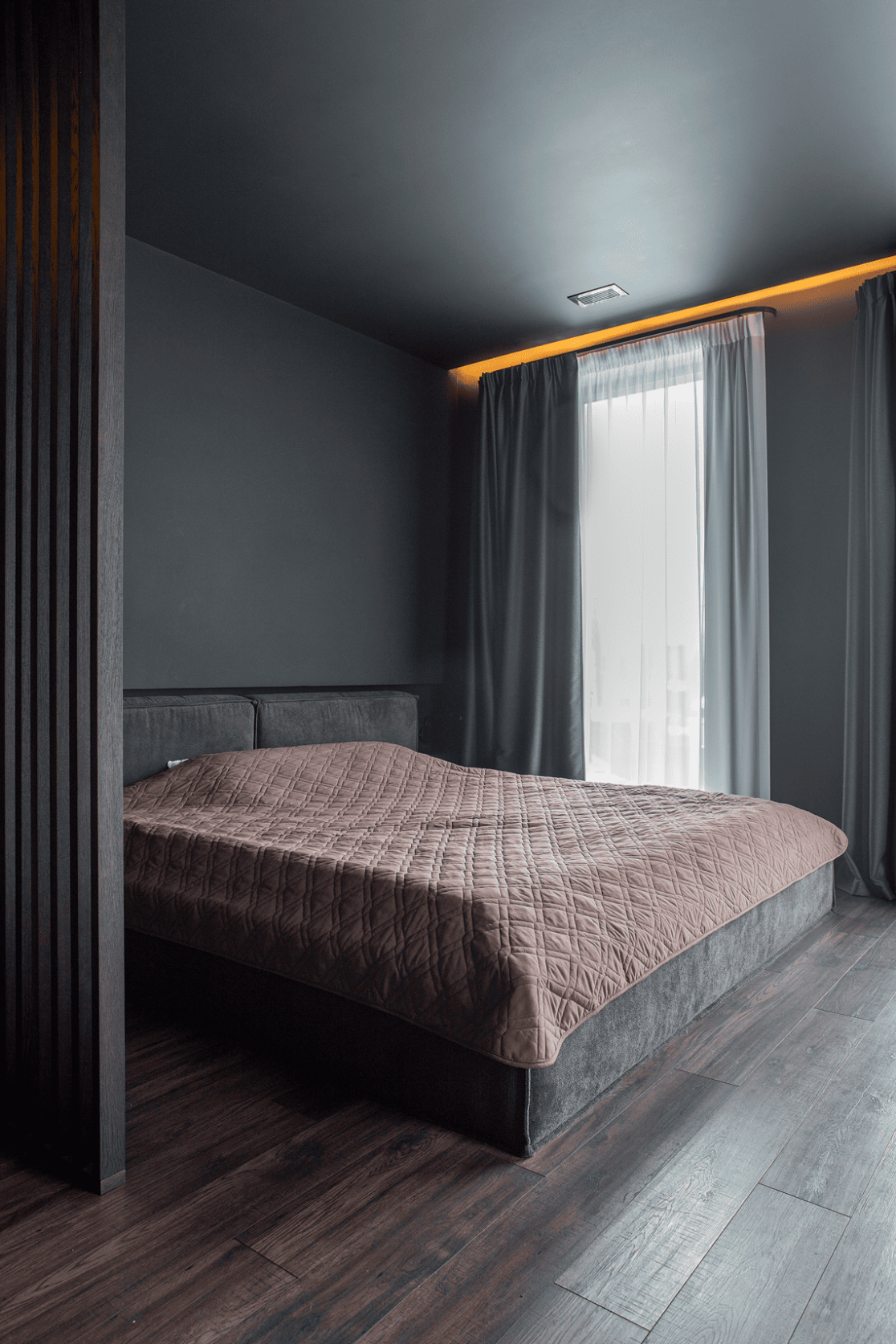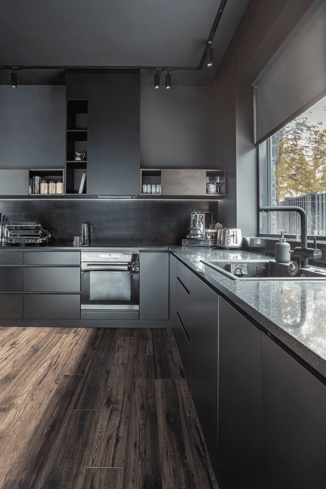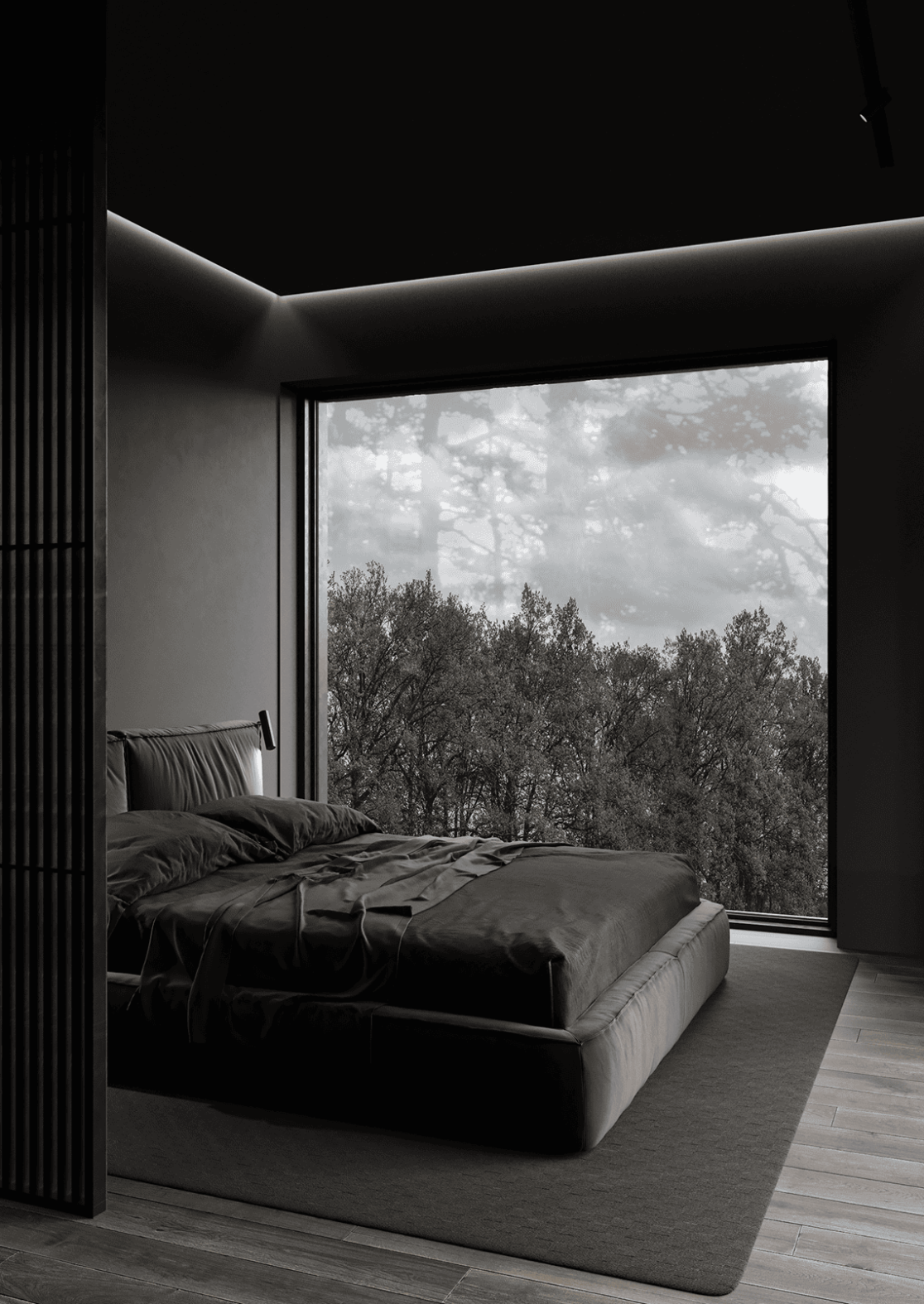 Жилой дом в посёлке Истра выполнен в современной лаконичной стилистике. Архитектура построена на сочетании двух выразительных материалов: камня тёмного оттенка в отделке первого этажа и вертикальной деревянной обшивки на втором. Контраст фактур подчёркивает горизонтальное деление объёмов и усиливает цельность архитектурного образа.